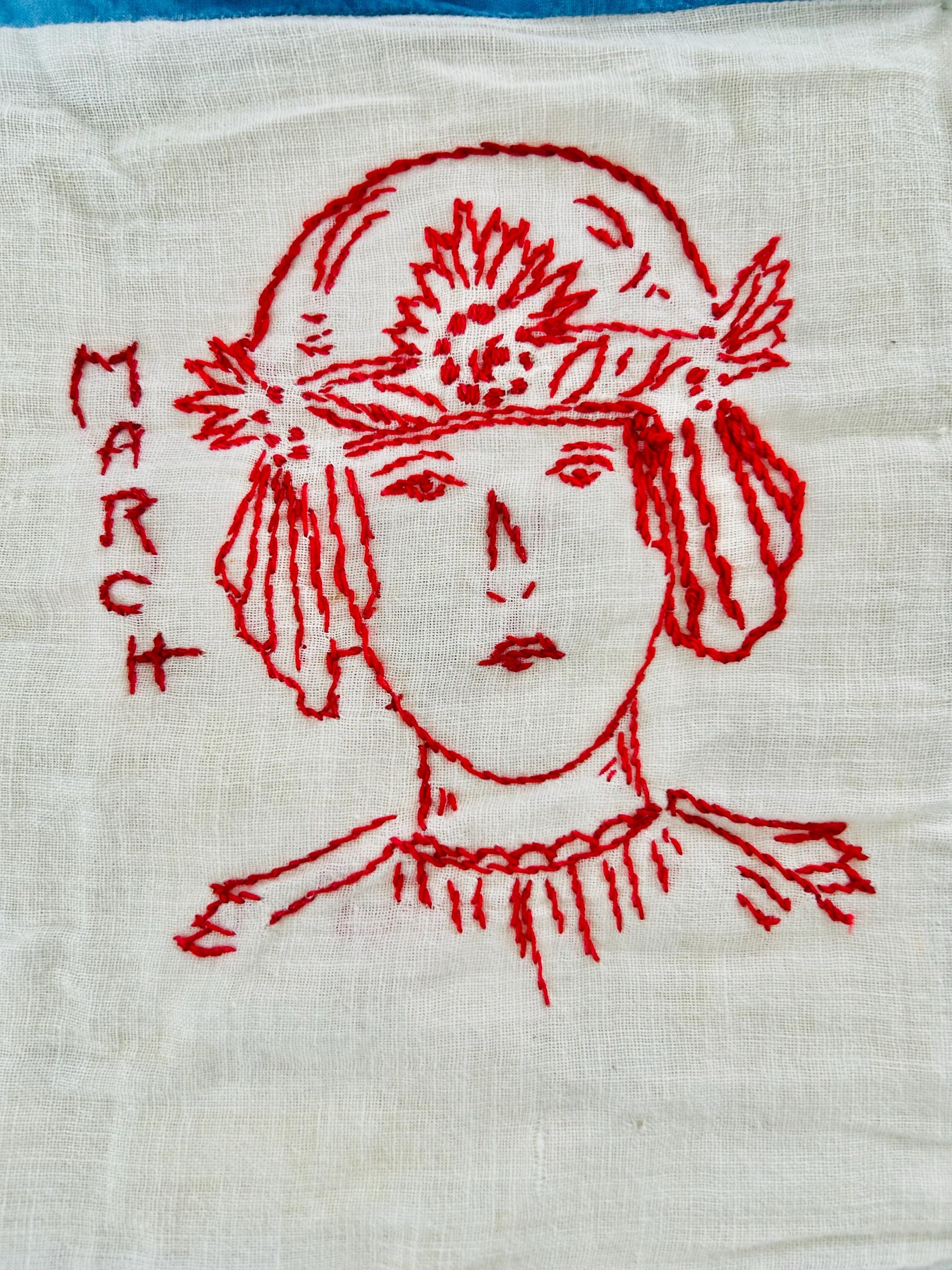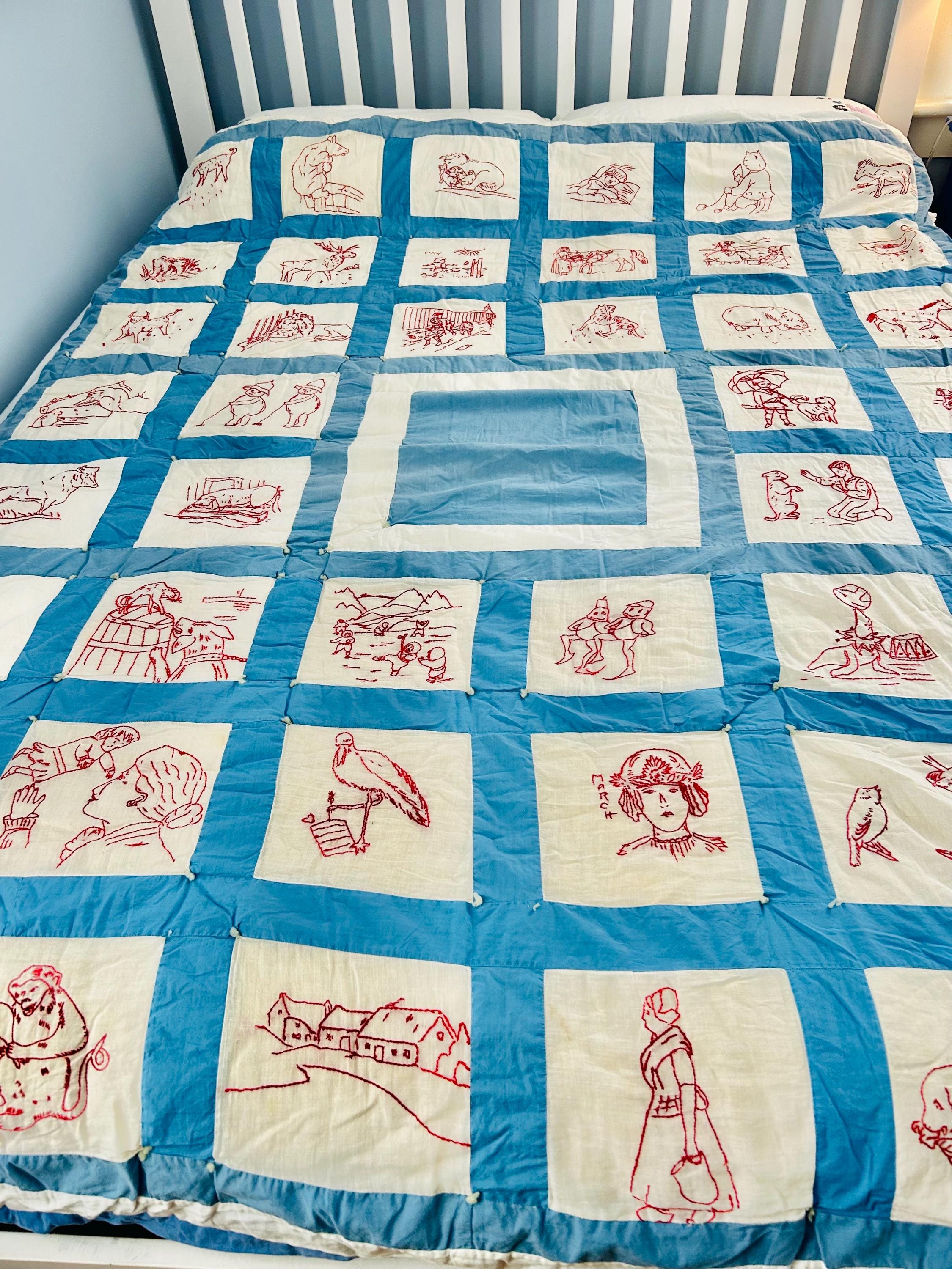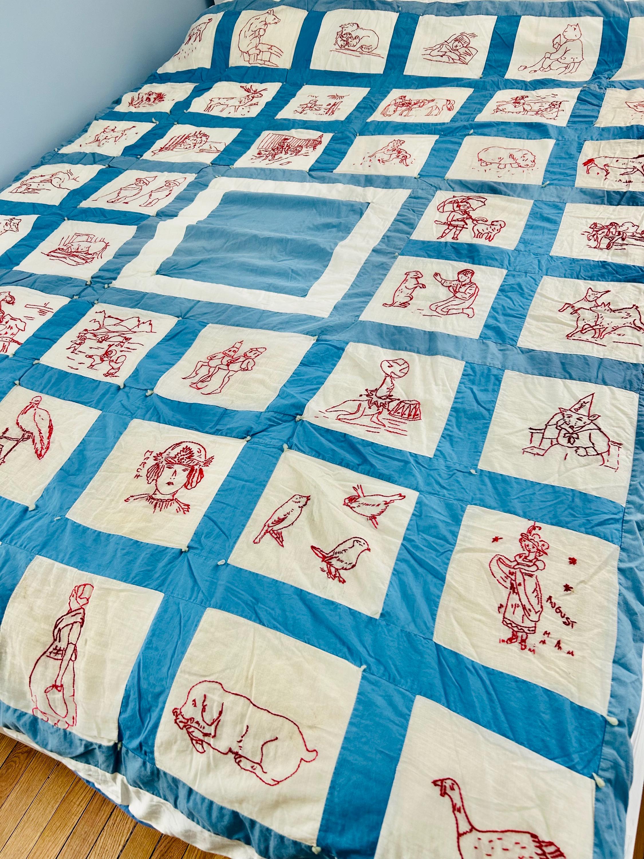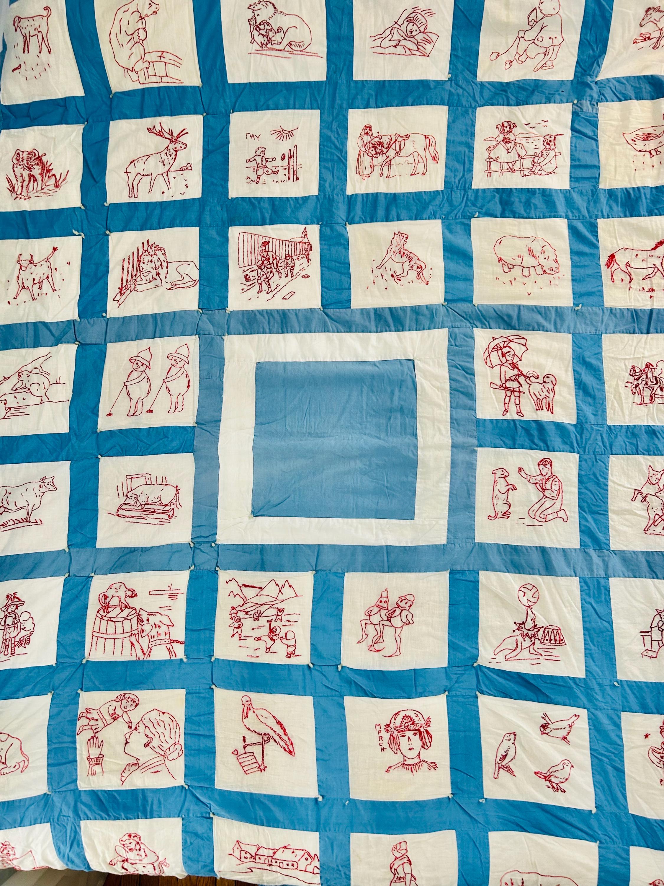 This early 20th-century Redwork Quilt is a stunning "Penny Square" style masterpiece, featuring 44 individual hand-embroidered panels. Each square tells a story, from whimsical anthropomorphic animals and nursery motifs to elegant "Calendar Girl" portraits representing the months of the year. Redwork quilts of this scale and detail were often made as "teaching quilts" for children or as community fundraisers.