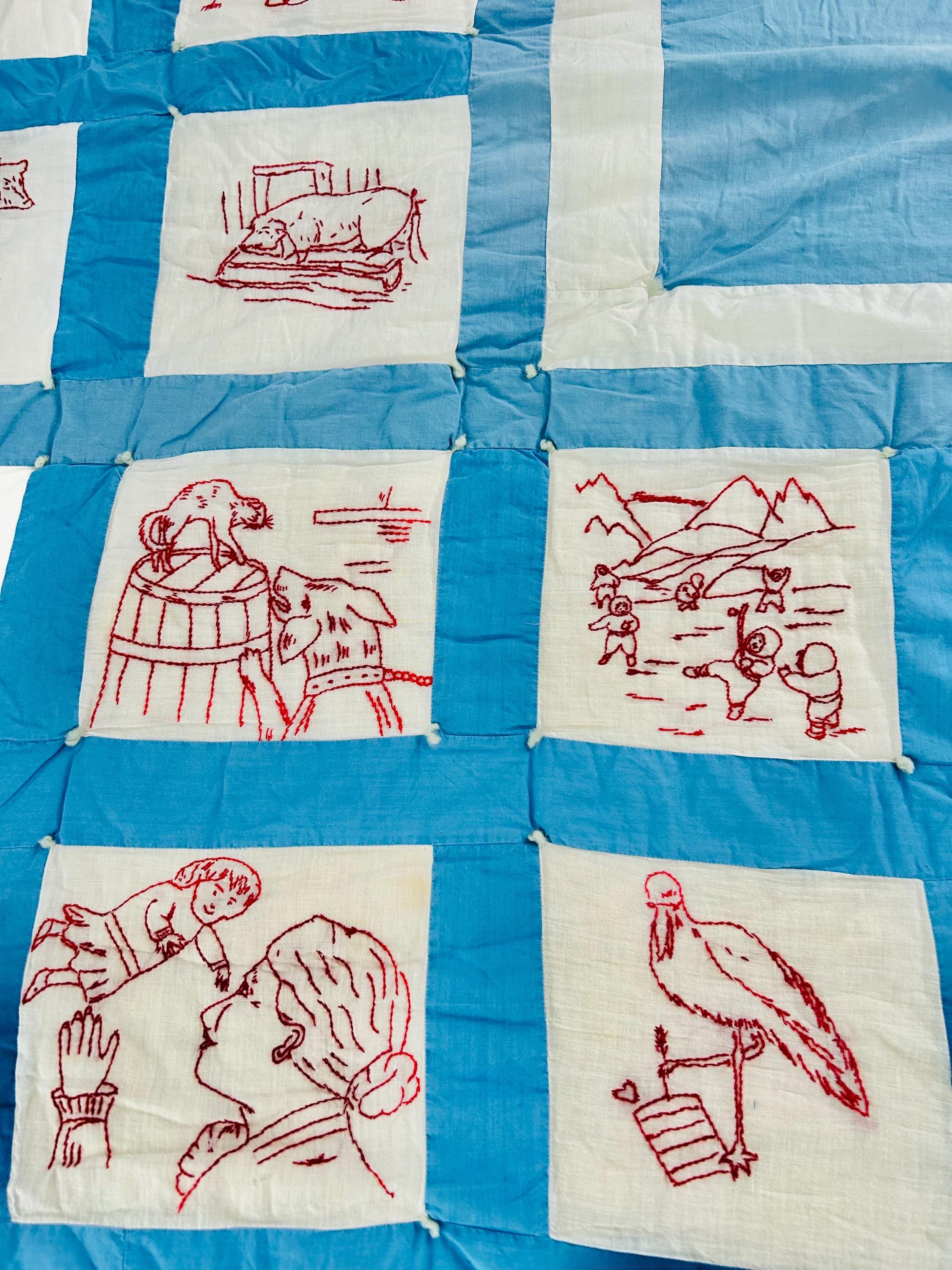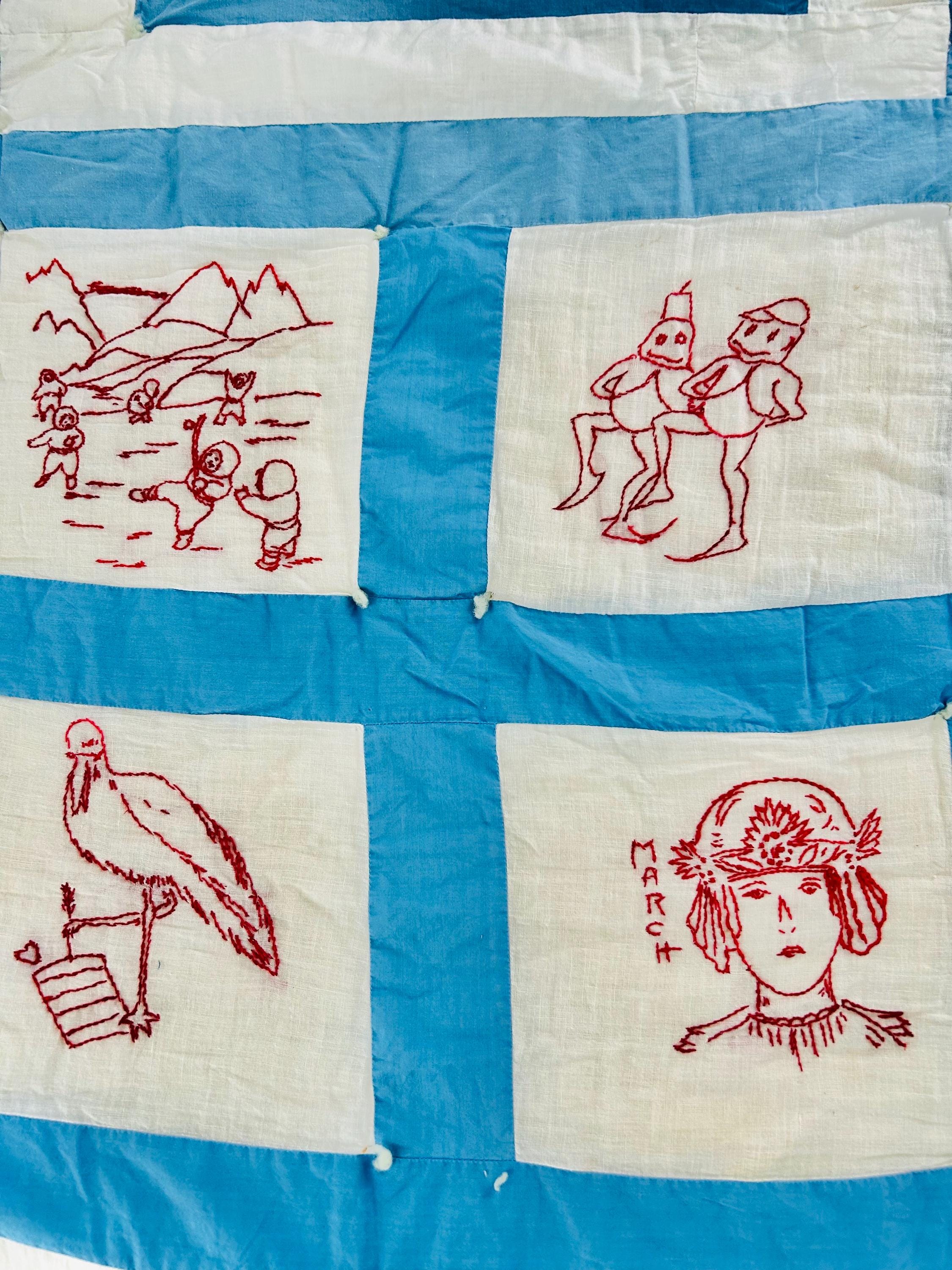 Details: • Era: Circa 1910–1920s • Dimensions: 58” x 80” • Artistry: 44 hand-embroidered squares featuring animals, children, and seasonal figures (notably a stunning "March" Gibson-style portrait and an "August" summer girl). • Construction: Hand-tied with traditional tufts, featuring flannel batting,