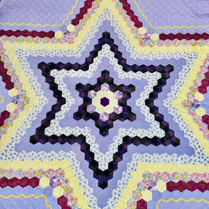 The quilt comes from a smoke-free, pet-free home and is pictured on a queen-size bed.