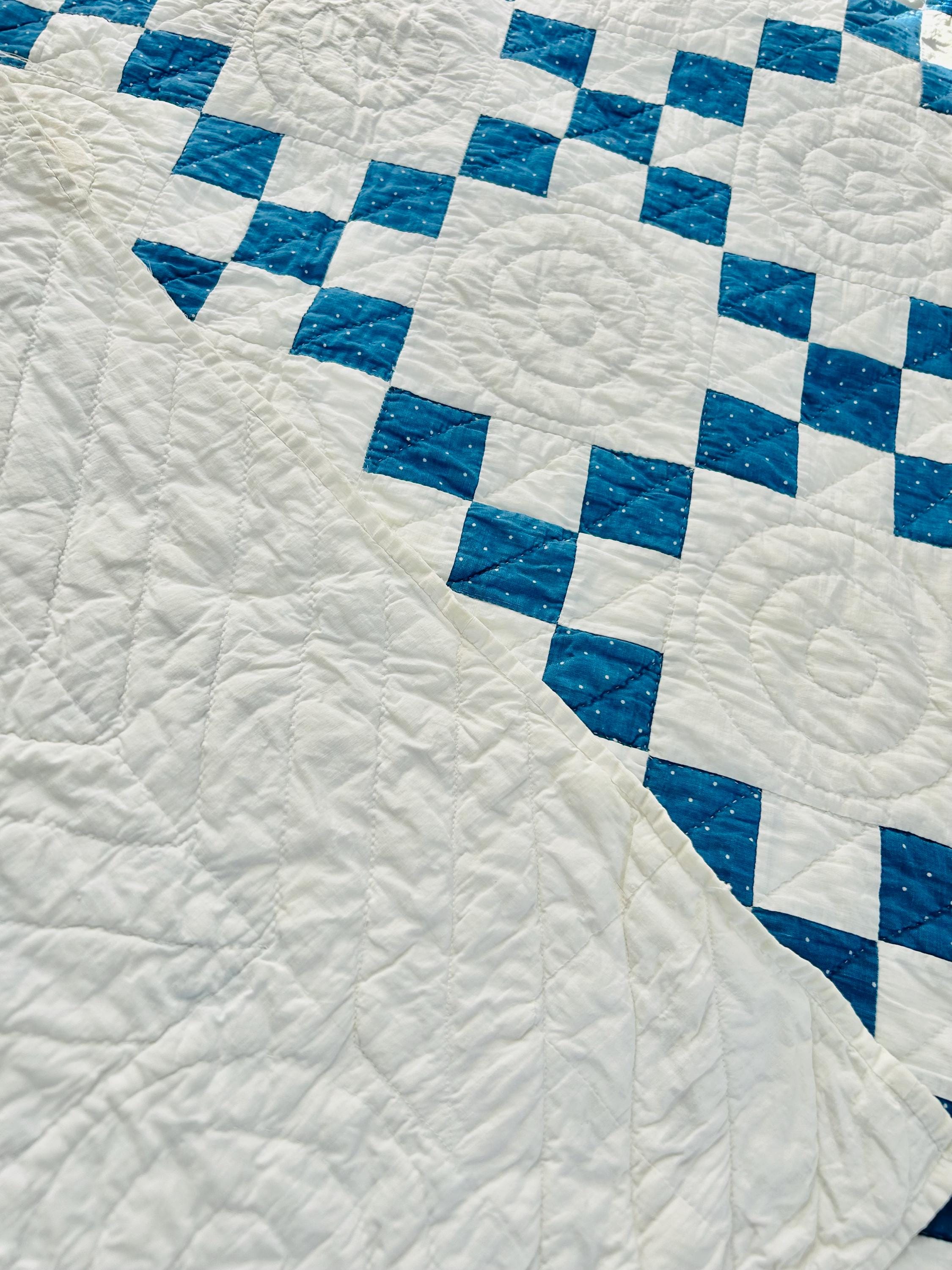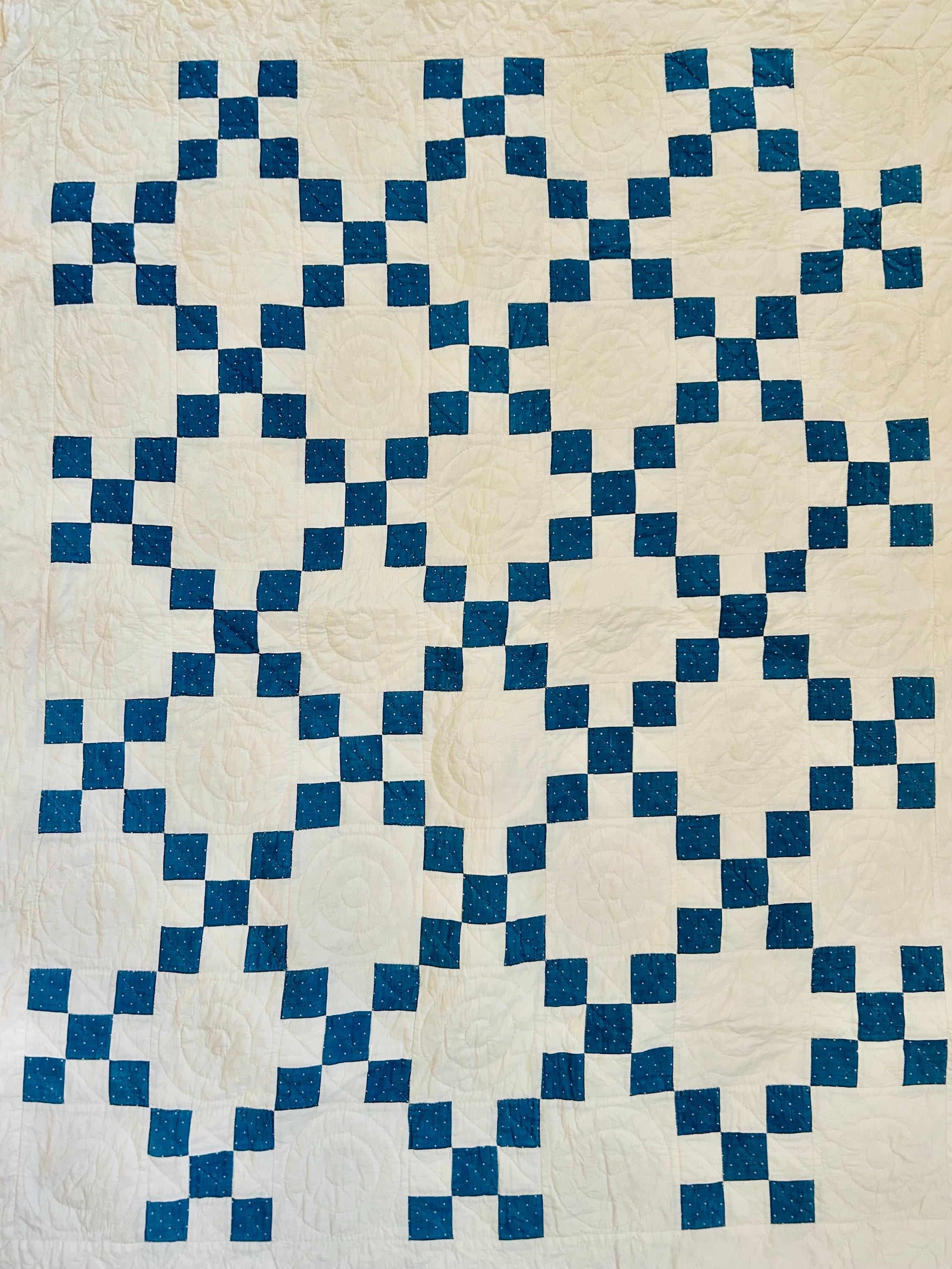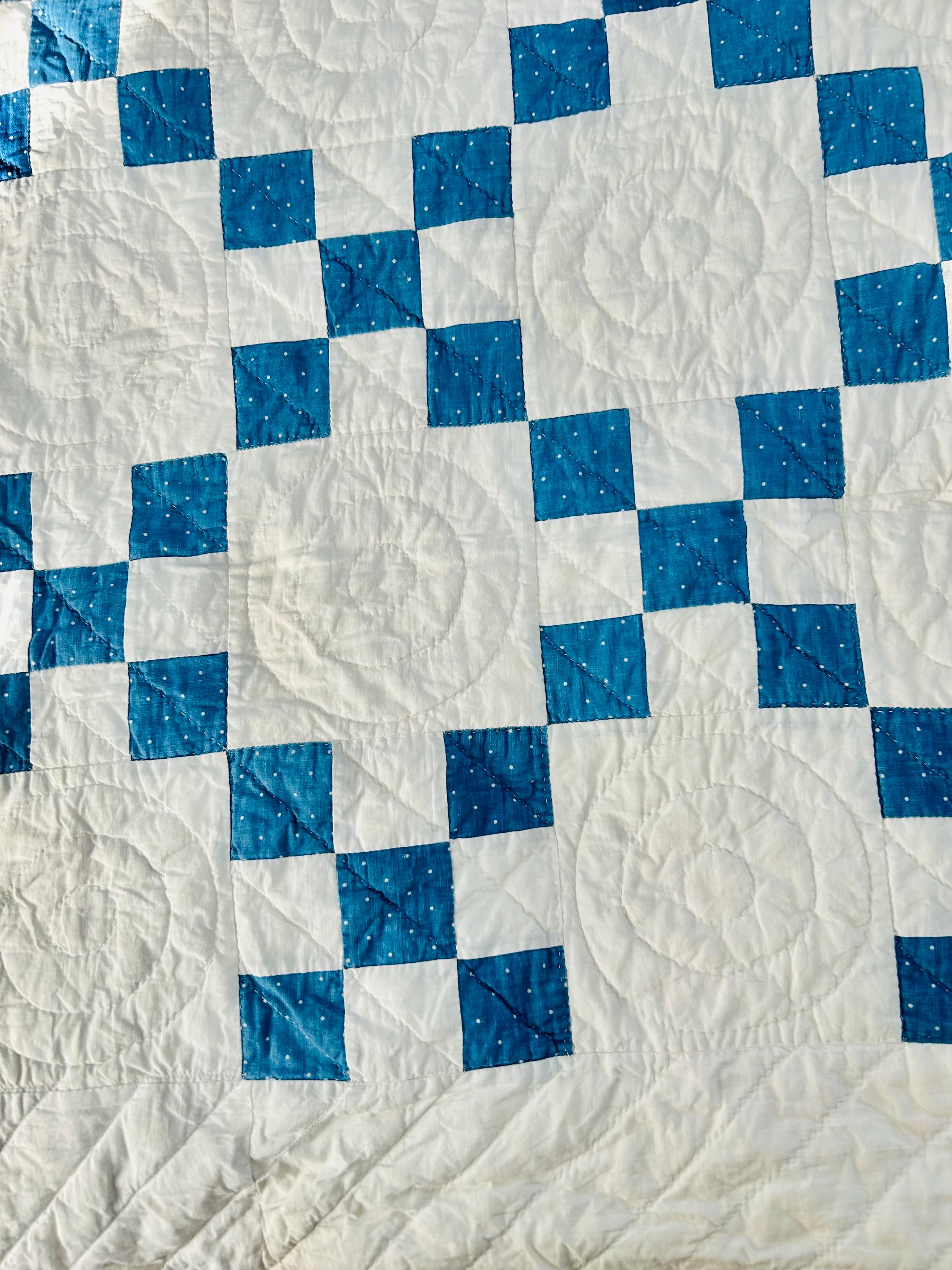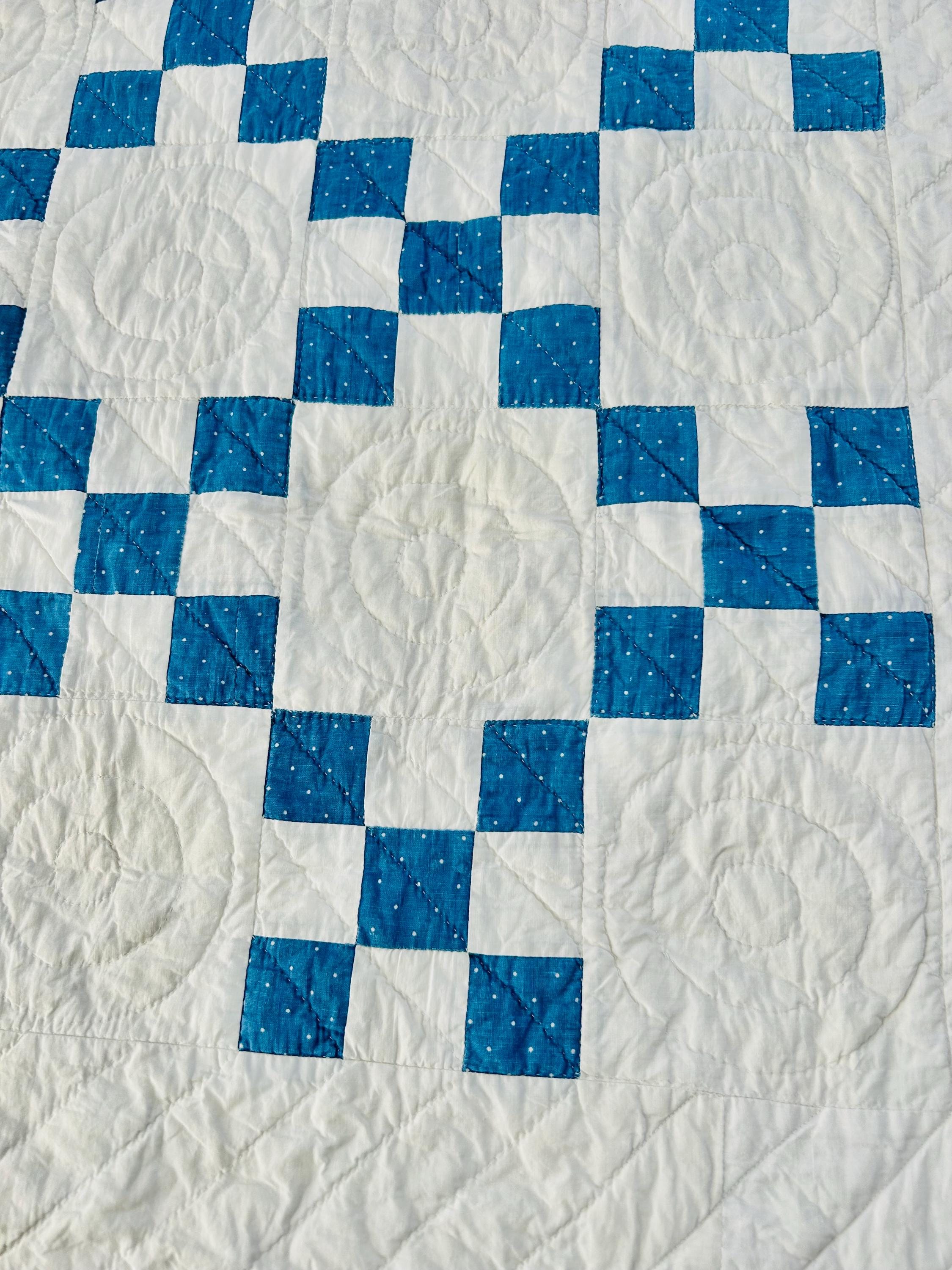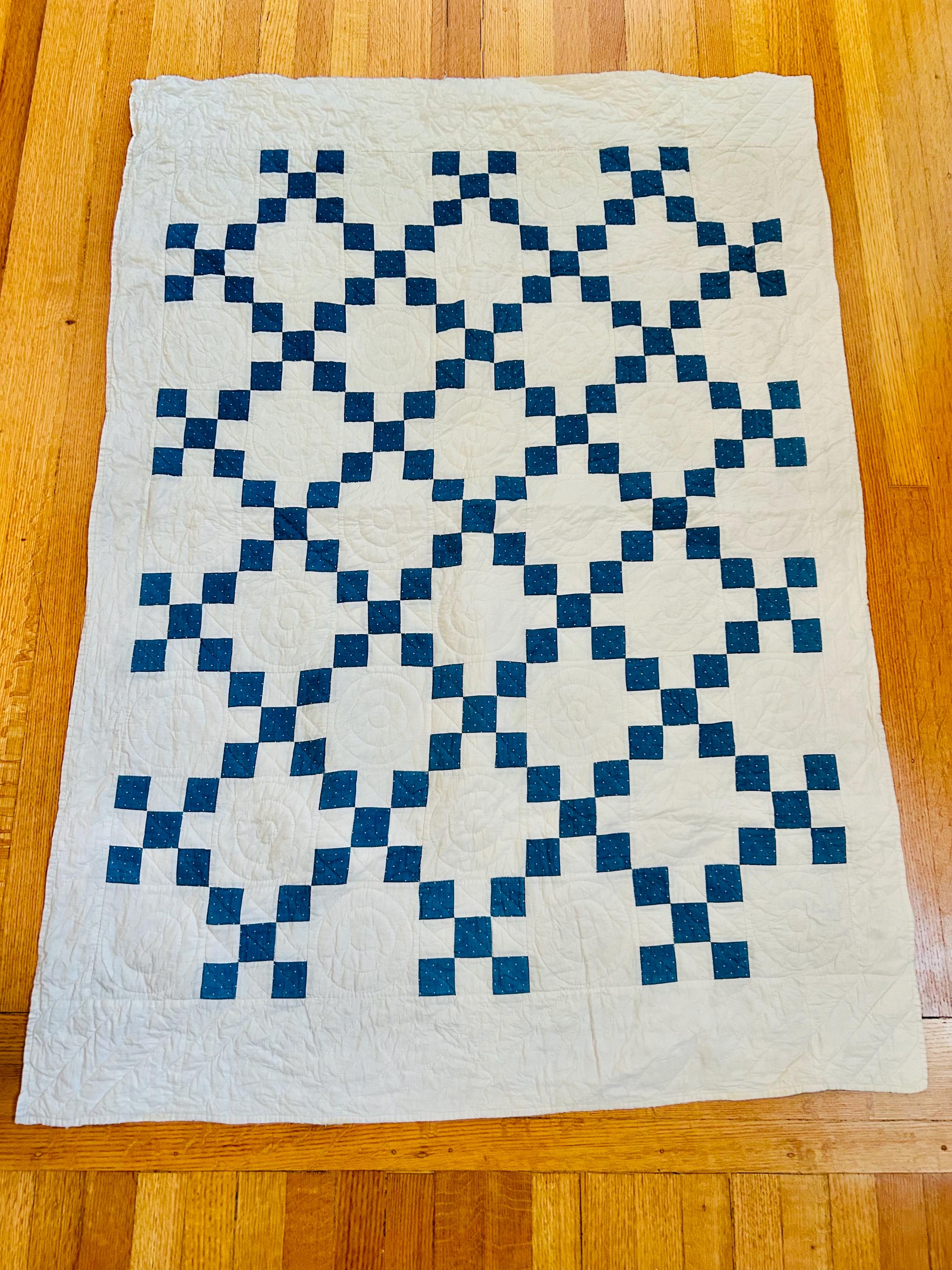 Details: Pattern: Single Irish Chain (or Double Nine Patch) Date: circa 1930s (Depression era) Construction: Hand pieced and hand quilted Materials: Cotton fabrics with cotton batting Size: 37” x 52” Colors: Turquoise blue with white dots and white background Quilting: Spiral motifs in the blocks with curved line quilting in the chains