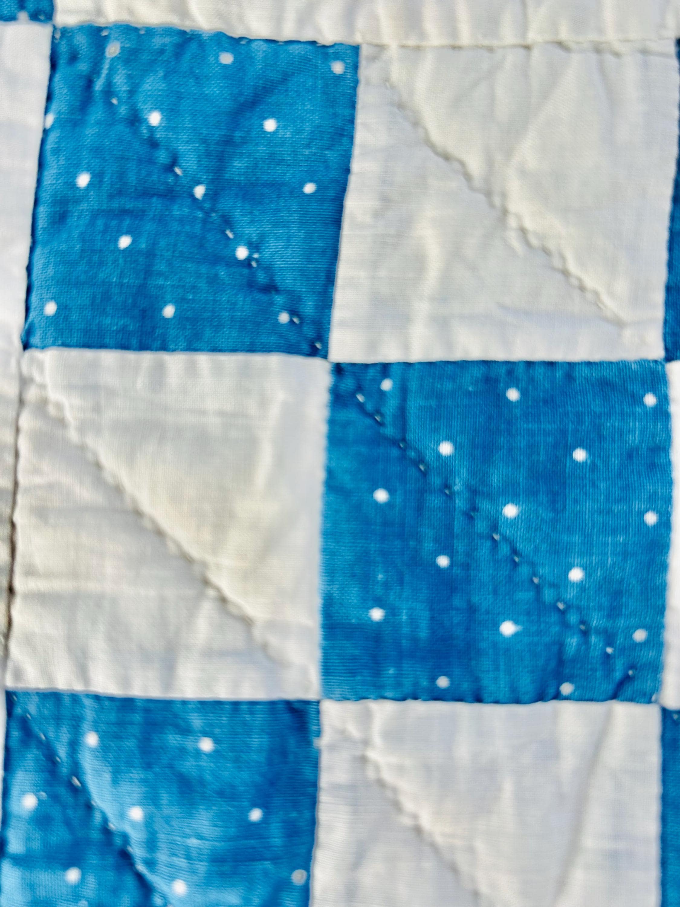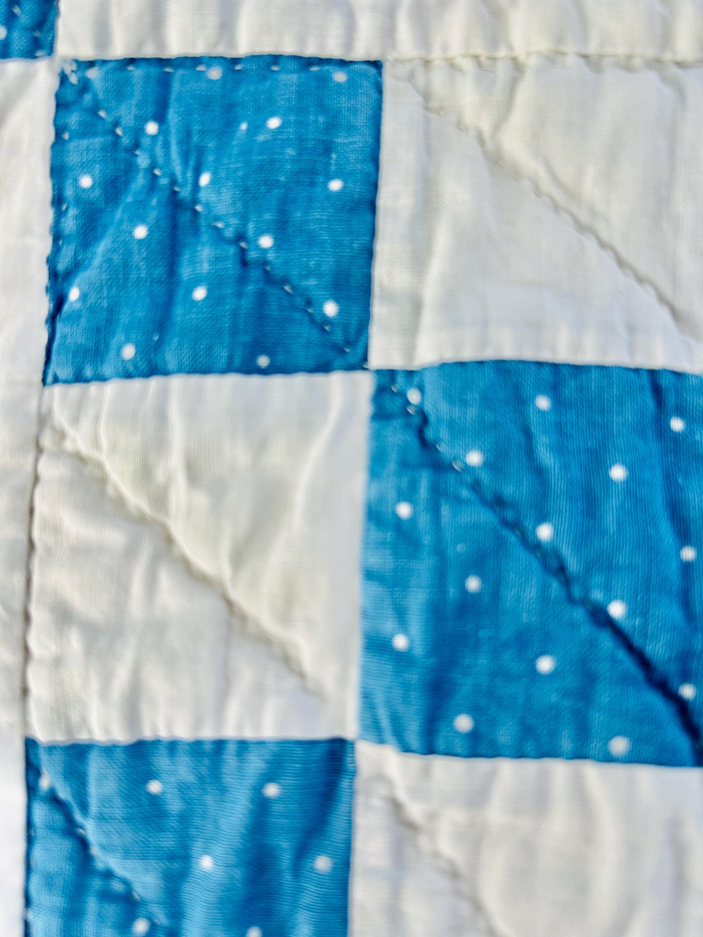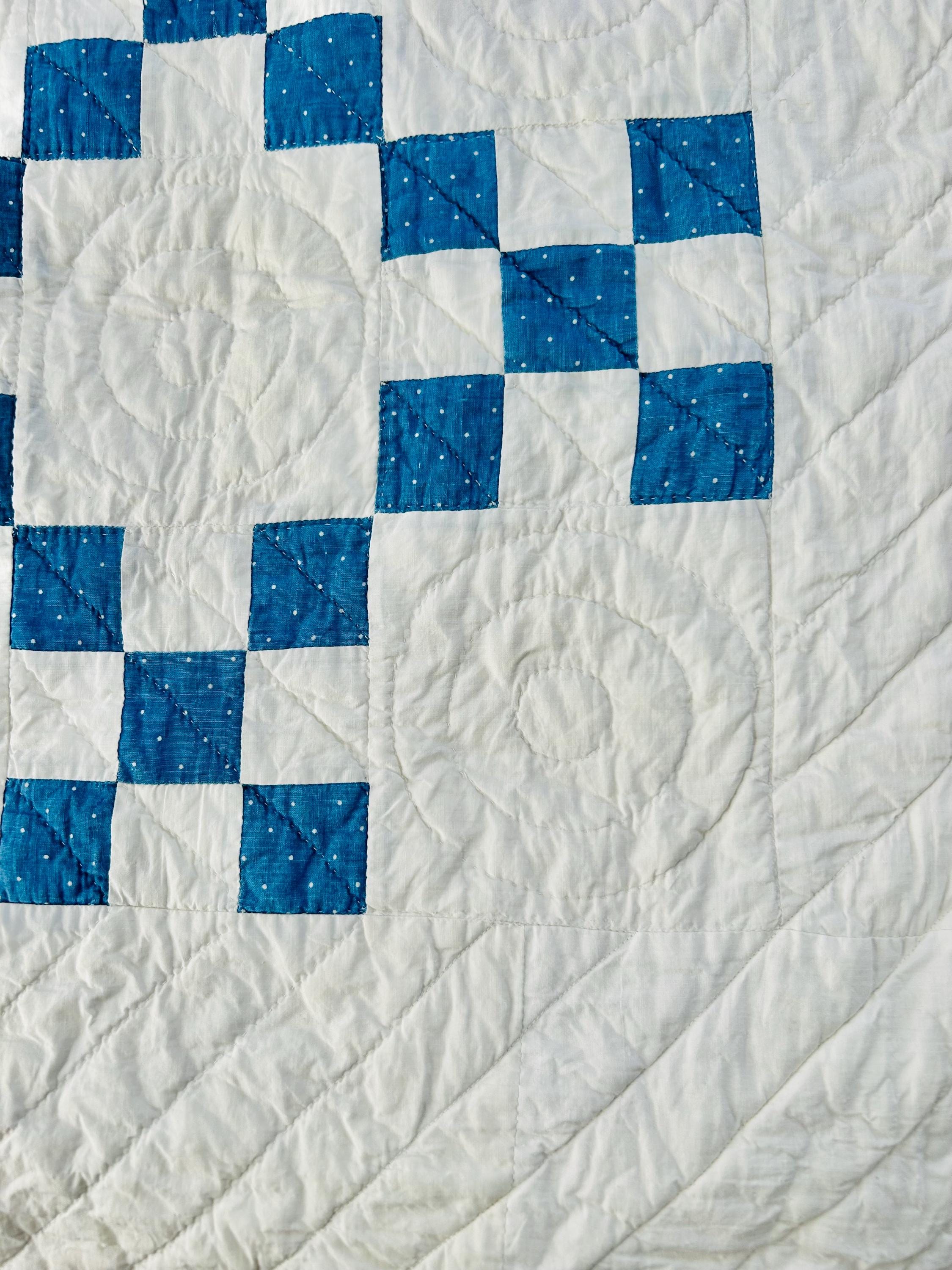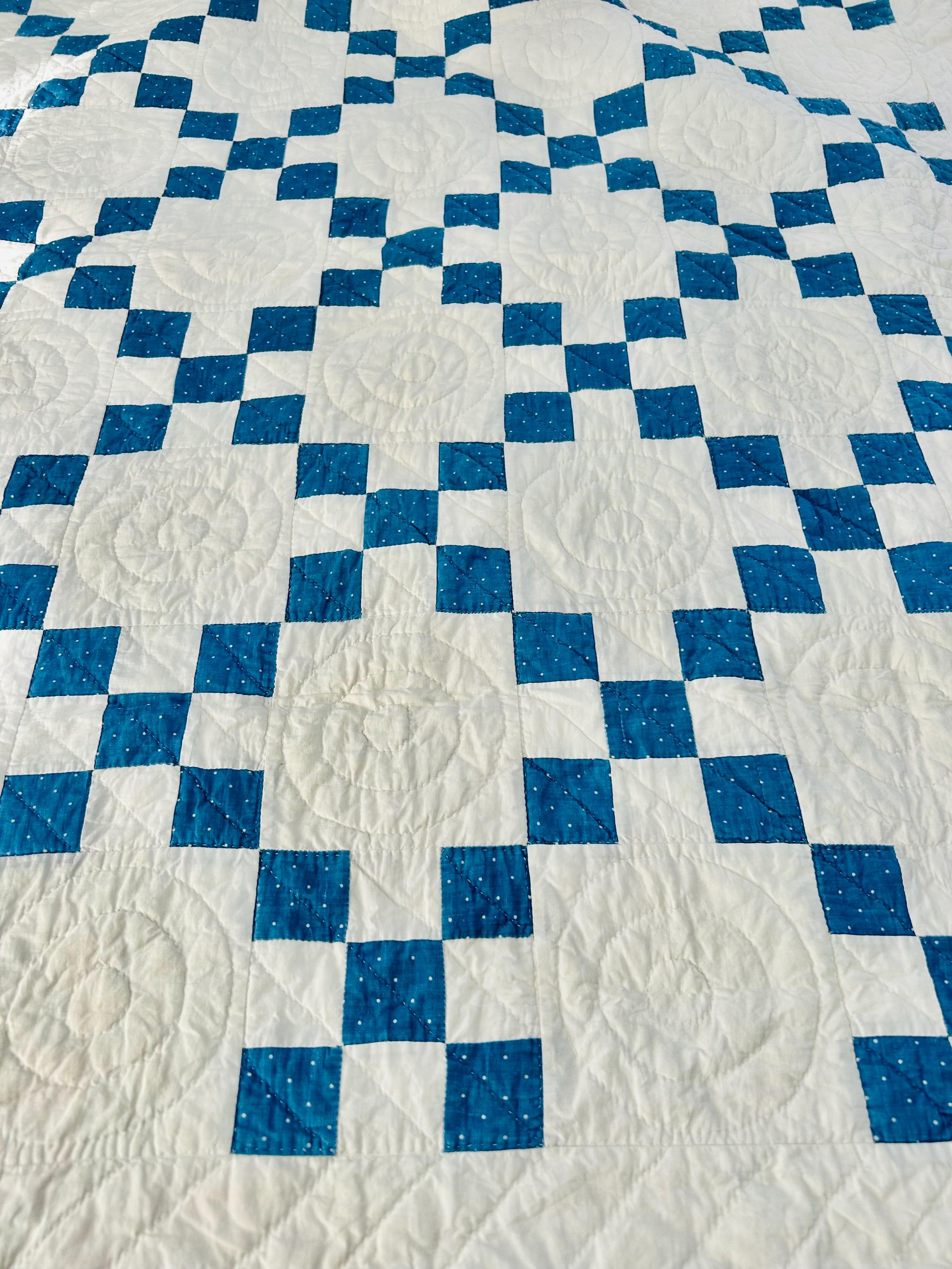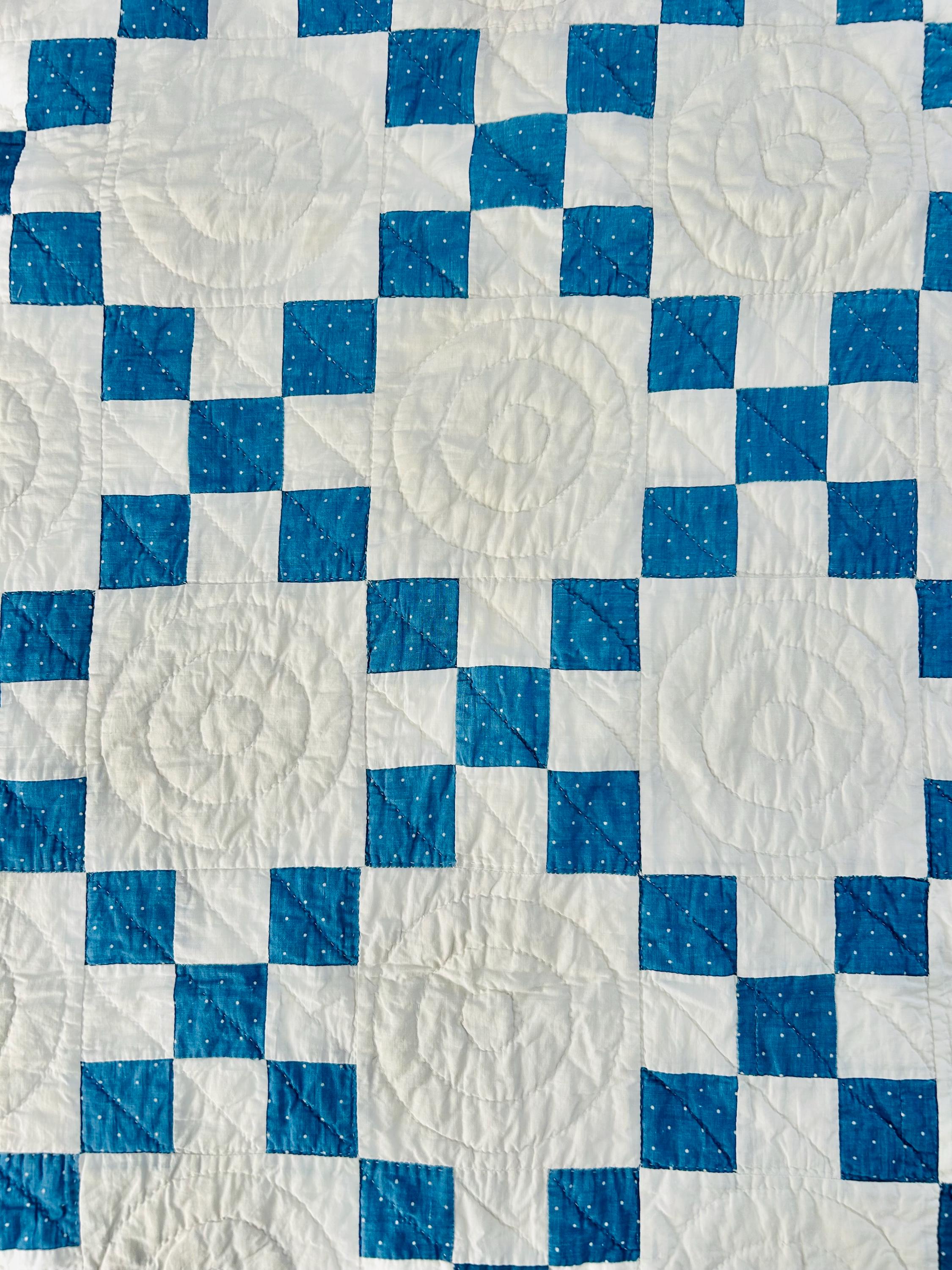 Details: Pattern: Single Irish Chain (or Double Nine Patch) Date: circa 1930s (Depression era) Construction: Hand pieced and hand quilted Materials: Cotton fabrics with cotton batting Size: 37” x 52” Colors: Turquoise blue with white dots and white background Quilting: Spiral motifs in the blocks with curved line quilting in the chains