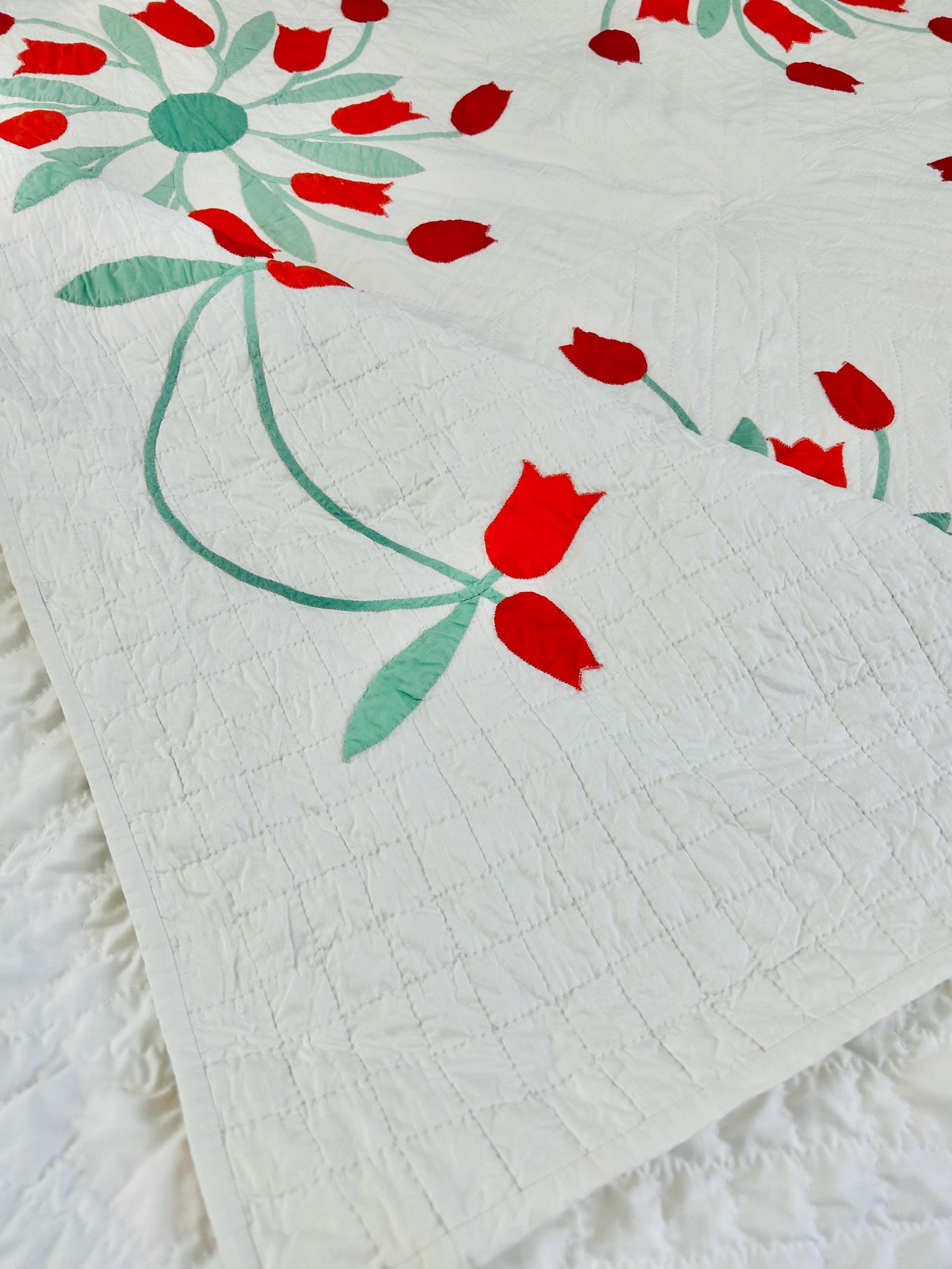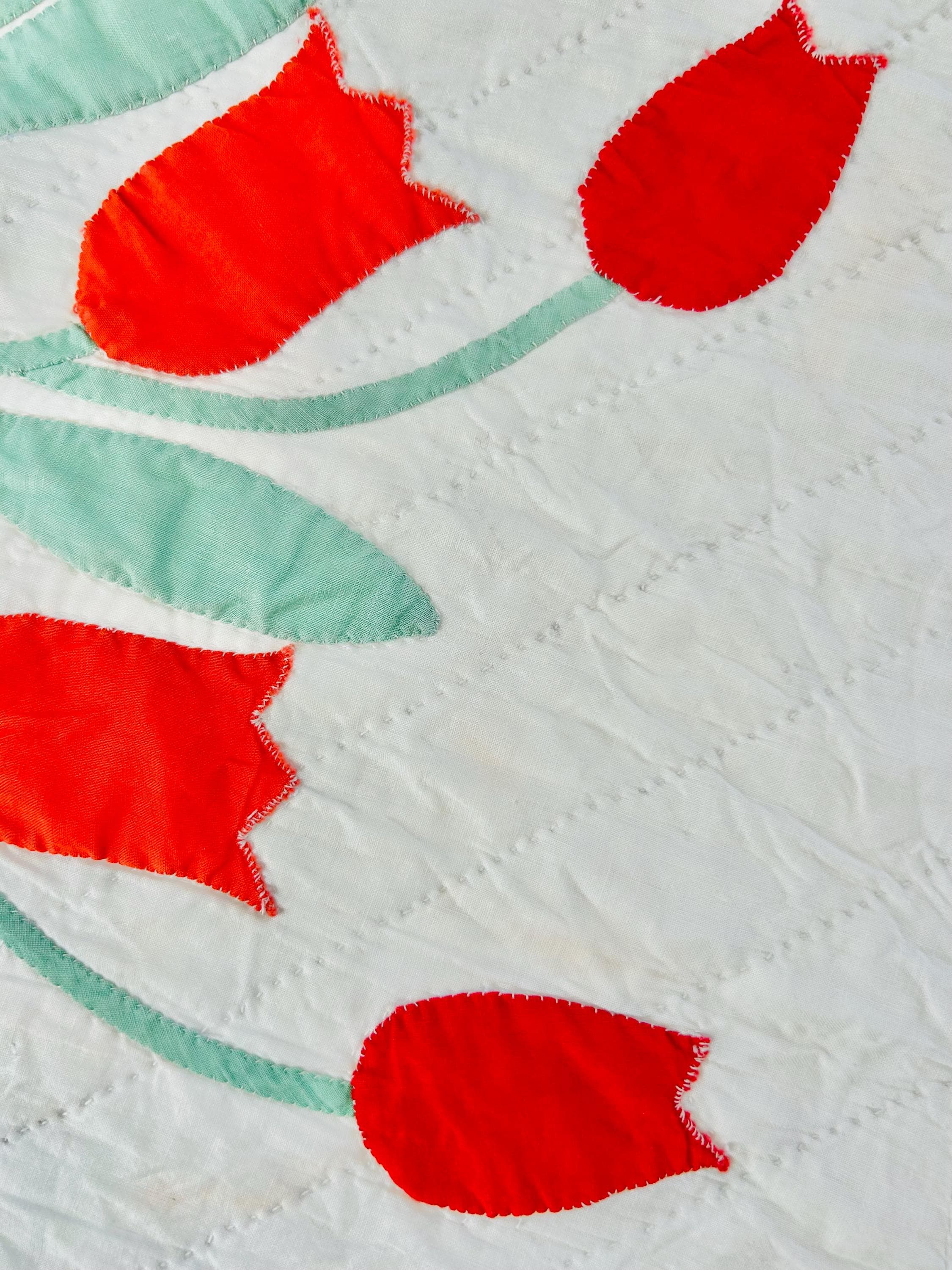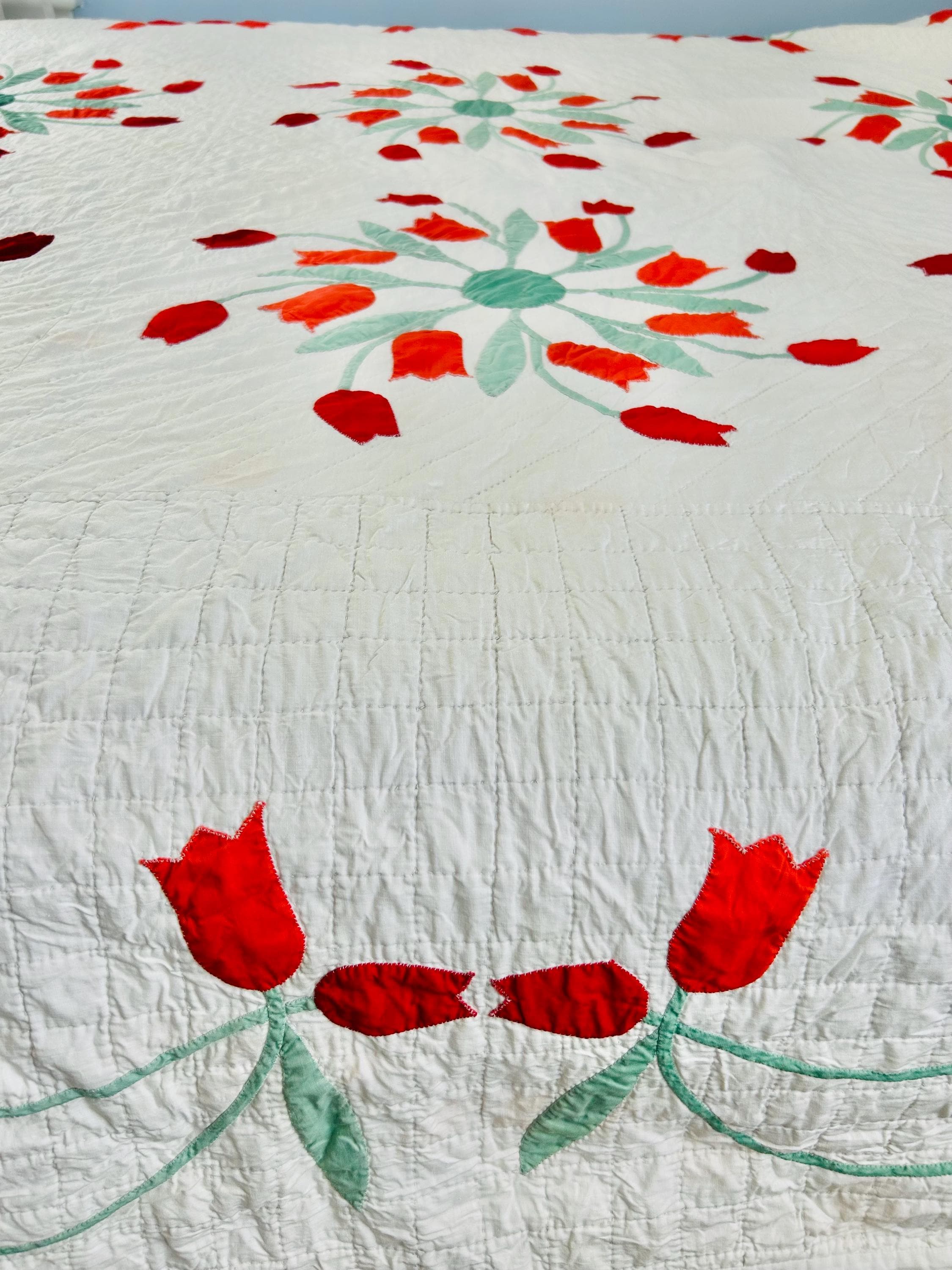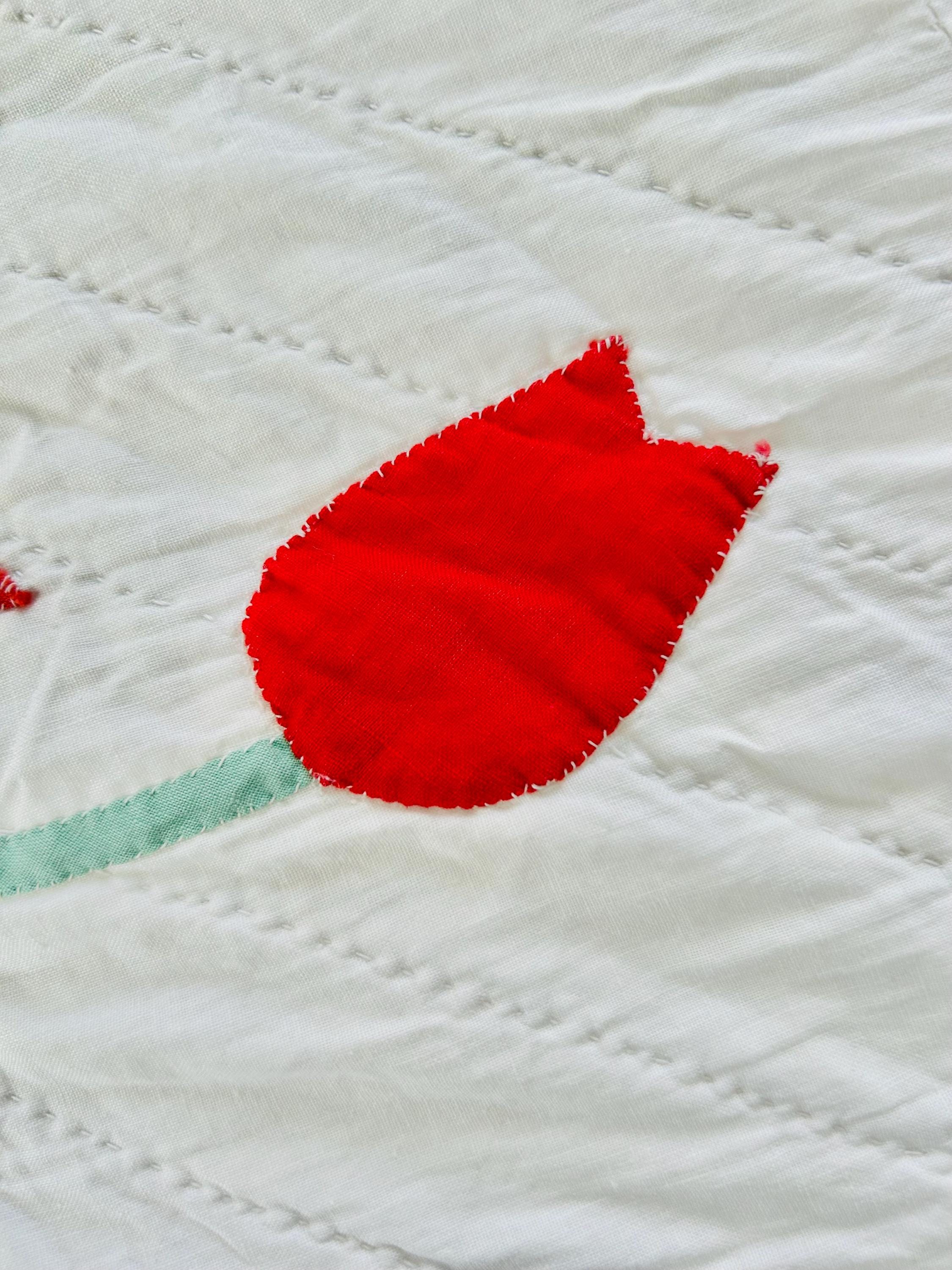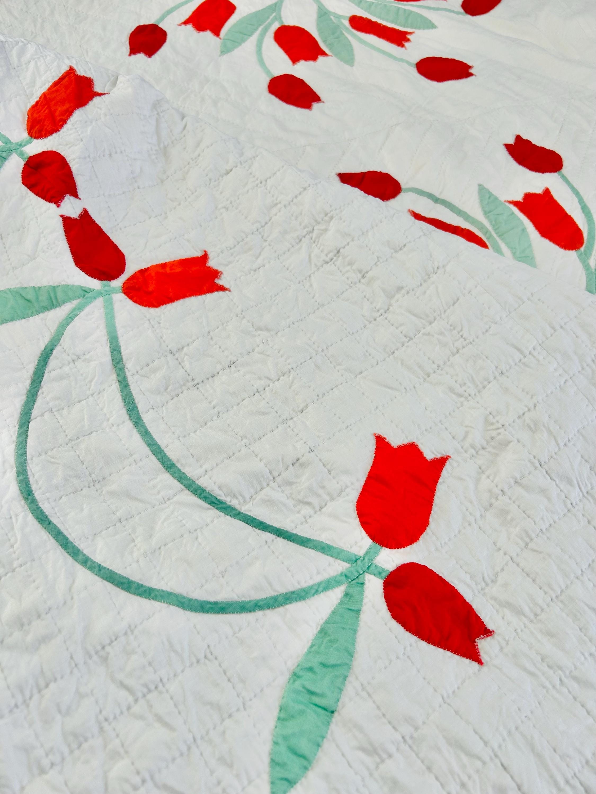 Details • Date: circa 1940s–1950s • Pattern: Dancing Tulips appliqué (or Tulip Wreath style) • Size: 77” x 97” • Materials: Cotton fabrics with cotton batting • Construction: Hand appliquéd with tiny blanket stitching • Quilting: Hand quilted diagonal grid with crosshatched border • Colors: White background with red and orange tulips and mint green leaves