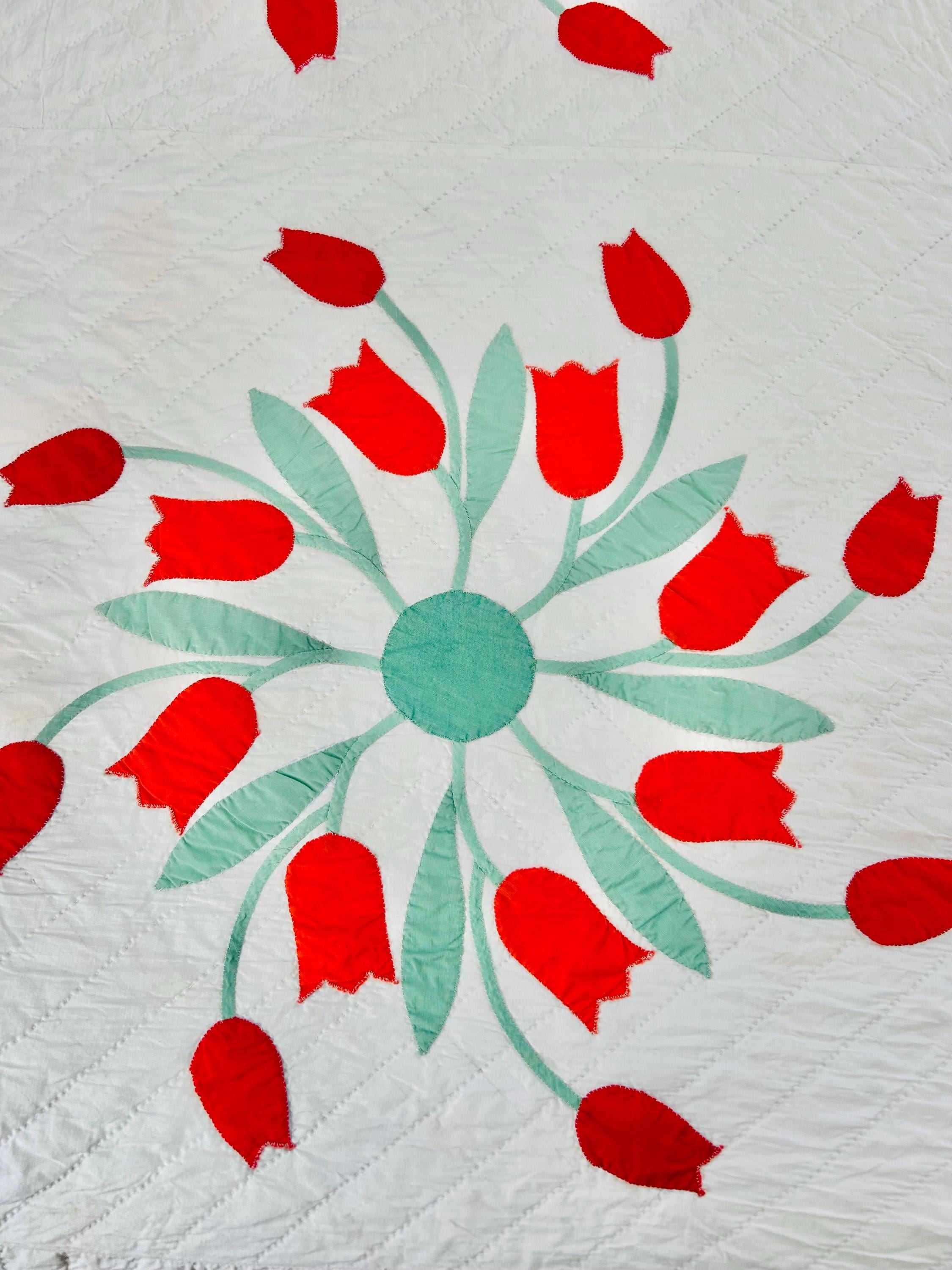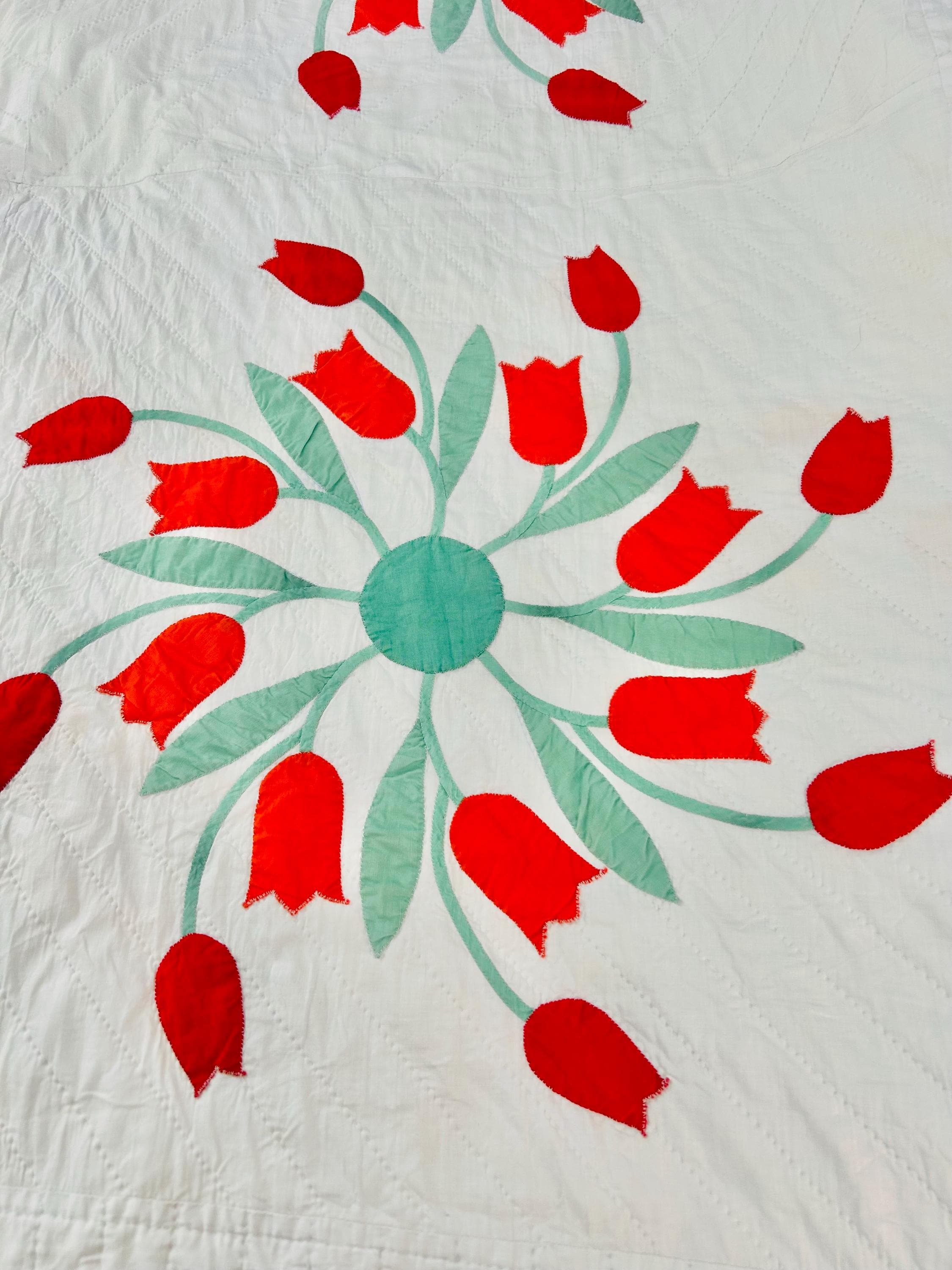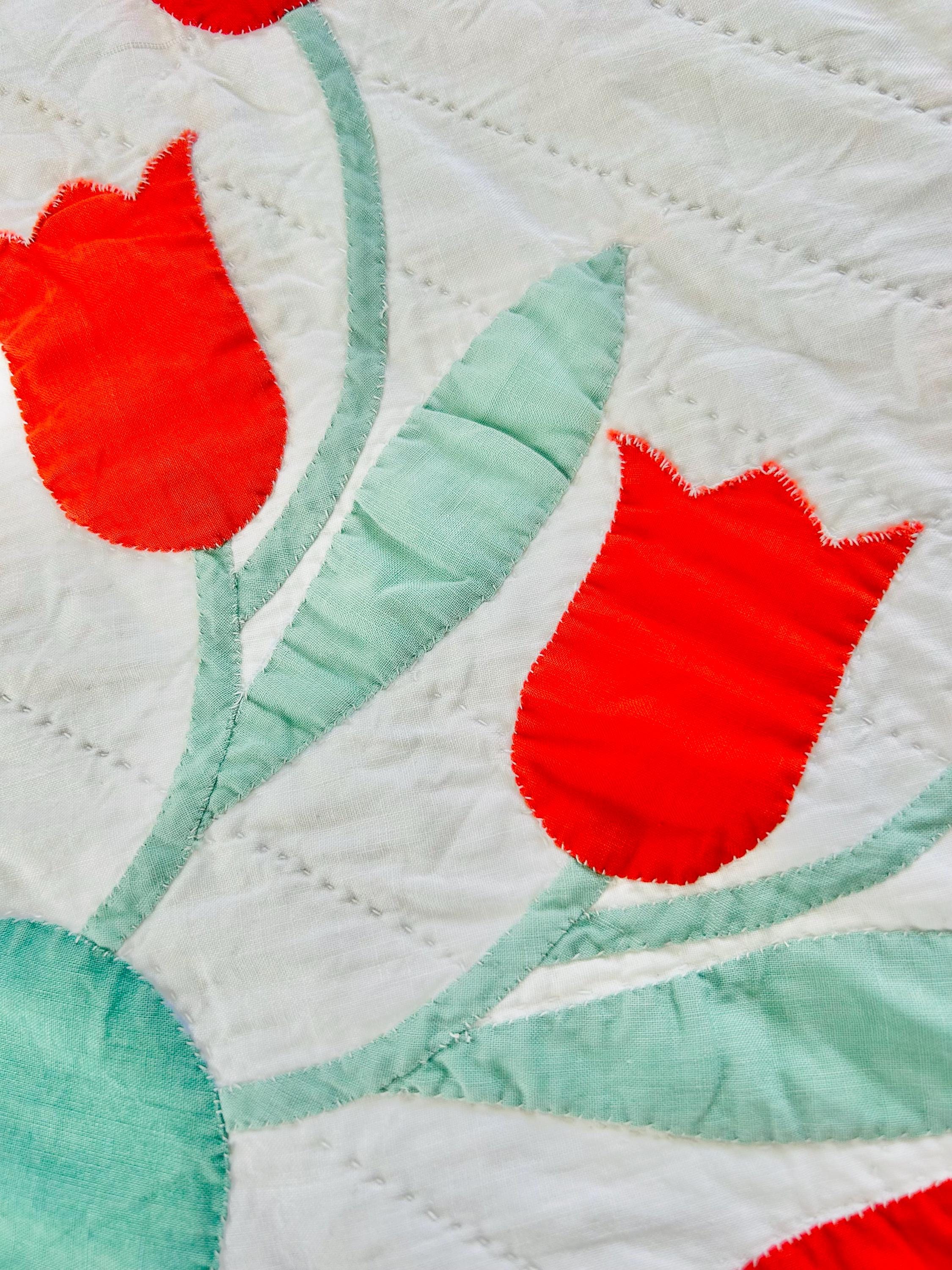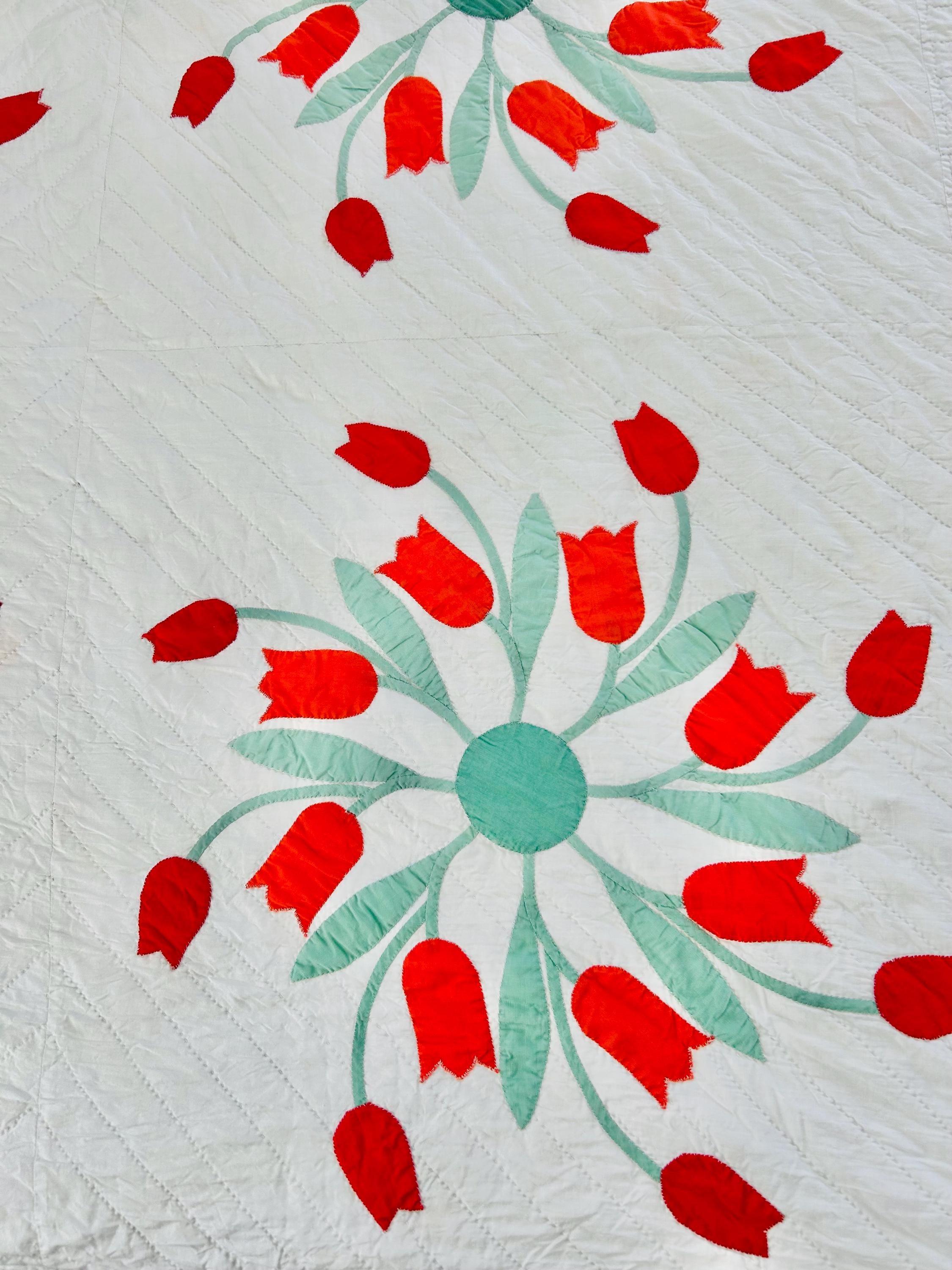 Details • Date: circa 1940s–1950s • Pattern: Dancing Tulips appliqué (or Tulip Wreath style) • Size: 77” x 97” • Materials: Cotton fabrics with cotton batting • Construction: Hand appliquéd with tiny blanket stitching • Quilting: Hand quilted diagonal grid with crosshatched border • Colors: White background with red and orange tulips and mint green leaves