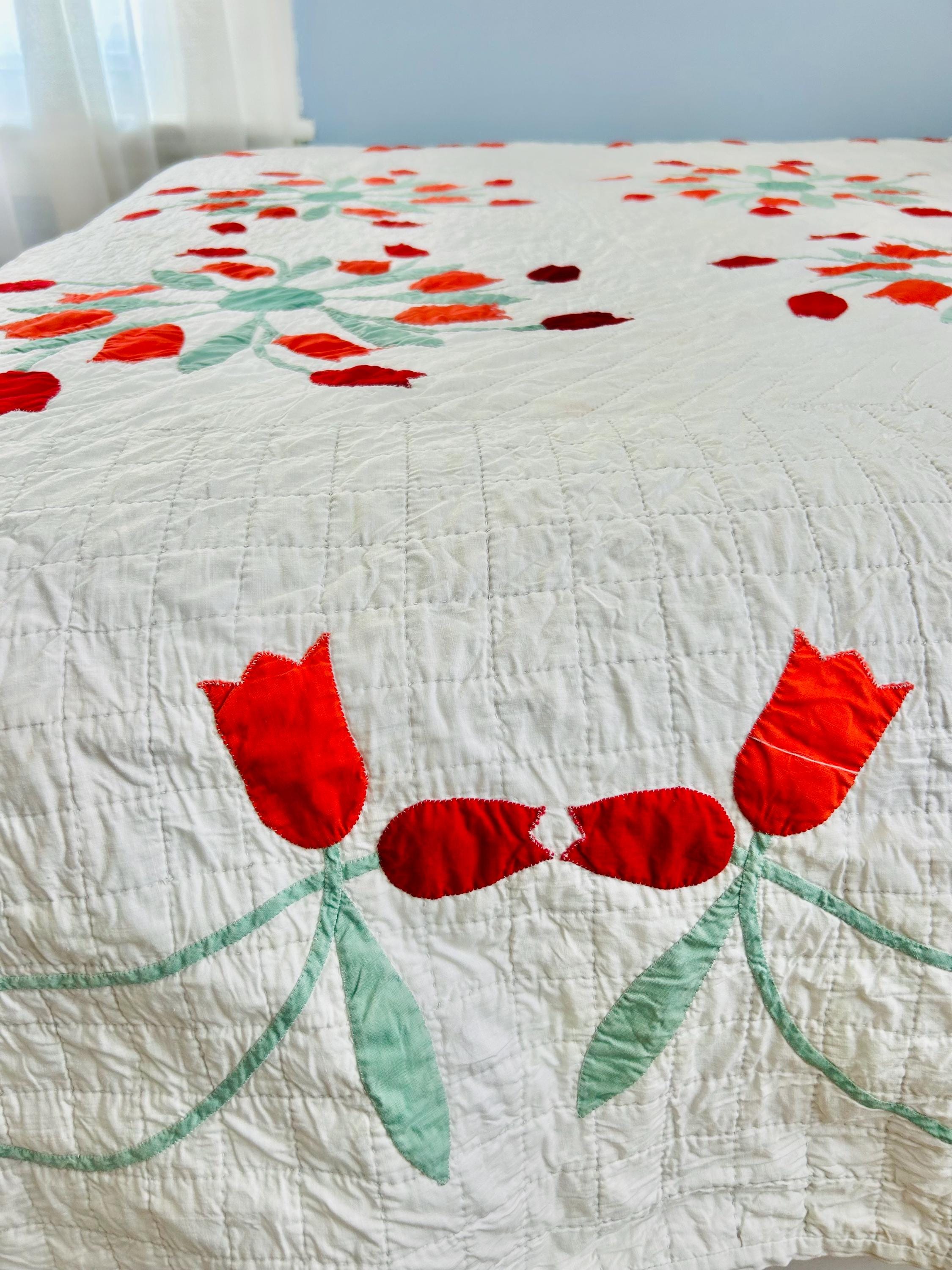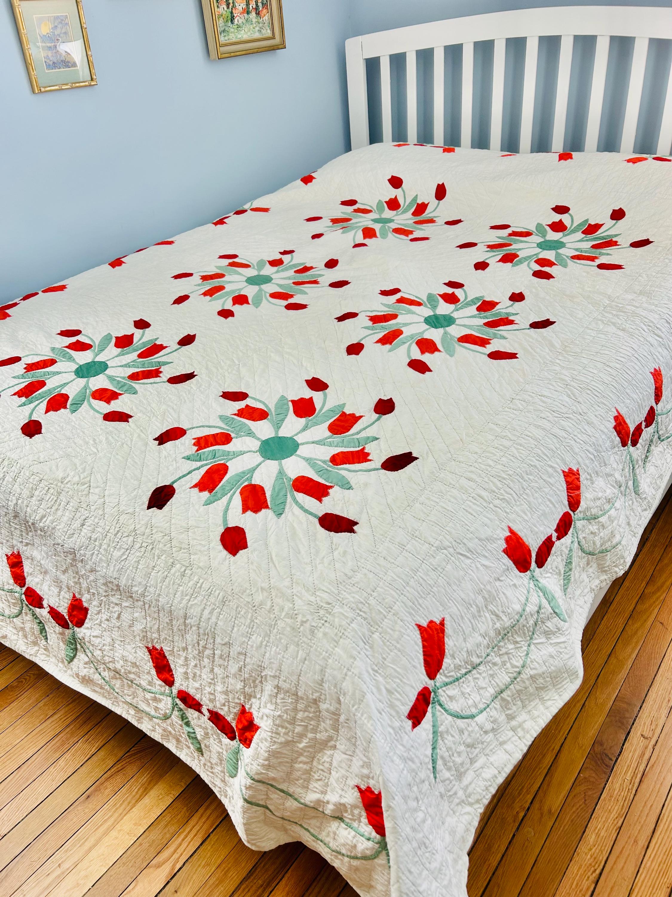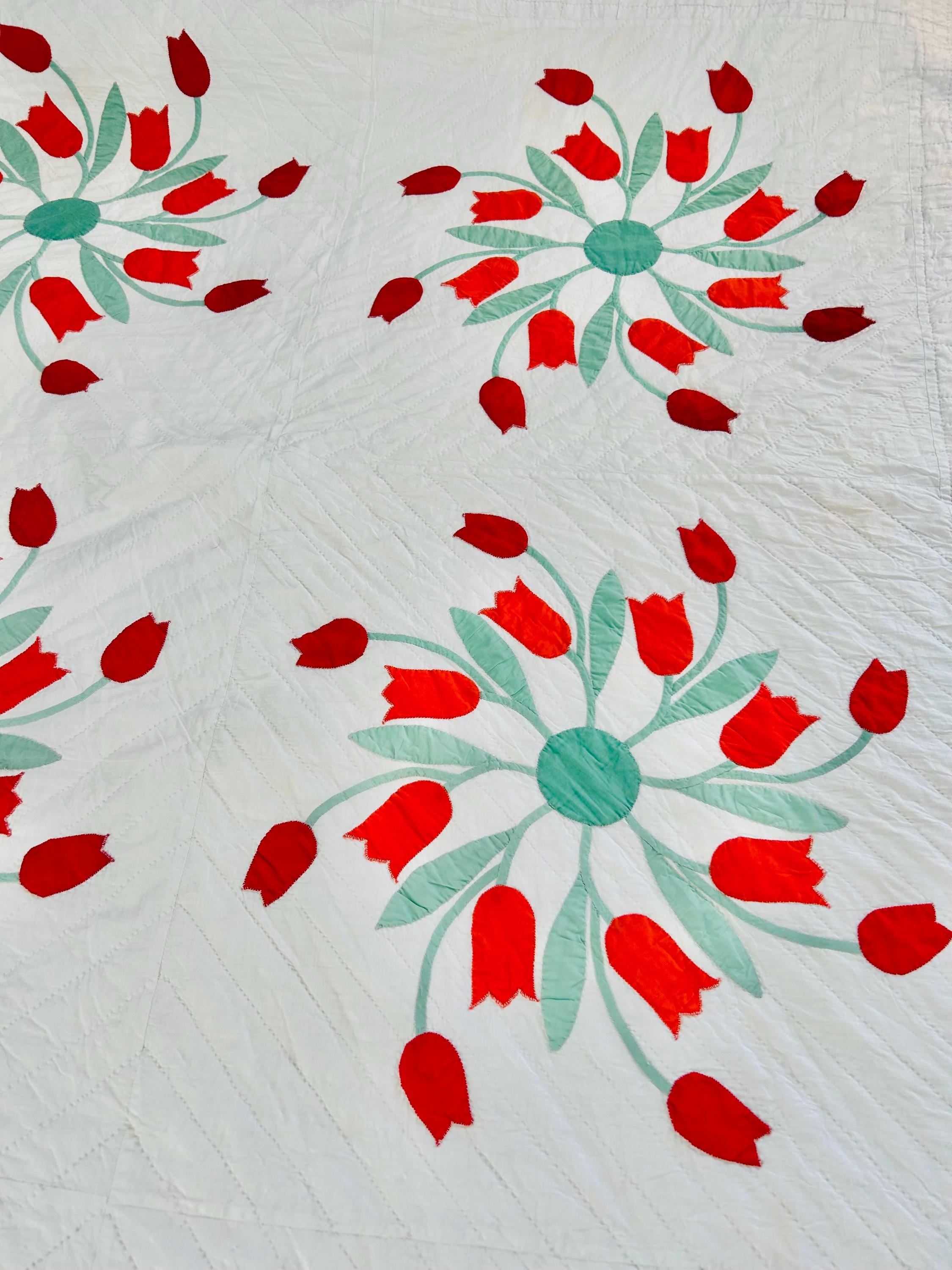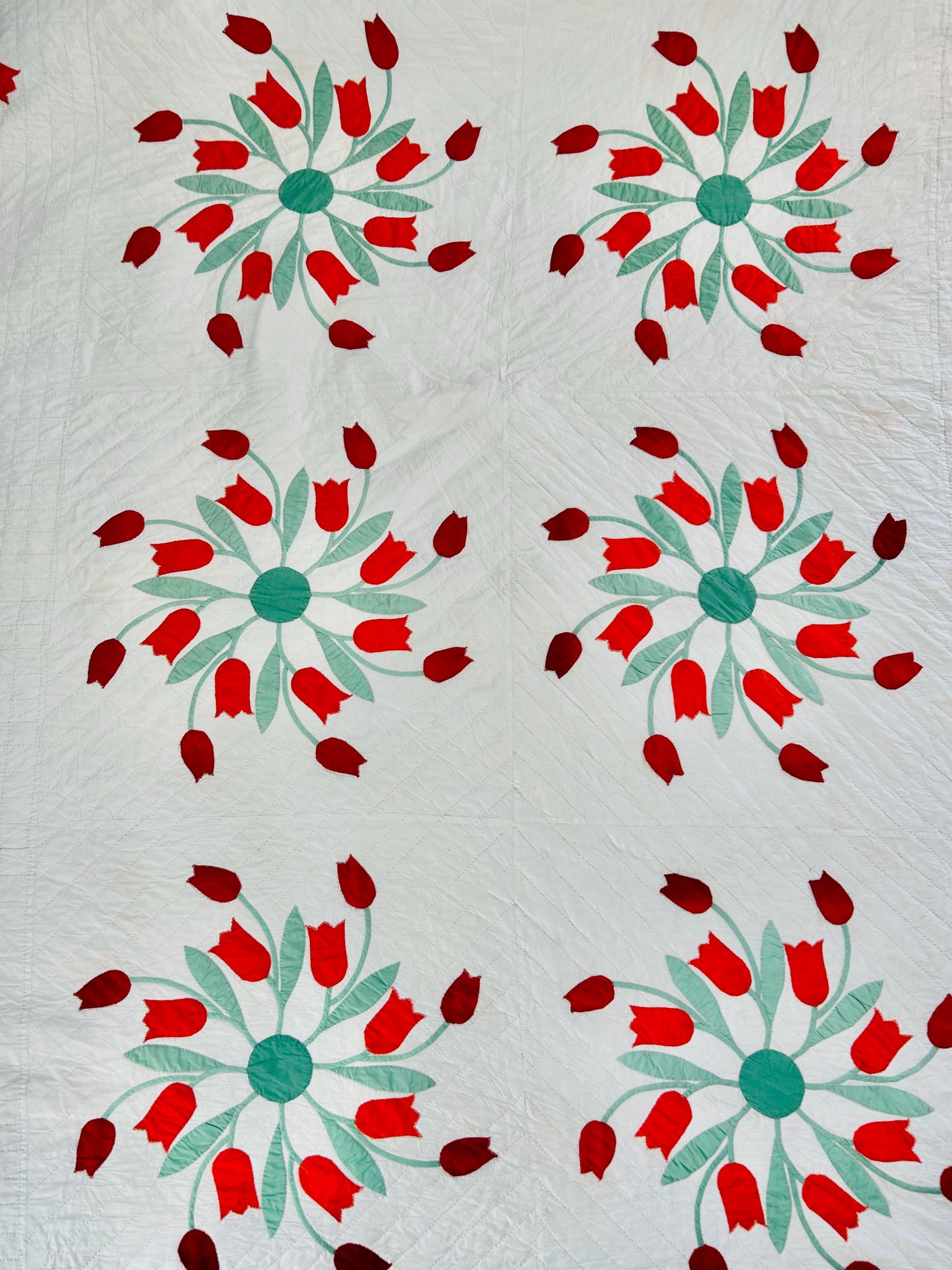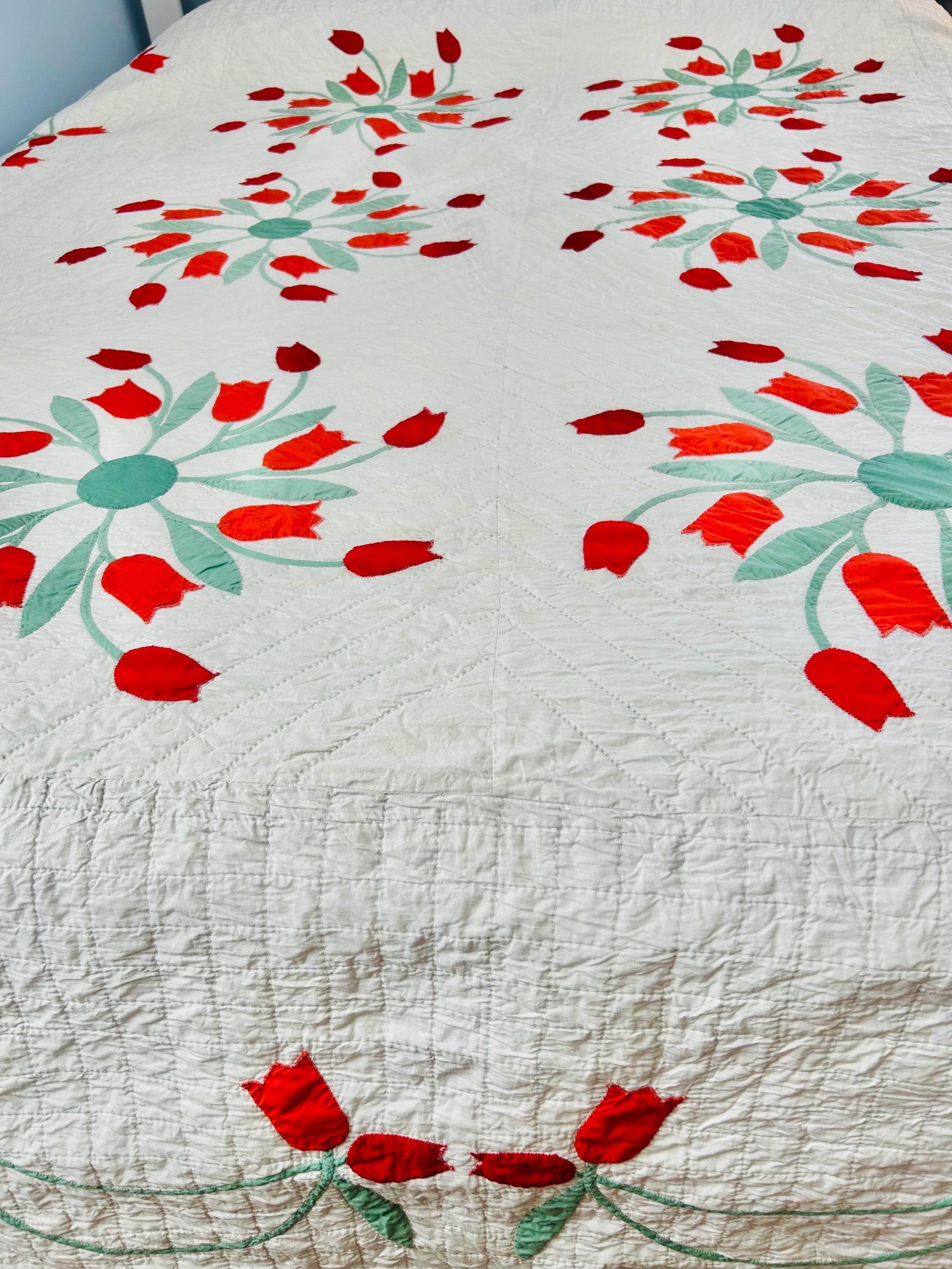 Details • Date: circa 1940s–1950s • Pattern: Dancing Tulips appliqué (or Tulip Wreath style) • Size: 77” x 97” • Materials: Cotton fabrics with cotton batting • Construction: Hand appliquéd with tiny blanket stitching • Quilting: Hand quilted diagonal grid with crosshatched border • Colors: White background with red and orange tulips and mint green leaves