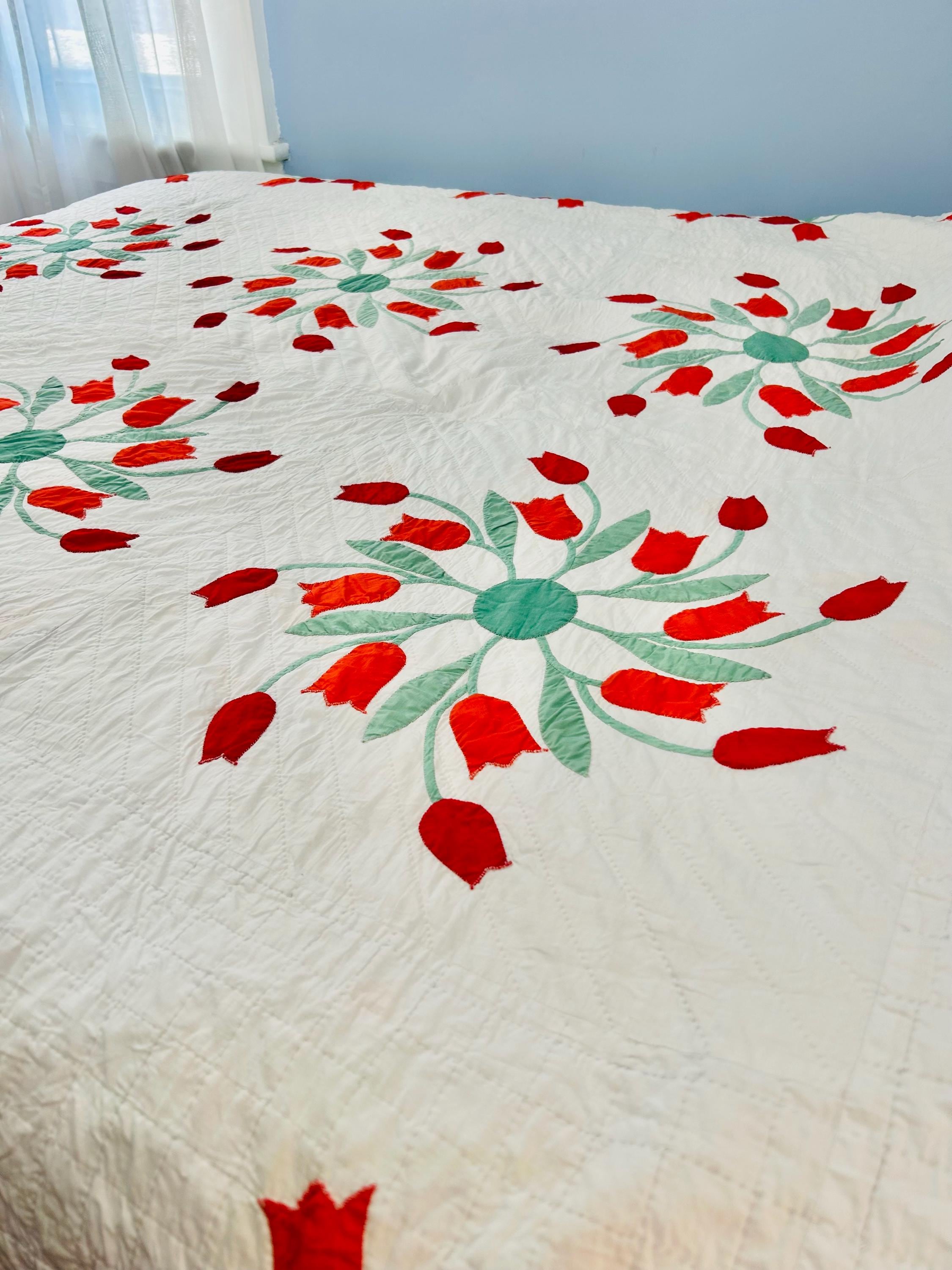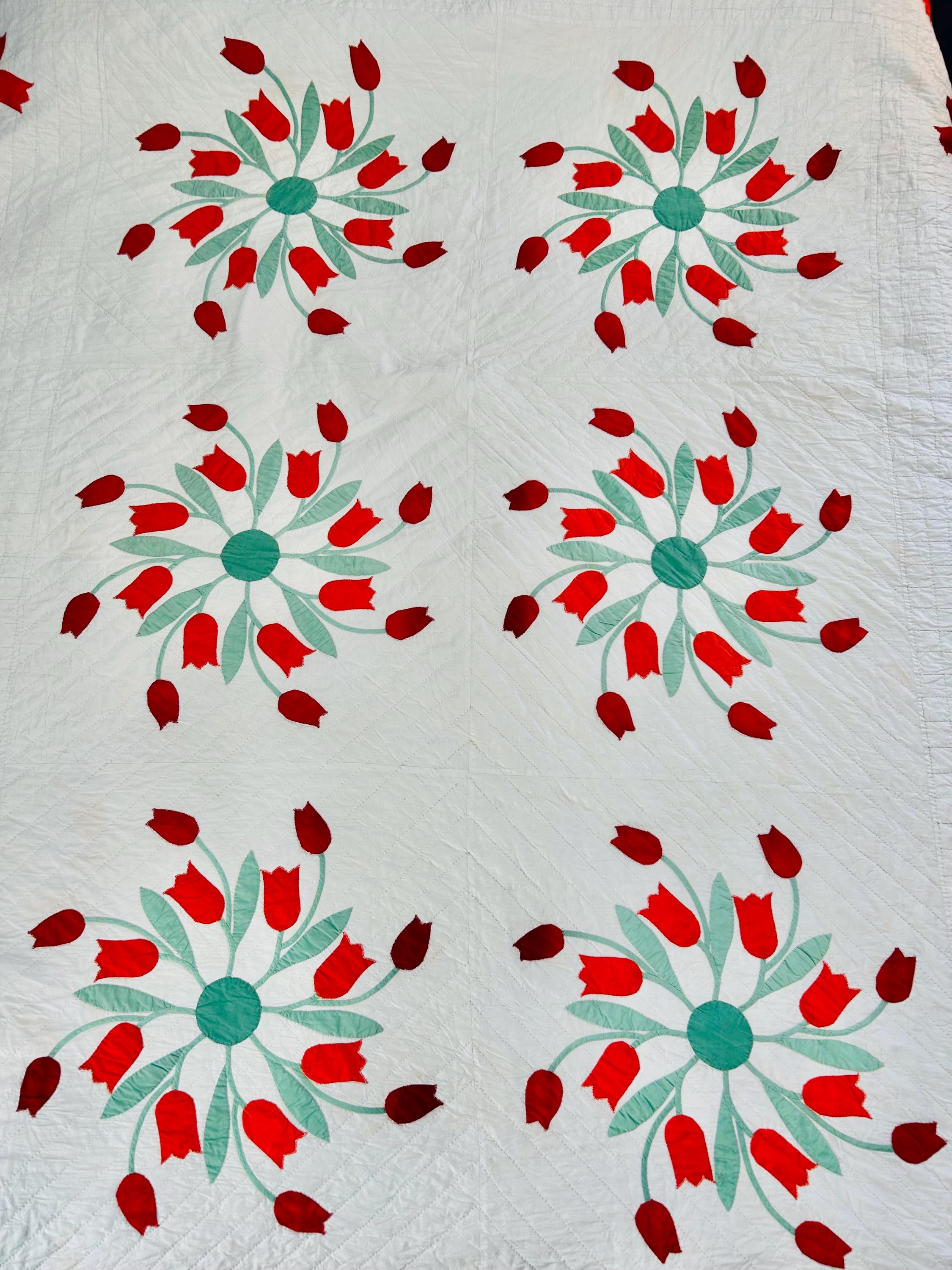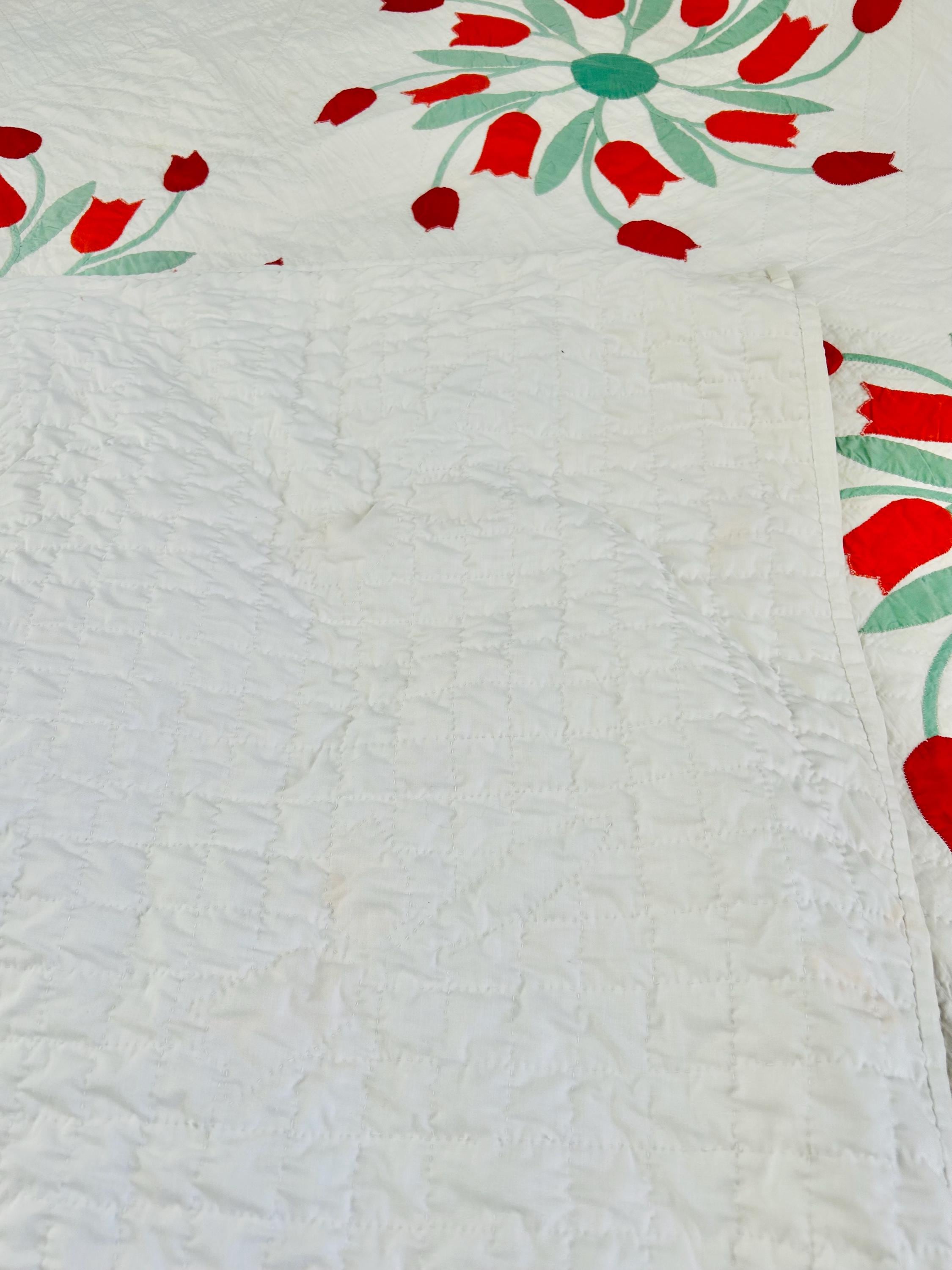 This beautiful vintage Dancing Tulips Quilt dates to approximately the late 1940s to early 1950s and features a striking floral design of vibrant red tulips arranged in circular wreaths across a crisp white background. The quilt is entirely hand appliquéd and hand quilted in very tiny, expert stitching.