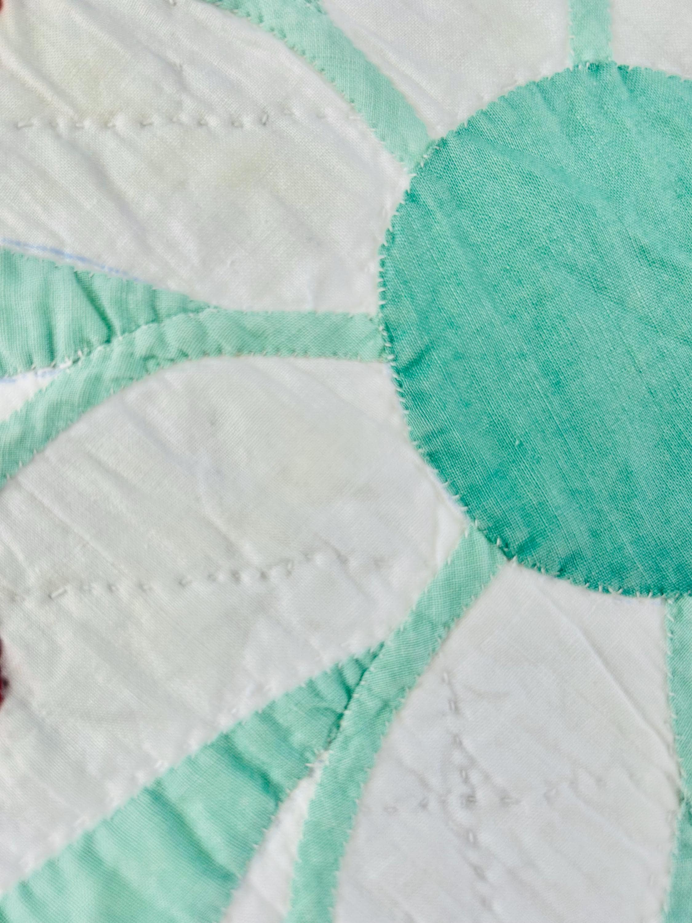 The back is white cotton as is the binding that has been machine-stitched to the front and hand-stitched to the back. The cotton batting is very lightweight.
