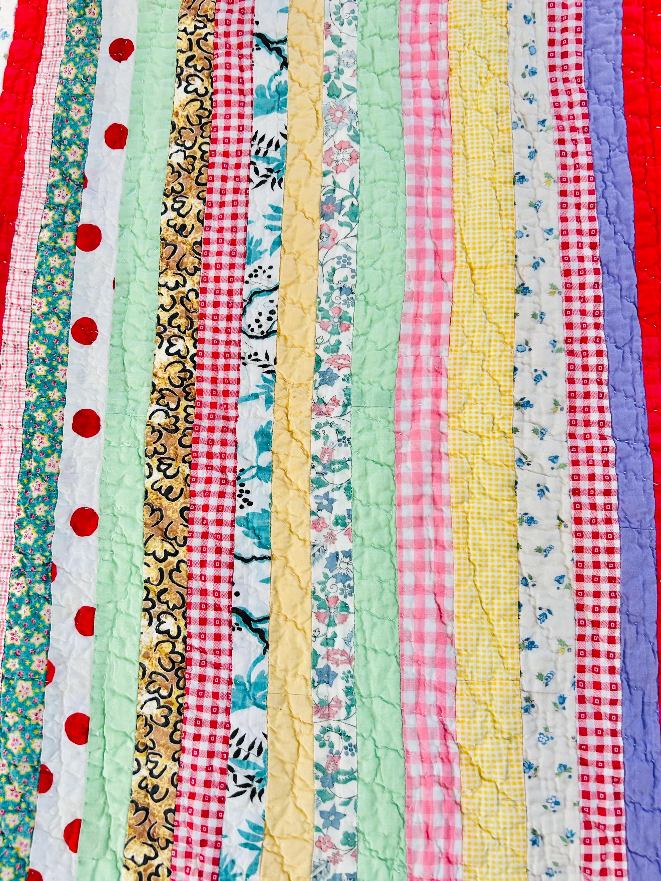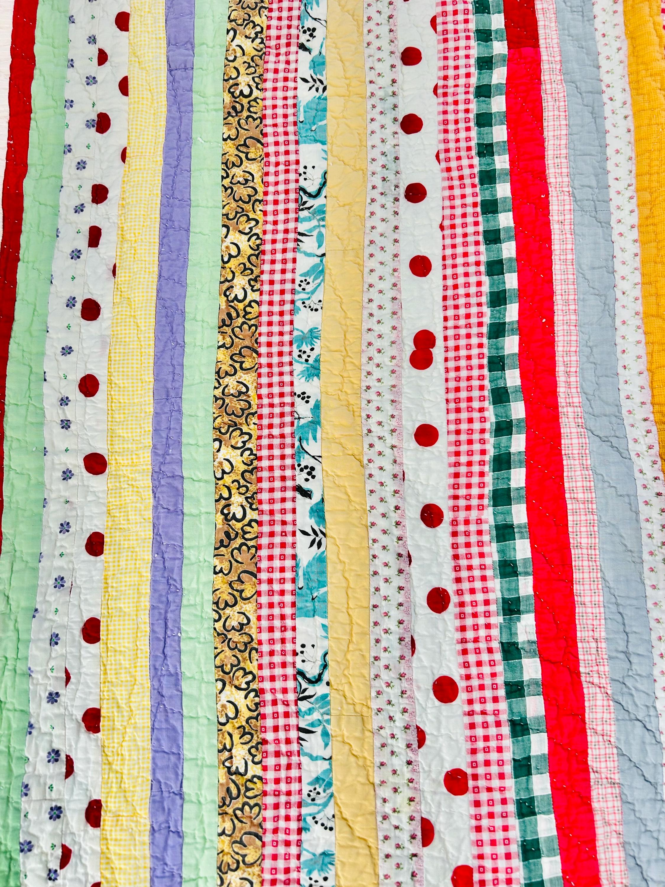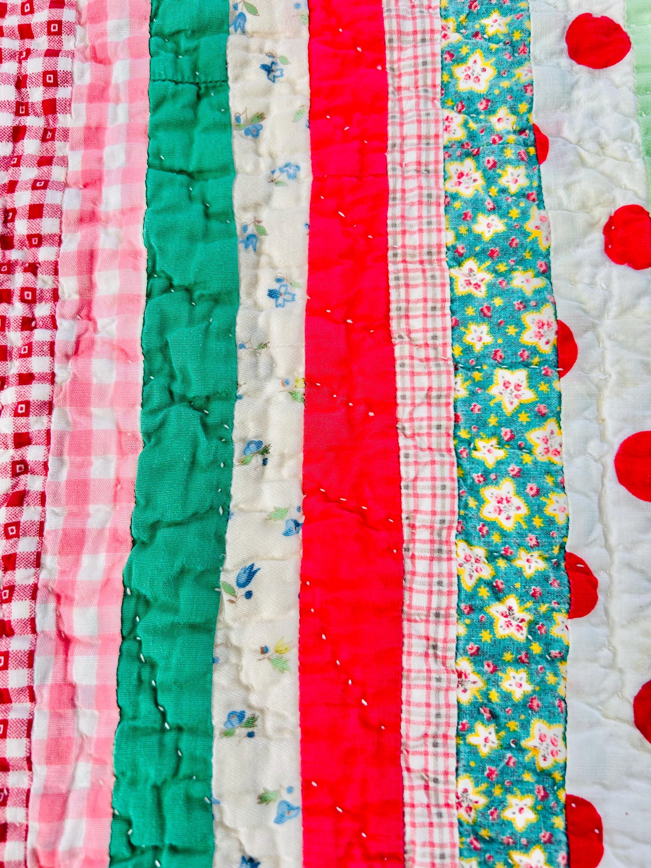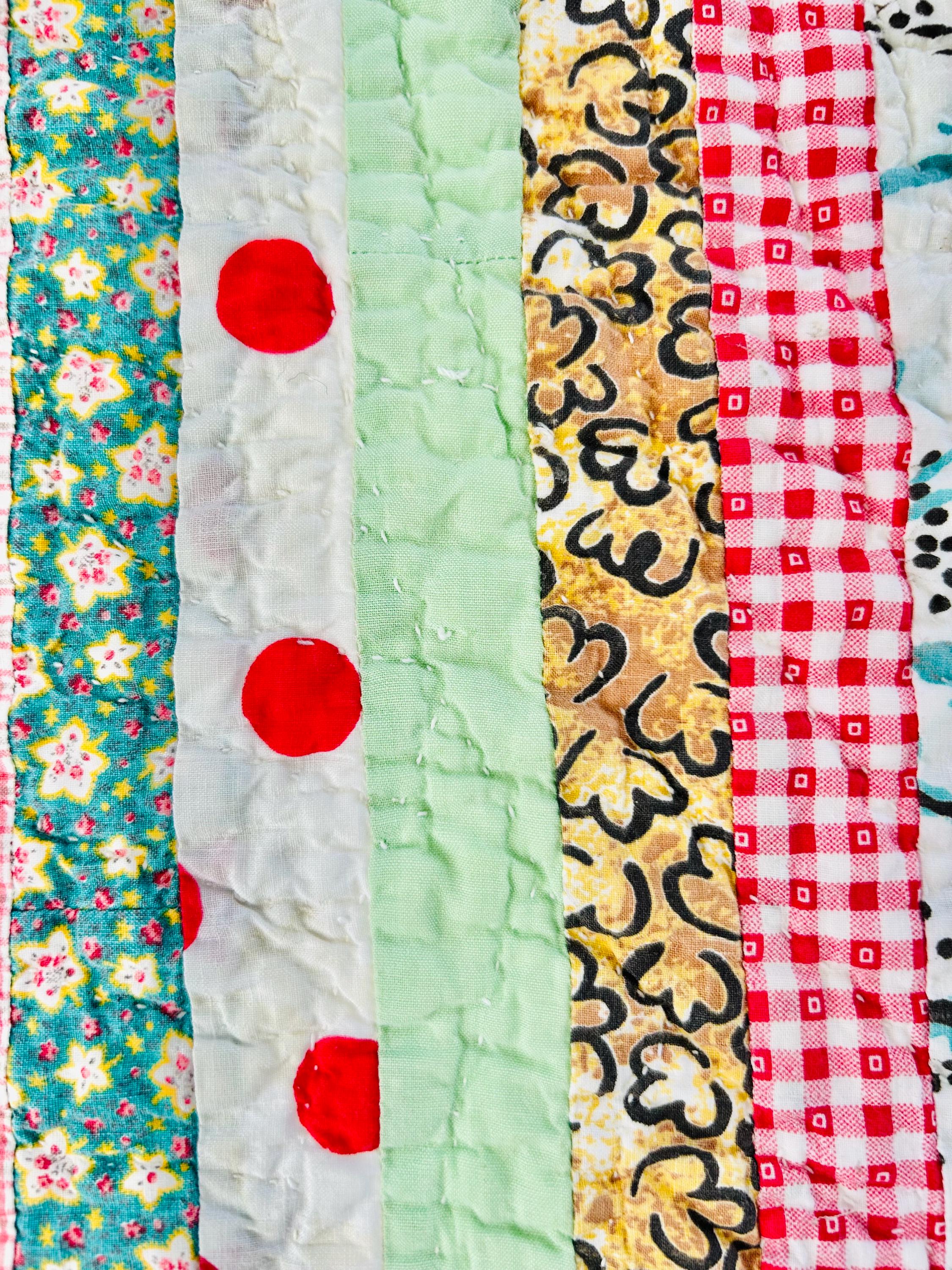 This charming vintage scrap quilt was made during the Depression era, circa 1935–1945, and beautifully reflects the resourcefulness of quiltmakers who used every available fabric scrap. The quilt is constructed from narrow vertical strips of colorful cotton fabrics that include a wonderful mix of ginghams, florals, novelty prints, solids, small floral calicos, red-and-white checks, pastel solids, and playful polka dots. These fabrics were commonly repurposed from feed sacks, household textiles, and clothing and its smaller size suggests it was likely made as a child’s quilt, crib quilt, or utility lap quilt.