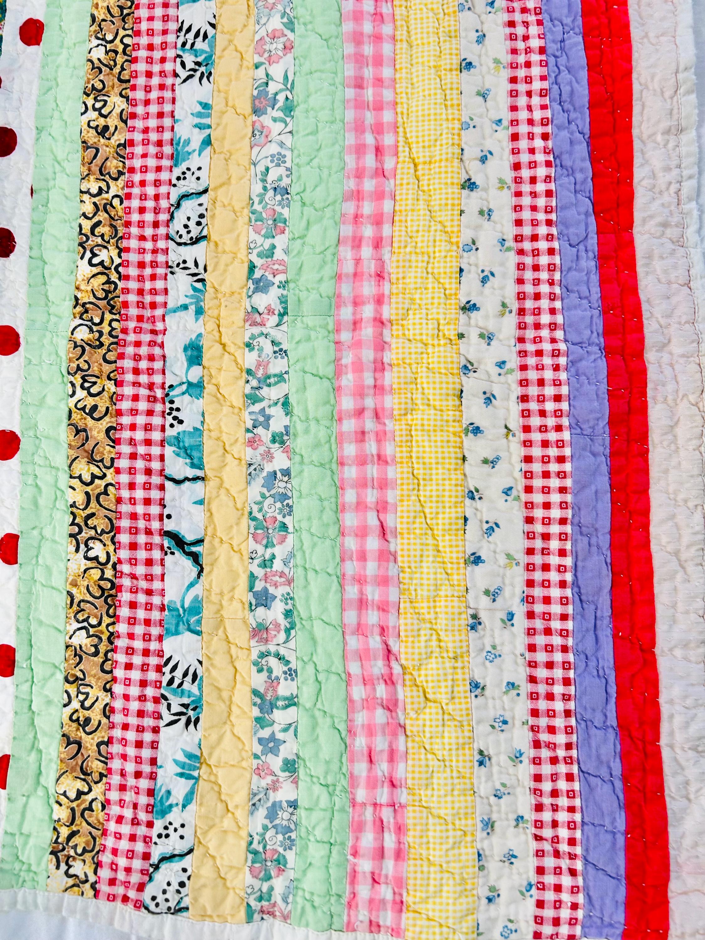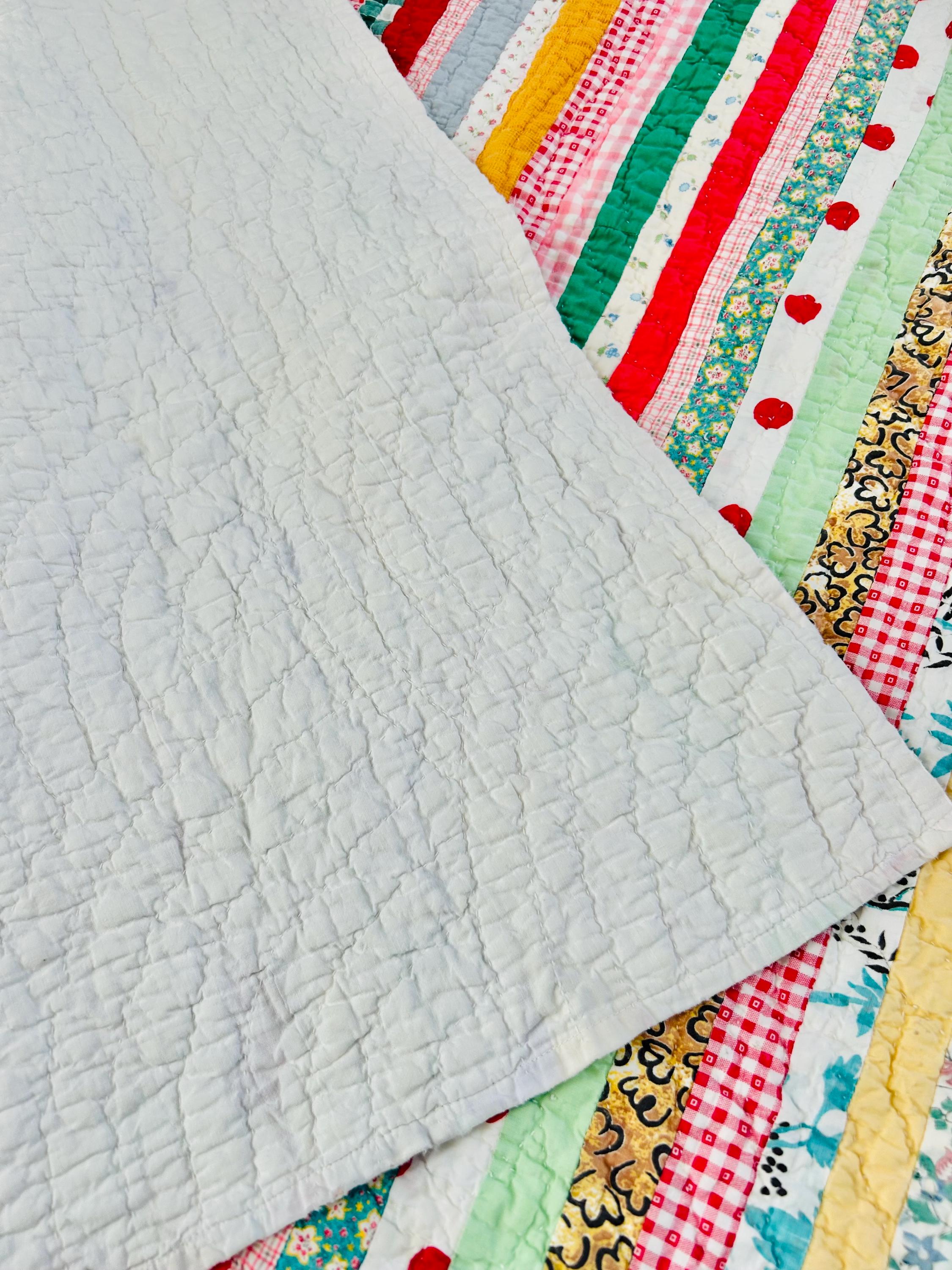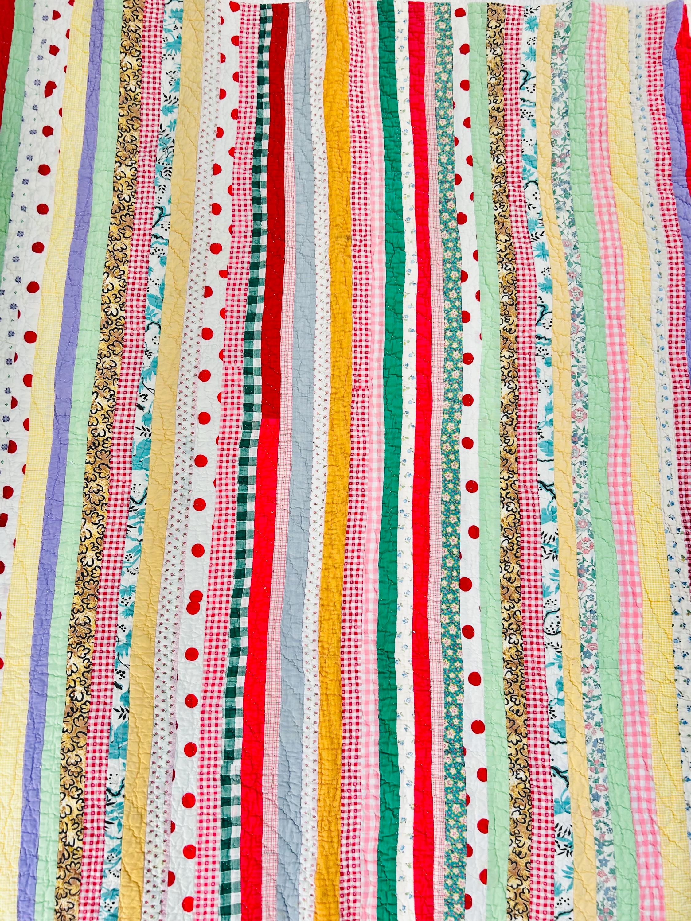 This charming vintage scrap quilt was made during the Depression era, circa 1935–1945, and beautifully reflects the resourcefulness of quiltmakers who used every available fabric scrap. The quilt is constructed from narrow vertical strips of colorful cotton fabrics that include a wonderful mix of ginghams, florals, novelty prints, solids, small floral calicos, red-and-white checks, pastel solids, and playful polka dots. These fabrics were commonly repurposed from feed sacks, household textiles, and clothing and its smaller size suggests it was likely made as a child’s quilt, crib quilt, or utility lap quilt.