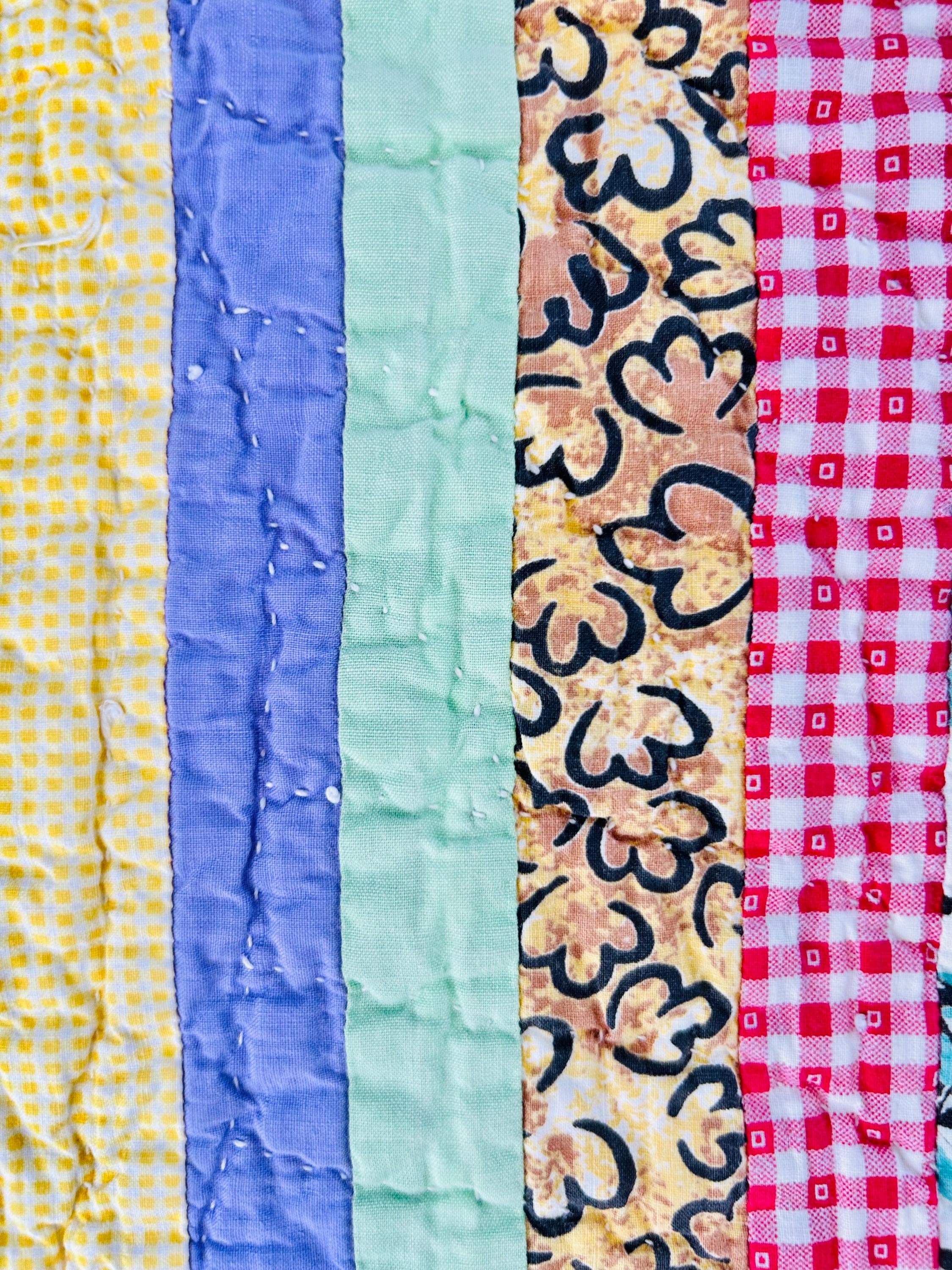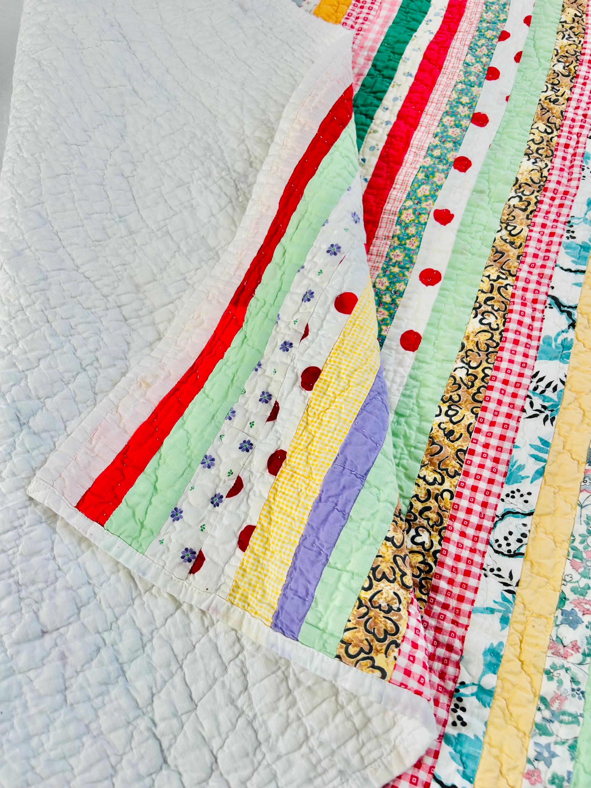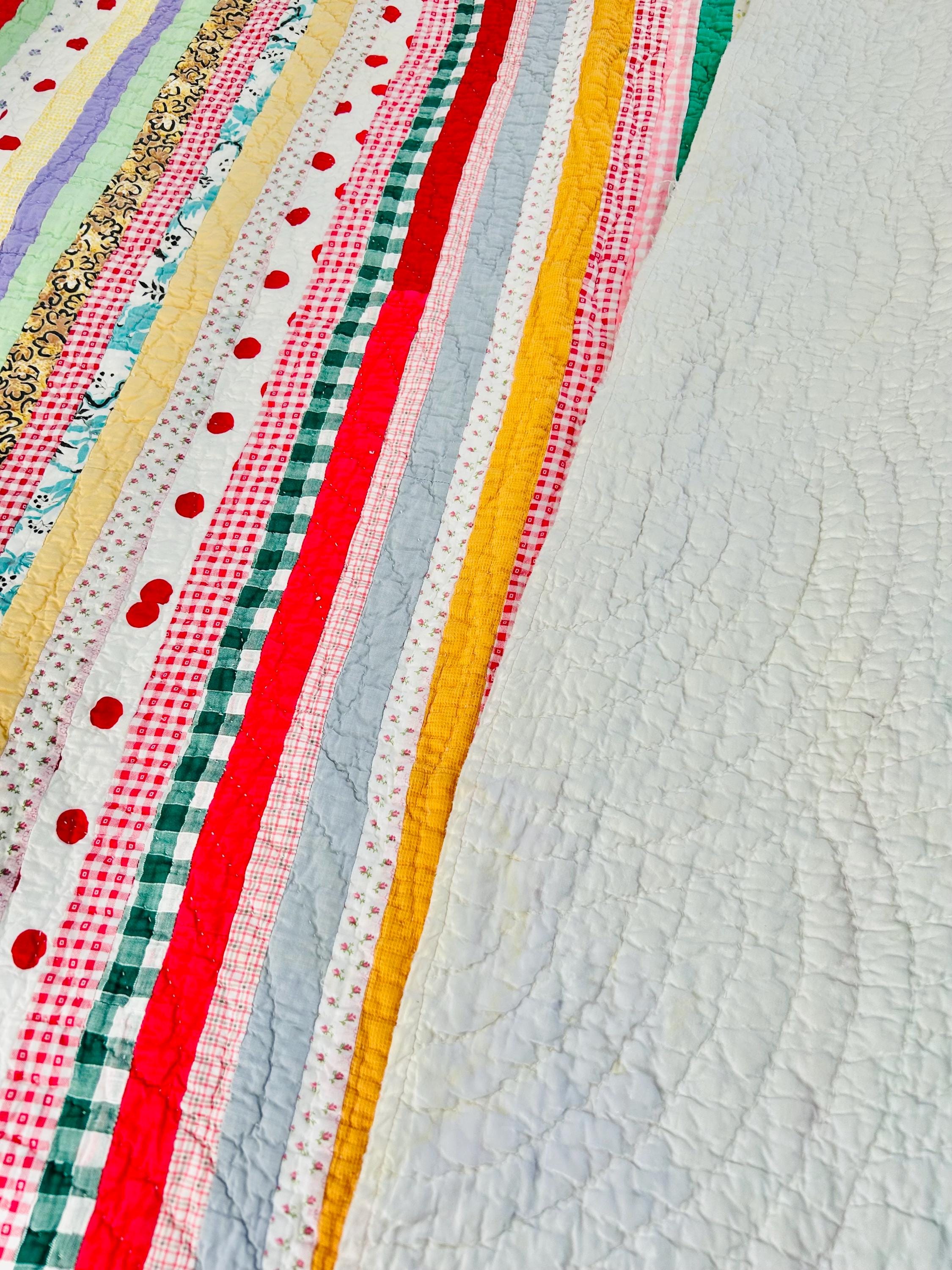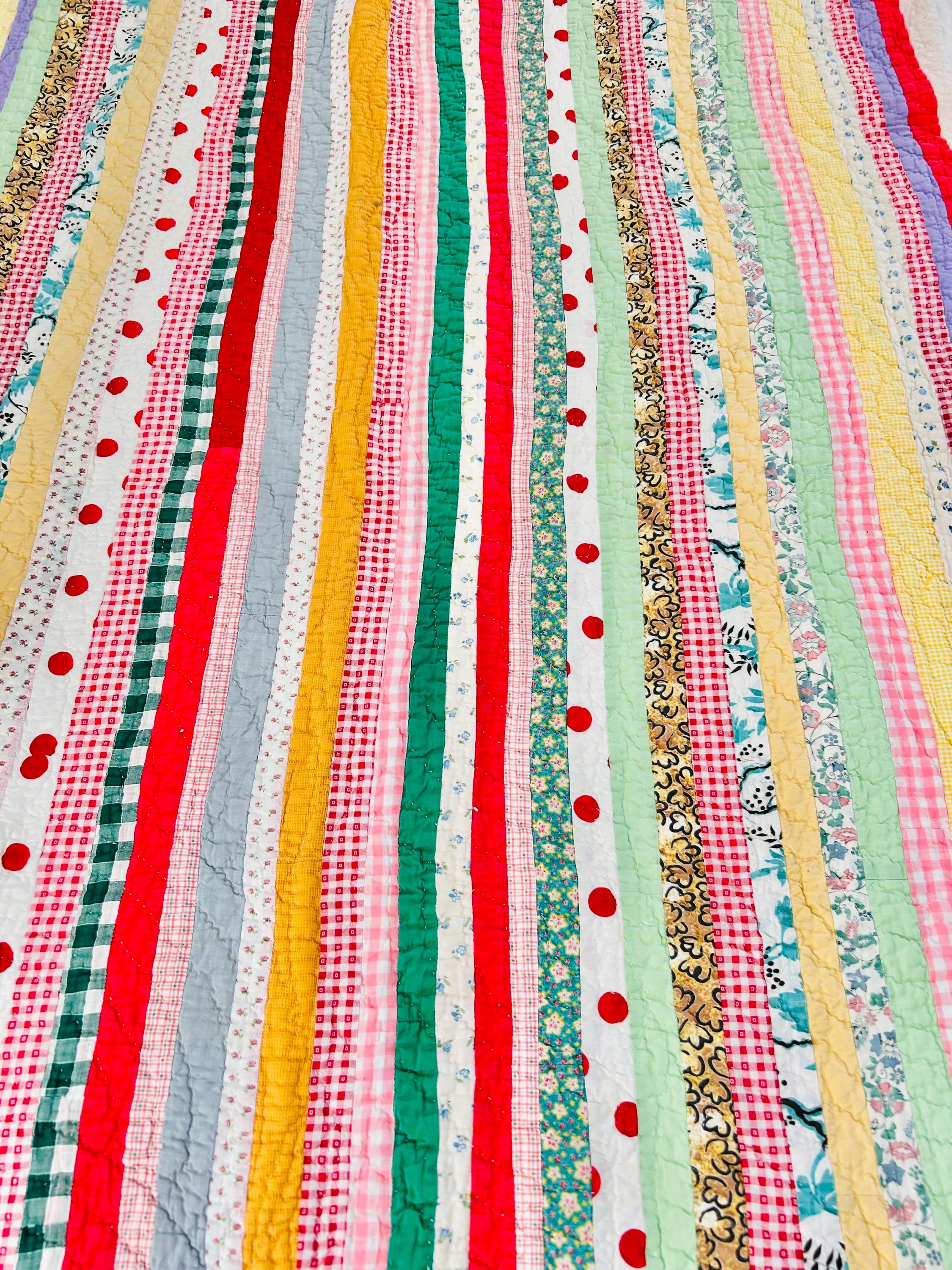 This charming vintage scrap quilt was made during the Depression era, circa 1935–1945, and beautifully reflects the resourcefulness of quiltmakers who used every available fabric scrap. The quilt is constructed from narrow vertical strips of colorful cotton fabrics that include a wonderful mix of ginghams, florals, novelty prints, solids, small floral calicos, red-and-white checks, pastel solids, and playful polka dots. These fabrics were commonly repurposed from feed sacks, household textiles, and clothing and its smaller size suggests it was likely made as a child’s quilt, crib quilt, or utility lap quilt.