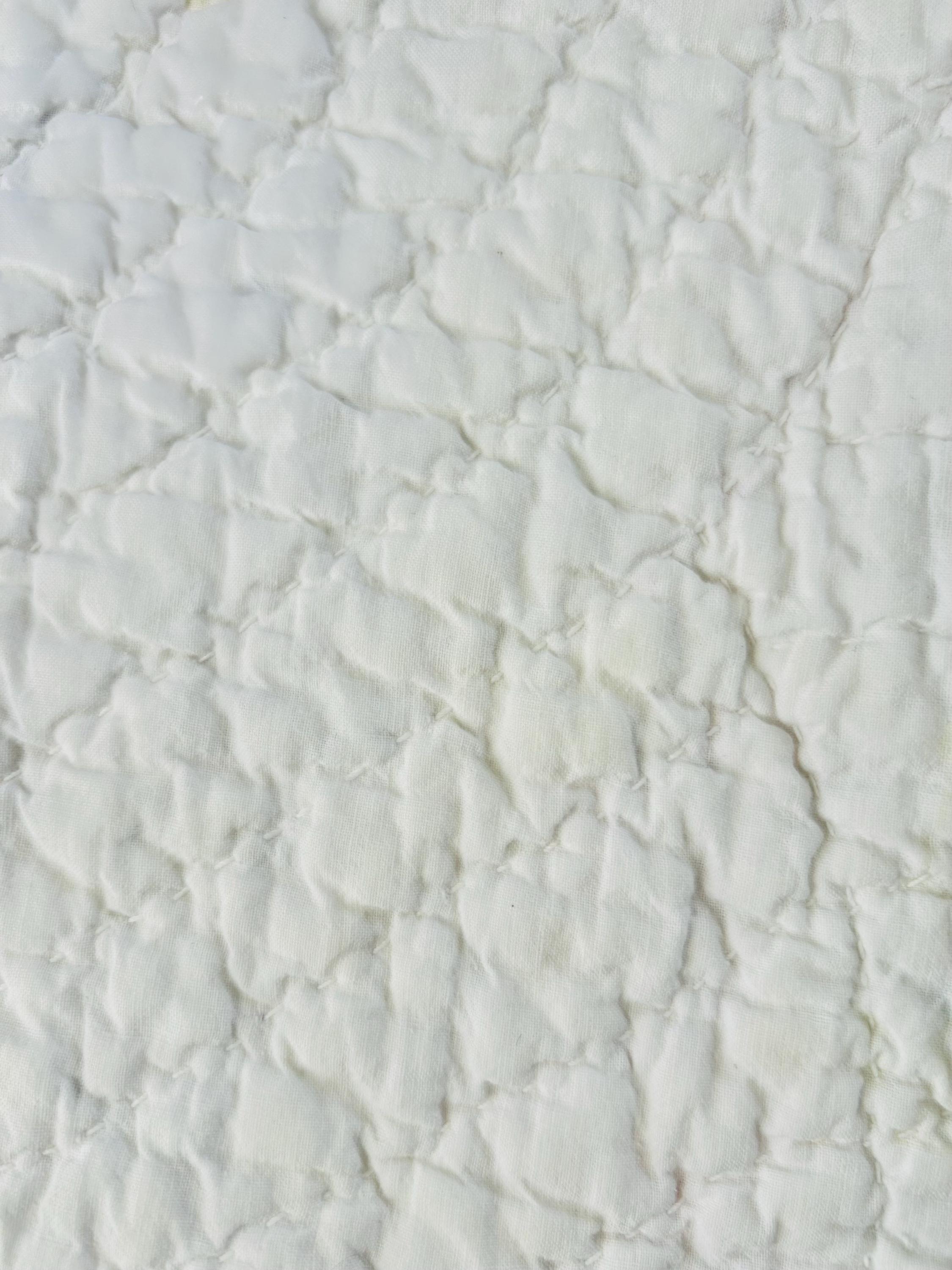 The quilt is entirely hand pieced and hand quilted, with hand quilting in a repeating shell pattern. The back is white cotton as is the binding that has been machine-stitched to the front and hand-stitched to the back. The cotton batting is lightweight.
