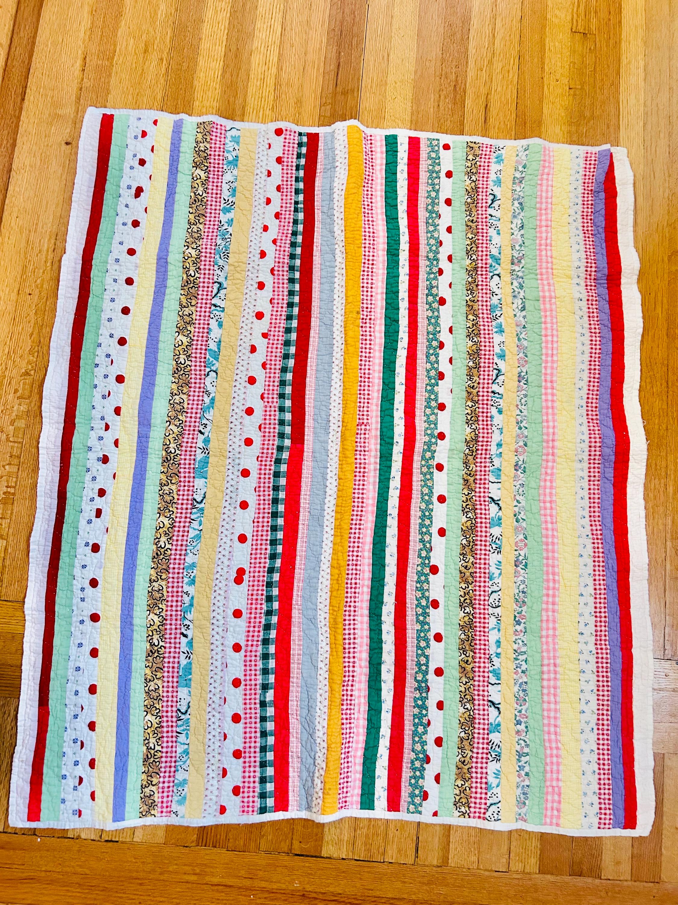 Details • Date: Circa 1935–1945 • Size: 42” x 48” • Pattern: Strip / Scrap Quilt • Materials: Cotton fabrics with cotton batting • Construction: Hand pieced and hand quilted • Colors: Red, green, yellow, pastel blue, pink, lavender, turquoise, and cream • Backing: Solid light fabric with hand quilting visible • Binding: Hand-applied fabric binding