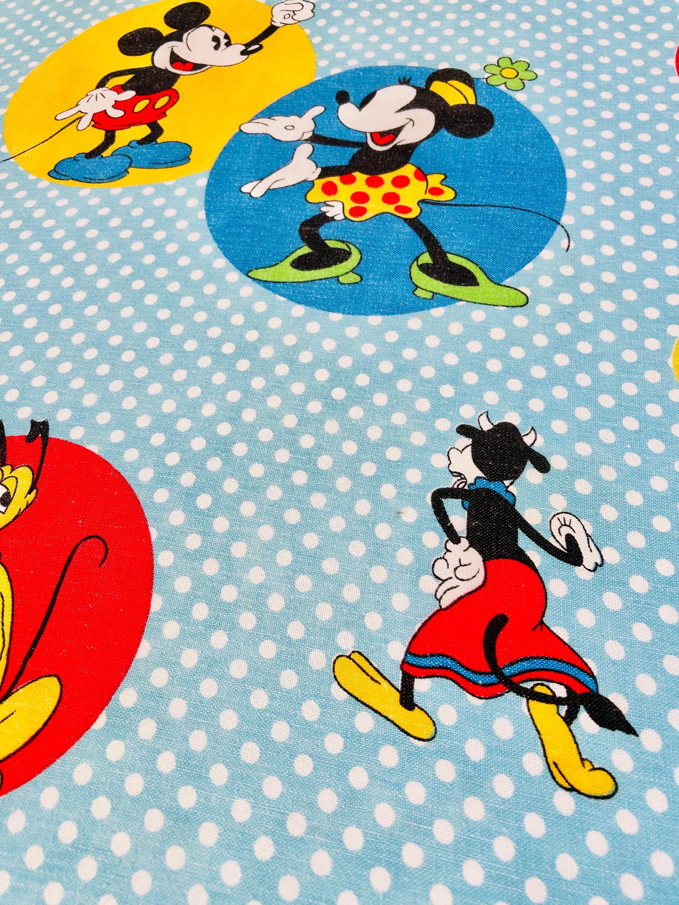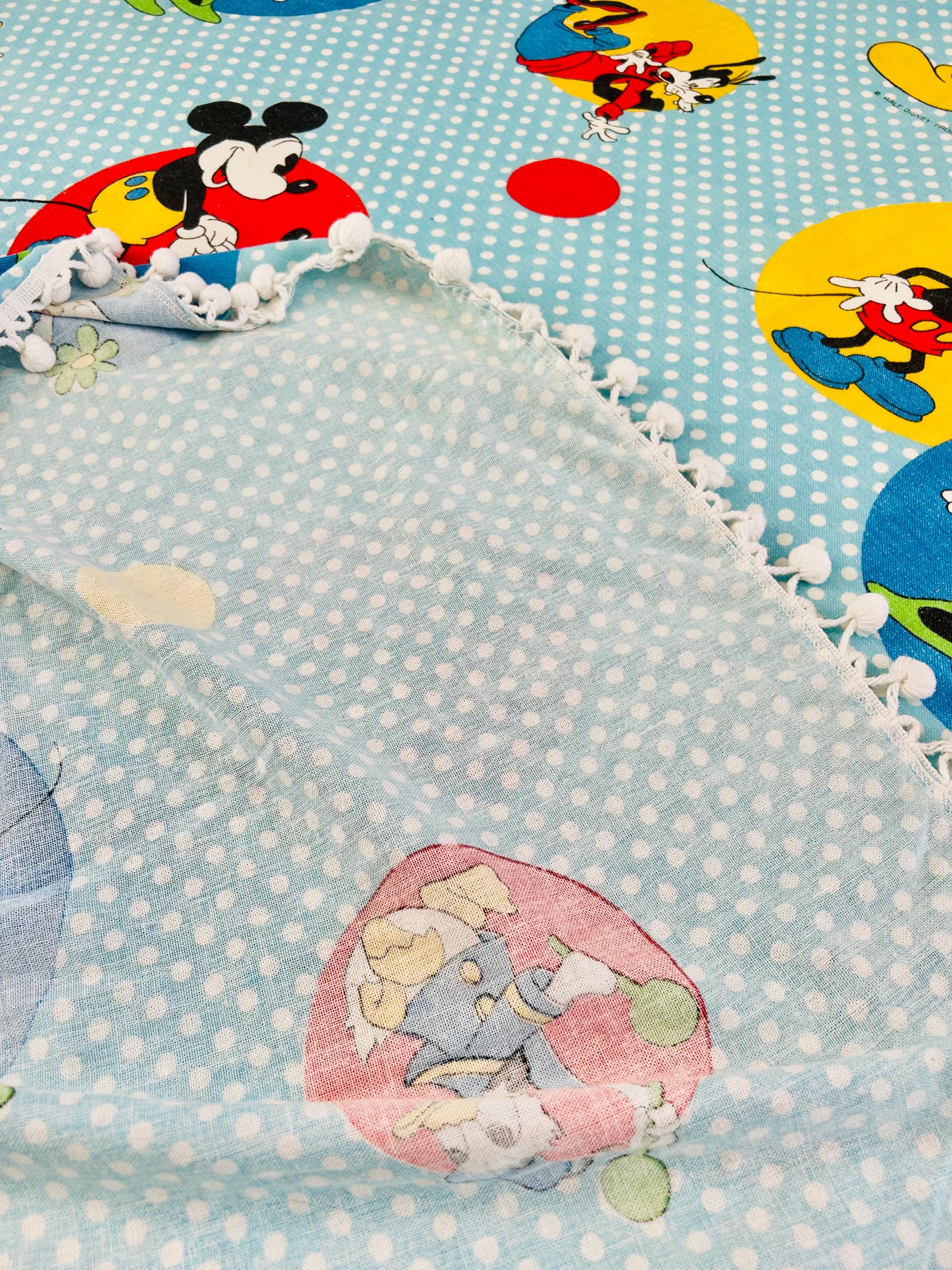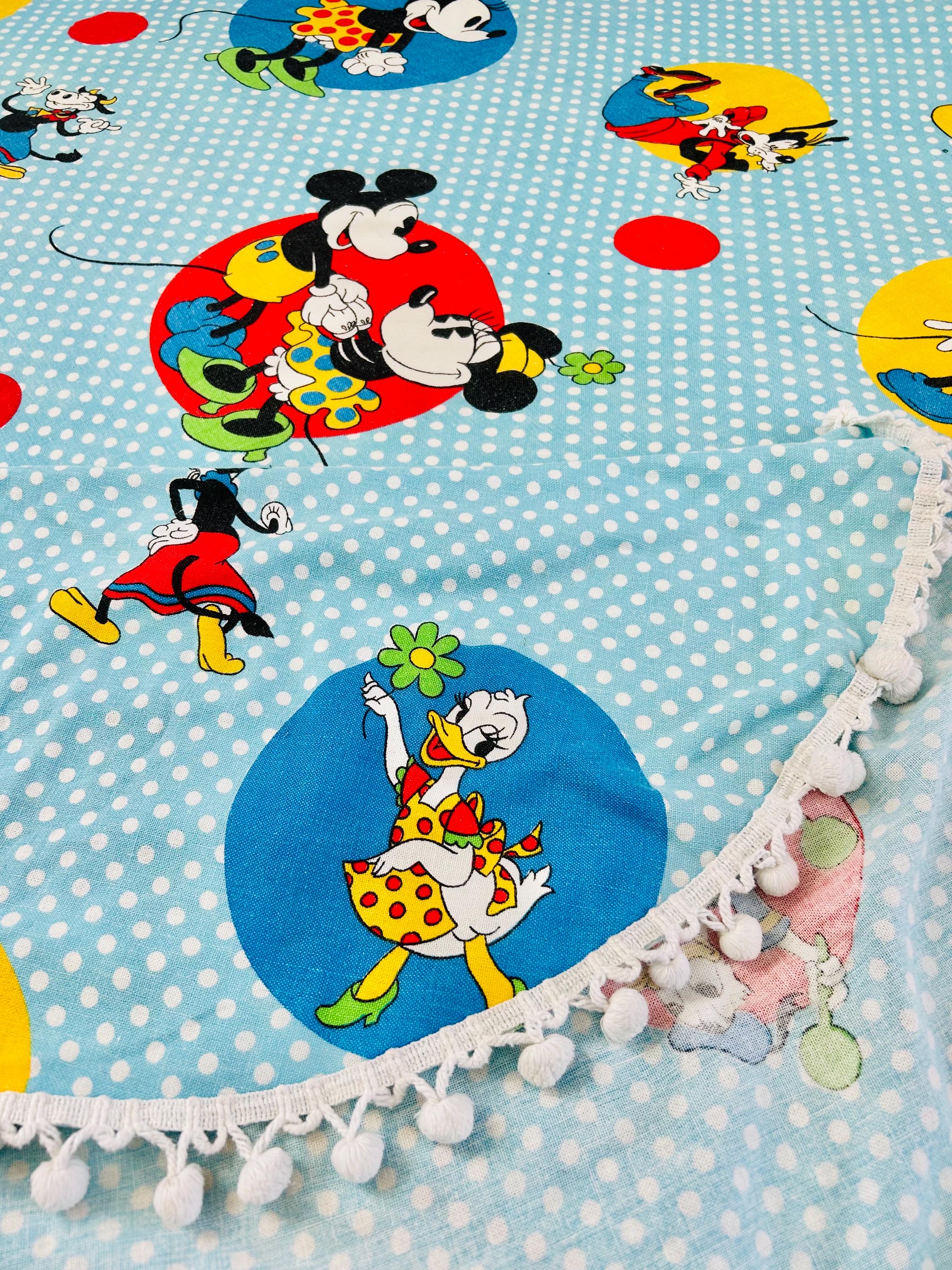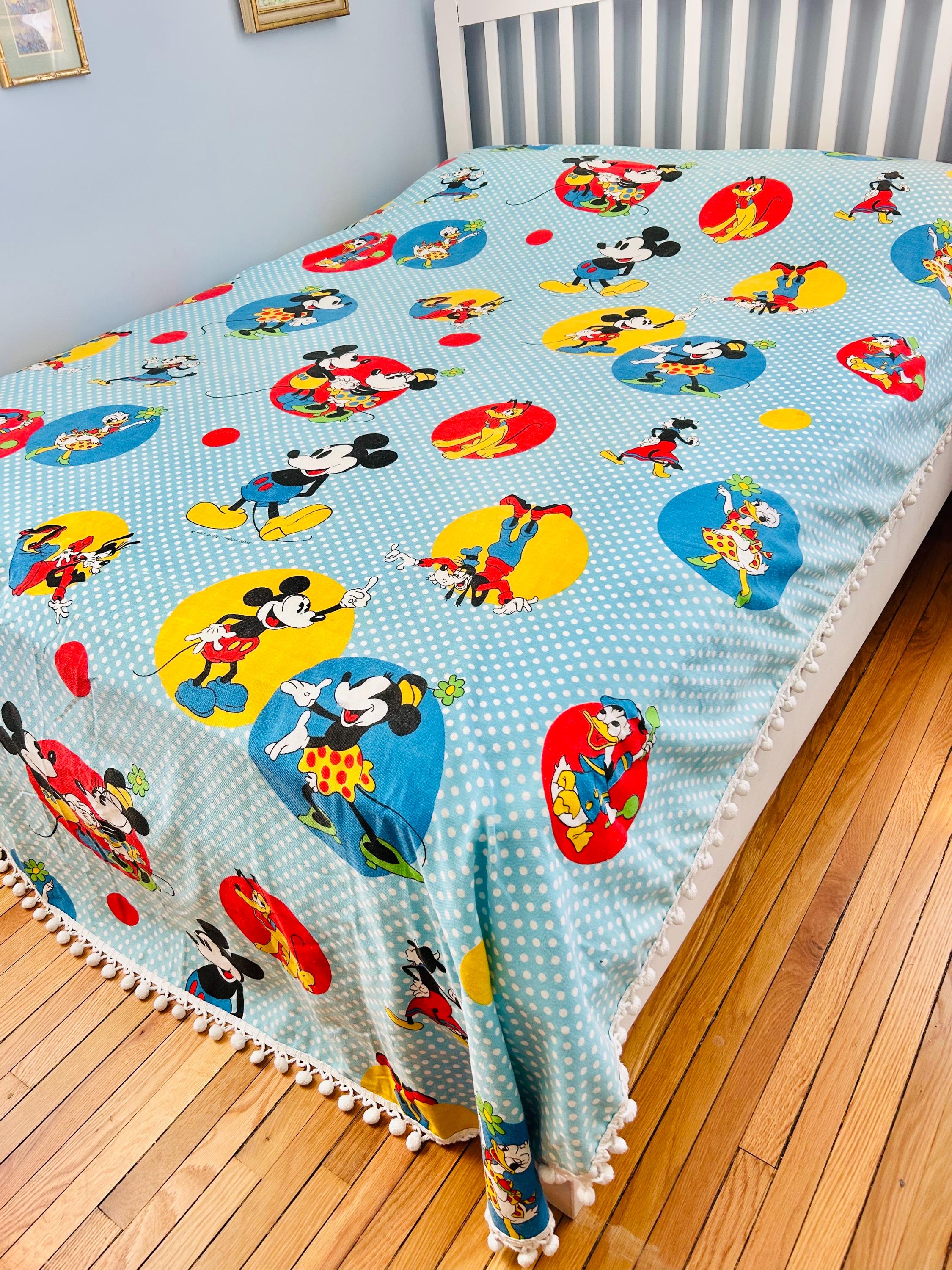 Details • Era: 1970s • Maker: Wamsutta • Licensed: Walt Disney Productions (copyright printed on fabric) • Type: Fashion bedspread / lightweight quilt • Size: 78” x 108” • Labeled size: Twin • Materials: 50% polyester / 50% cotton (exclusive of decoration) • Background: Light blue with white polka dots • Design: Mickey Mouse and friends in colorful circular medallions • Trim: White pom-pom fringe border • Construction: Single-layer fashion spread