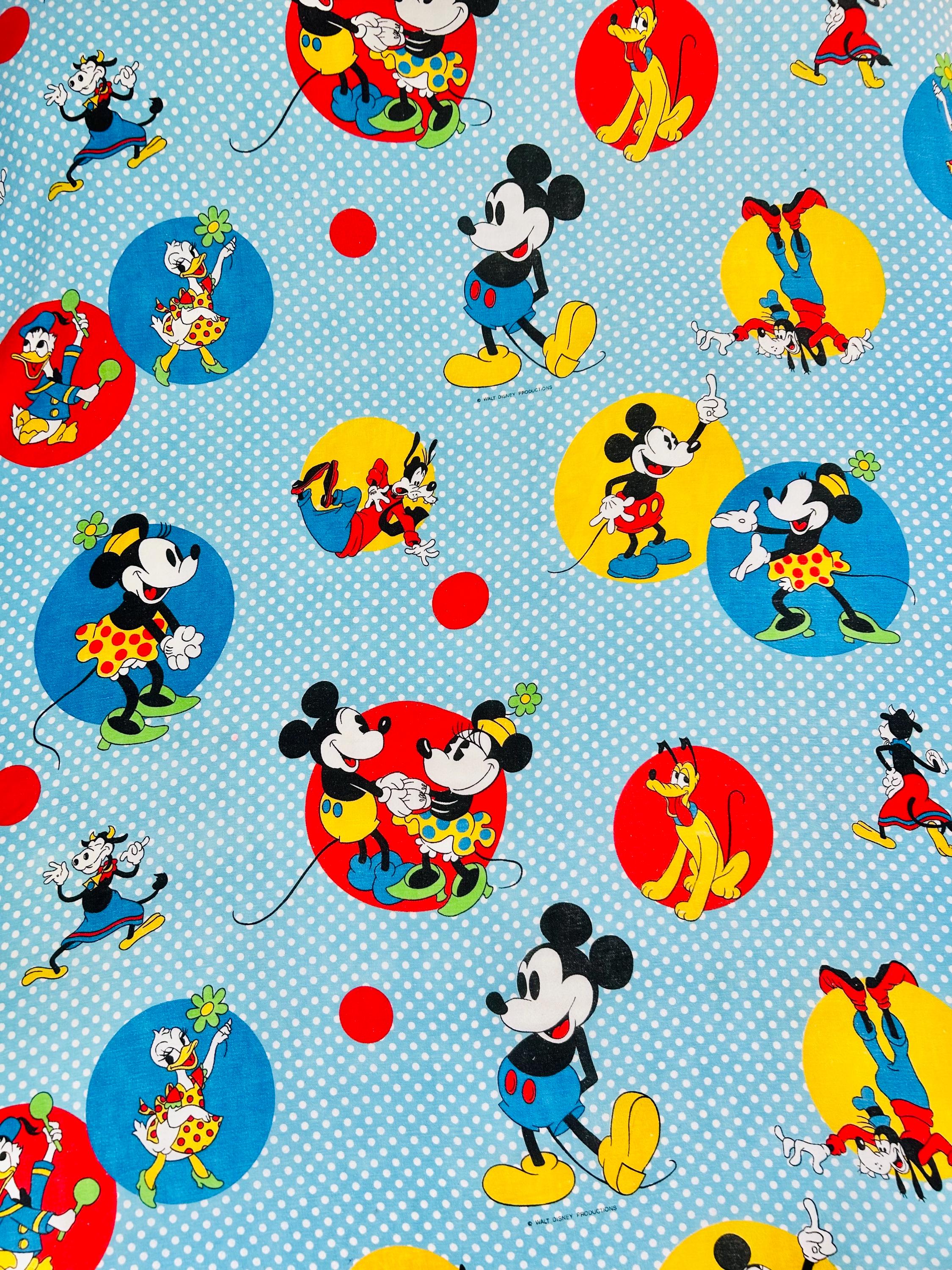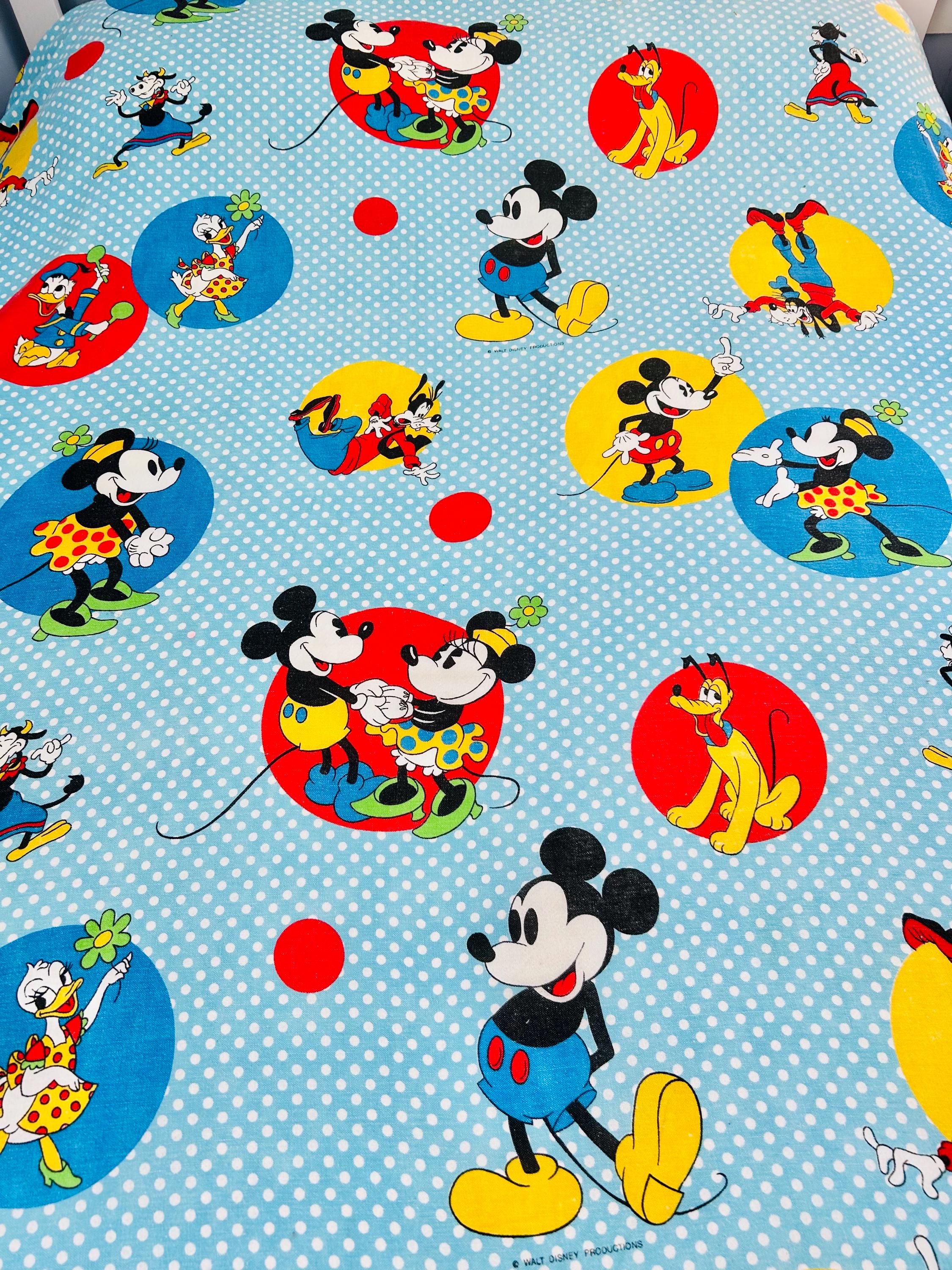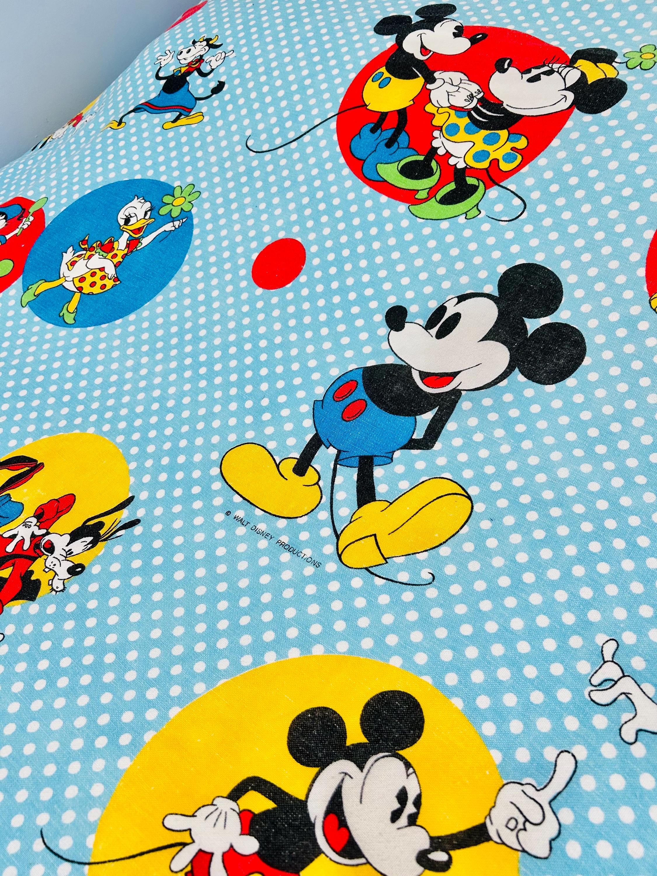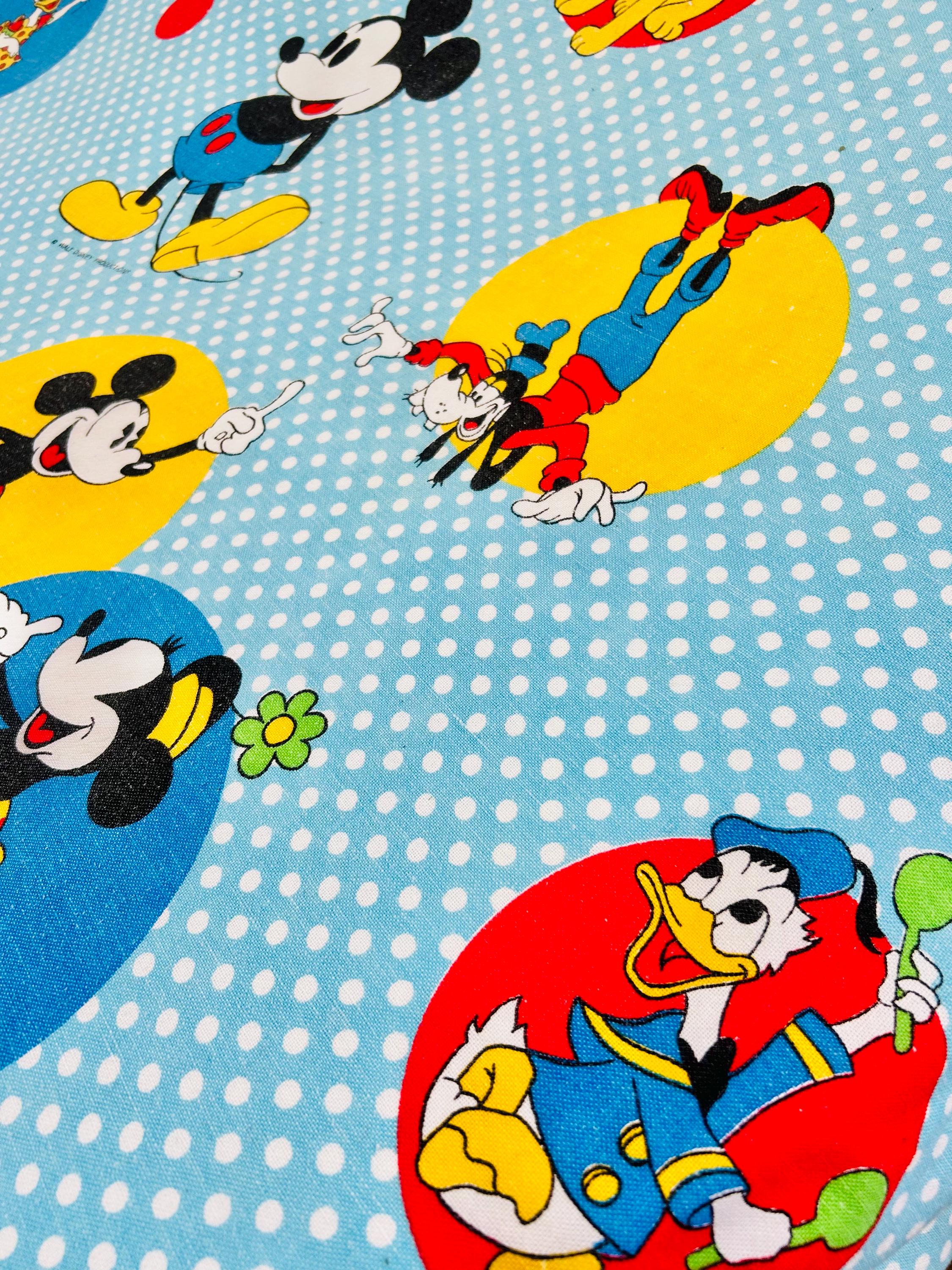 Details • Era: 1970s • Maker: Wamsutta • Licensed: Walt Disney Productions (copyright printed on fabric) • Type: Fashion bedspread / lightweight quilt • Size: 78” x 108” • Labeled size: Twin • Materials: 50% polyester / 50% cotton (exclusive of decoration) • Background: Light blue with white polka dots • Design: Mickey Mouse and friends in colorful circular medallions • Trim: White pom-pom fringe border • Construction: Single-layer fashion spread