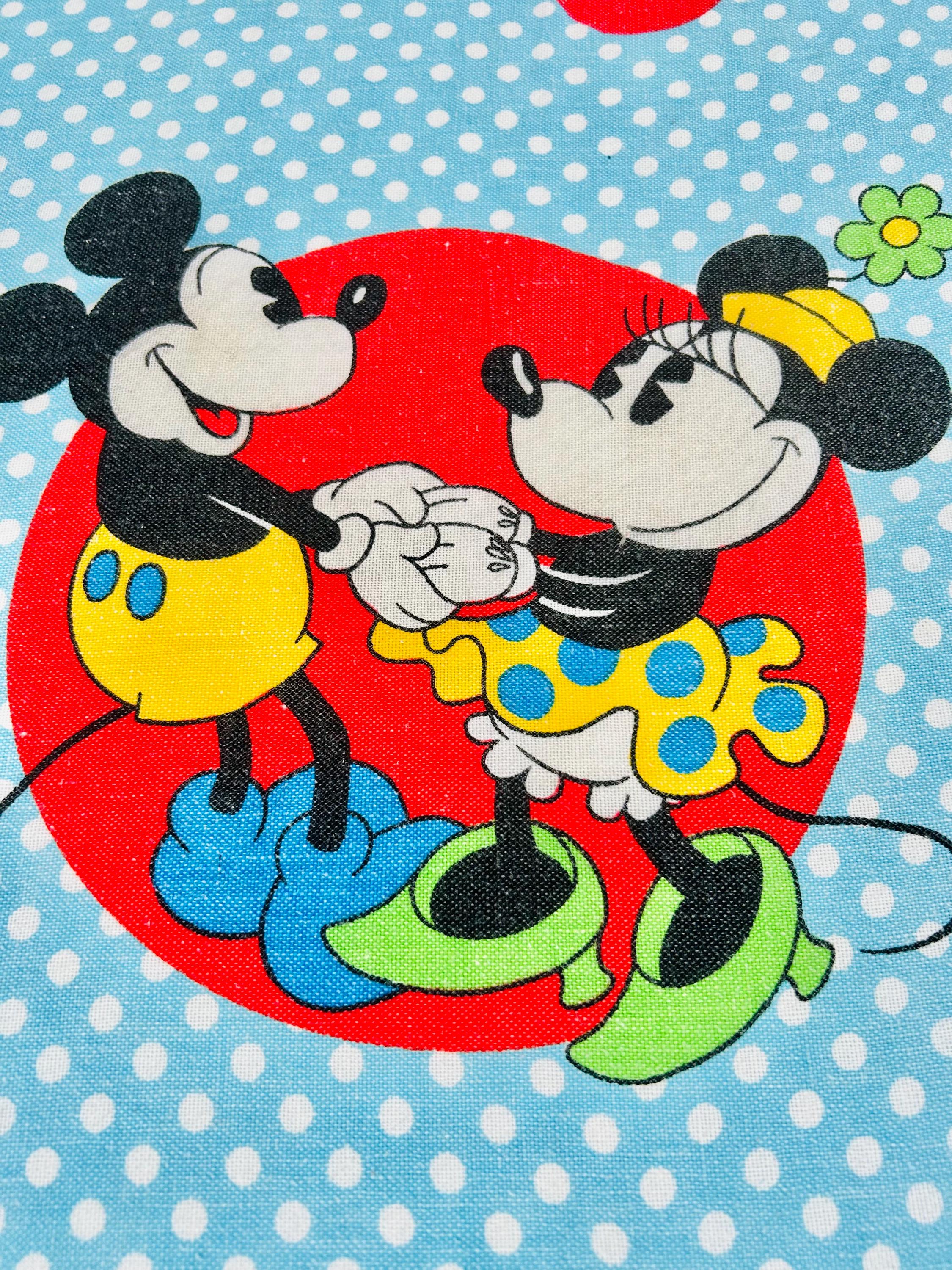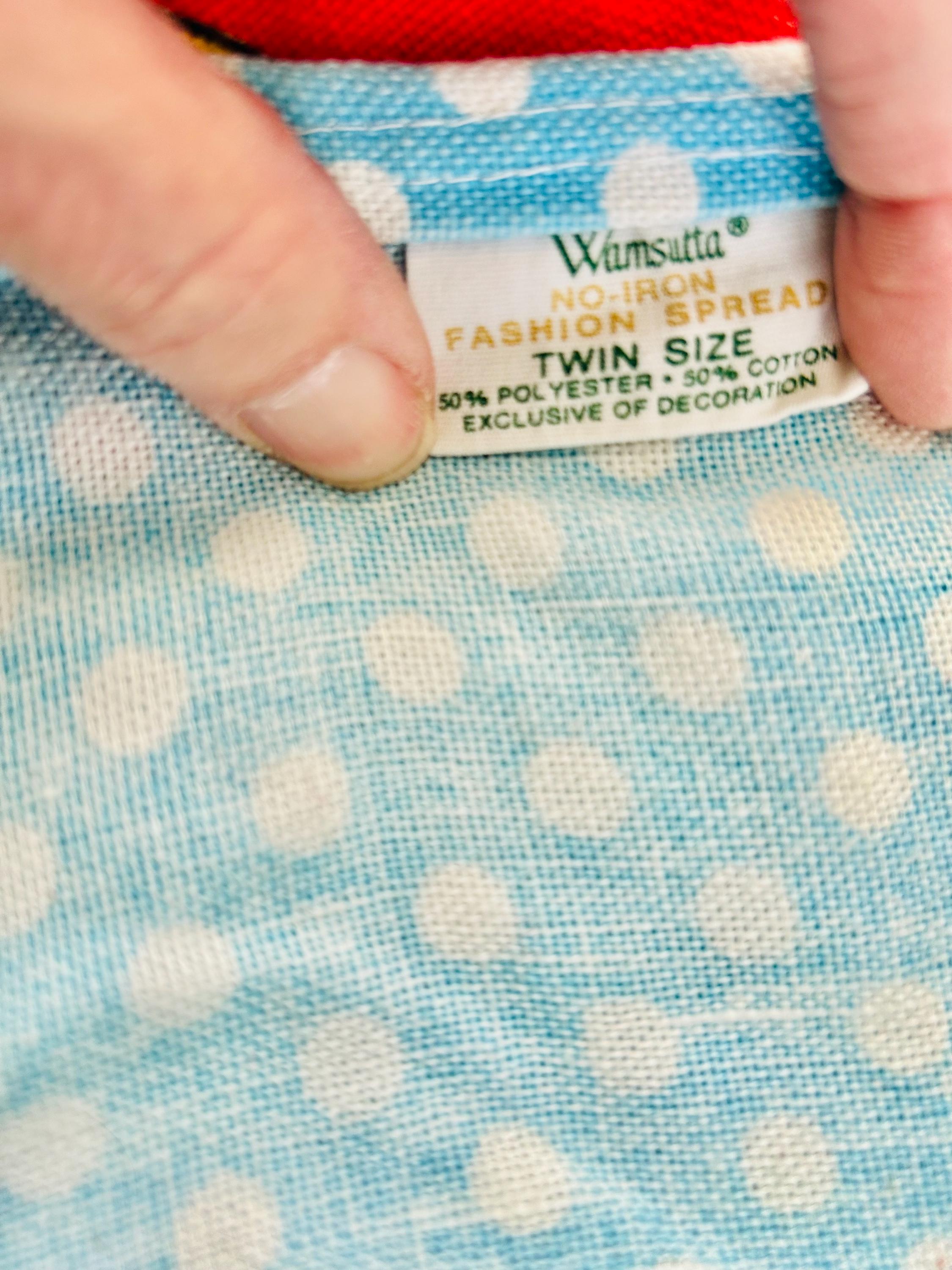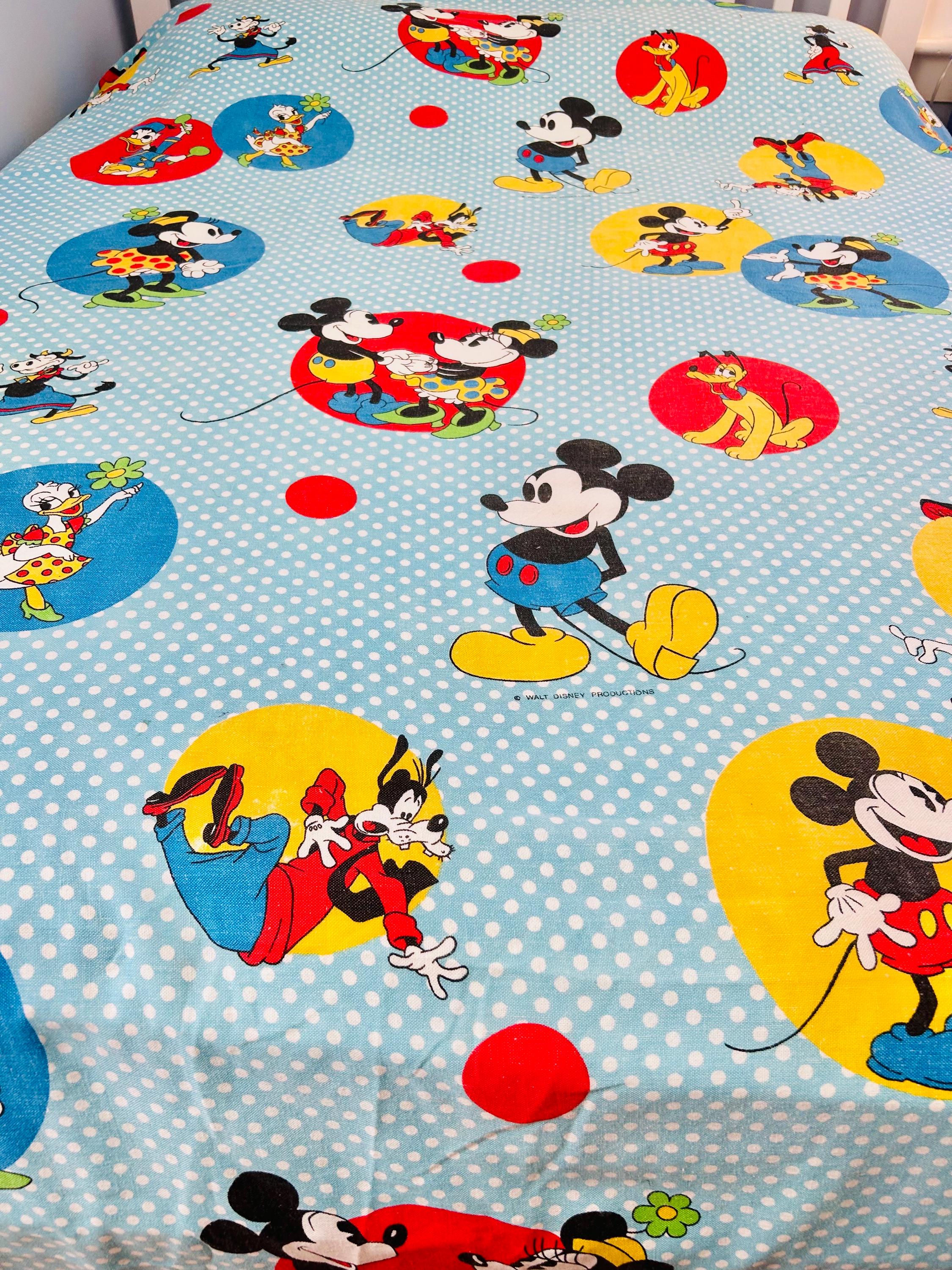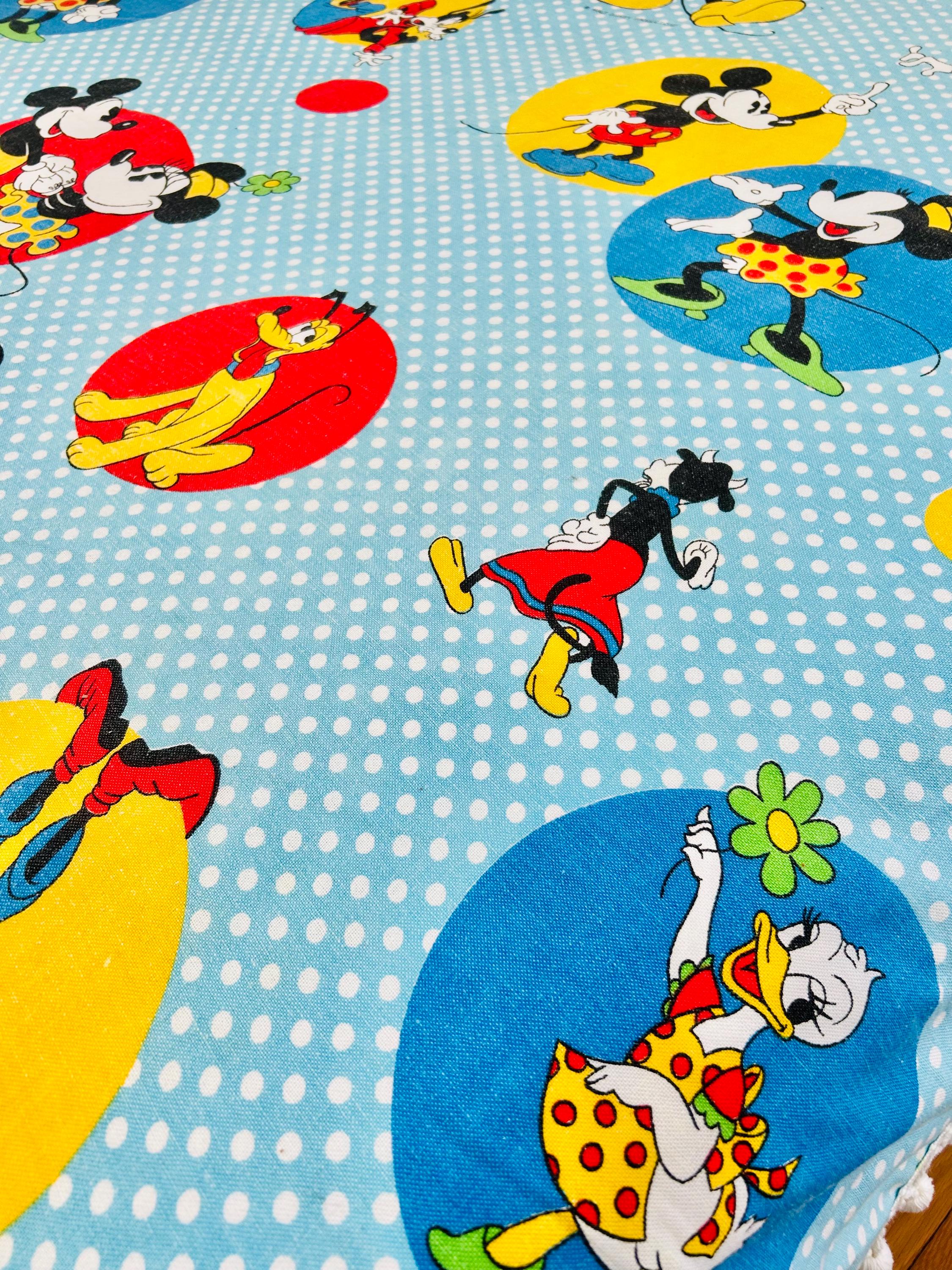 Details • Era: 1970s • Maker: Wamsutta • Licensed: Walt Disney Productions (copyright printed on fabric) • Type: Fashion bedspread / lightweight quilt • Size: 78” x 108” • Labeled size: Twin • Materials: 50% polyester / 50% cotton (exclusive of decoration) • Background: Light blue with white polka dots • Design: Mickey Mouse and friends in colorful circular medallions • Trim: White pom-pom fringe border • Construction: Single-layer fashion spread