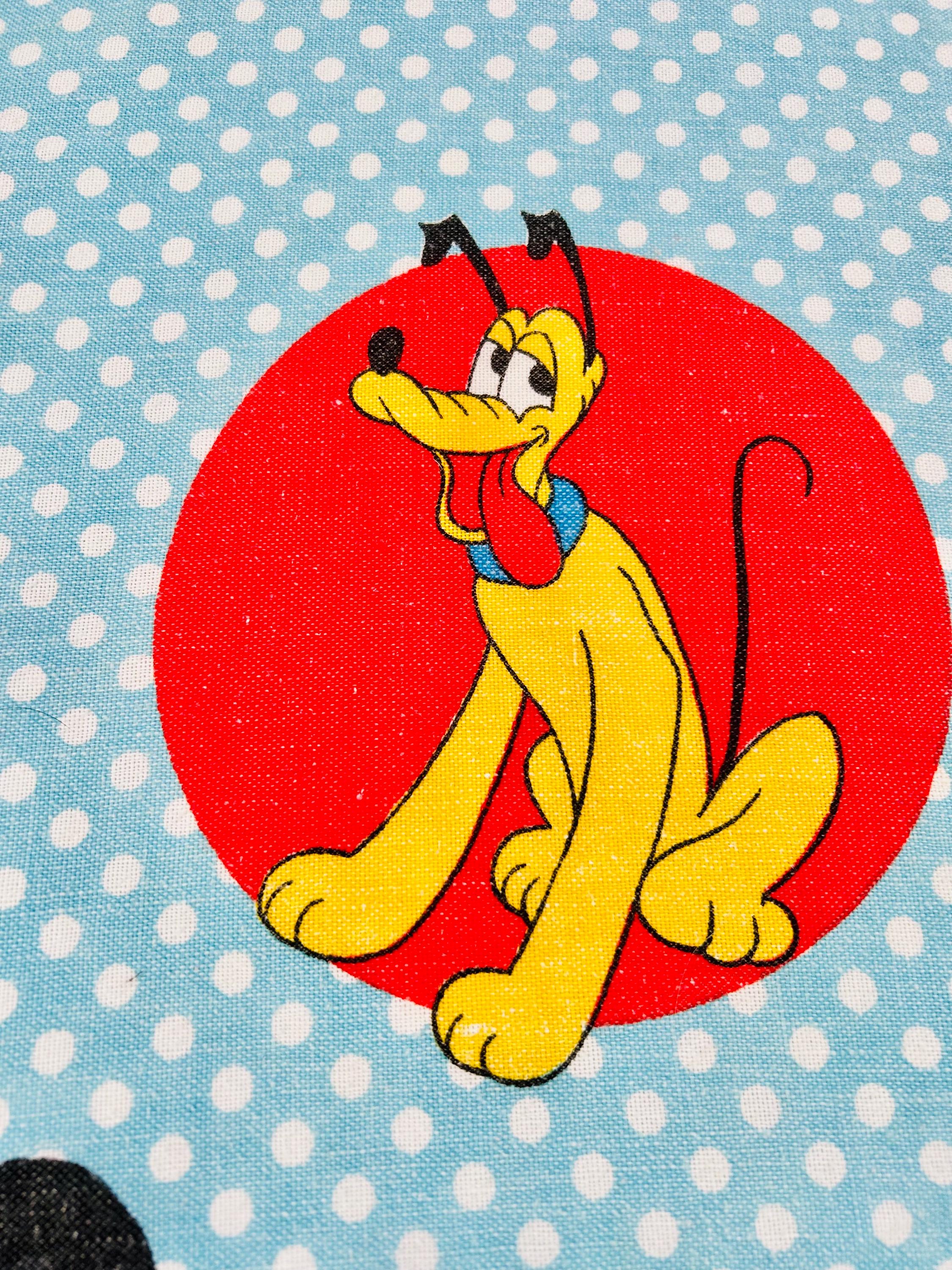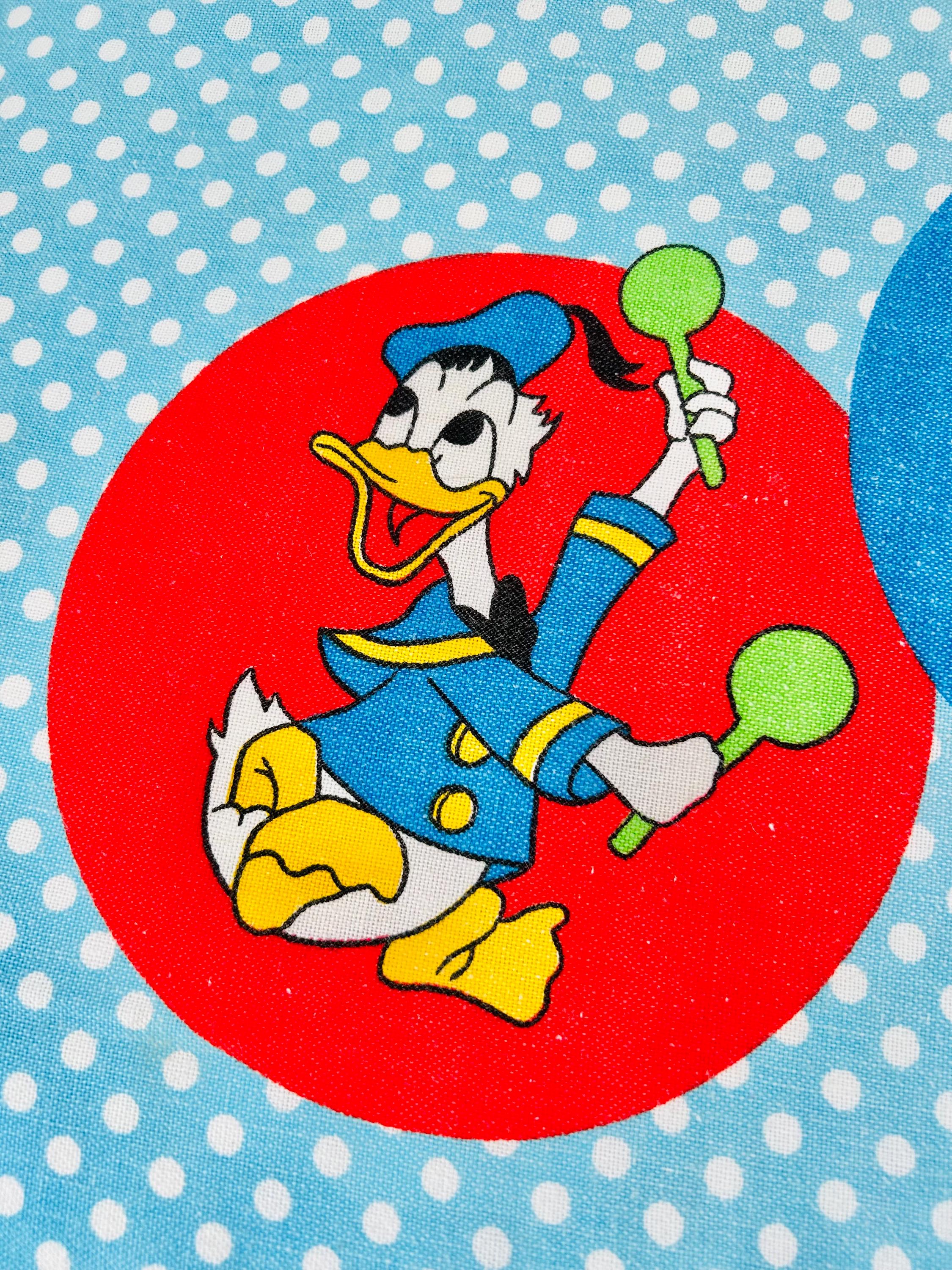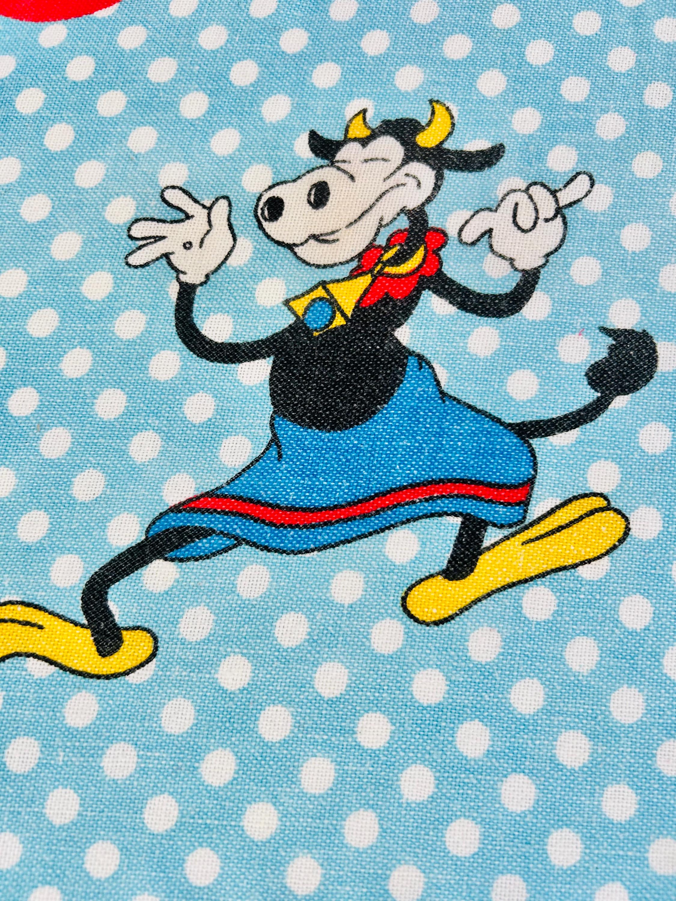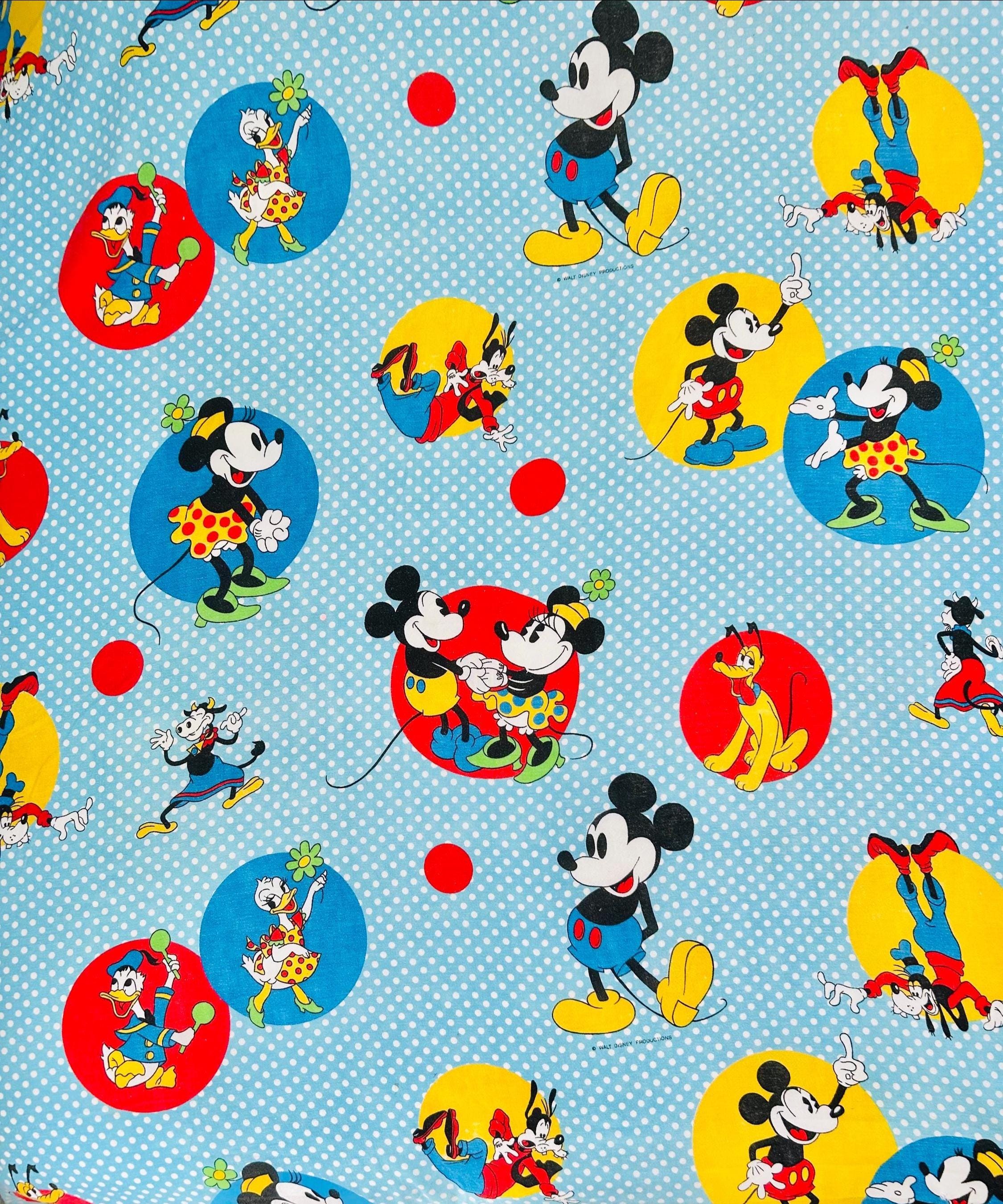 Details • Era: 1970s • Maker: Wamsutta • Licensed: Walt Disney Productions (copyright printed on fabric) • Type: Fashion bedspread / lightweight quilt • Size: 78” x 108” • Labeled size: Twin • Materials: 50% polyester / 50% cotton (exclusive of decoration) • Background: Light blue with white polka dots • Design: Mickey Mouse and friends in colorful circular medallions • Trim: White pom-pom fringe border • Construction: Single-layer fashion spread