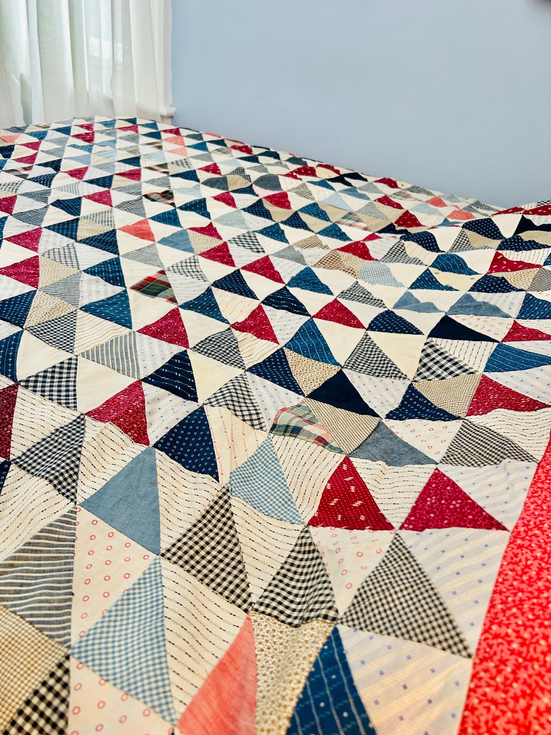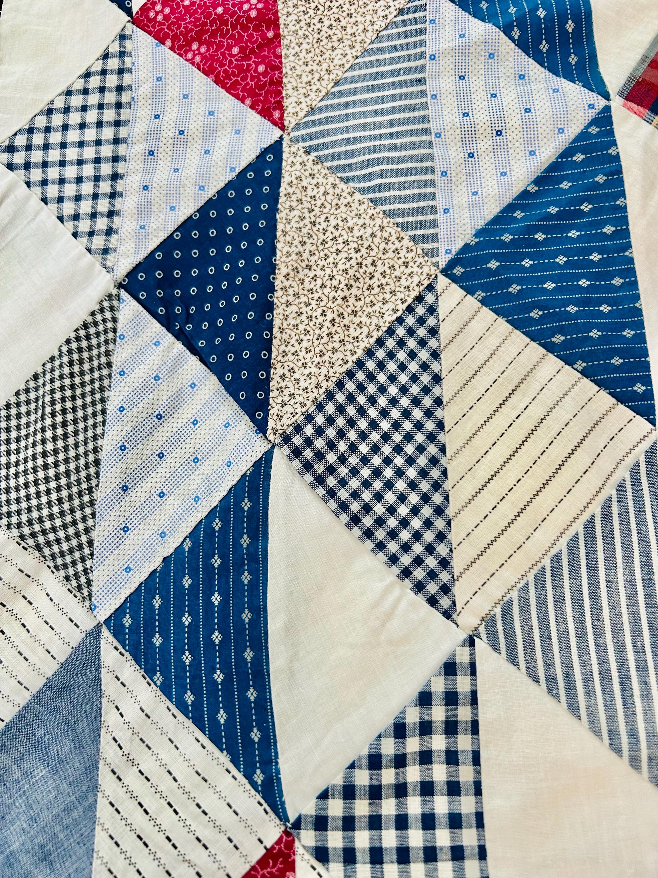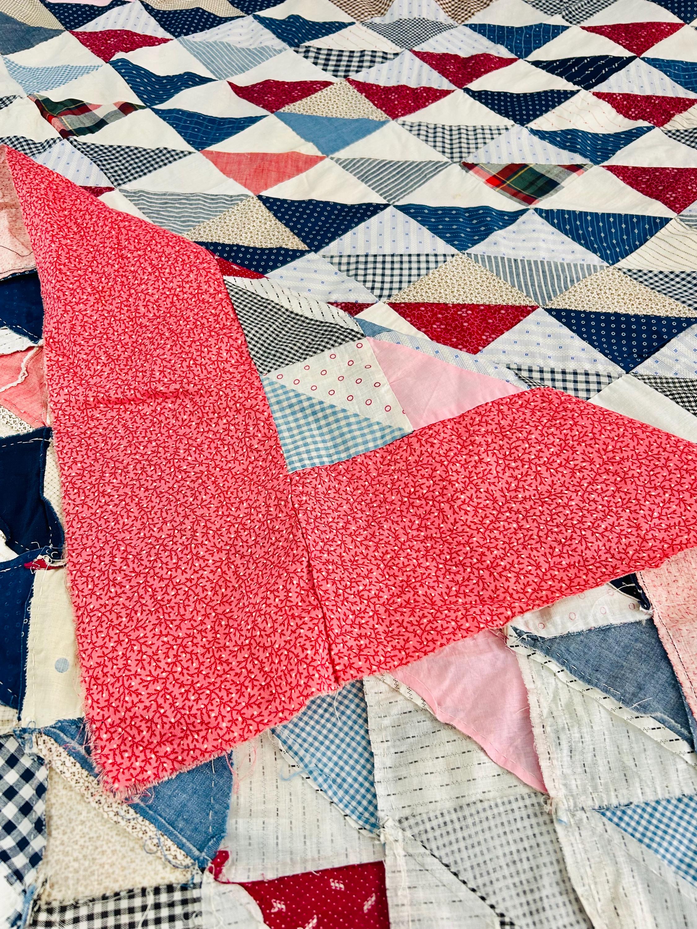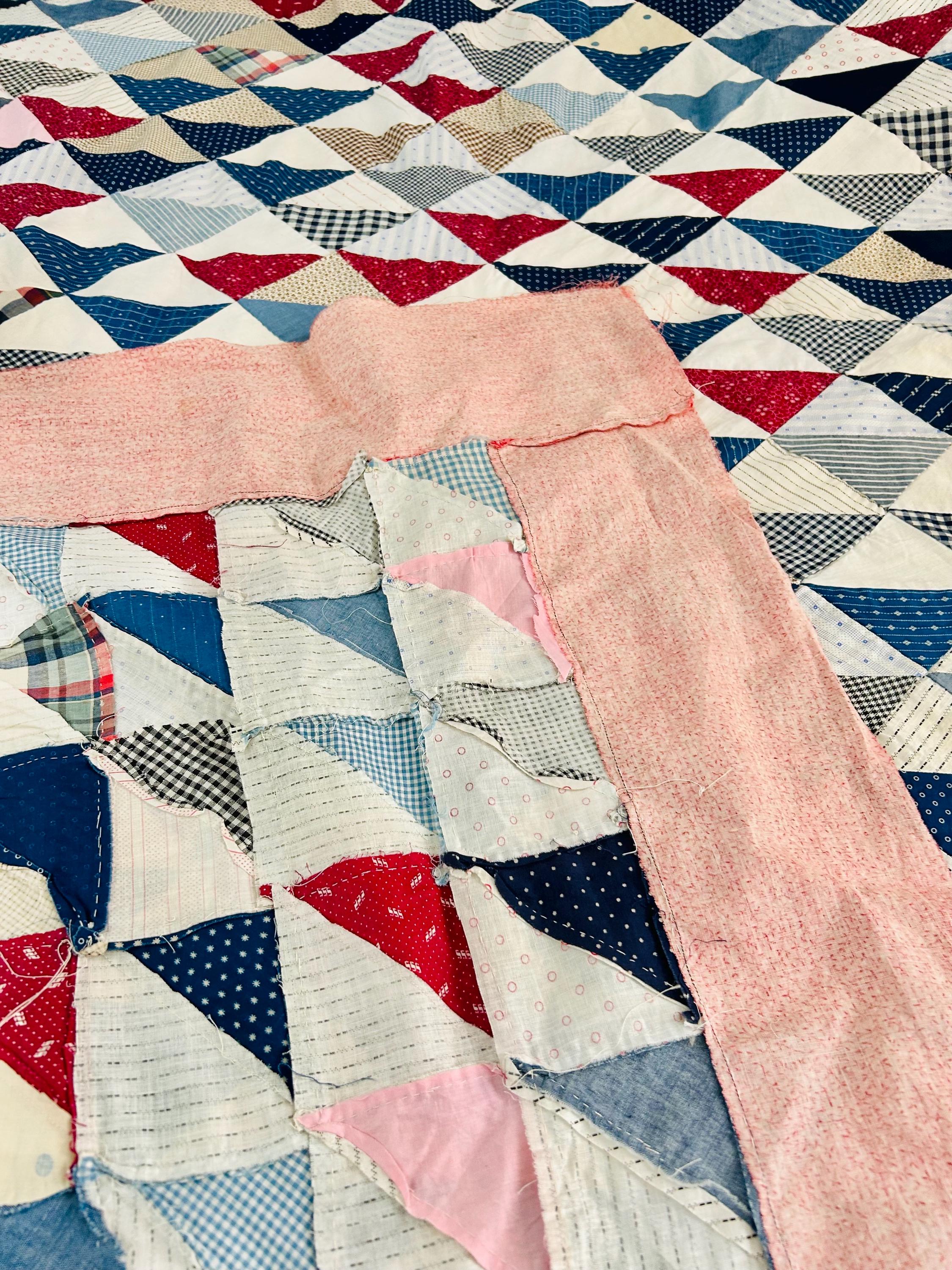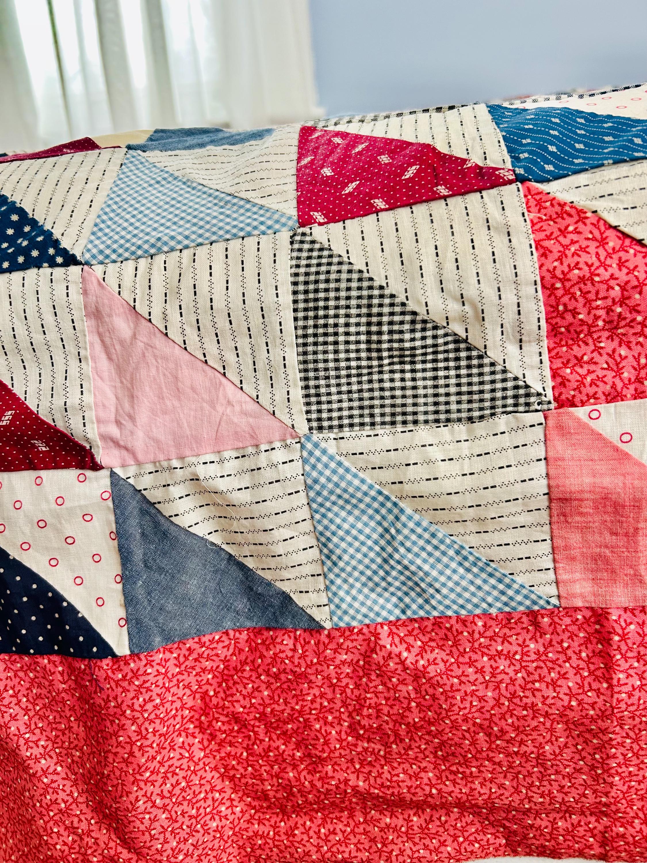 This "Thousand Pyramids" (or Thousand Triangles) piece is a scrappy assembly of fabrics that would have been found in a typical household during the late 1800s, including: • Indigo Discharge Prints: Numerous navy blue triangles with classic white geometric "sprig," star, and dot motifs. • Turkey Reds: Bright, saturated reds that remain remarkably vivid, a staple of the 1880s palette. • Double-Pink/Claret Border: The wide pink border features a delicate "seaweed" or "shrub" motif on a lighter pink ground, typical of the late Victorian era. • Period Shirtings & Mourning Prints: A variety of black-and-white checks, delicate blue-on-white stripes, and "conversational" geometric prints.