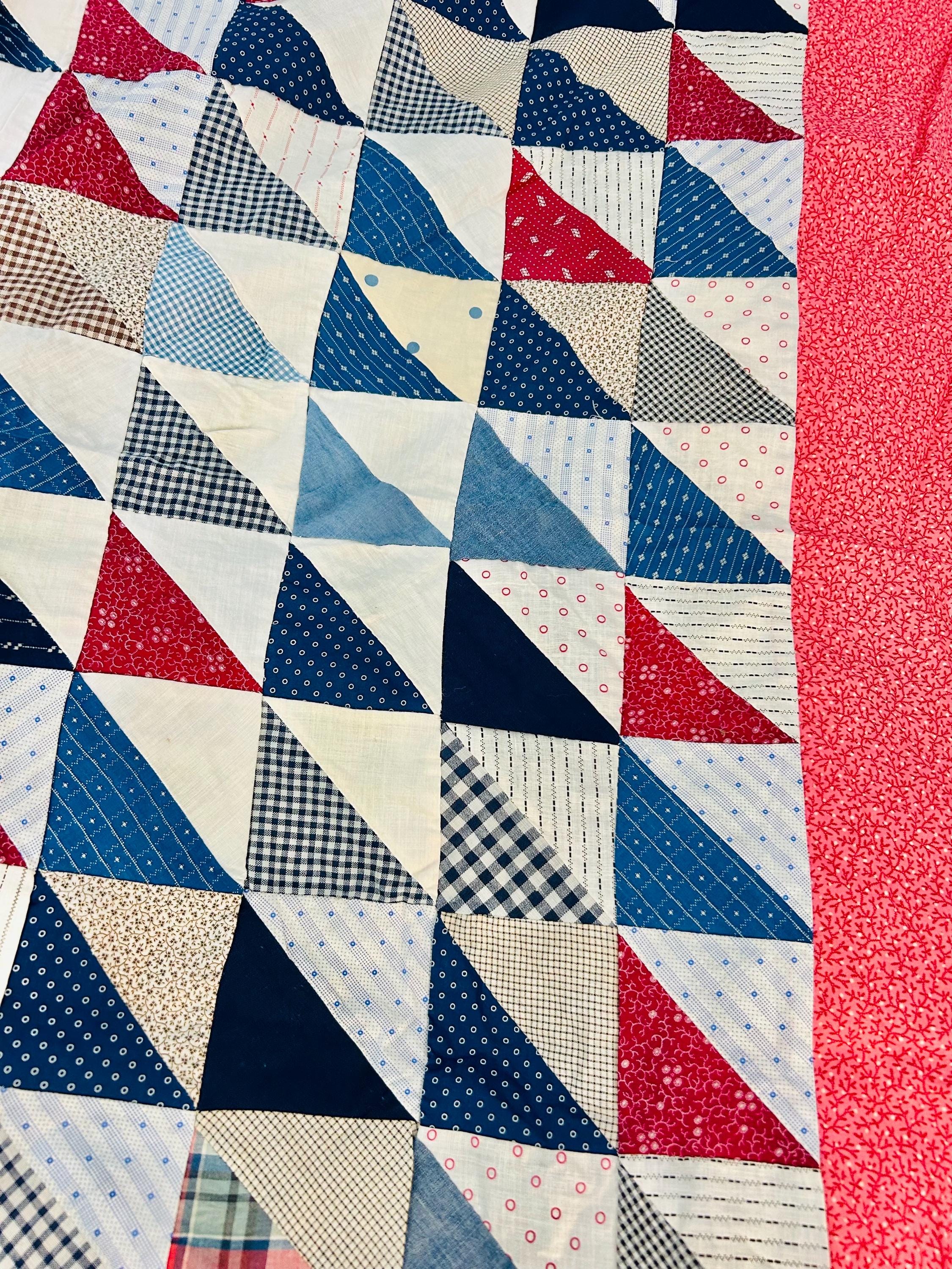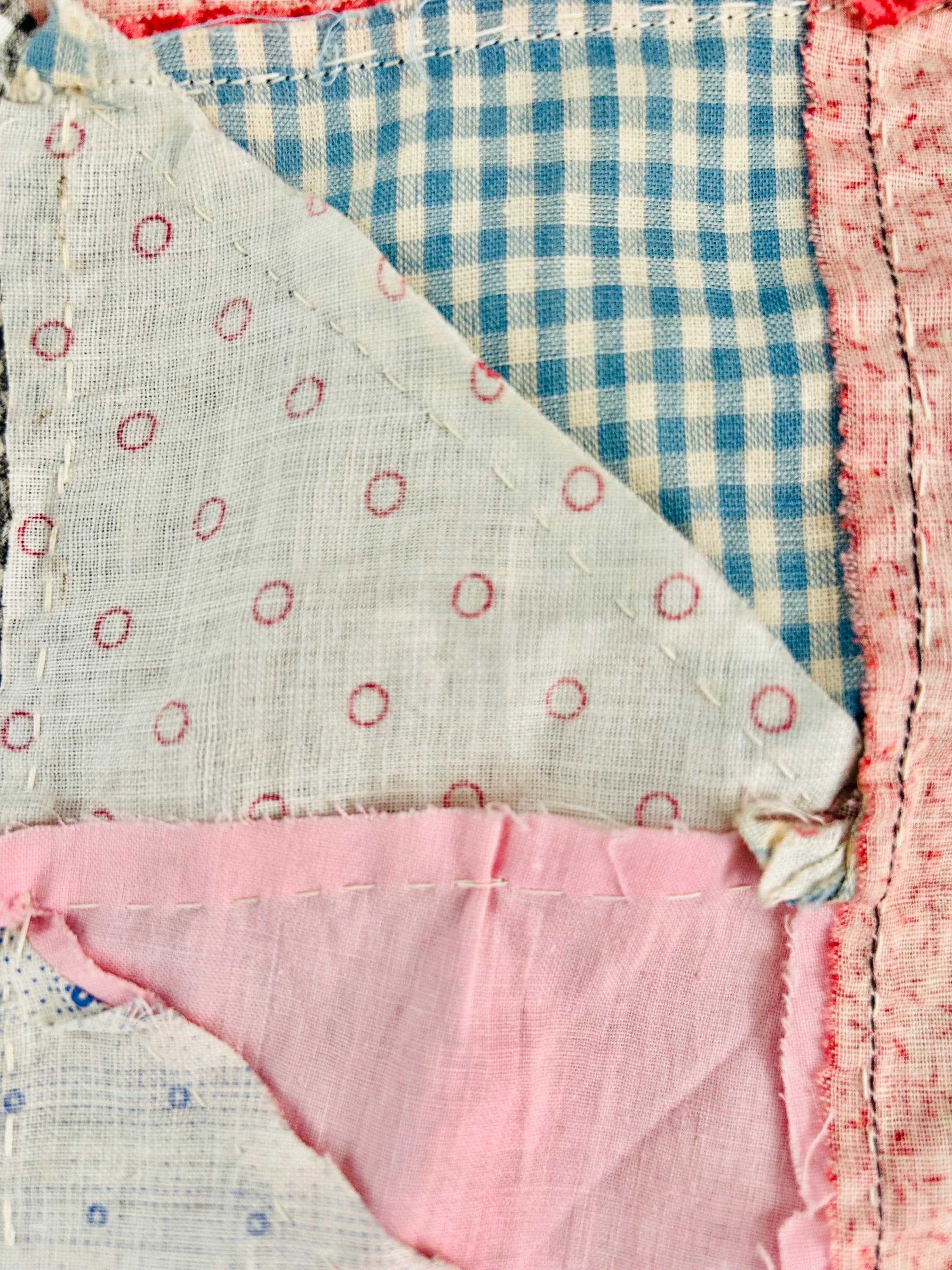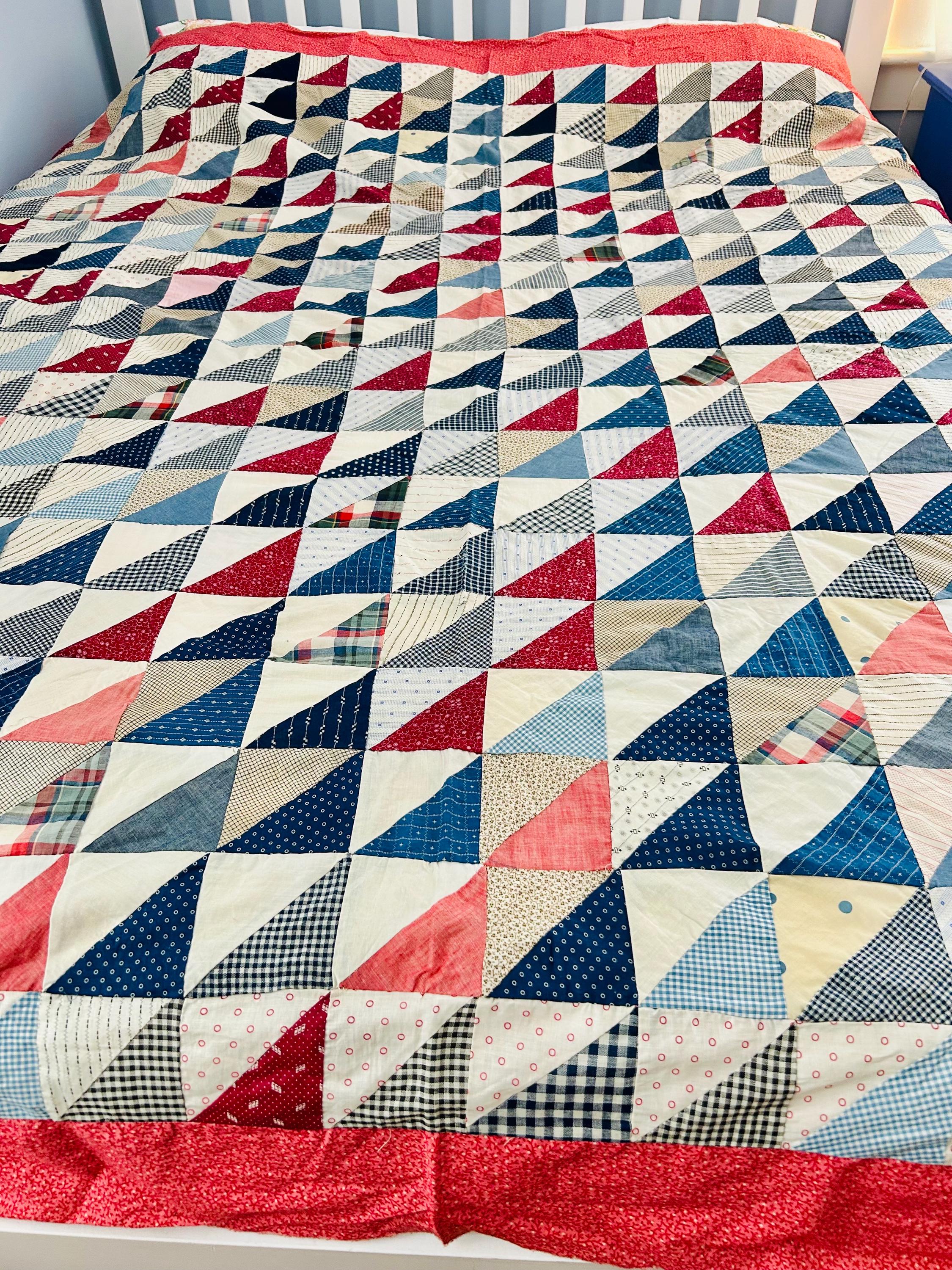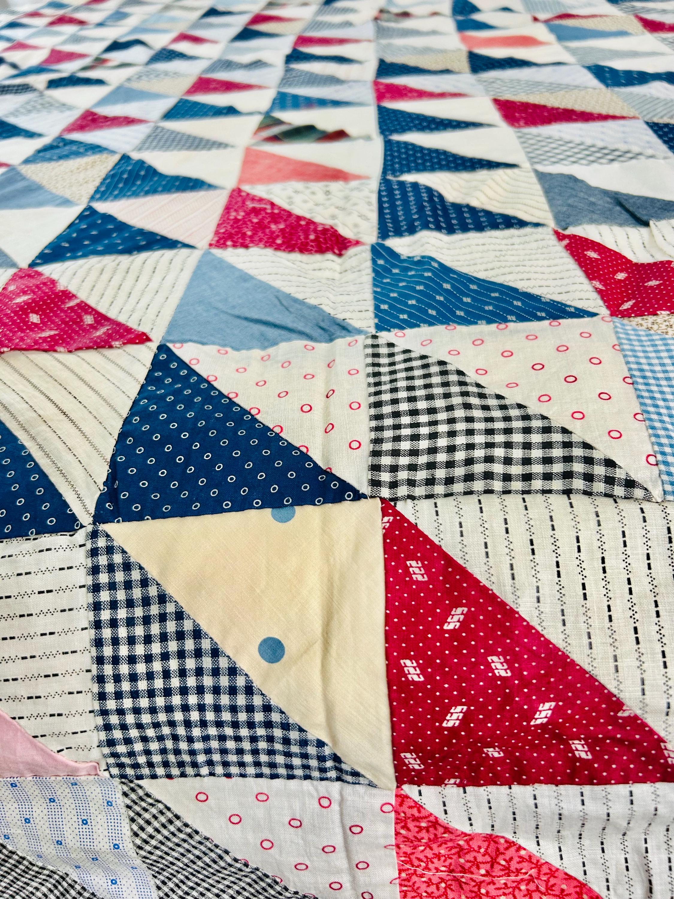 This "Thousand Pyramids" (or Thousand Triangles) piece is a scrappy assembly of fabrics that would have been found in a typical household during the late 1800s, including: • Indigo Discharge Prints: Numerous navy blue triangles with classic white geometric "sprig," star, and dot motifs. • Turkey Reds: Bright, saturated reds that remain remarkably vivid, a staple of the 1880s palette. • Double-Pink/Claret Border: The wide pink border features a delicate "seaweed" or "shrub" motif on a lighter pink ground, typical of the late Victorian era. • Period Shirtings & Mourning Prints: A variety of black-and-white checks, delicate blue-on-white stripes, and "conversational" geometric prints.