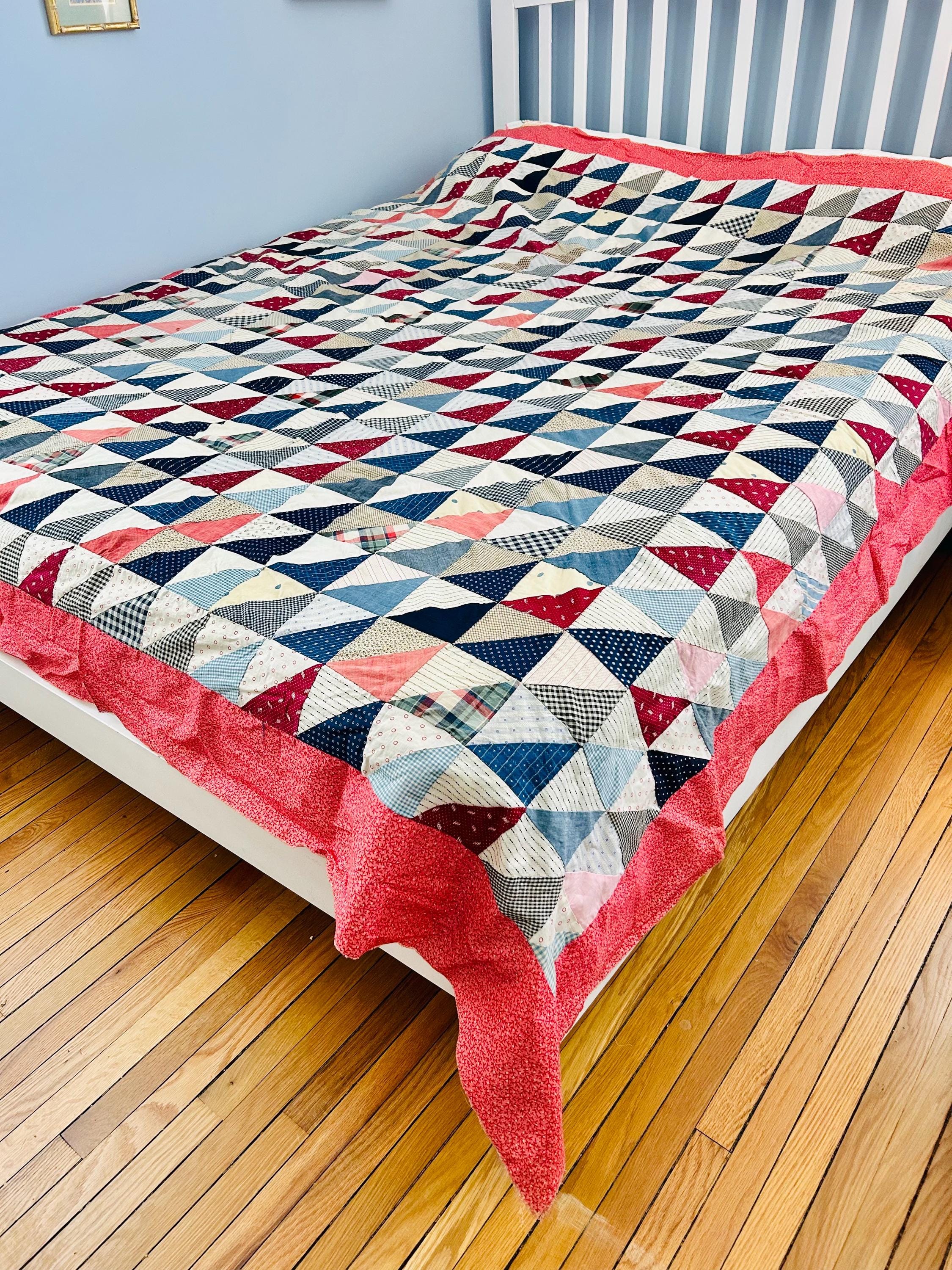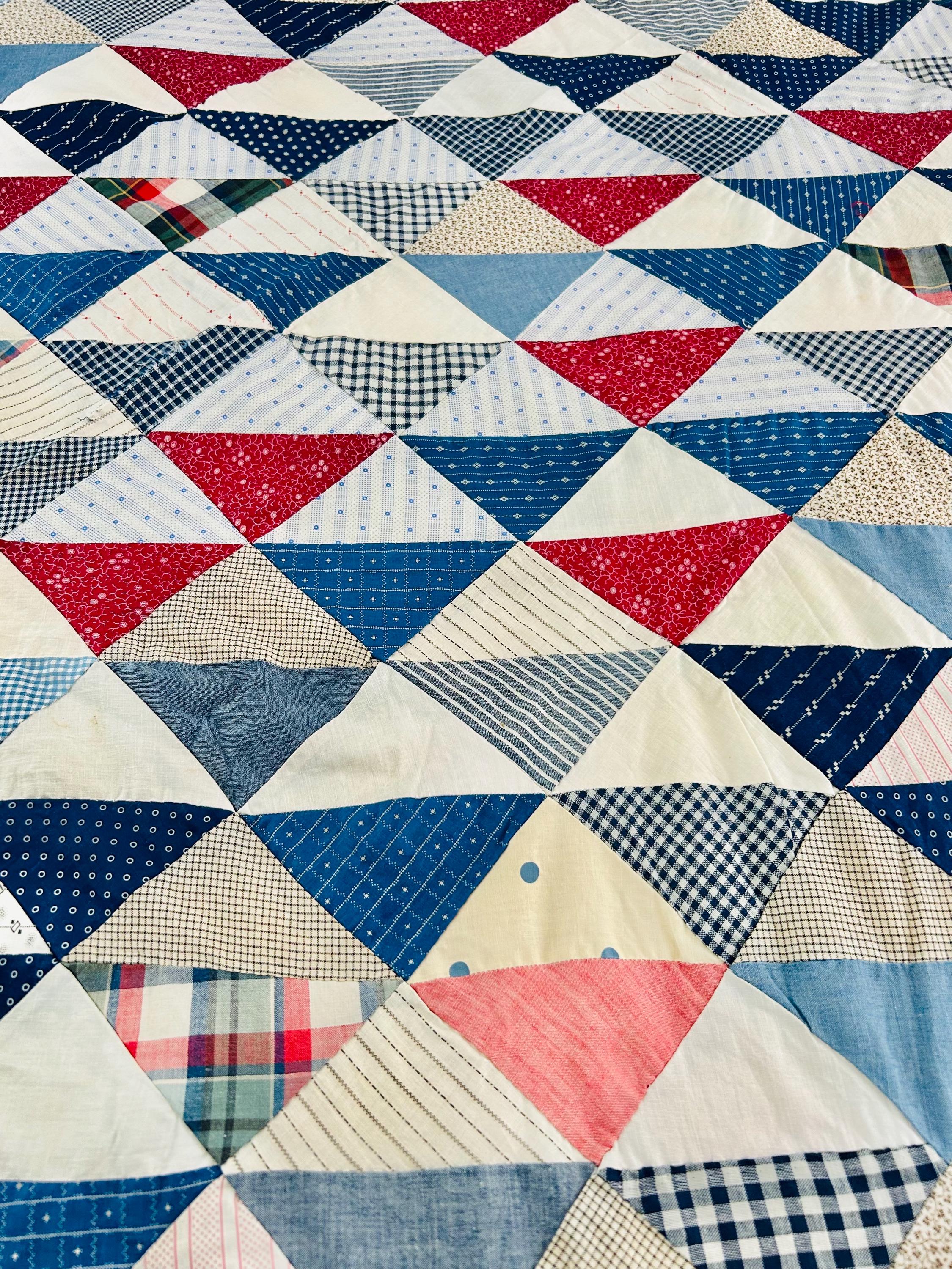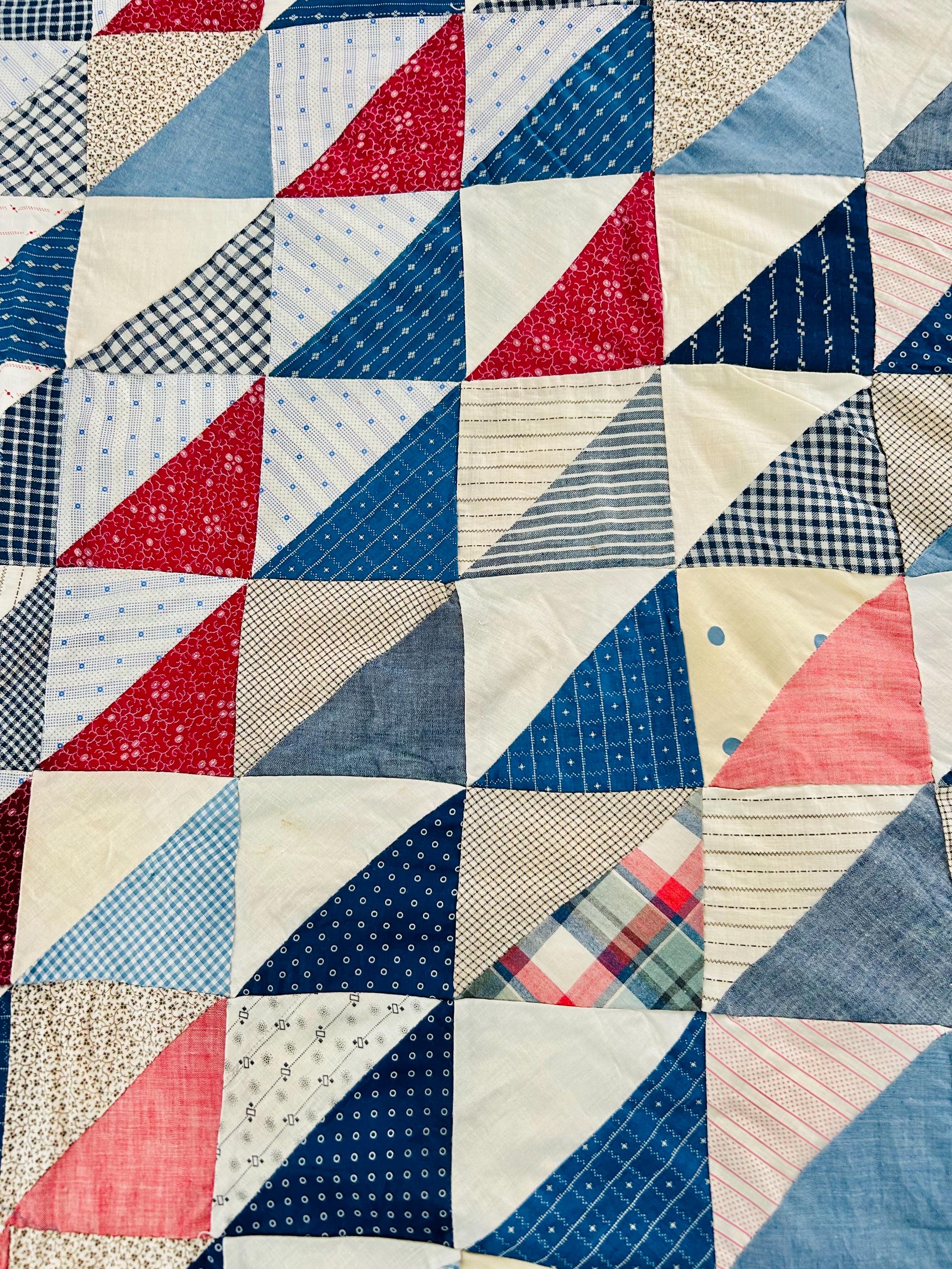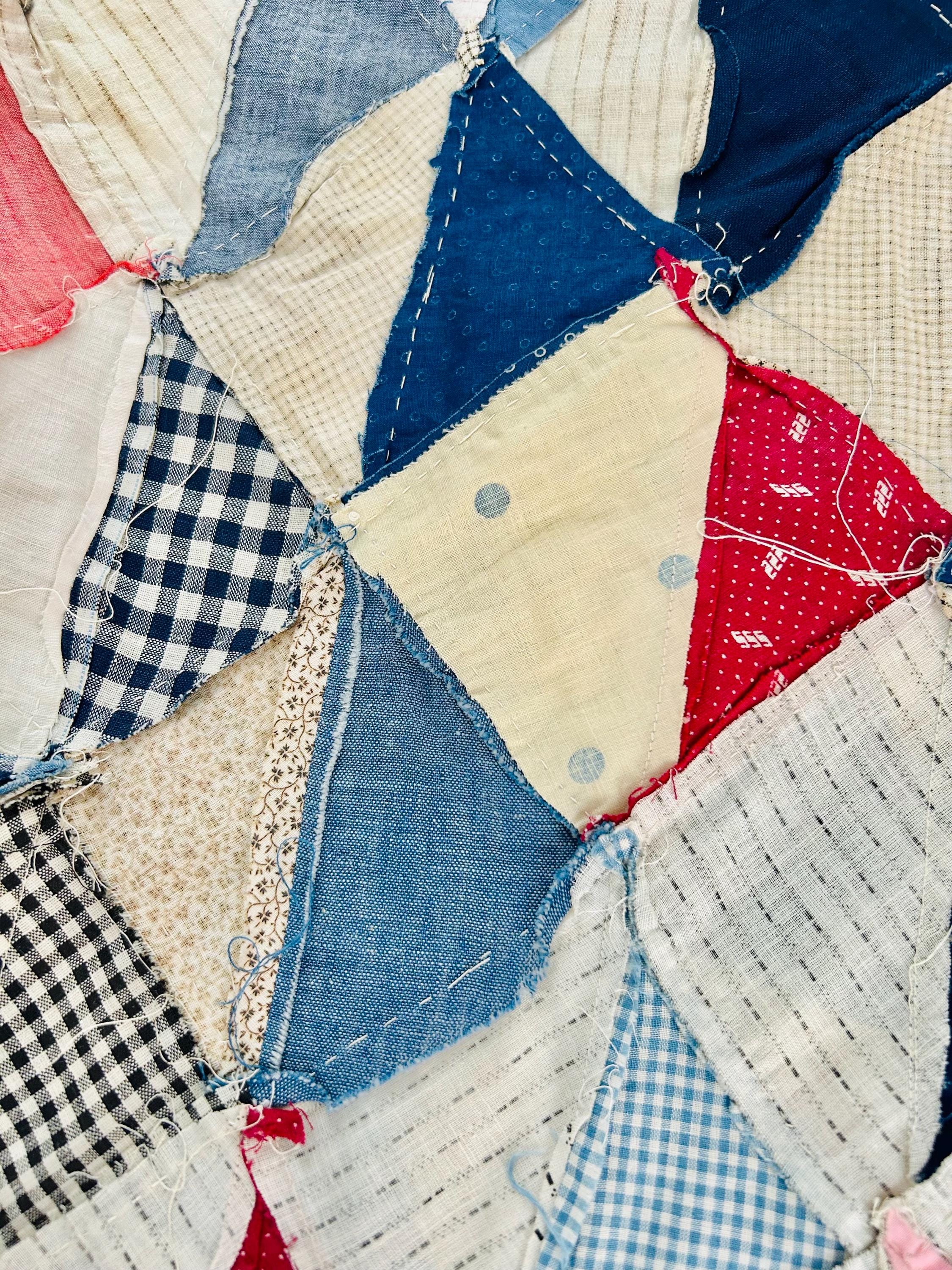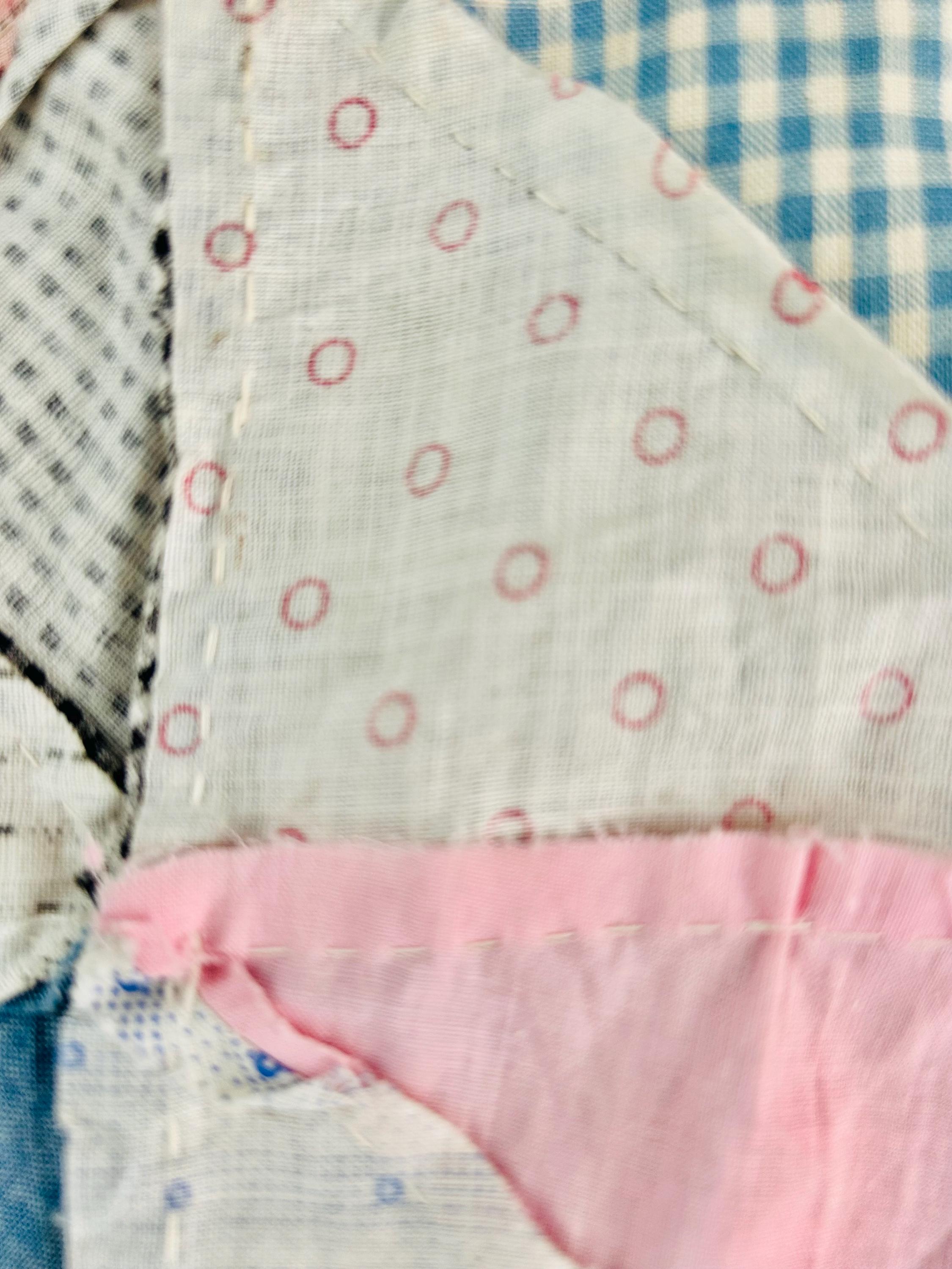 This "Thousand Pyramids" (or Thousand Triangles) piece is a scrappy assembly of fabrics that would have been found in a typical household during the late 1800s, including: • Indigo Discharge Prints: Numerous navy blue triangles with classic white geometric "sprig," star, and dot motifs. • Turkey Reds: Bright, saturated reds that remain remarkably vivid, a staple of the 1880s palette. • Double-Pink/Claret Border: The wide pink border features a delicate "seaweed" or "shrub" motif on a lighter pink ground, typical of the late Victorian era. • Period Shirtings & Mourning Prints: A variety of black-and-white checks, delicate blue-on-white stripes, and "conversational" geometric prints.
