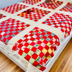 The quilt top comes from a smoke-free, pet-free home and is pictured on a queen-size bed.