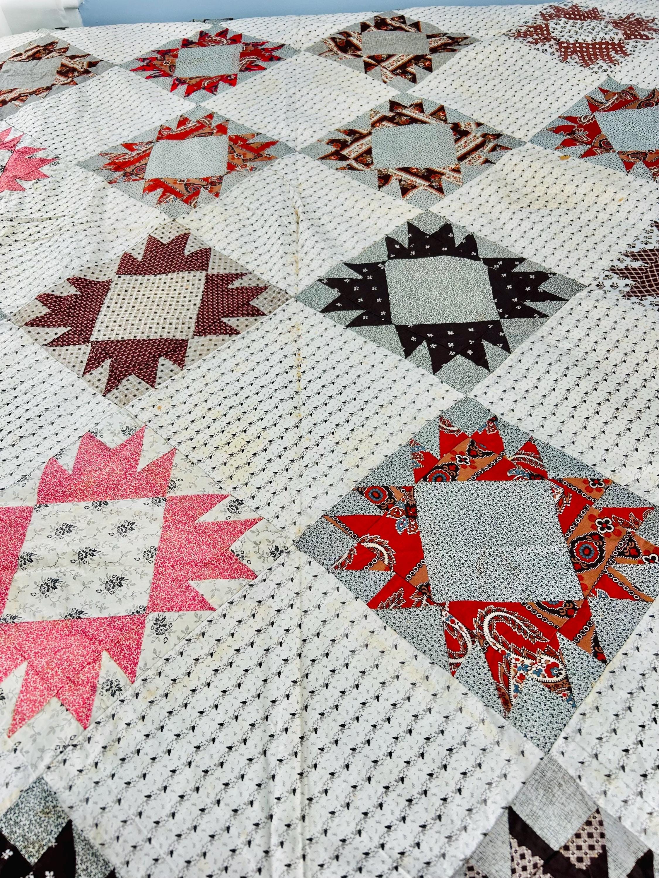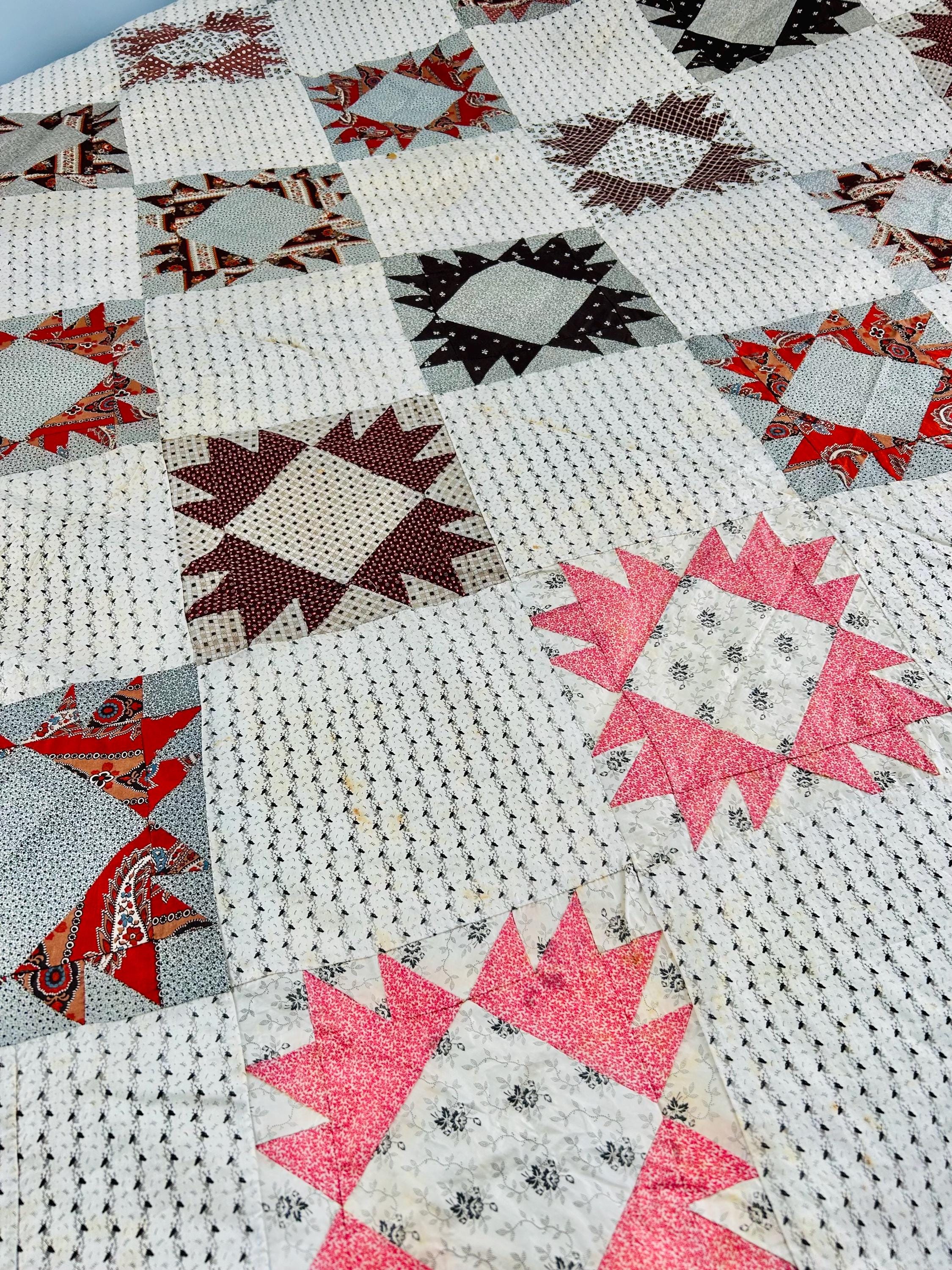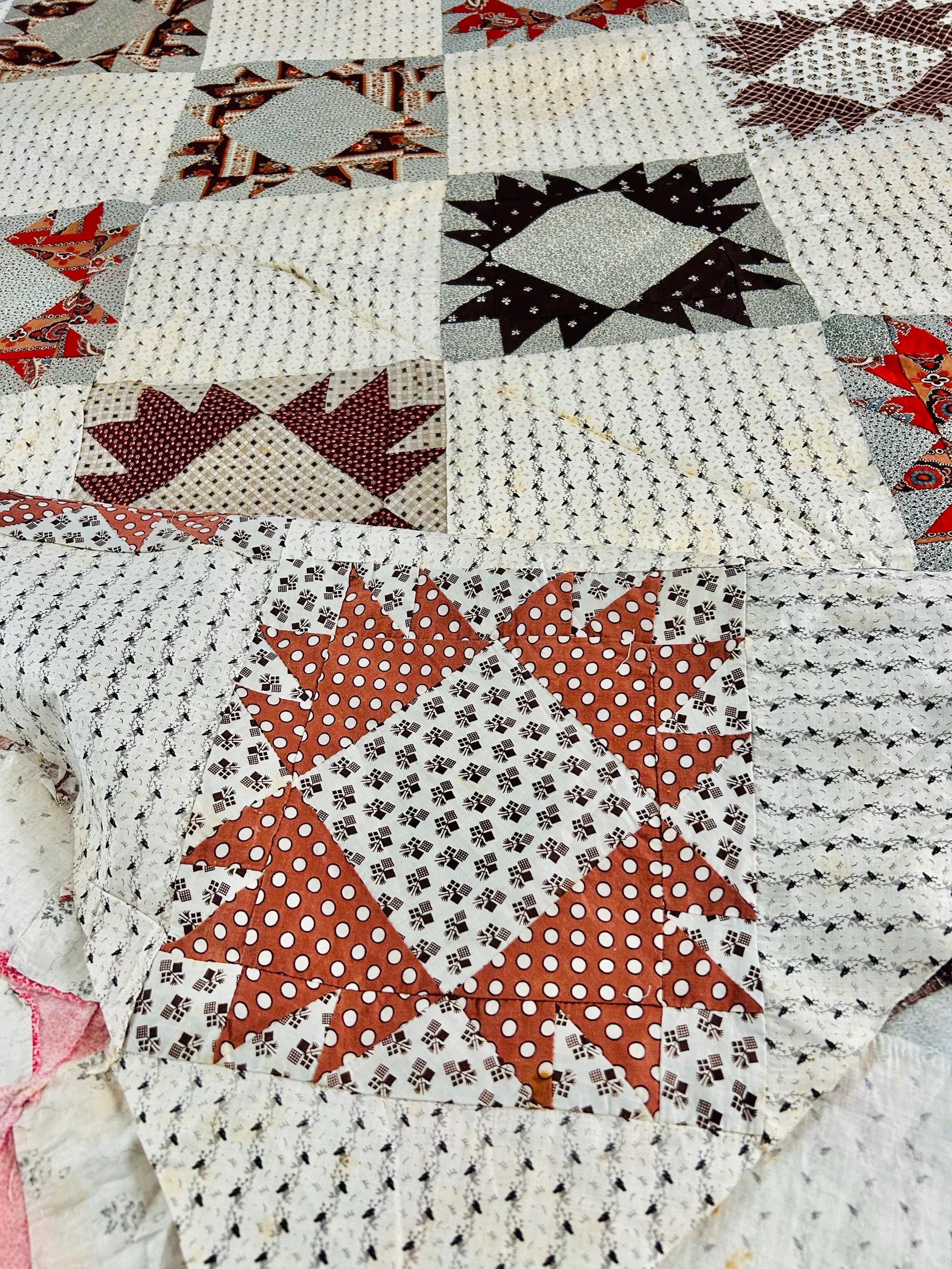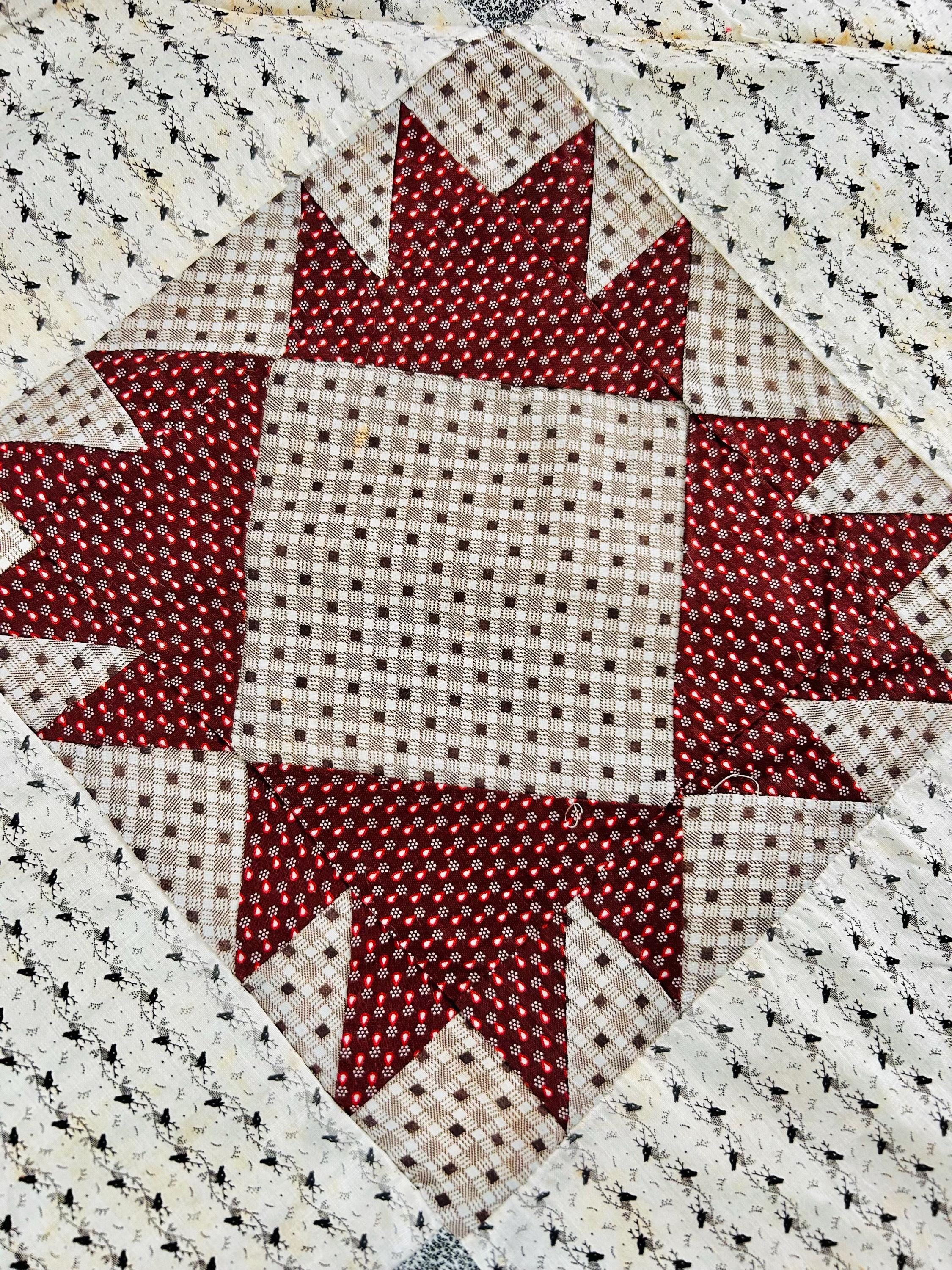 This is a beautiful, hand-pieced "Dove at the Window" quilt top. Dating to the late 1800s, this piece features a sophisticated "on-point" setting and a beautiful array of period-calicos, including madders, chocolates, and indigos. Specifically, it includes: • Madder Reds & Browns: Rich, earthy tones typical of the era. • Indigo & Shirting Prints: Classic navy and white "low volume" backgrounds. • Turkey Red & Claret: Vibrant pops of color that remain remarkably bright. • Paisley & Floral Calicos: Intricate motifs used within the star points.