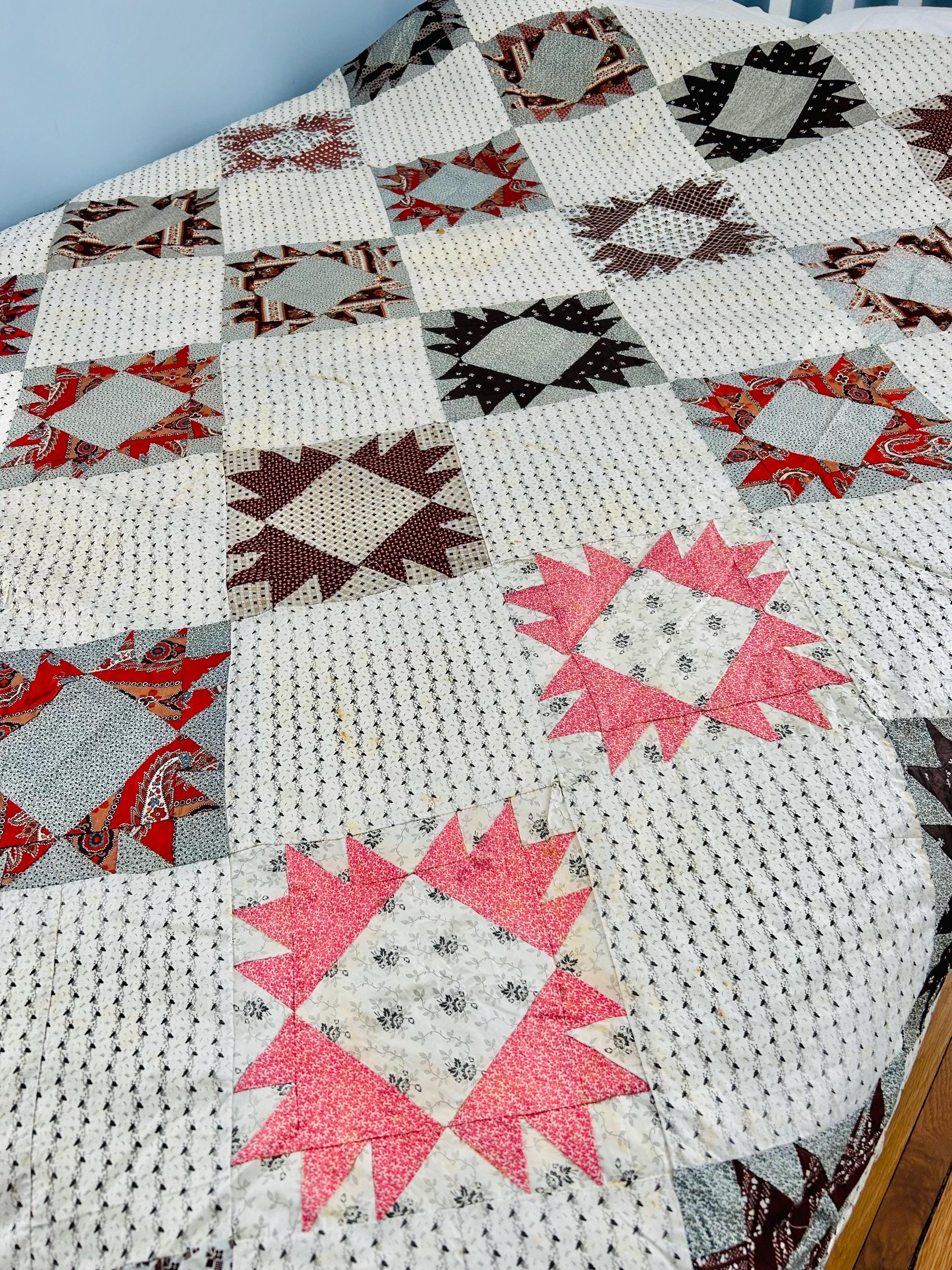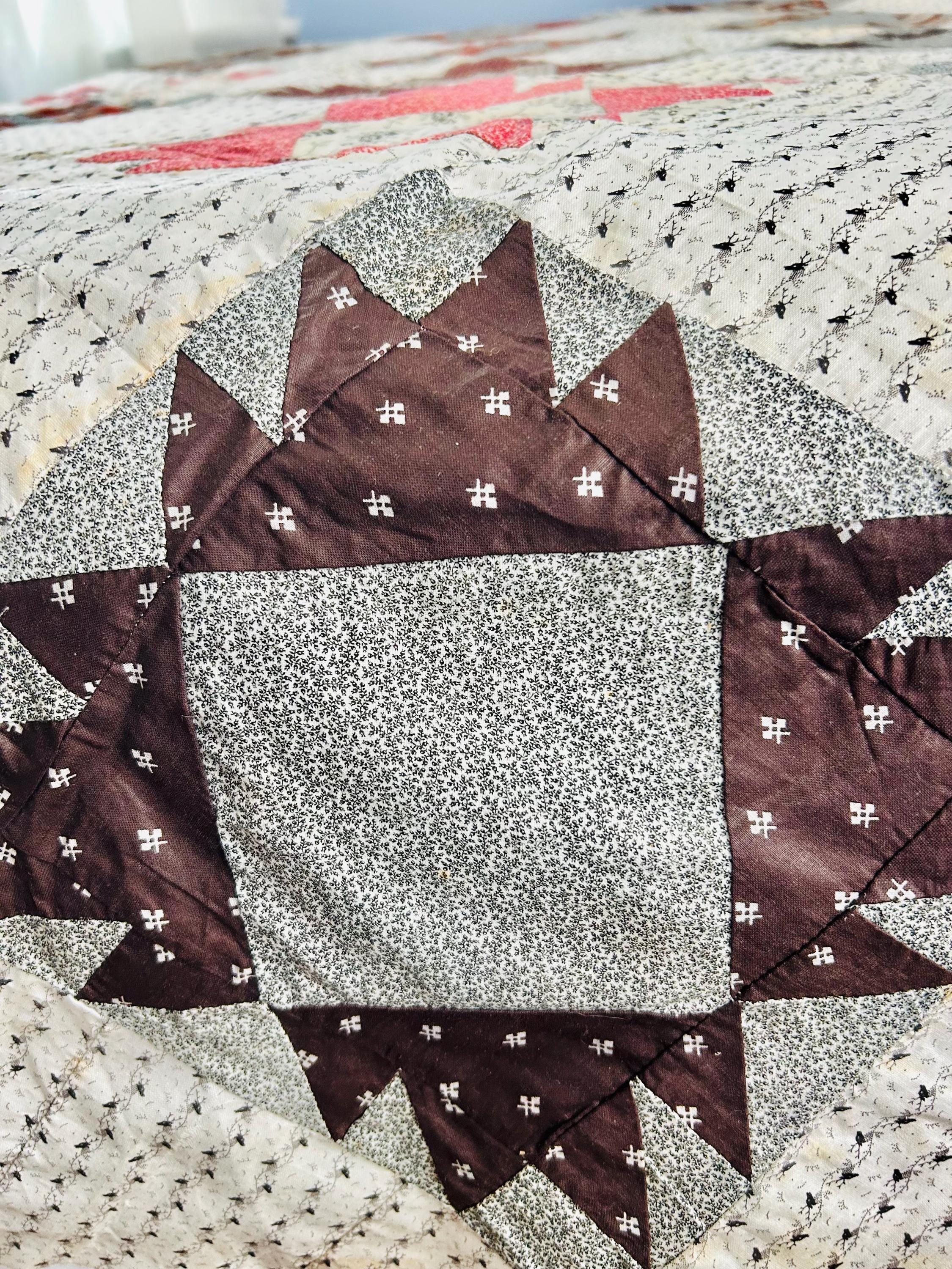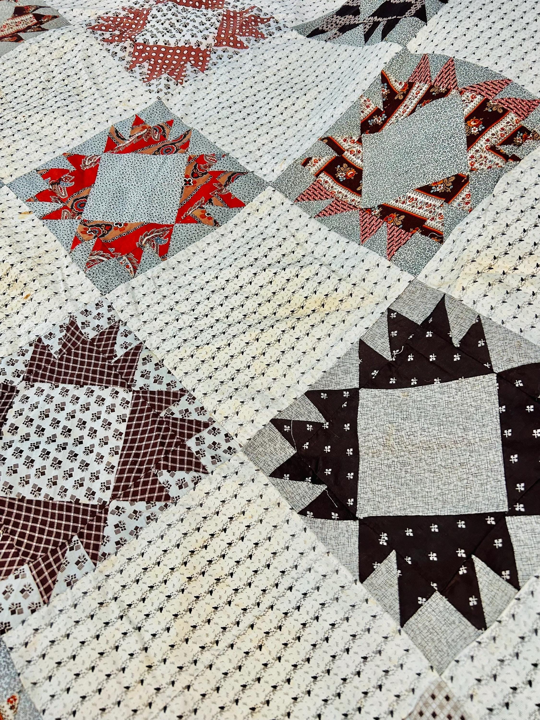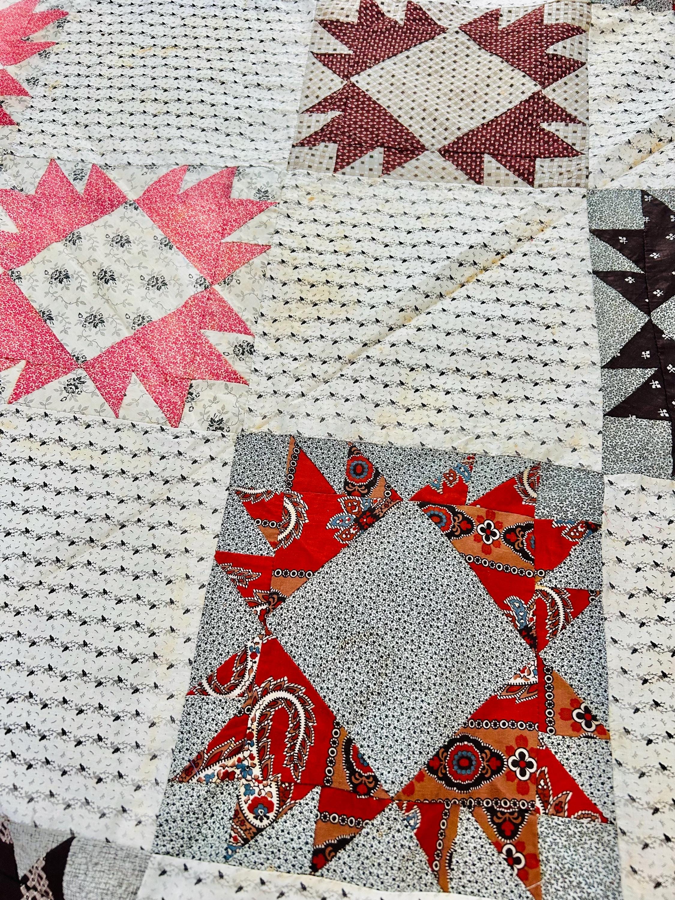 This is a beautiful, hand-pieced "Dove at the Window" quilt top. Dating to the late 1800s, this piece features a sophisticated "on-point" setting and a beautiful array of period-calicos, including madders, chocolates, and indigos. Specifically, it includes: • Madder Reds & Browns: Rich, earthy tones typical of the era. • Indigo & Shirting Prints: Classic navy and white "low volume" backgrounds. • Turkey Red & Claret: Vibrant pops of color that remain remarkably bright. • Paisley & Floral Calicos: Intricate motifs used within the star points.