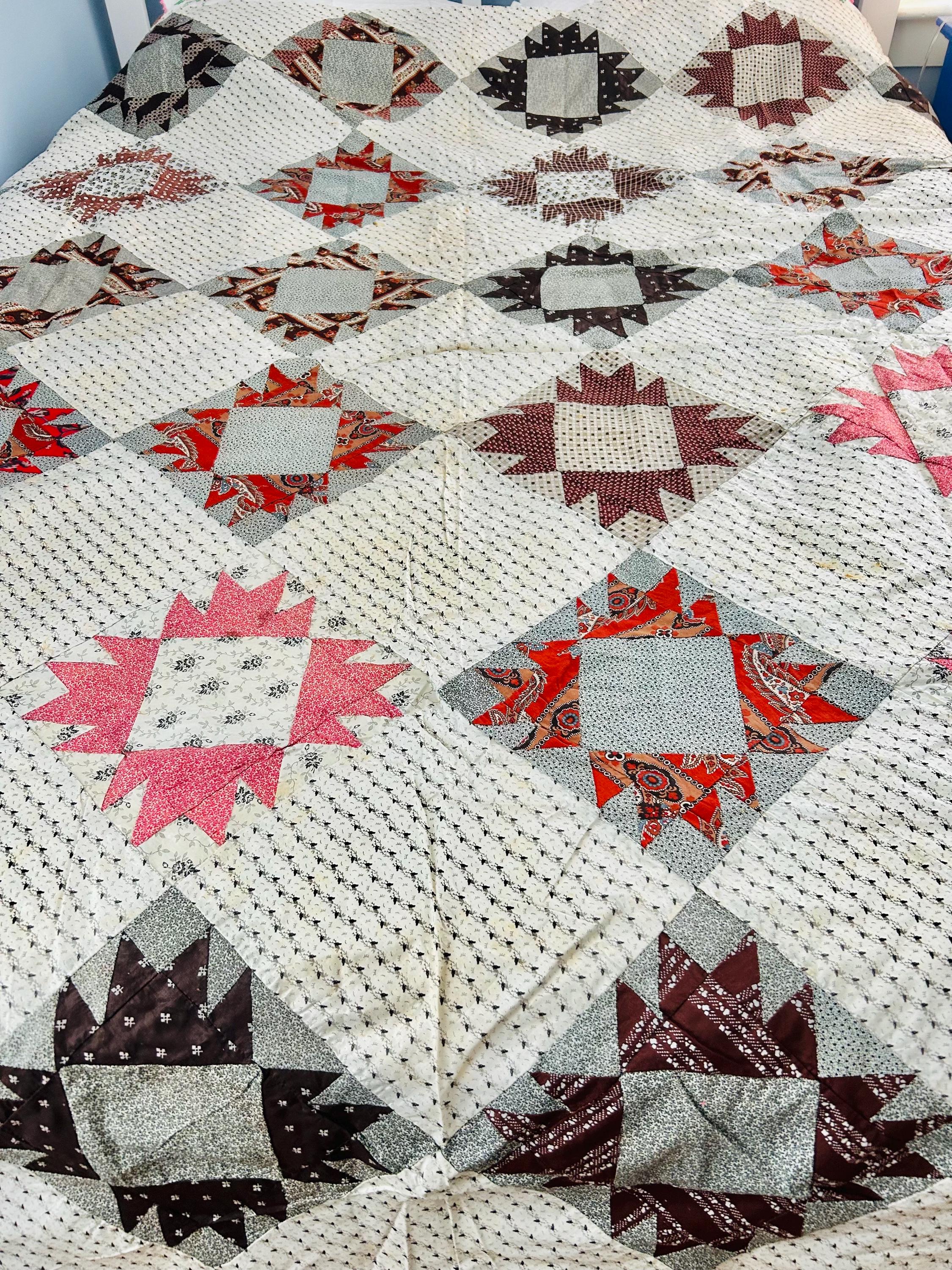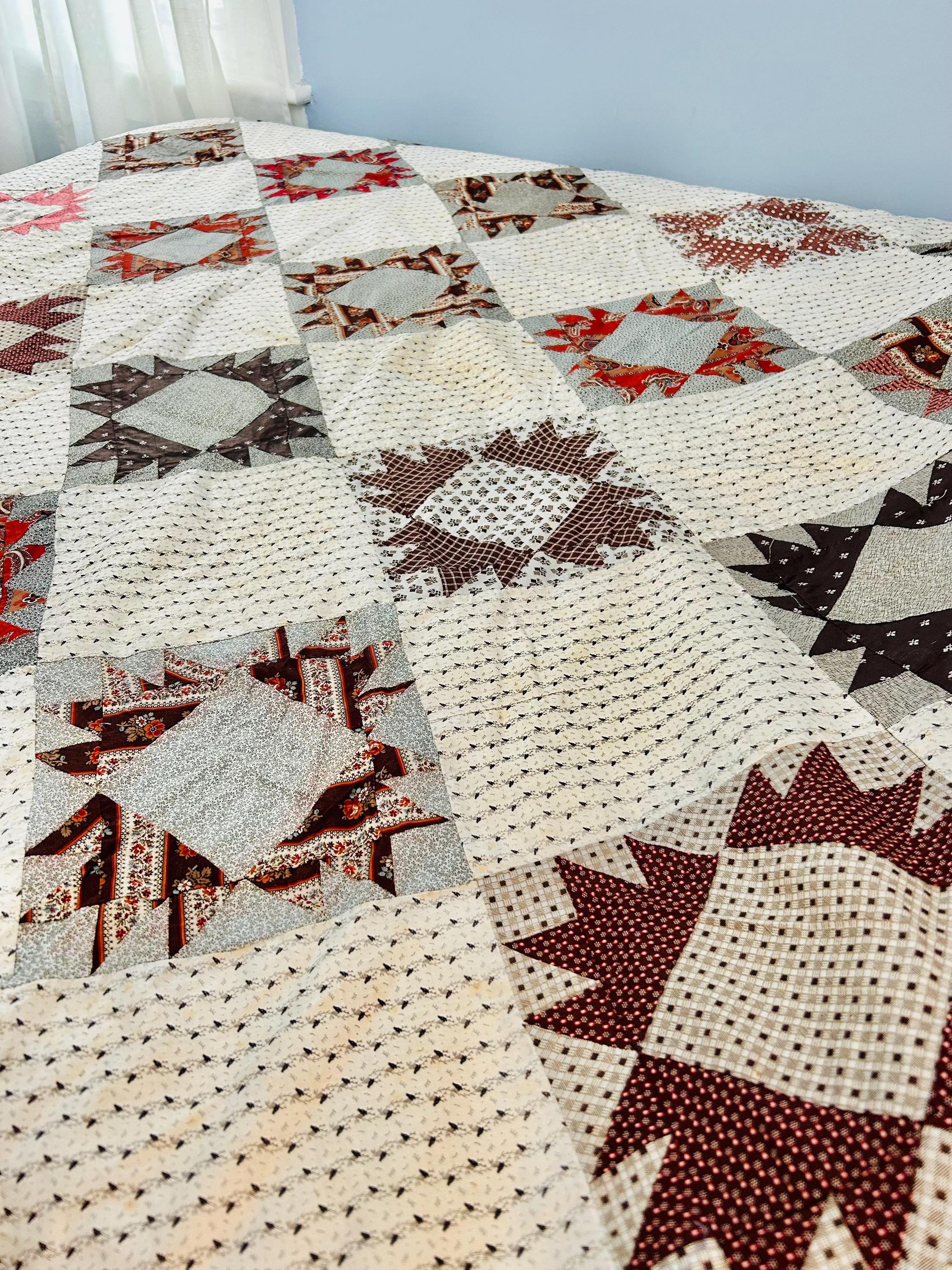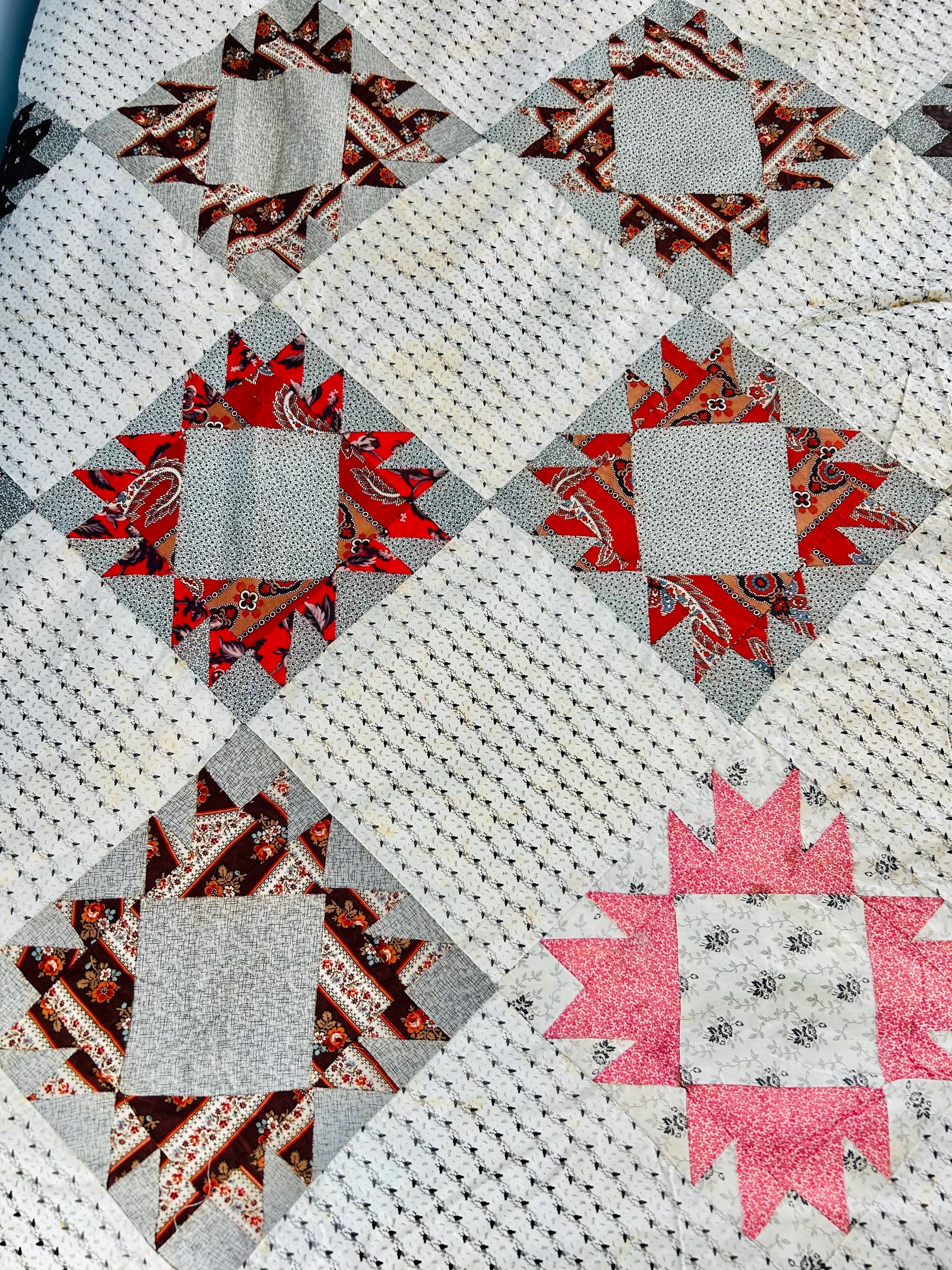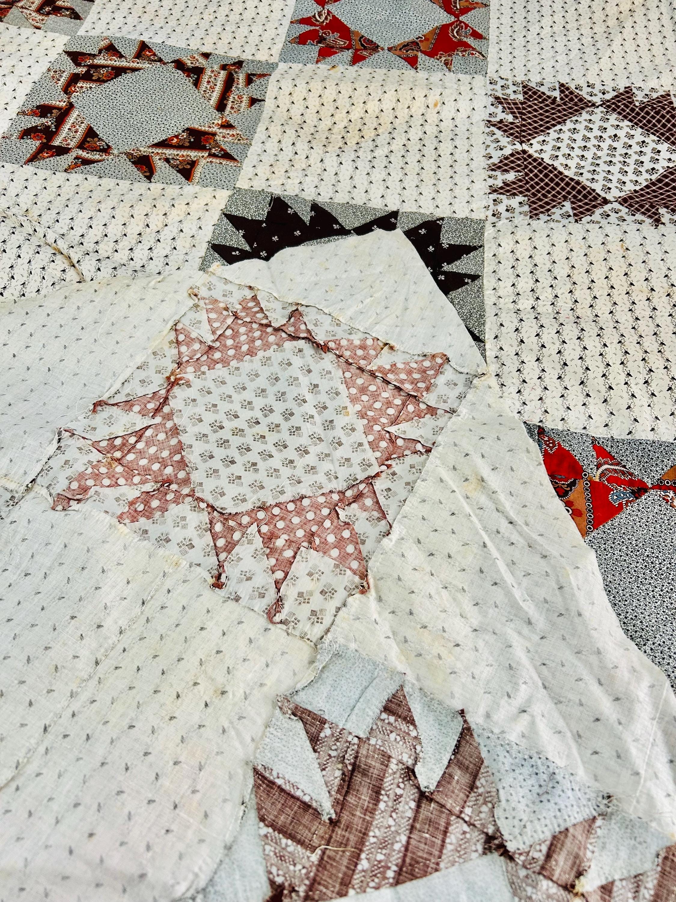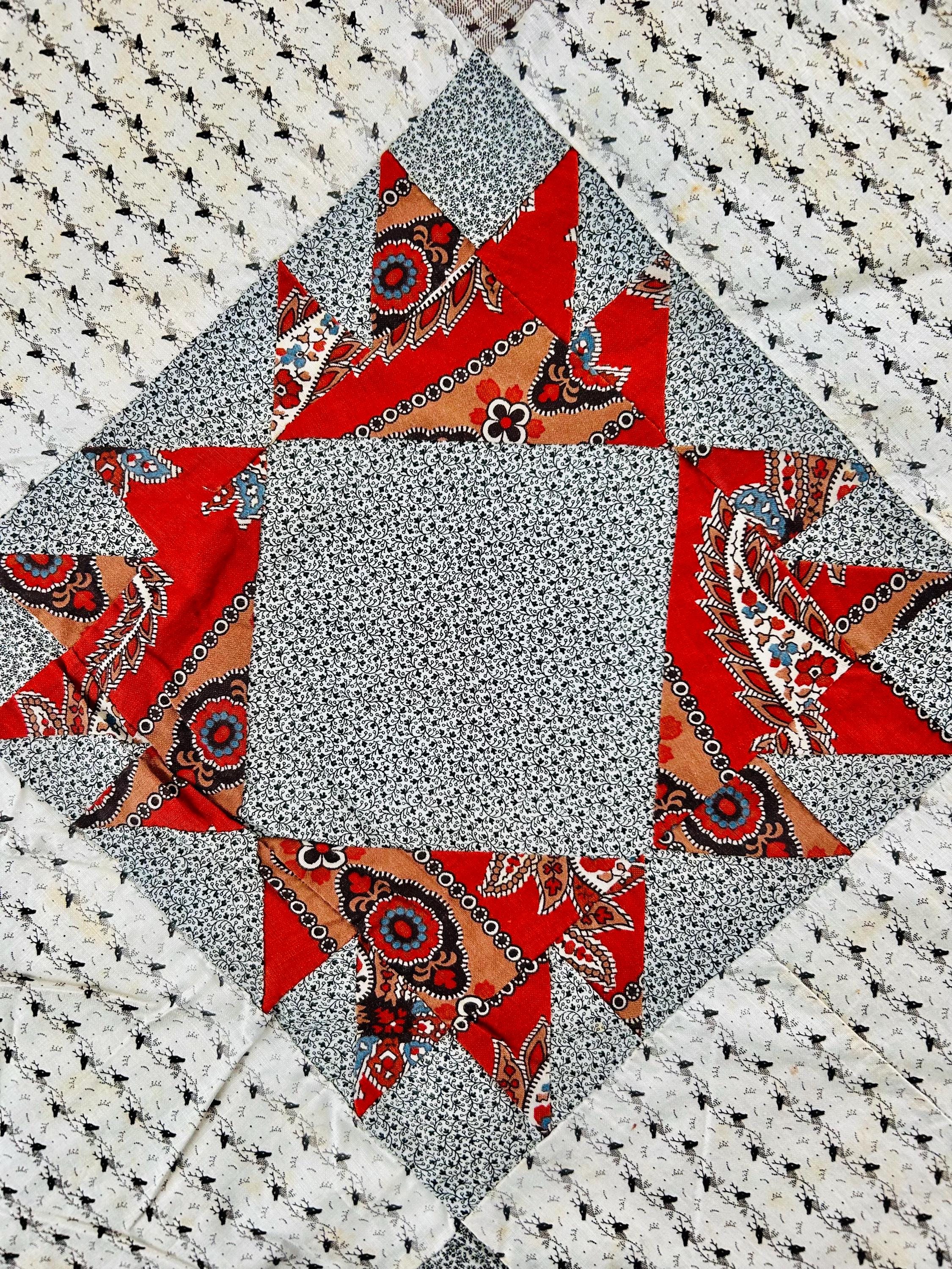 This is a beautiful, hand-pieced "Dove at the Window" quilt top. Dating to the late 1800s, this piece features a sophisticated "on-point" setting and a beautiful array of period-calicos, including madders, chocolates, and indigos. Specifically, it includes: • Madder Reds & Browns: Rich, earthy tones typical of the era. • Indigo & Shirting Prints: Classic navy and white "low volume" backgrounds. • Turkey Red & Claret: Vibrant pops of color that remain remarkably bright. • Paisley & Floral Calicos: Intricate motifs used within the star points.