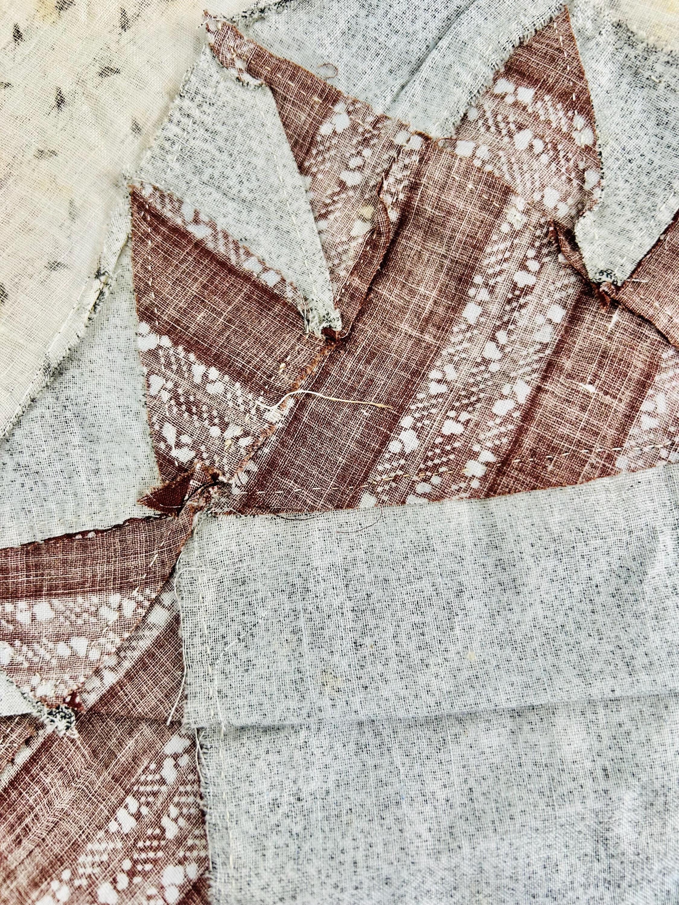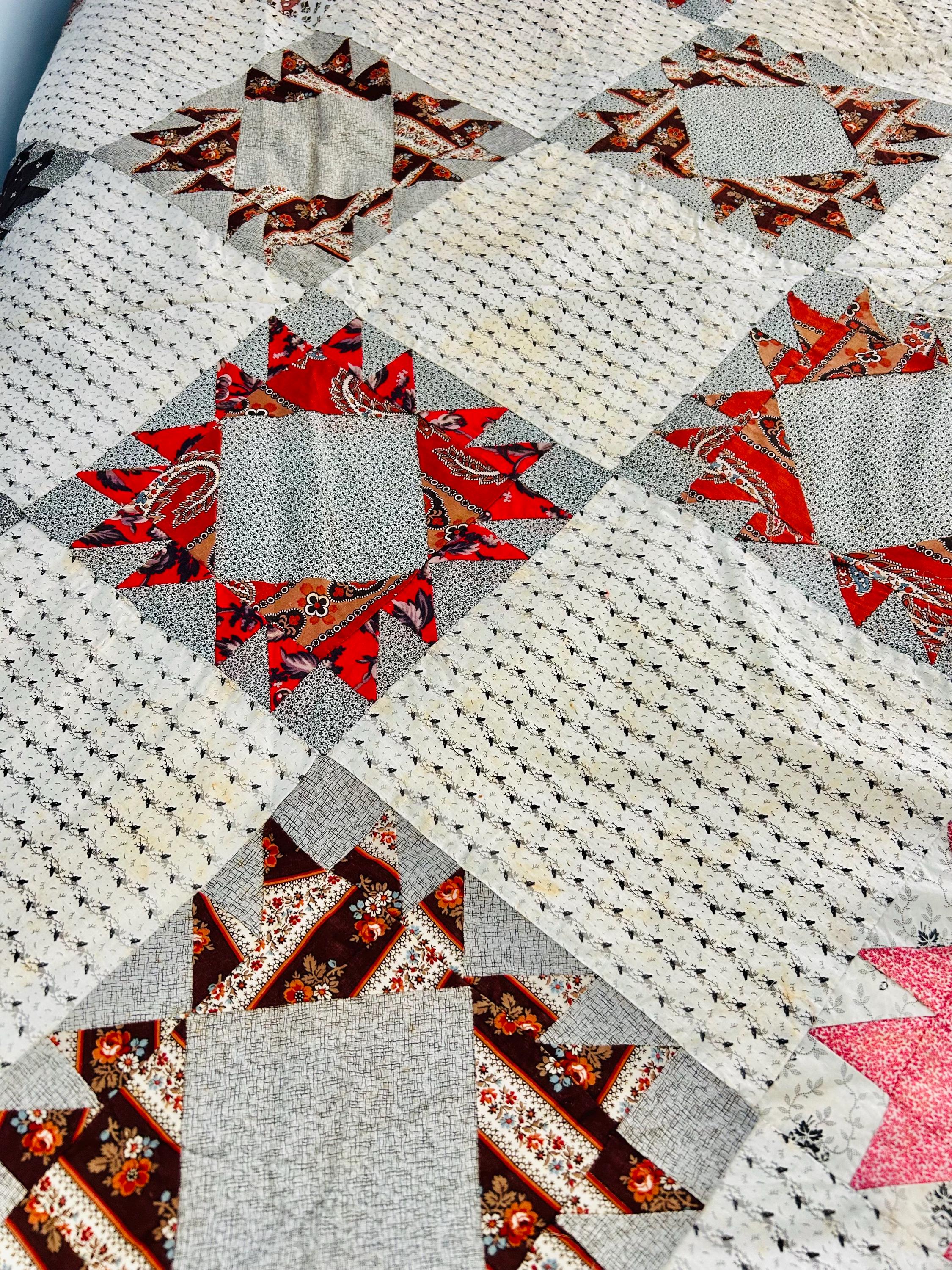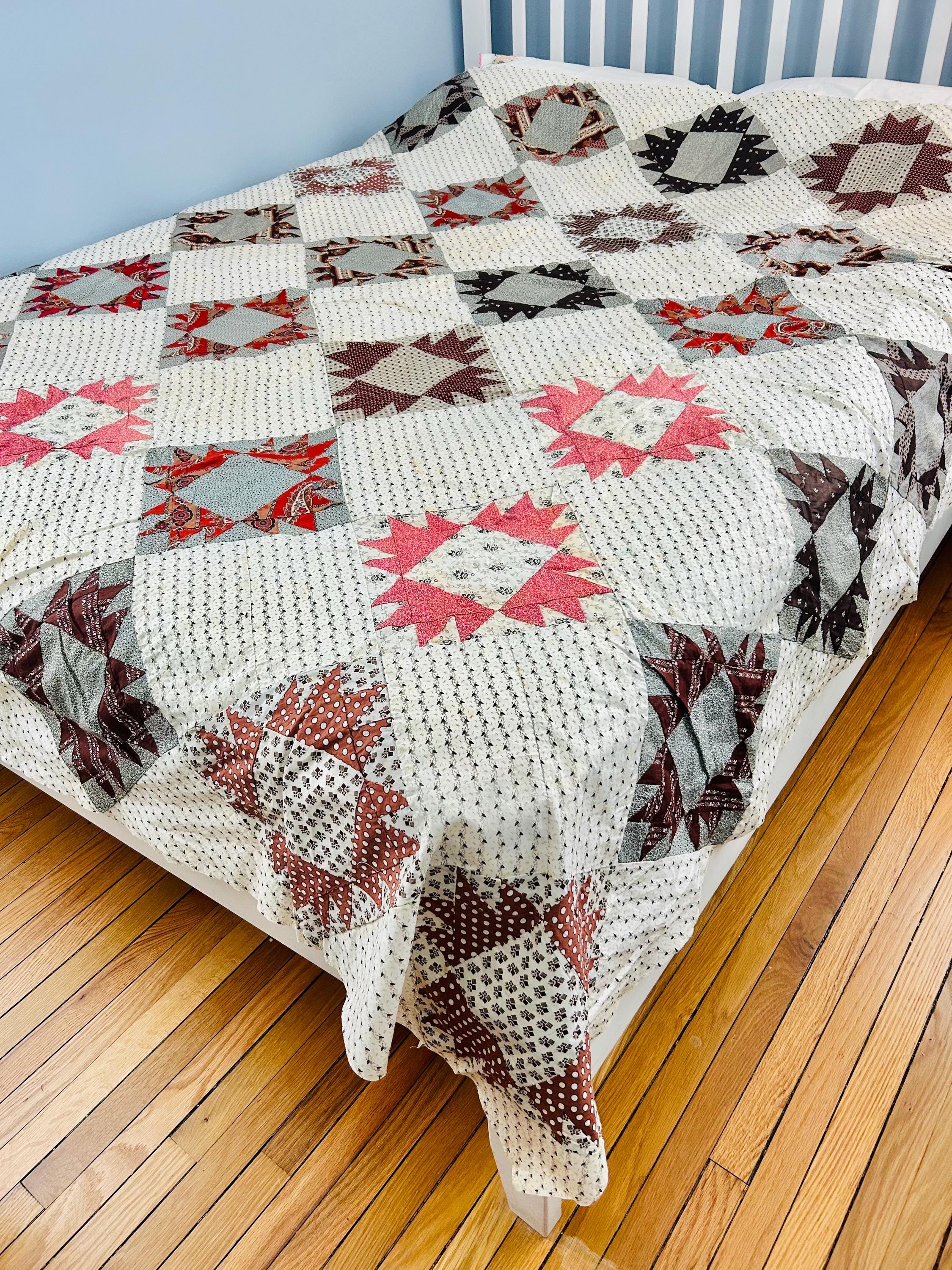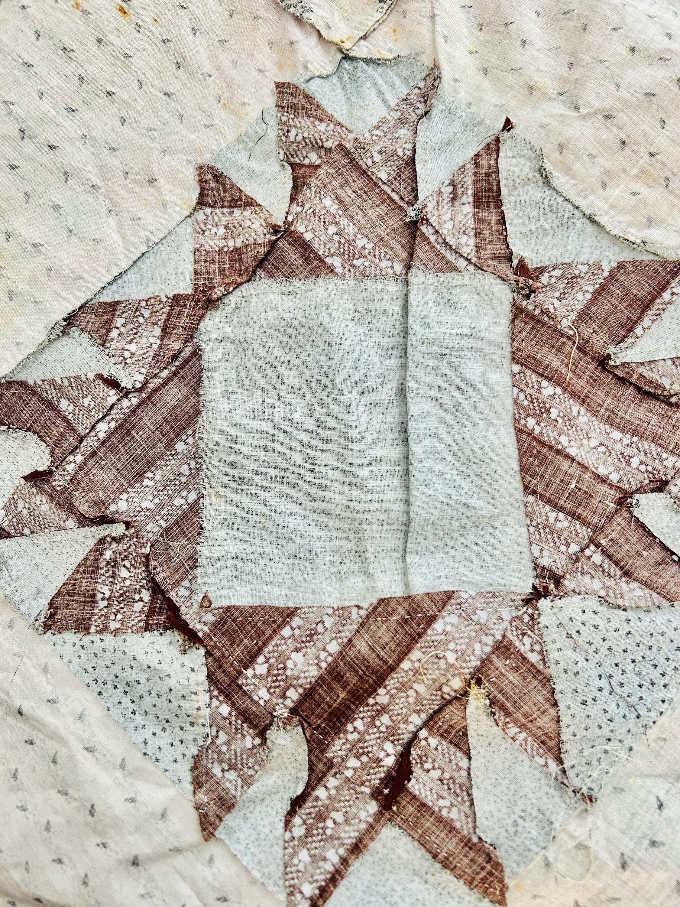 This is a beautiful, hand-pieced "Dove at the Window" quilt top. Dating to the late 1800s, this piece features a sophisticated "on-point" setting and a beautiful array of period-calicos, including madders, chocolates, and indigos. Specifically, it includes: • Madder Reds & Browns: Rich, earthy tones typical of the era. • Indigo & Shirting Prints: Classic navy and white "low volume" backgrounds. • Turkey Red & Claret: Vibrant pops of color that remain remarkably bright. • Paisley & Floral Calicos: Intricate motifs used within the star points.