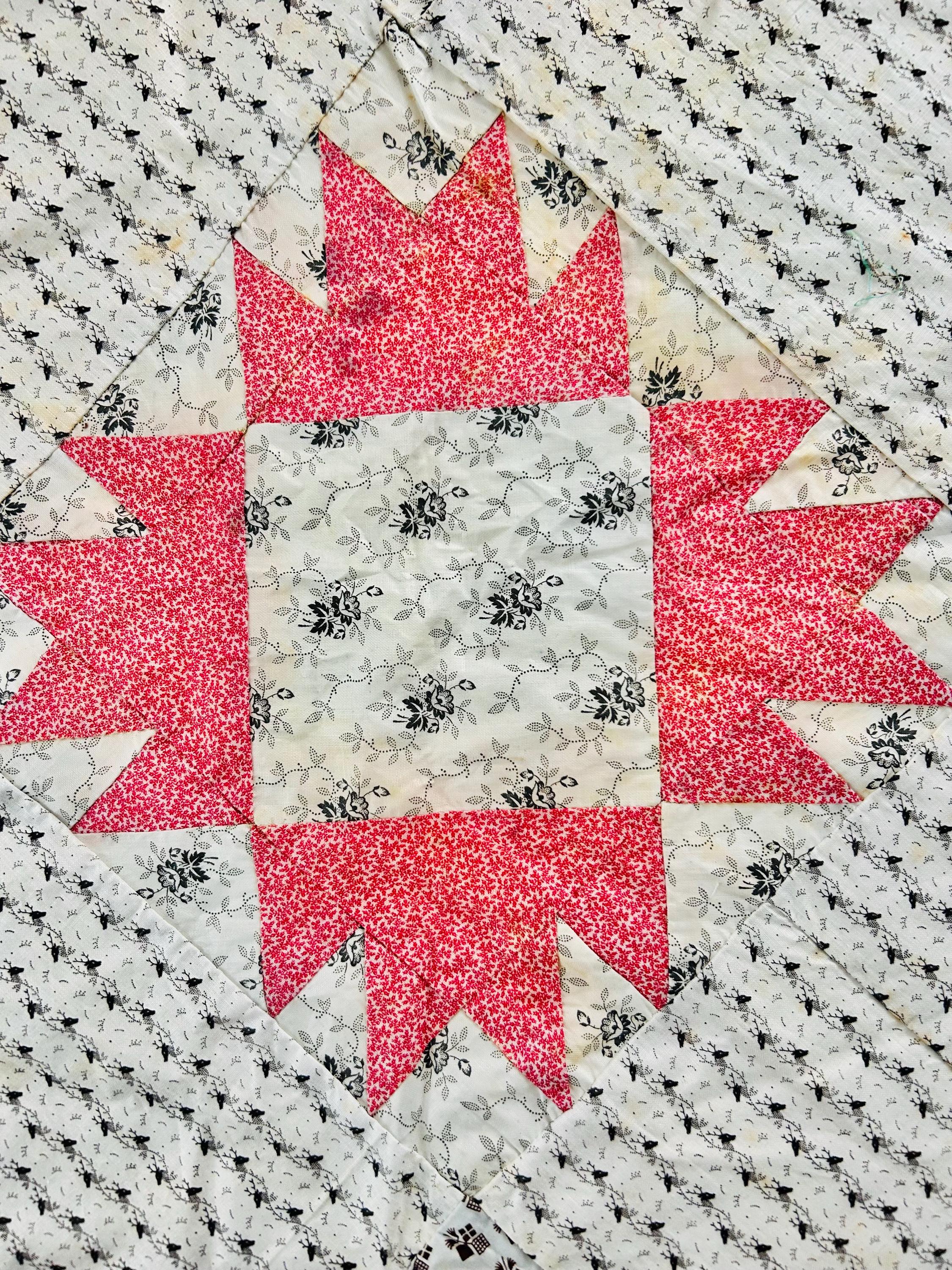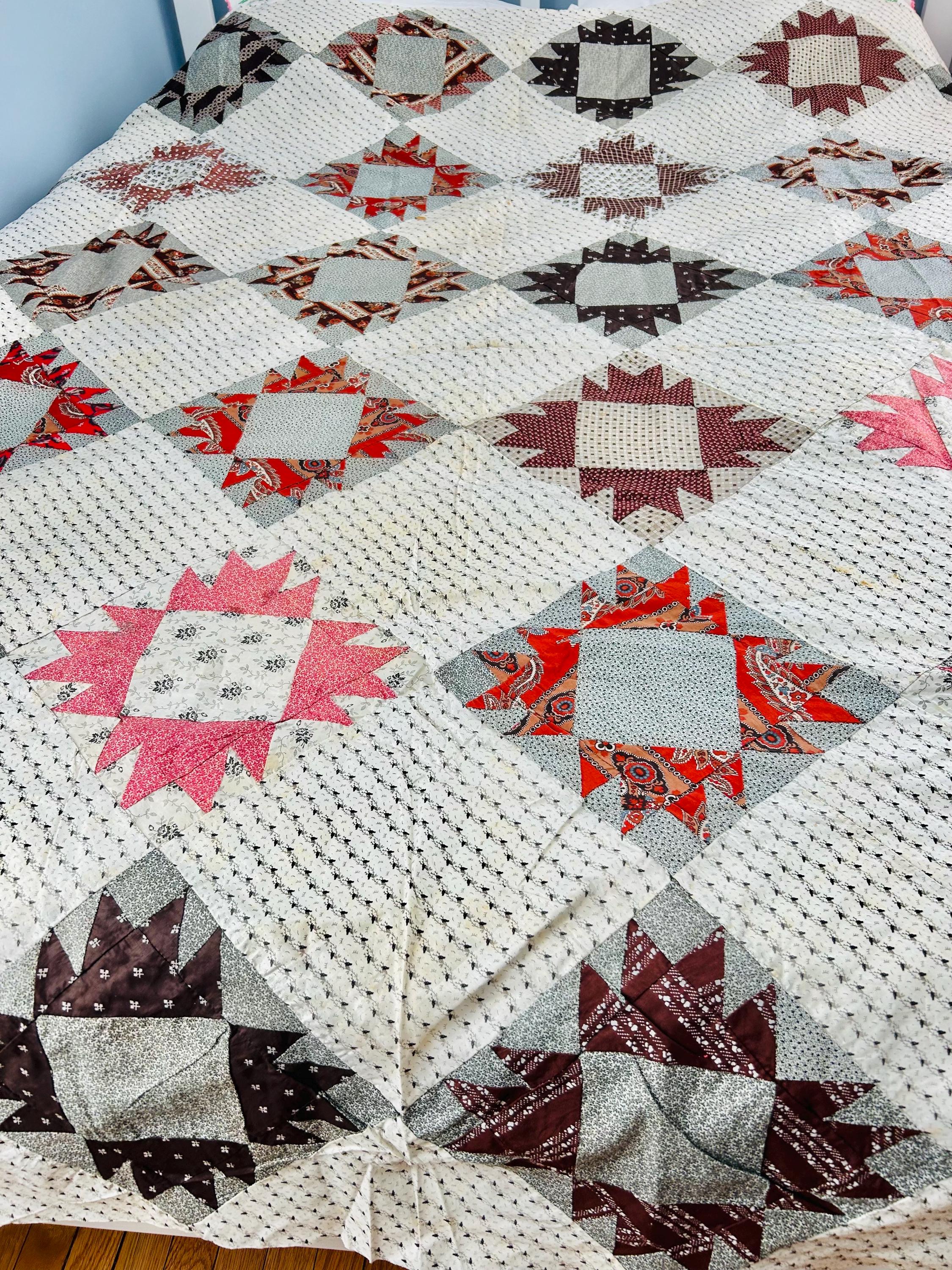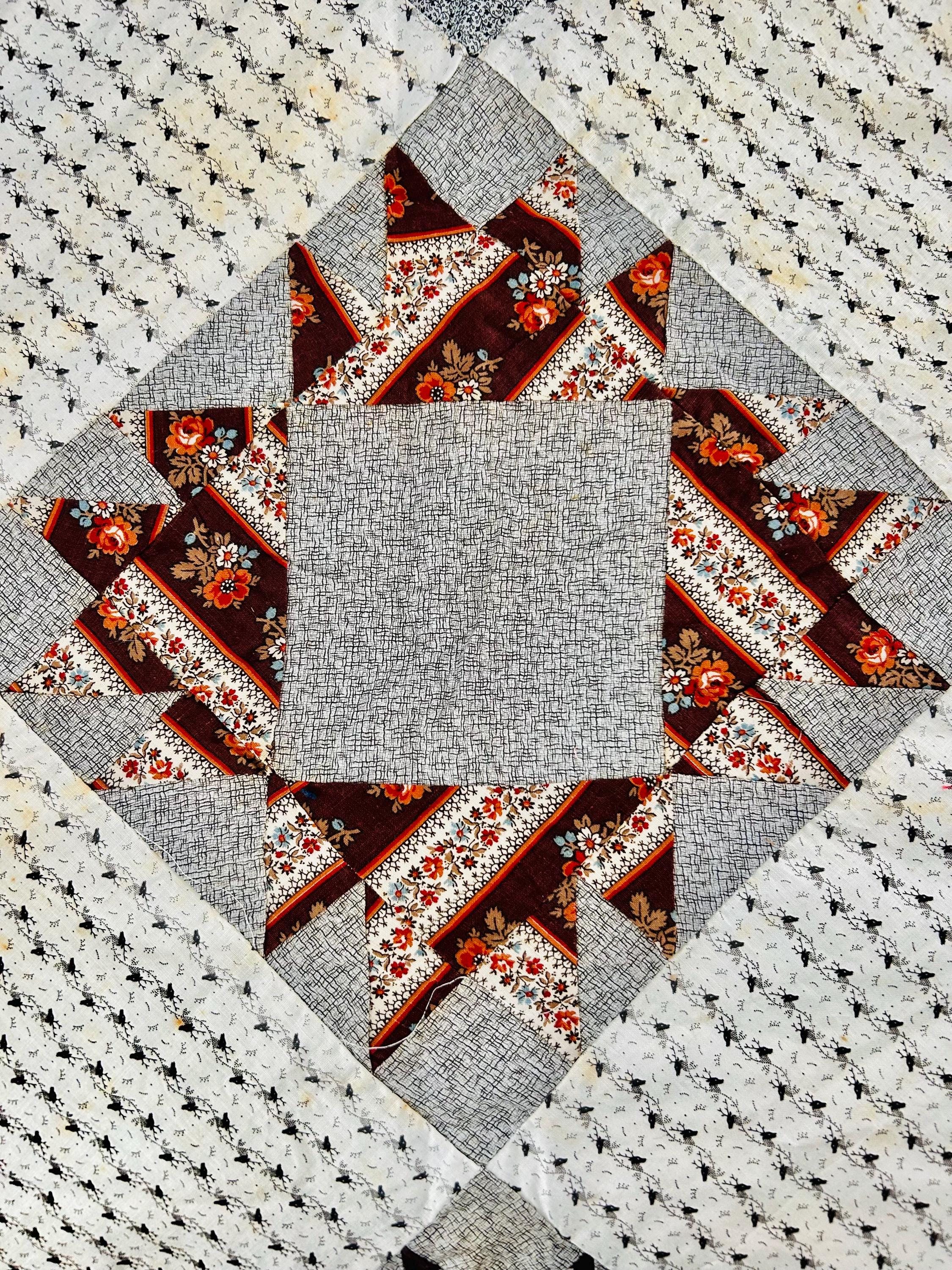 Details • Pattern: Dove at the Window (set on point) • Estimated Age: Late 19th Century (c. 1880–1895) • Dimensions: 80" x 80" (Square) • Fabrics: A lovely variety of 19th-century prints