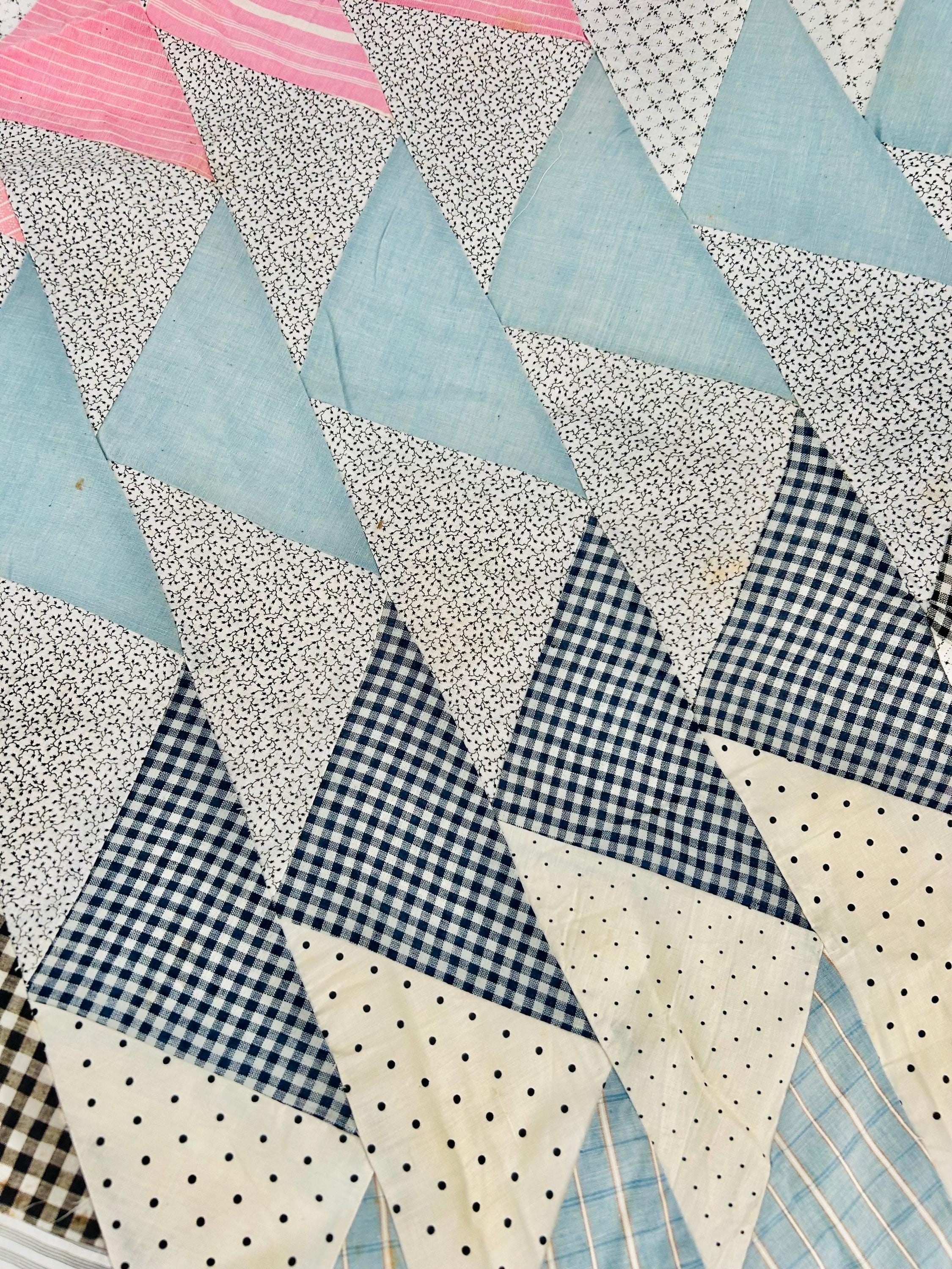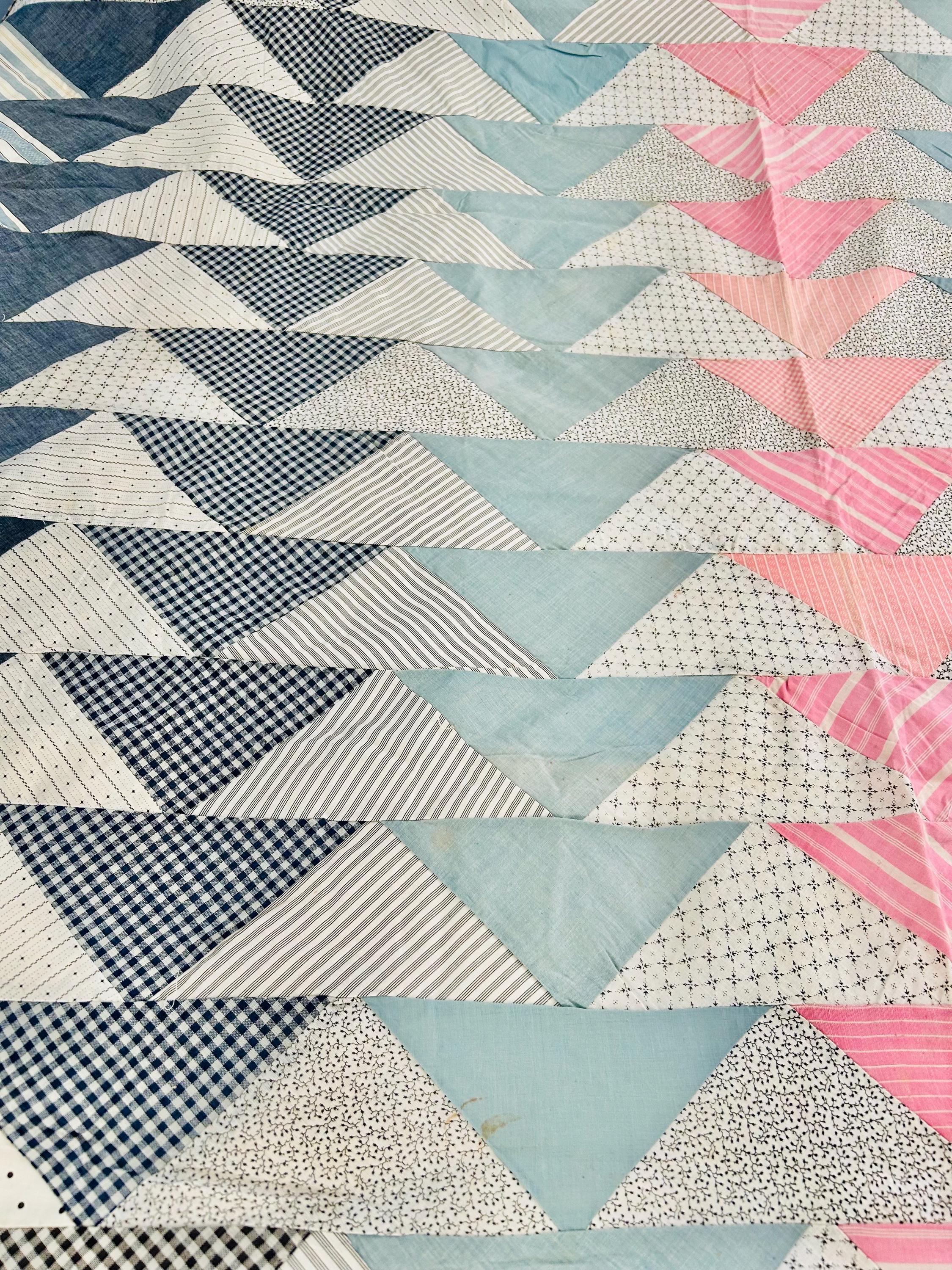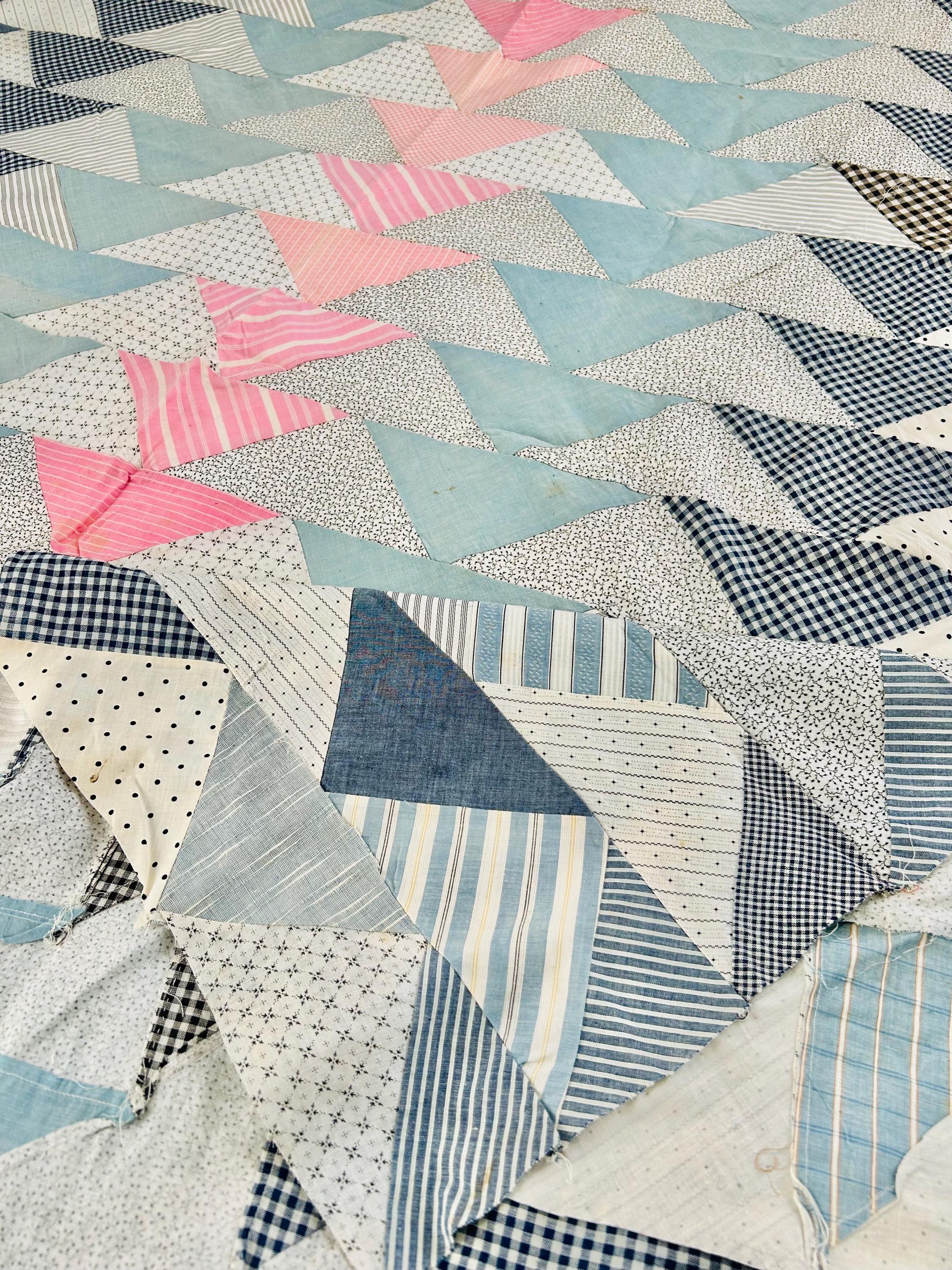 Details • Pattern: Wild Goose Chase / Flying Geese variation • Era: circa 1935–1945 (Depression era) • Size: approximately 67” x 82” • Construction: hand pieced cotton fabrics • Fabrics: feedsack-era calicos, ginghams, stripes, dots, and chambray blues• Colors: pale blue, soft pink, cream, black, and navy prints• Layout: diagonal flying geese rows with a pink center column• Condition: unfinished quilt top only