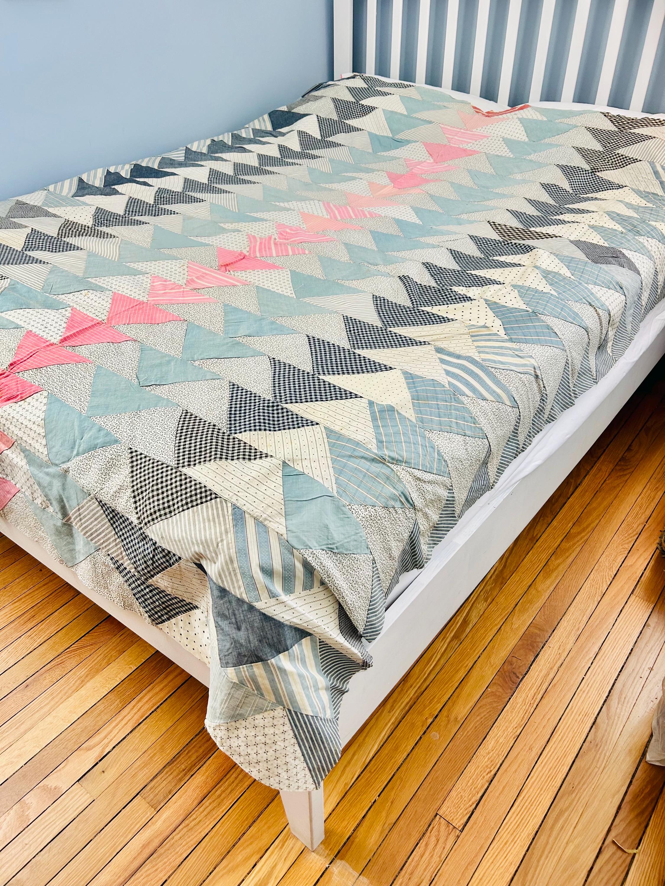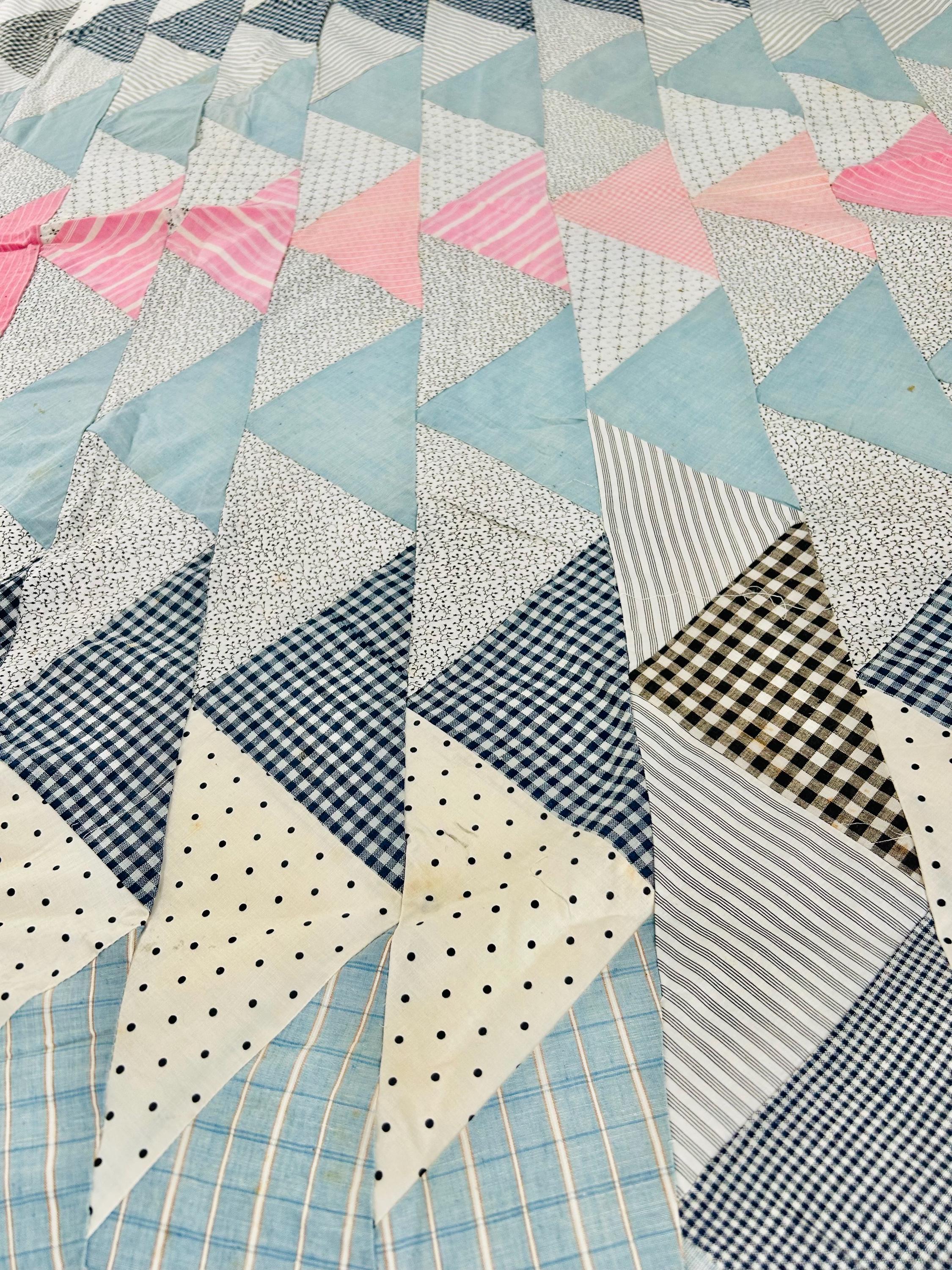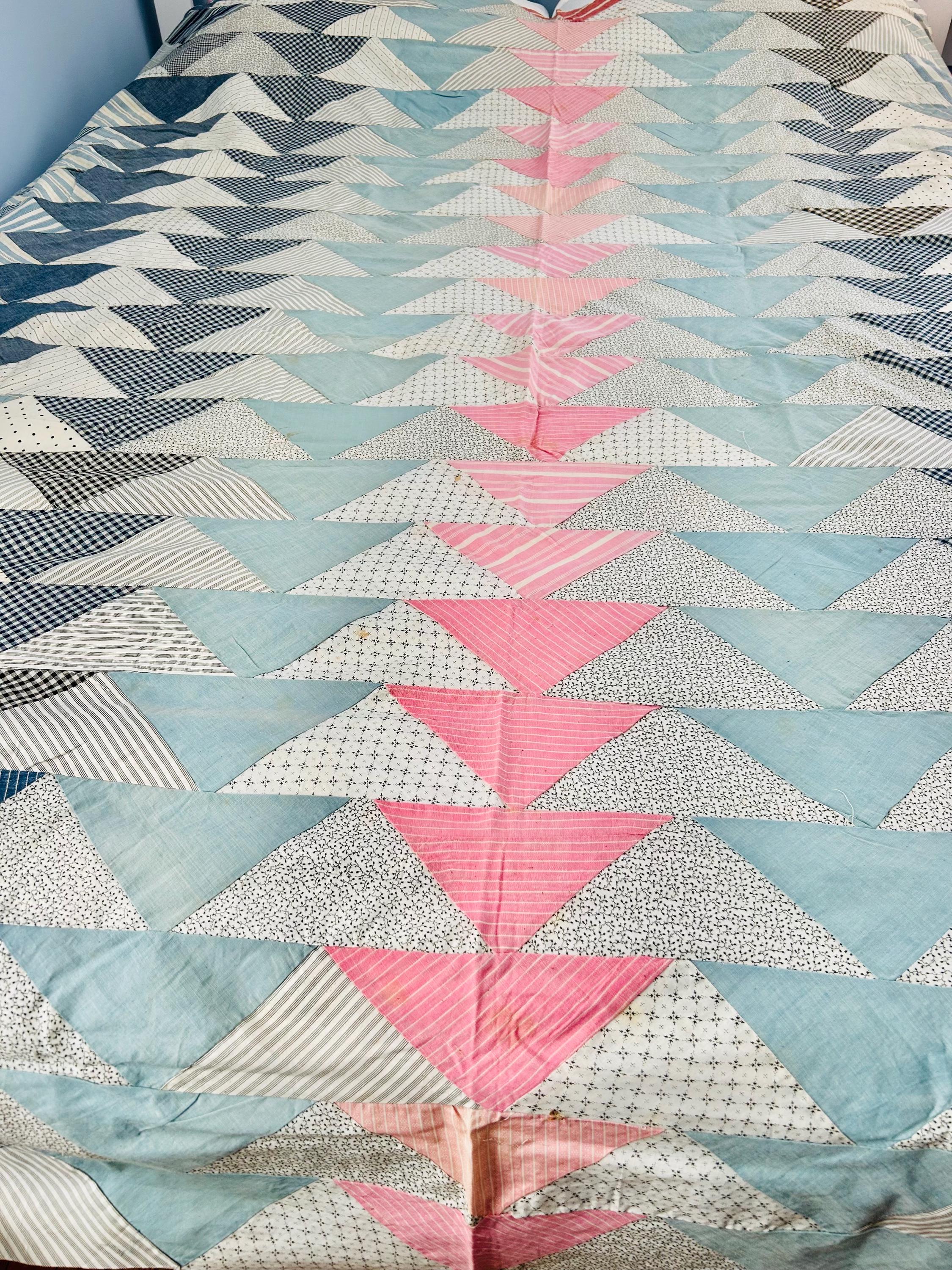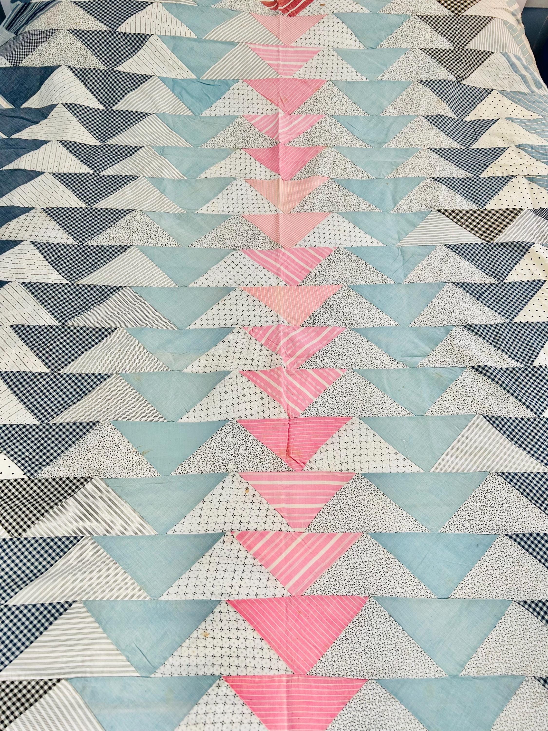 Details • Pattern: Wild Goose Chase / Flying Geese variation • Era: circa 1935–1945 (Depression era) • Size: approximately 67” x 82” • Construction: hand pieced cotton fabrics • Fabrics: feedsack-era calicos, ginghams, stripes, dots, and chambray blues• Colors: pale blue, soft pink, cream, black, and navy prints• Layout: diagonal flying geese rows with a pink center column• Condition: unfinished quilt top only