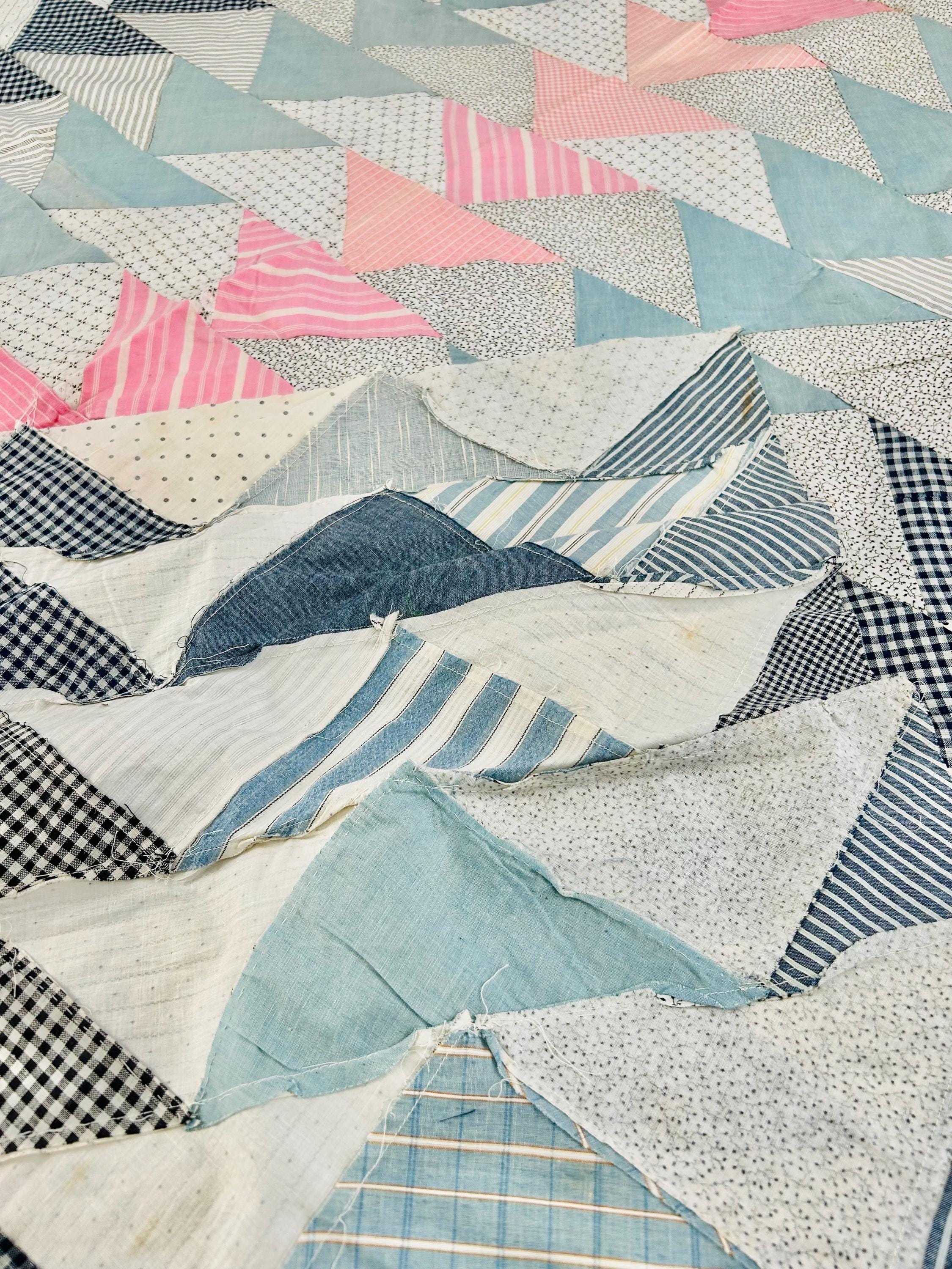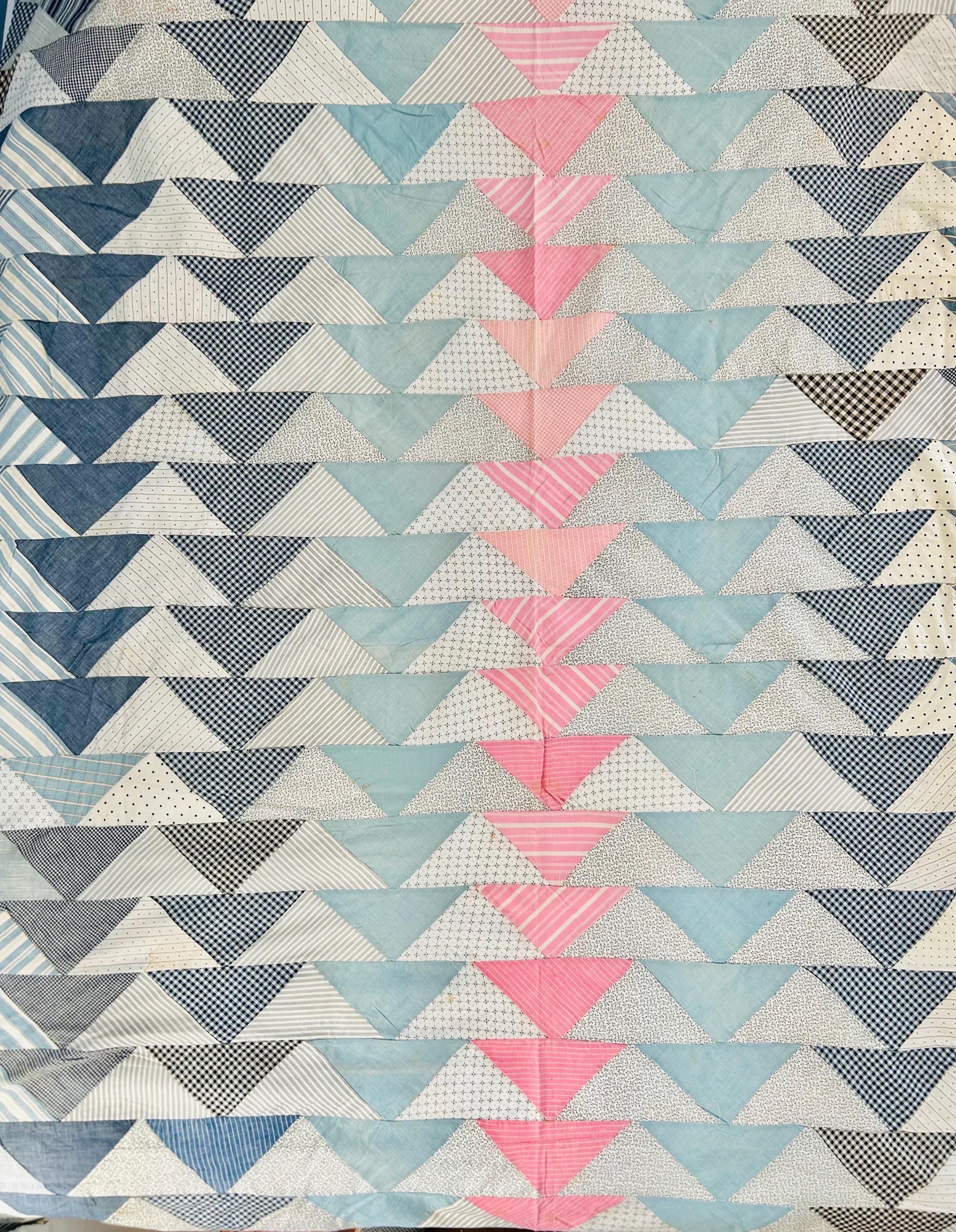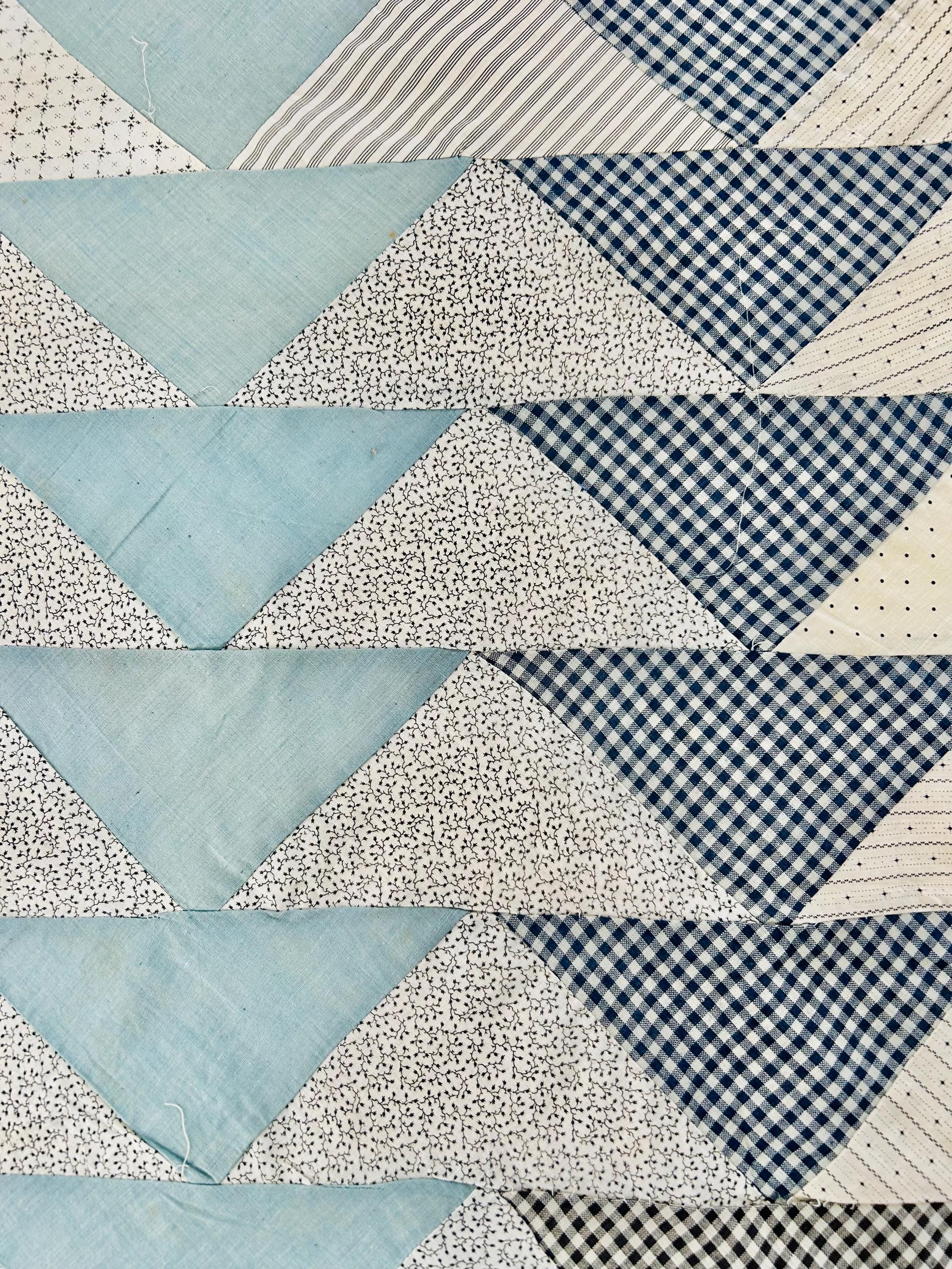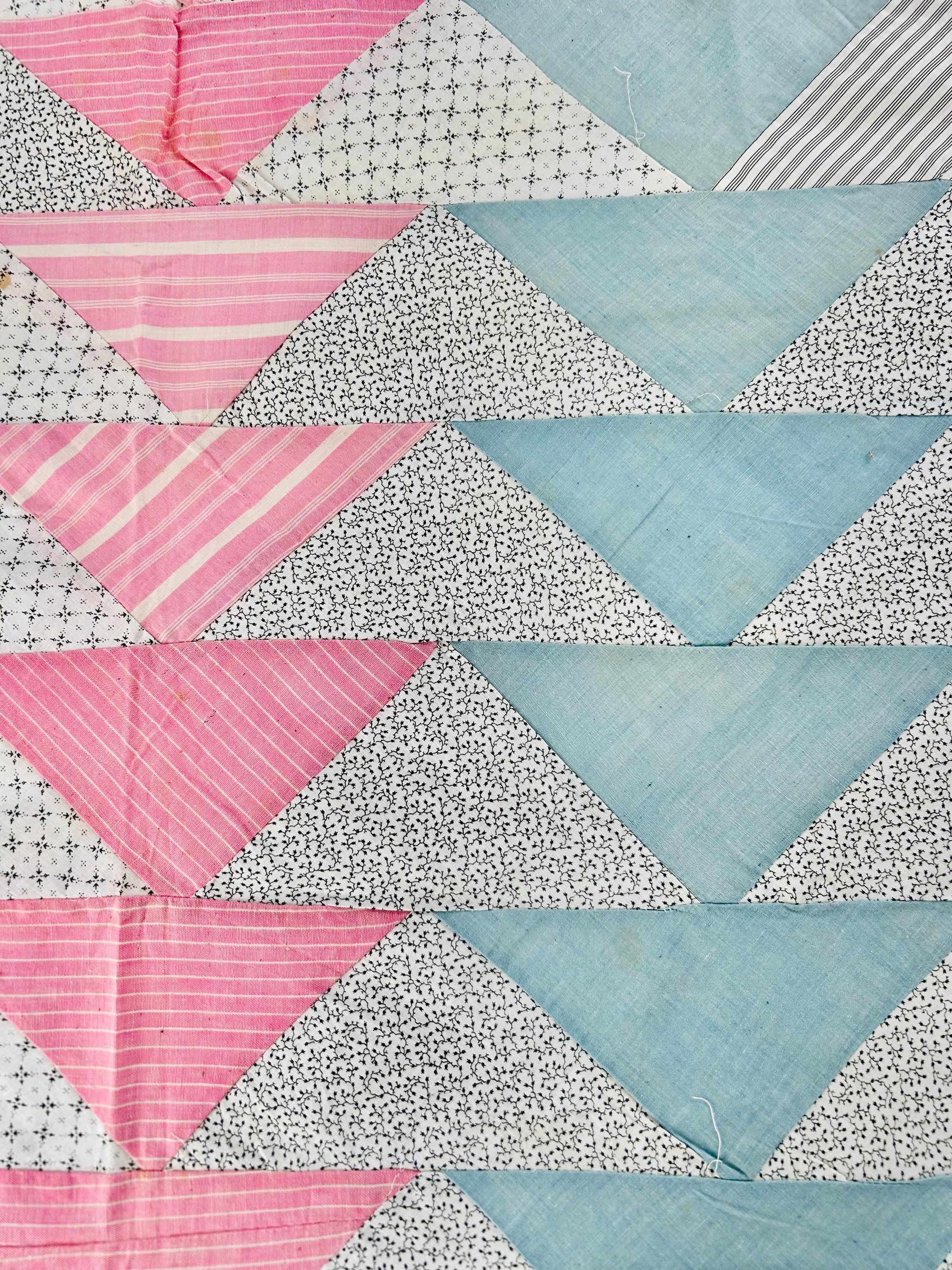 This beautiful Wild Goose Chase quilt top dates to the Depression era, circa 1935–1945, and features a classic arrangement of flying geese triangles pieced from a wonderful assortment of fabrics typical of the feedsack era, including tiny calicos, ginghams, stripes, dots, and soft chambray blues. The palette of pale blue, soft pink, and neutral prints is especially characteristic of quilts made during the 1930s and early 1940s.