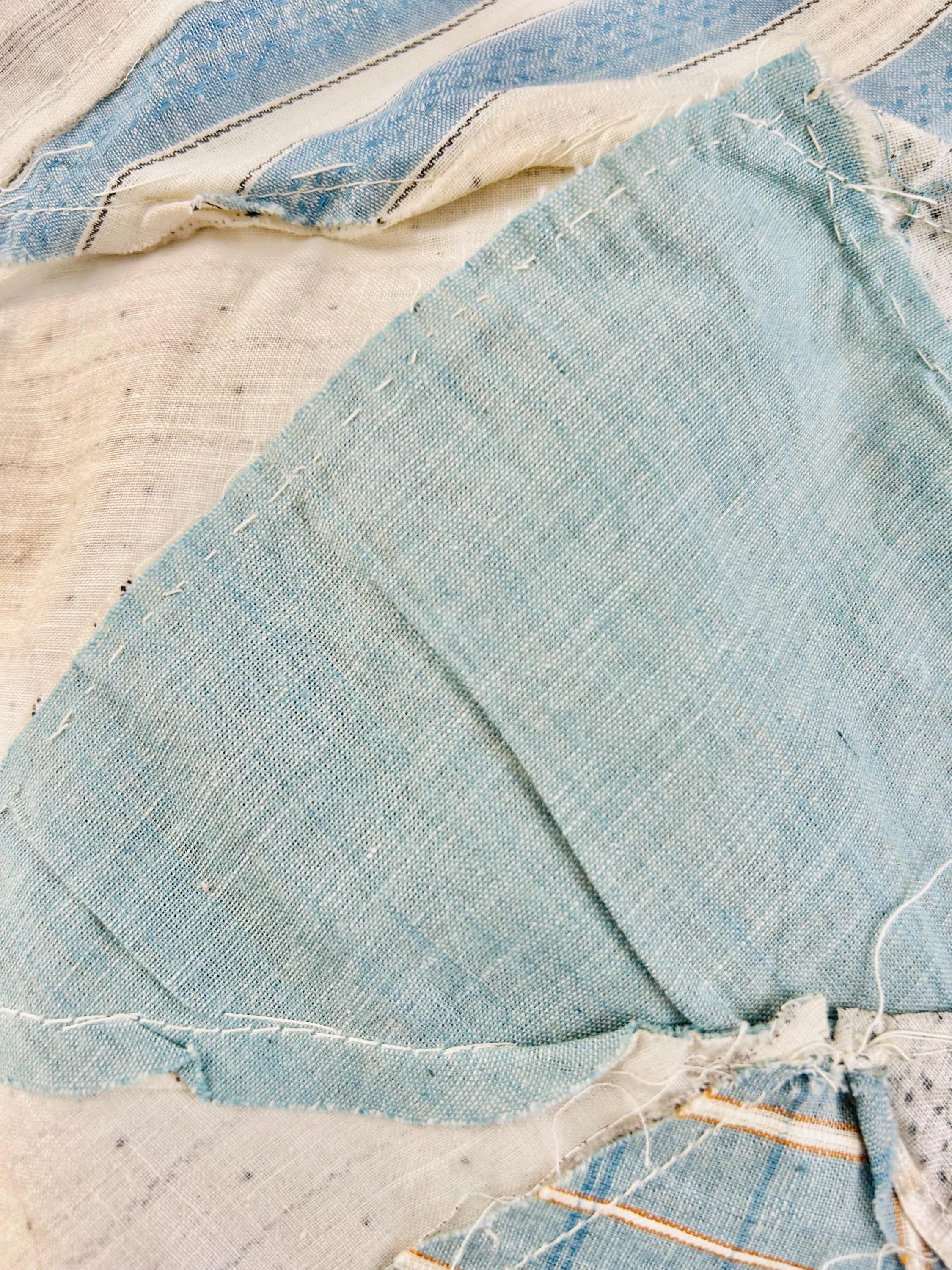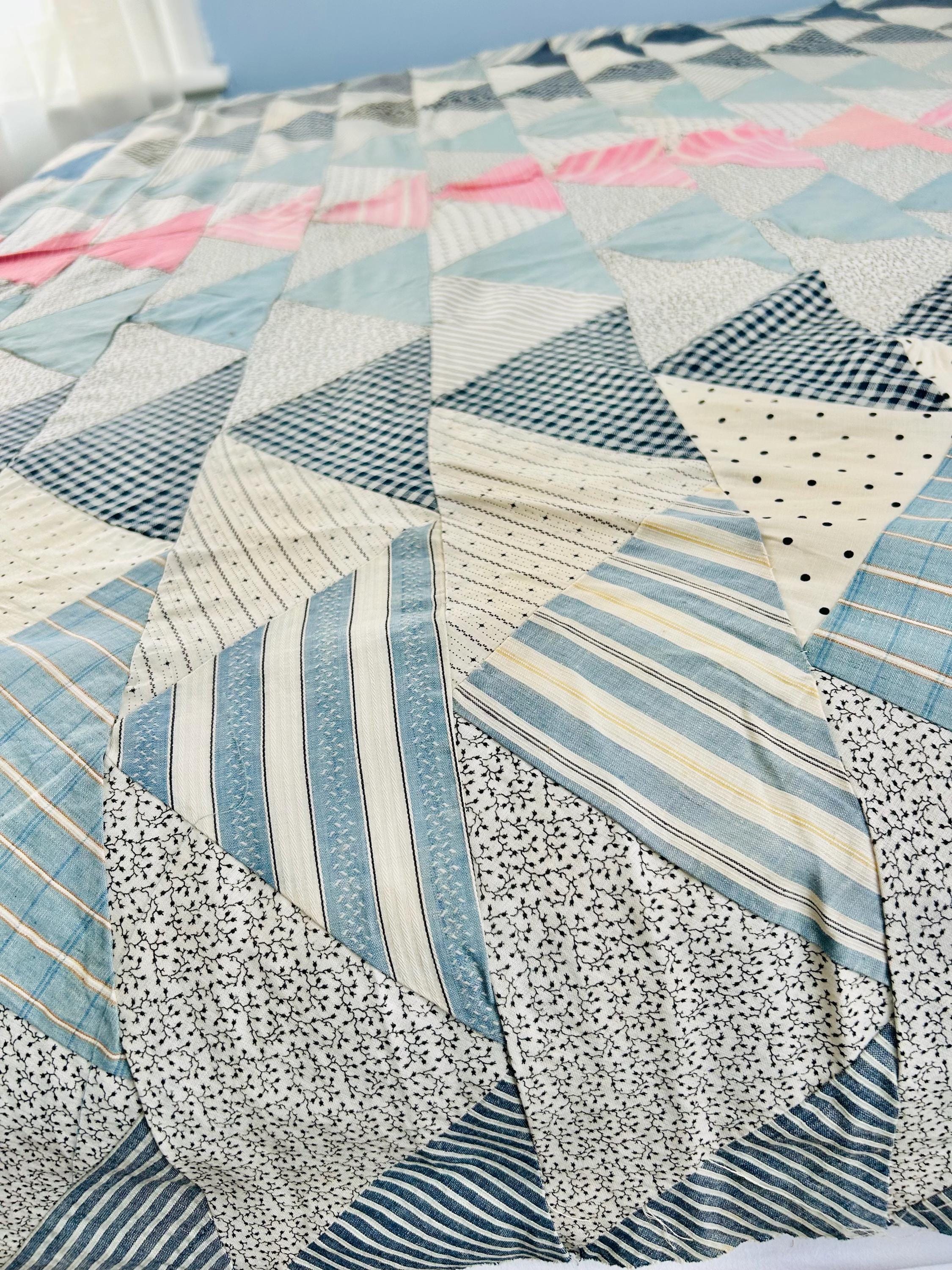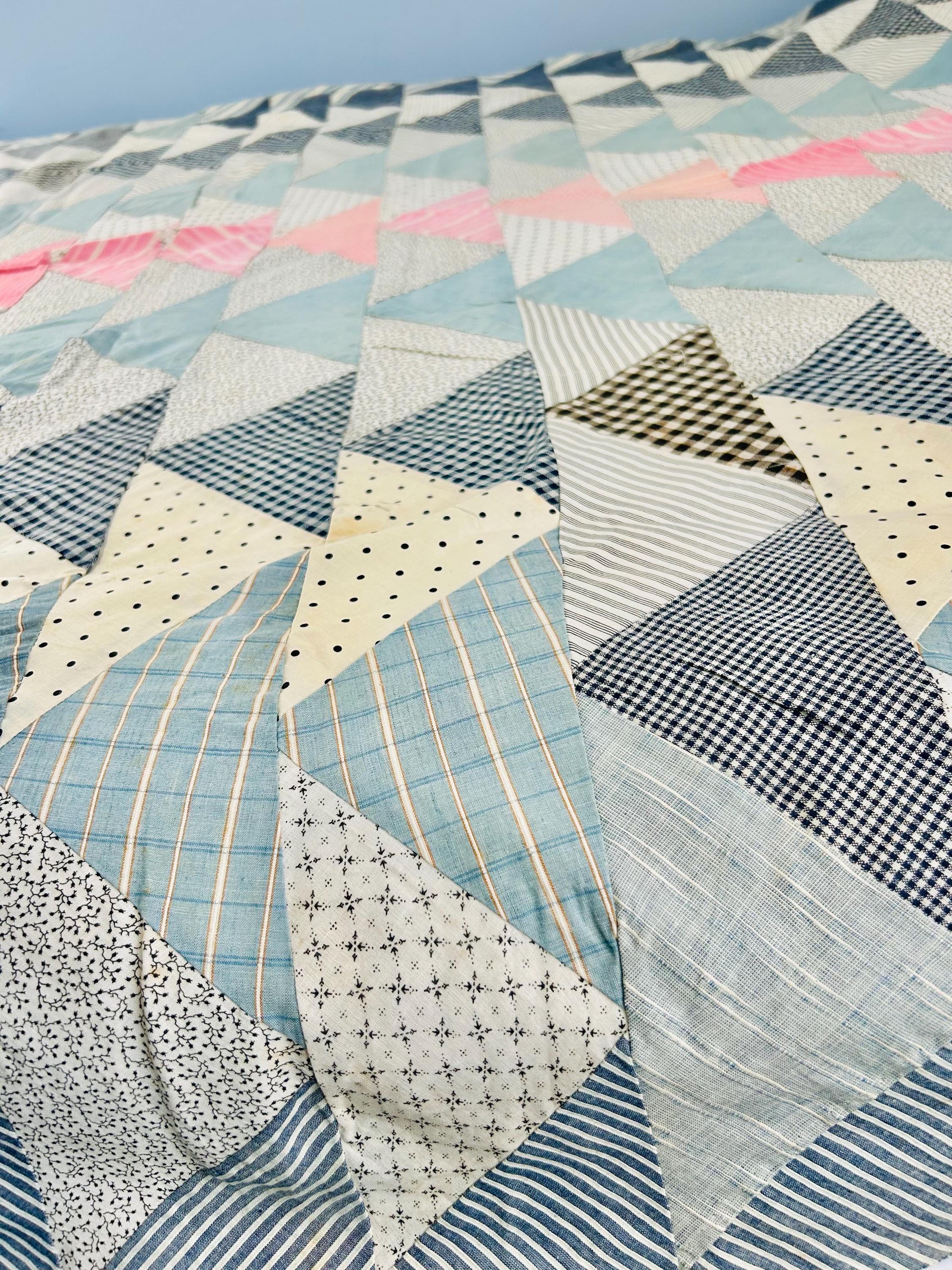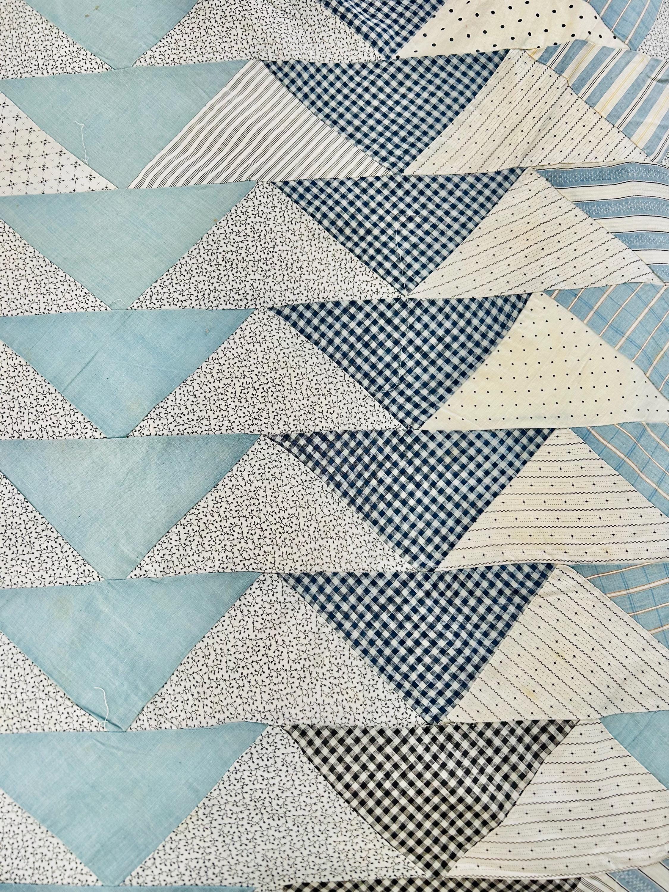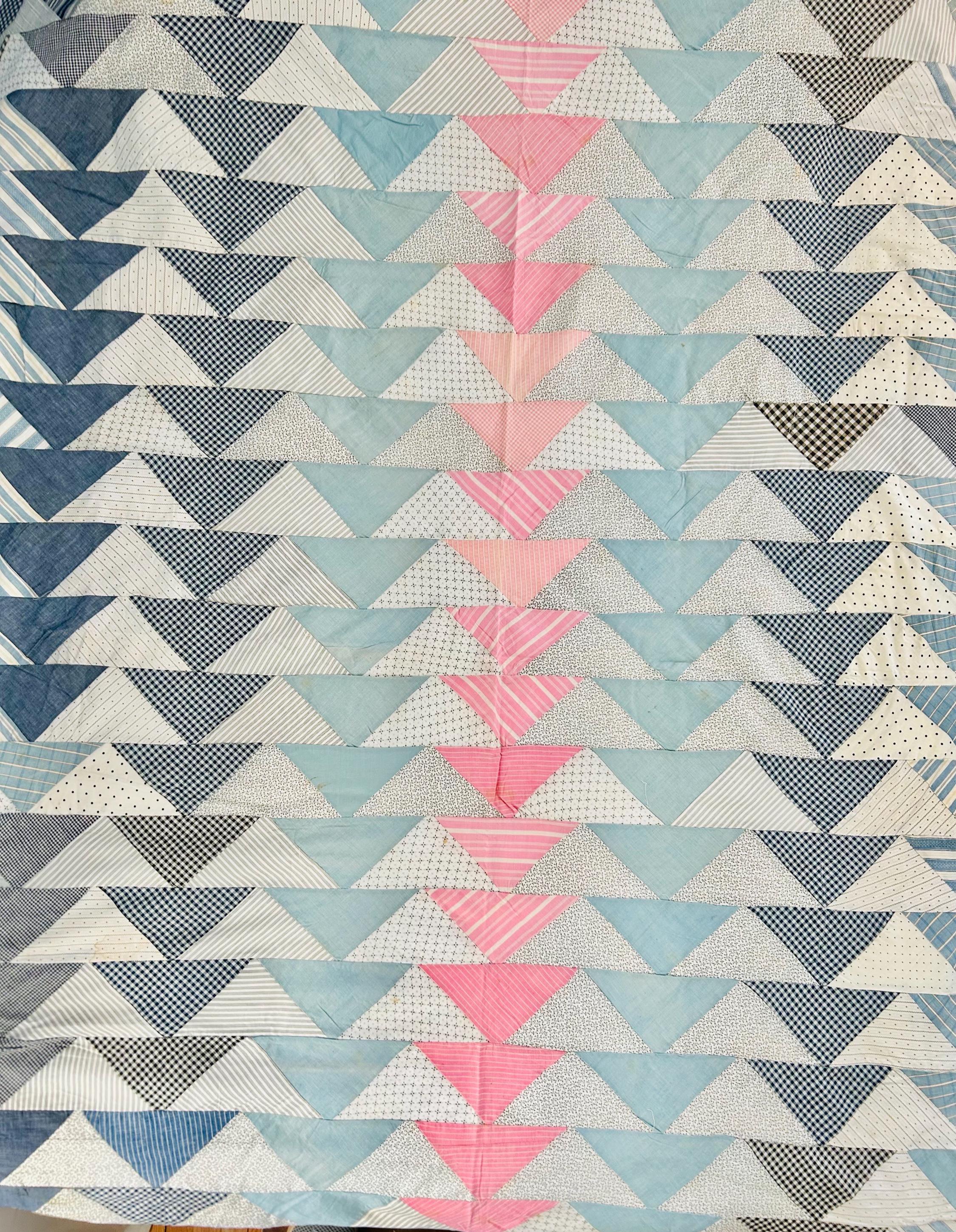 This beautiful Wild Goose Chase quilt top dates to the Depression era, circa 1935–1945, and features a classic arrangement of flying geese triangles pieced from a wonderful assortment of fabrics typical of the feedsack era, including tiny calicos, ginghams, stripes, dots, and soft chambray blues. The palette of pale blue, soft pink, and neutral prints is especially characteristic of quilts made during the 1930s and early 1940s.