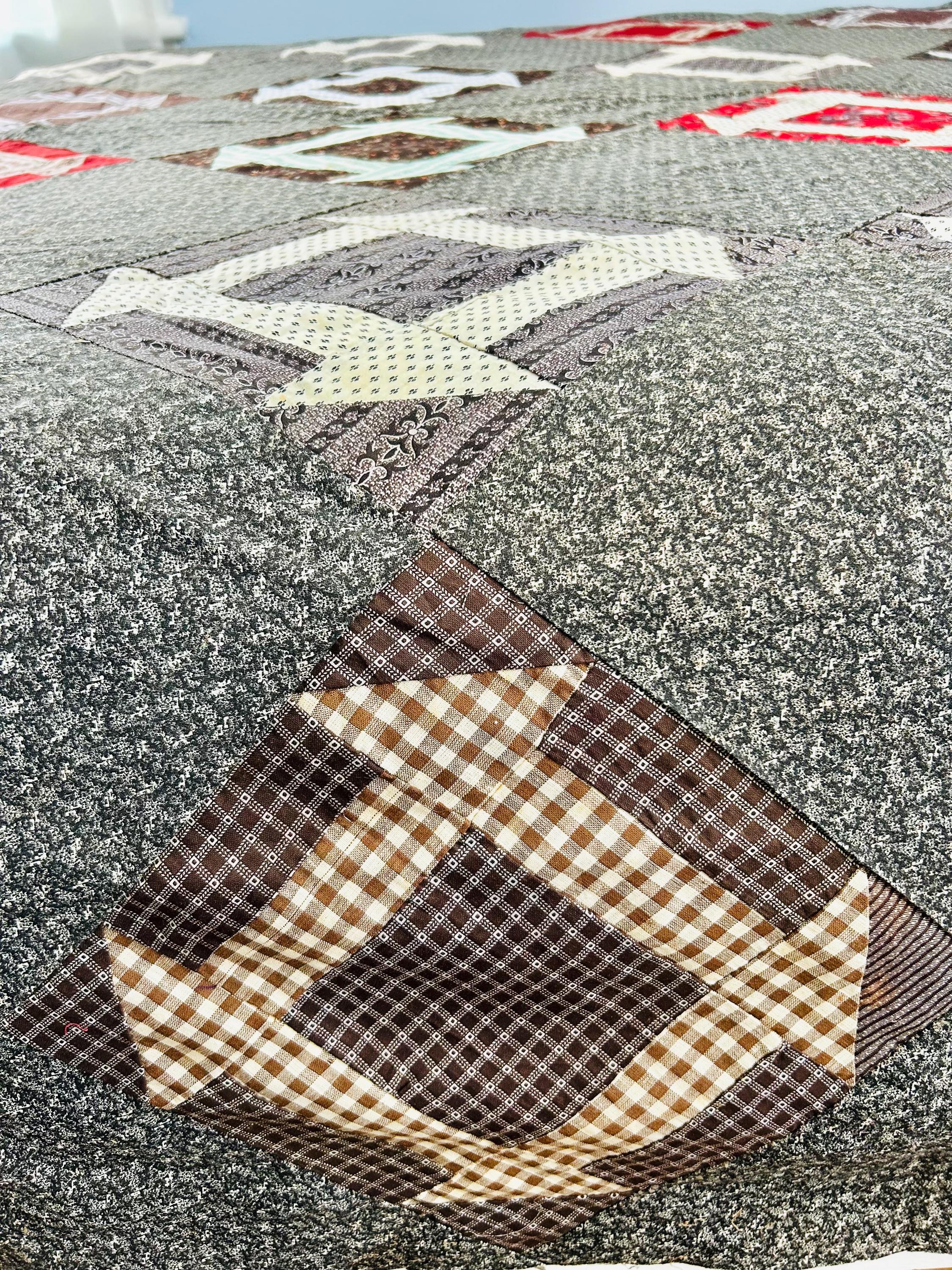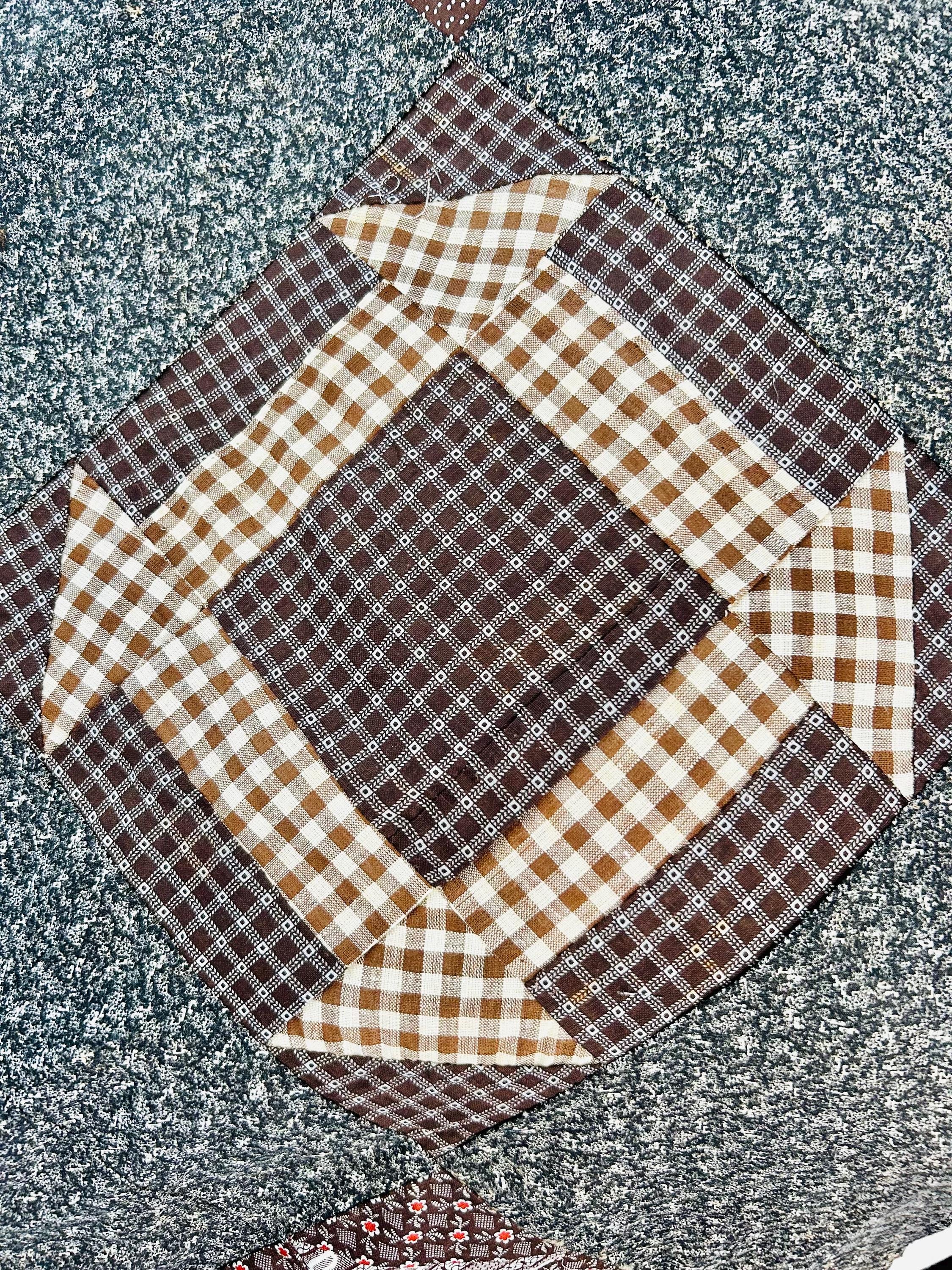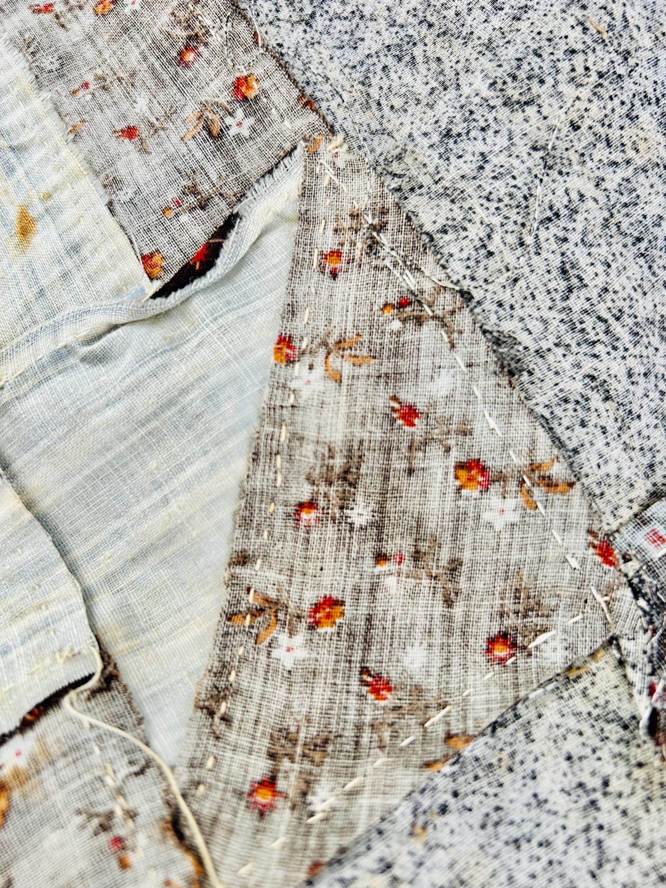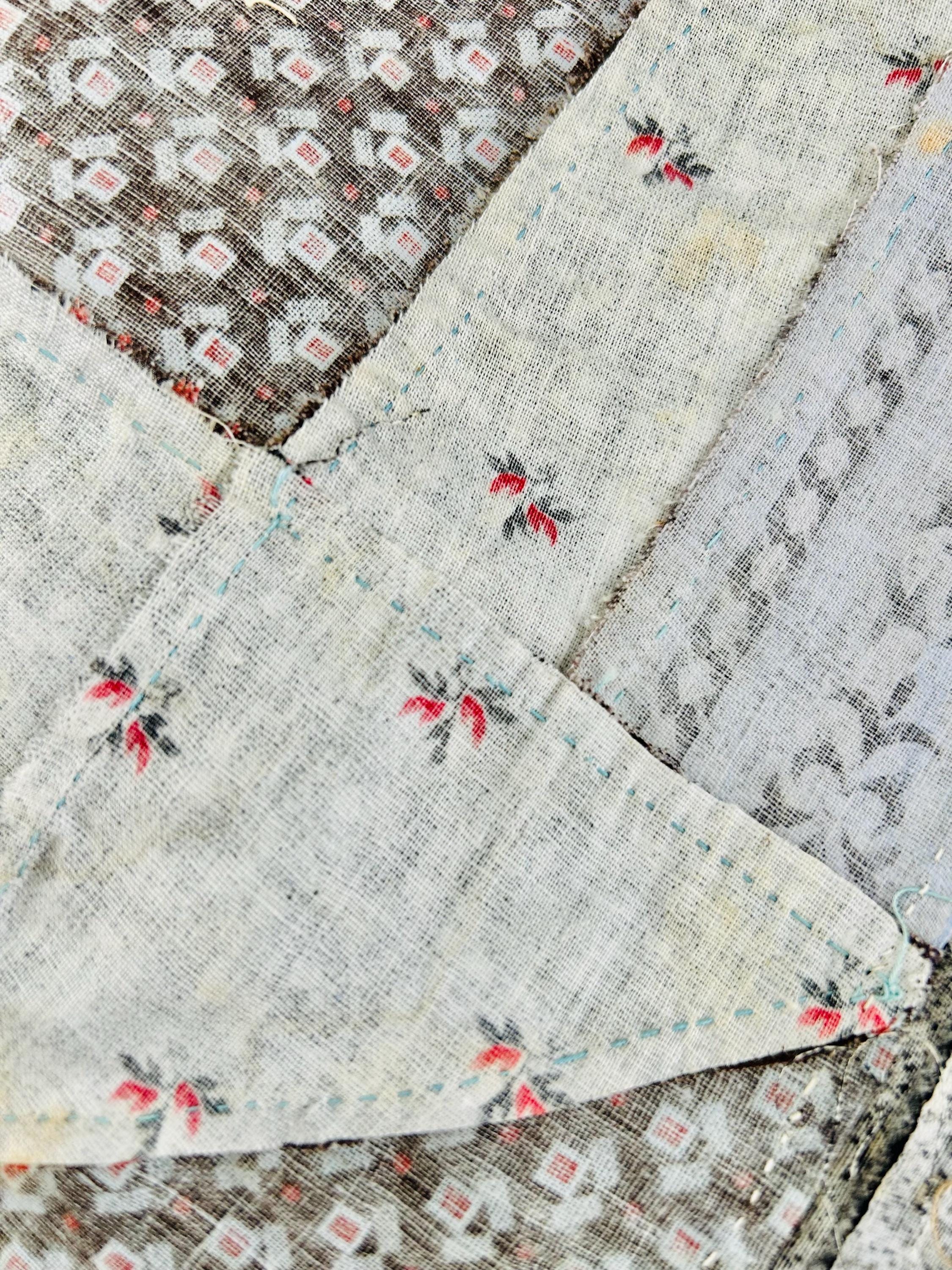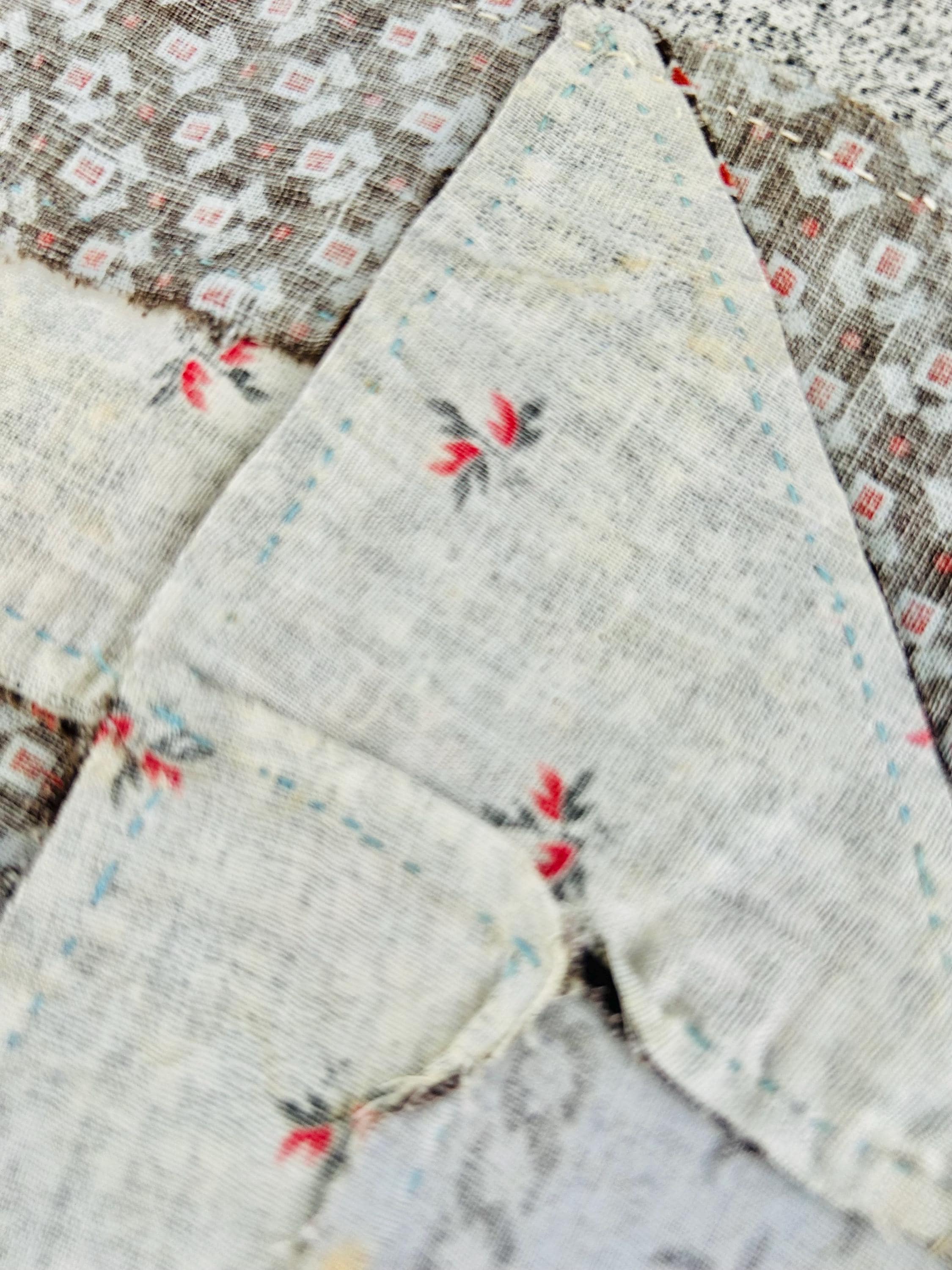 Details: • Age: Circa 1880–1910 • Size: 85 inches x 85 inches • Material: 100% Antique Cotton Calico & Percale • Construction: Hand-pieced (visible stitching on reverse)