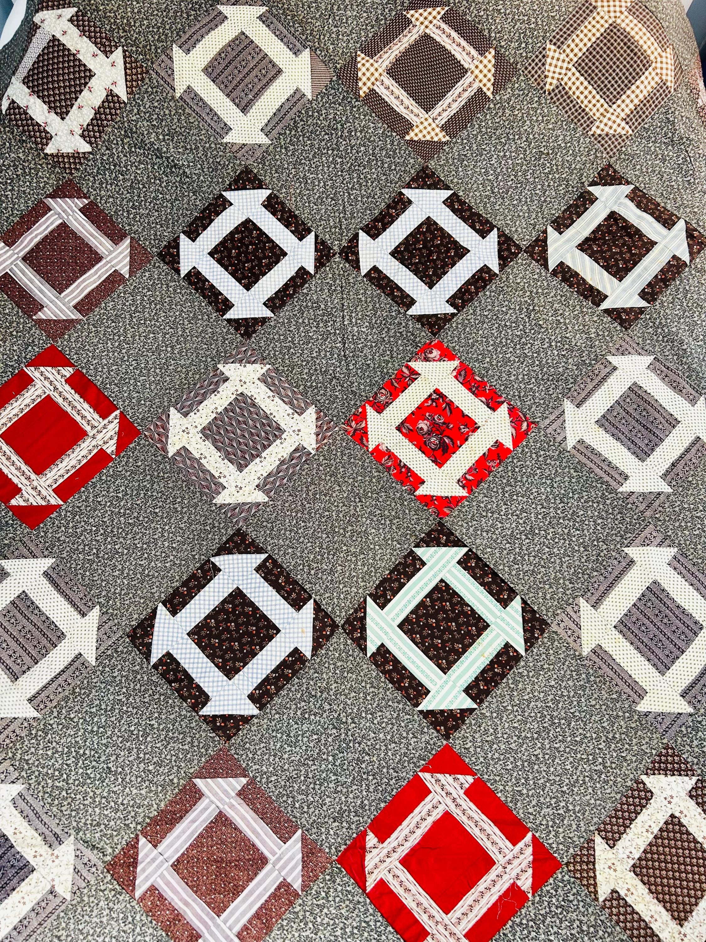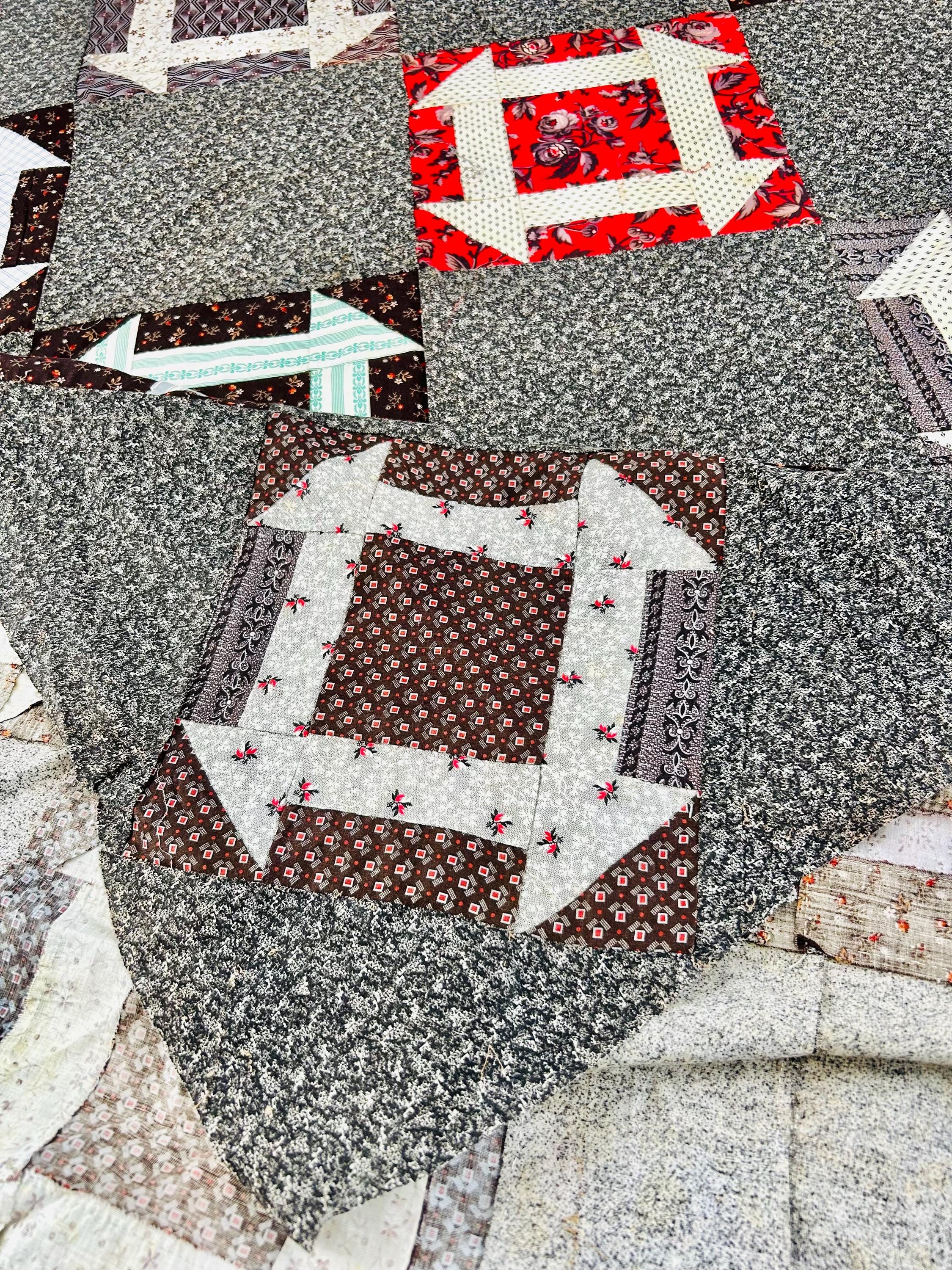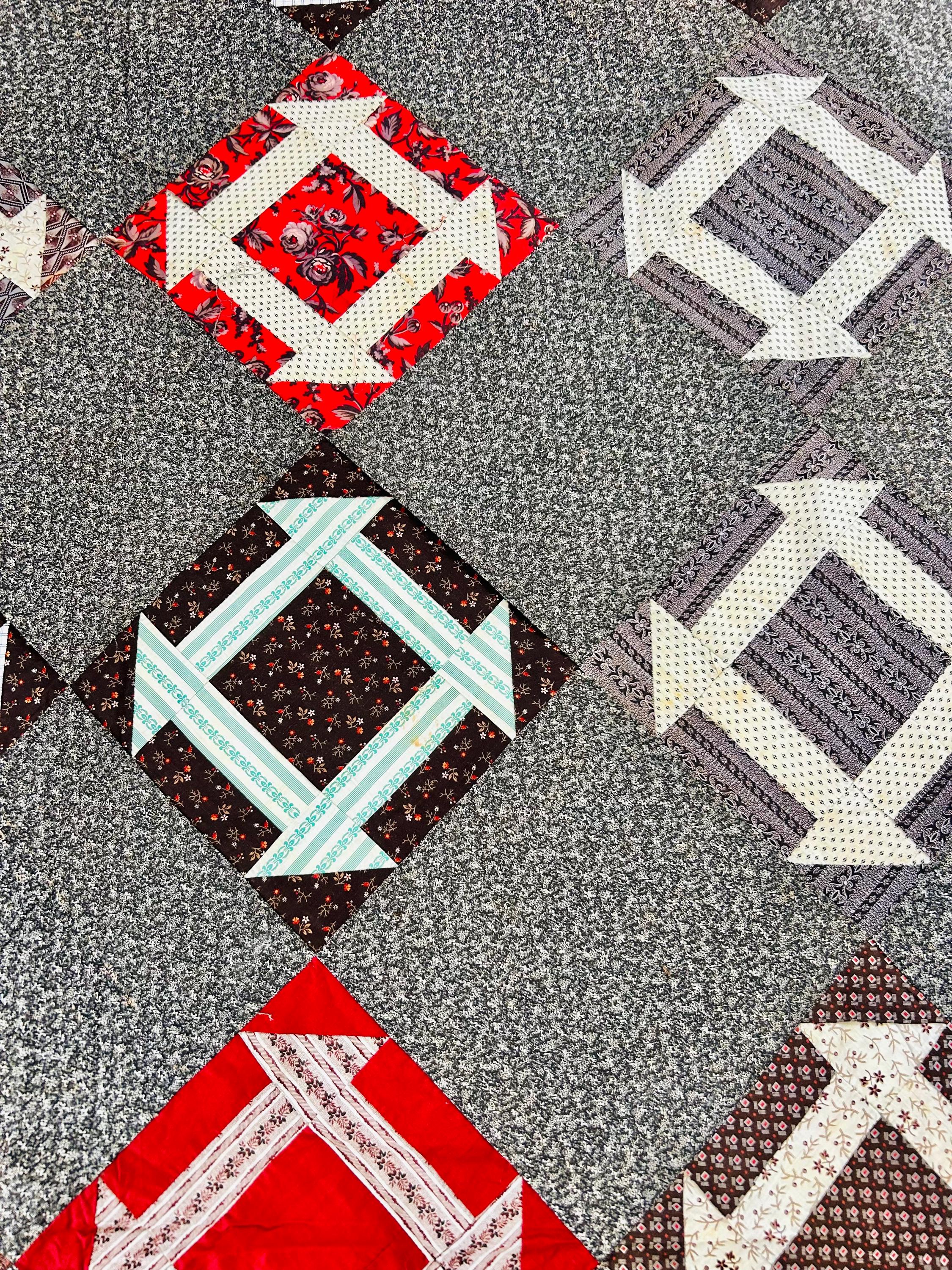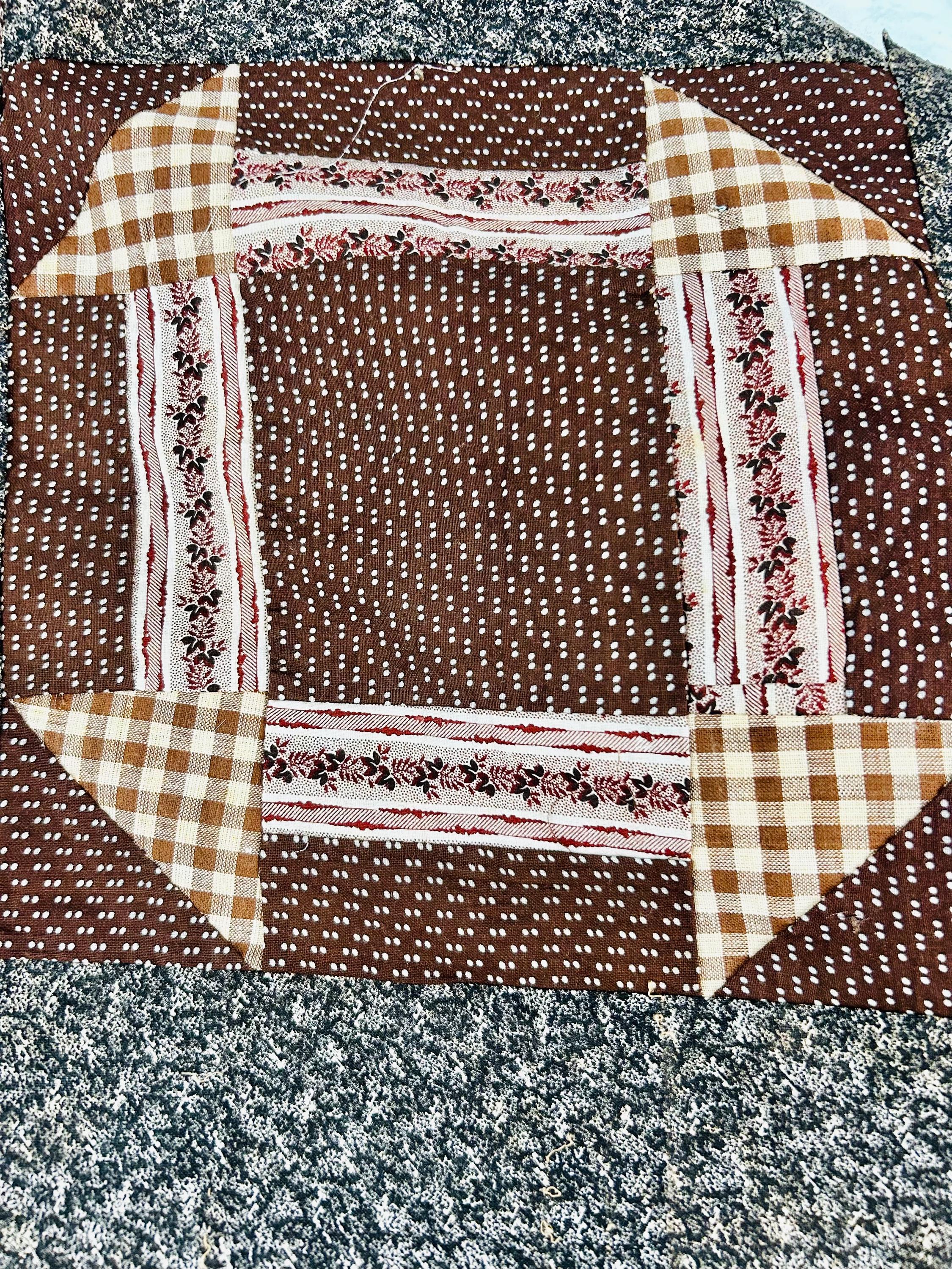This is a stunning, hand-pieced Victorian-era Churn Dash Quilt Top, hand-sewn over 120 years ago but never layered, batted, or quilted, leaving the hand-stitching of the original maker visible on the reverse. The top includes a collection of authentic period "scraps," including: • Vibrant Turkey Reds: Deep, colorfast floral prints that have remained remarkably bright for over a century. • Classic Mourning Prints: A beautiful array of black, grey, and deep purple calicos—staples of the 1880s and 1890s. • Victorian "Double Pinks" & Cadet Blues: Charming small-scale geometric and floral shirting prints. • Rich Chocolate & Claret Calicos: Earthy browns and wine-toned fabrics with delicate white "figures" or dots, quintessential to the 1890–1910 era.