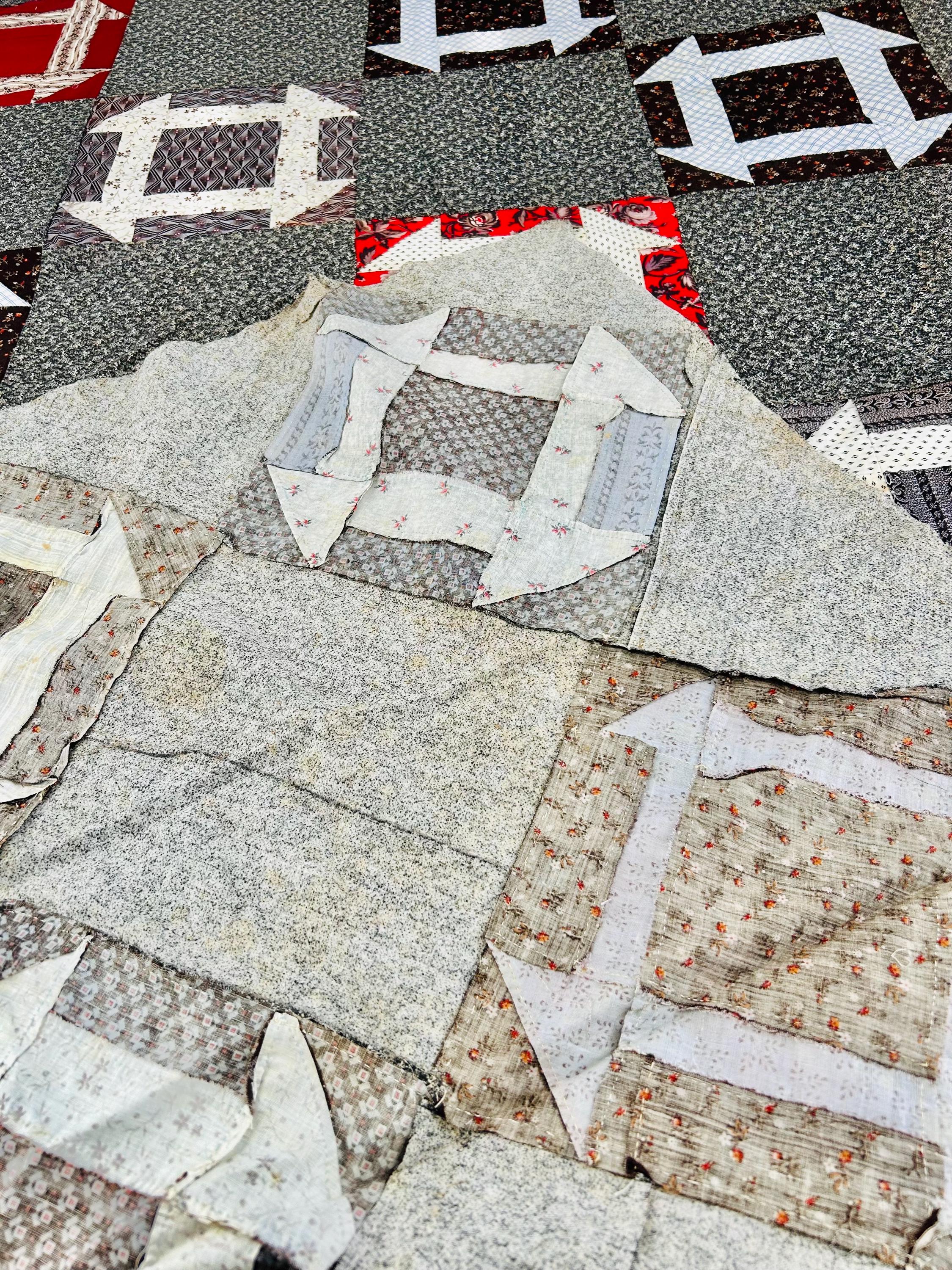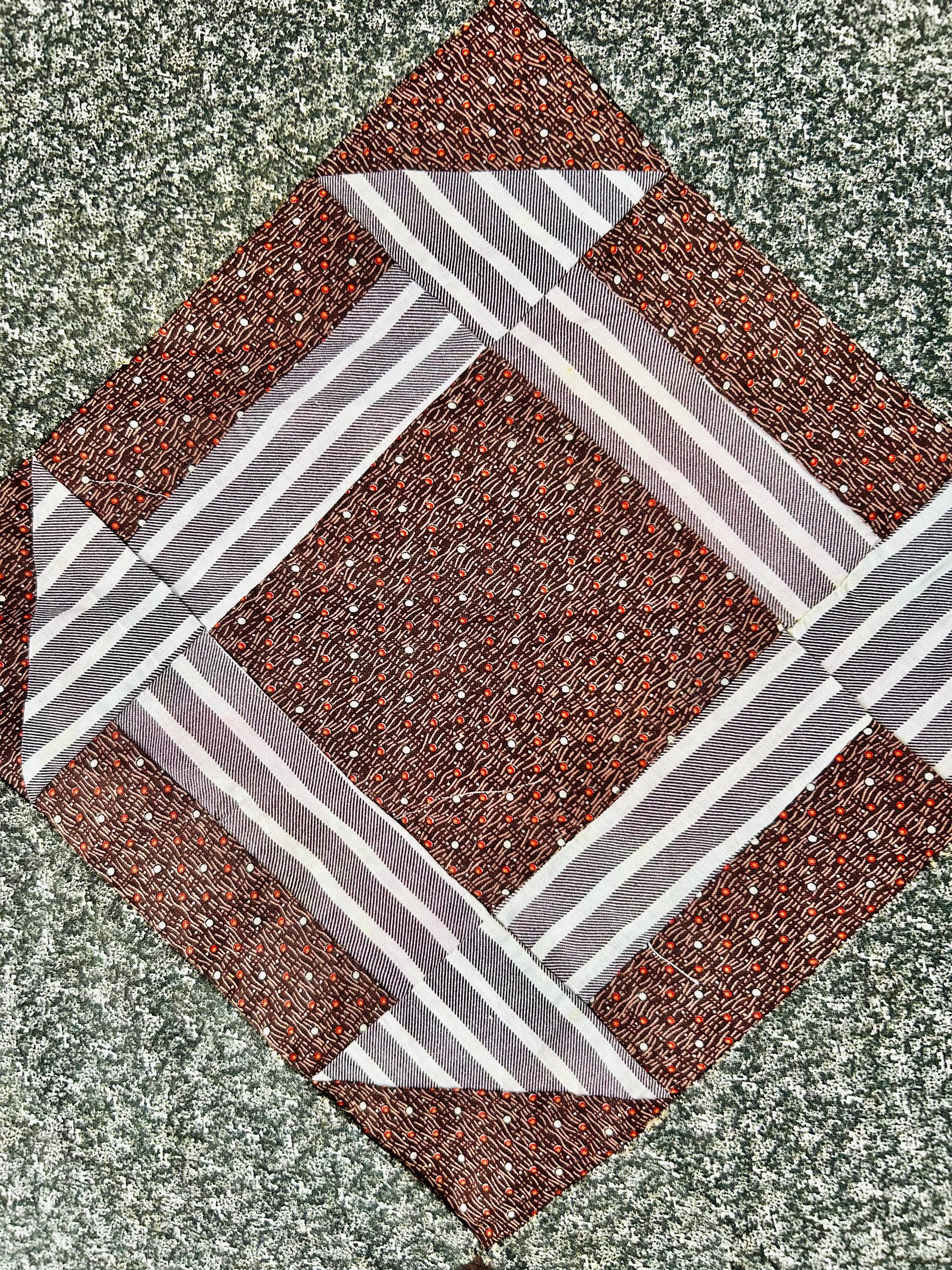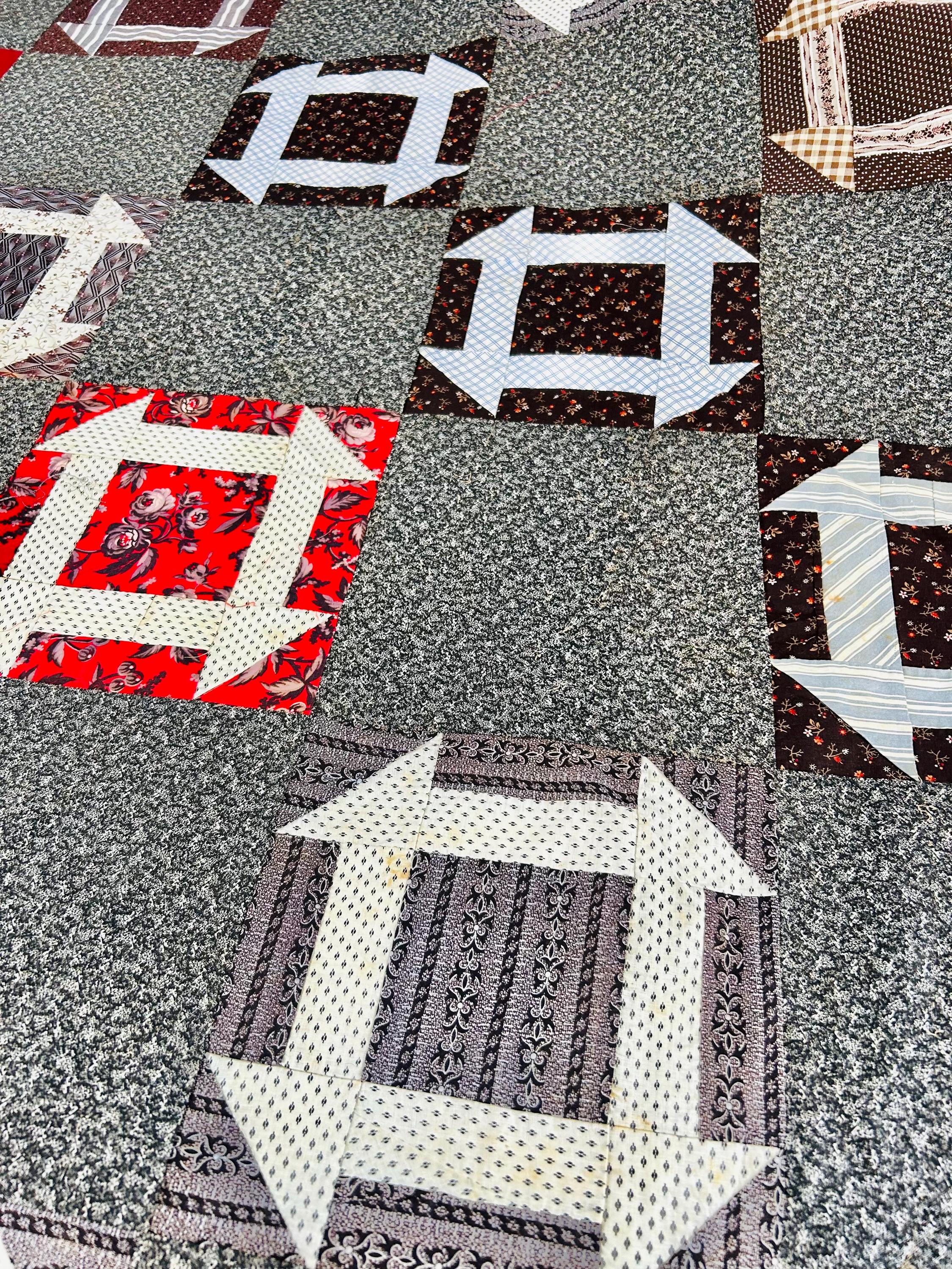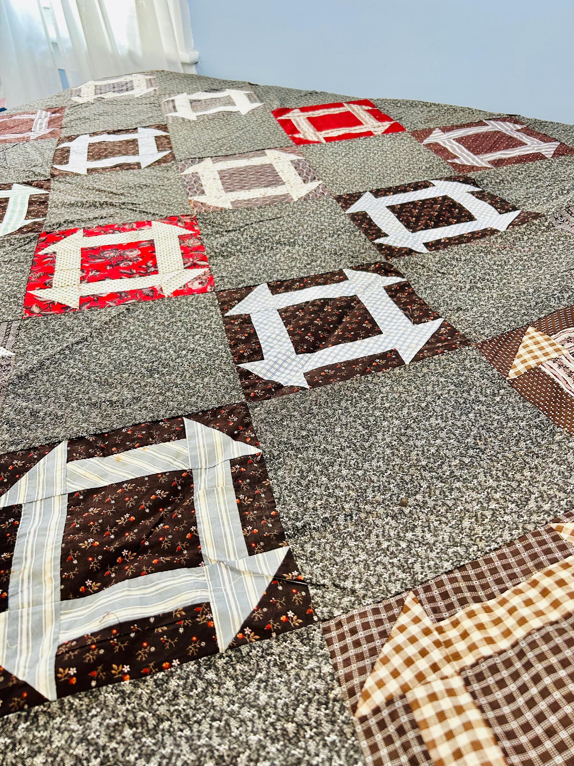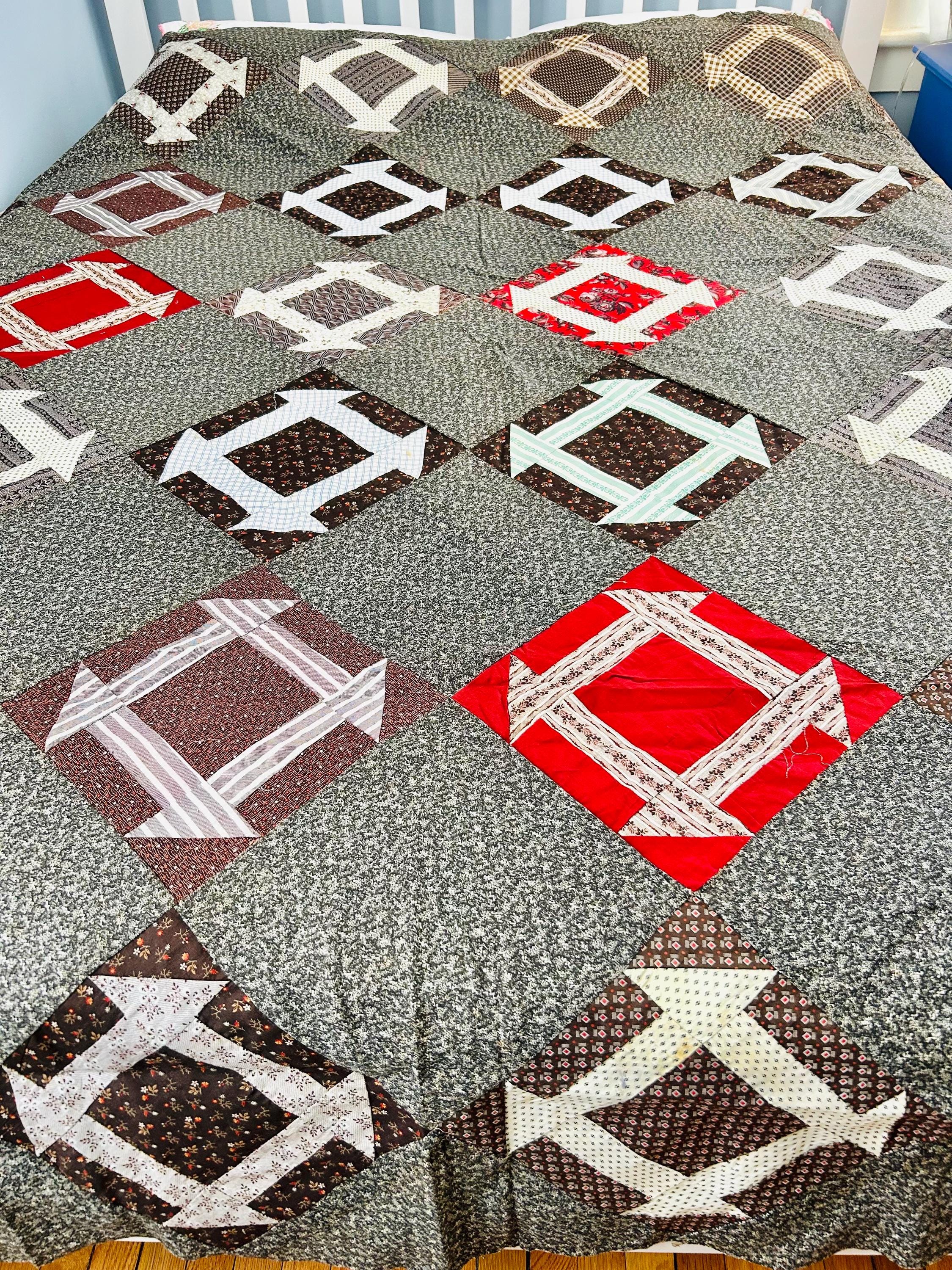 This is a stunning, hand-pieced Victorian-era Churn Dash Quilt Top, hand-sewn over 120 years ago but never layered, batted, or quilted, leaving the hand-stitching of the original maker visible on the reverse. The top includes a collection of authentic period "scraps," including: • Vibrant Turkey Reds: Deep, colorfast floral prints that have remained remarkably bright for over a century. • Classic Mourning Prints: A beautiful array of black, grey, and deep purple calicos—staples of the 1880s and 1890s. • Victorian "Double Pinks" & Cadet Blues: Charming small-scale geometric and floral shirting prints. • Rich Chocolate & Claret Calicos: Earthy browns and wine-toned fabrics with delicate white "figures" or dots, quintessential to the 1890–1910 era.
