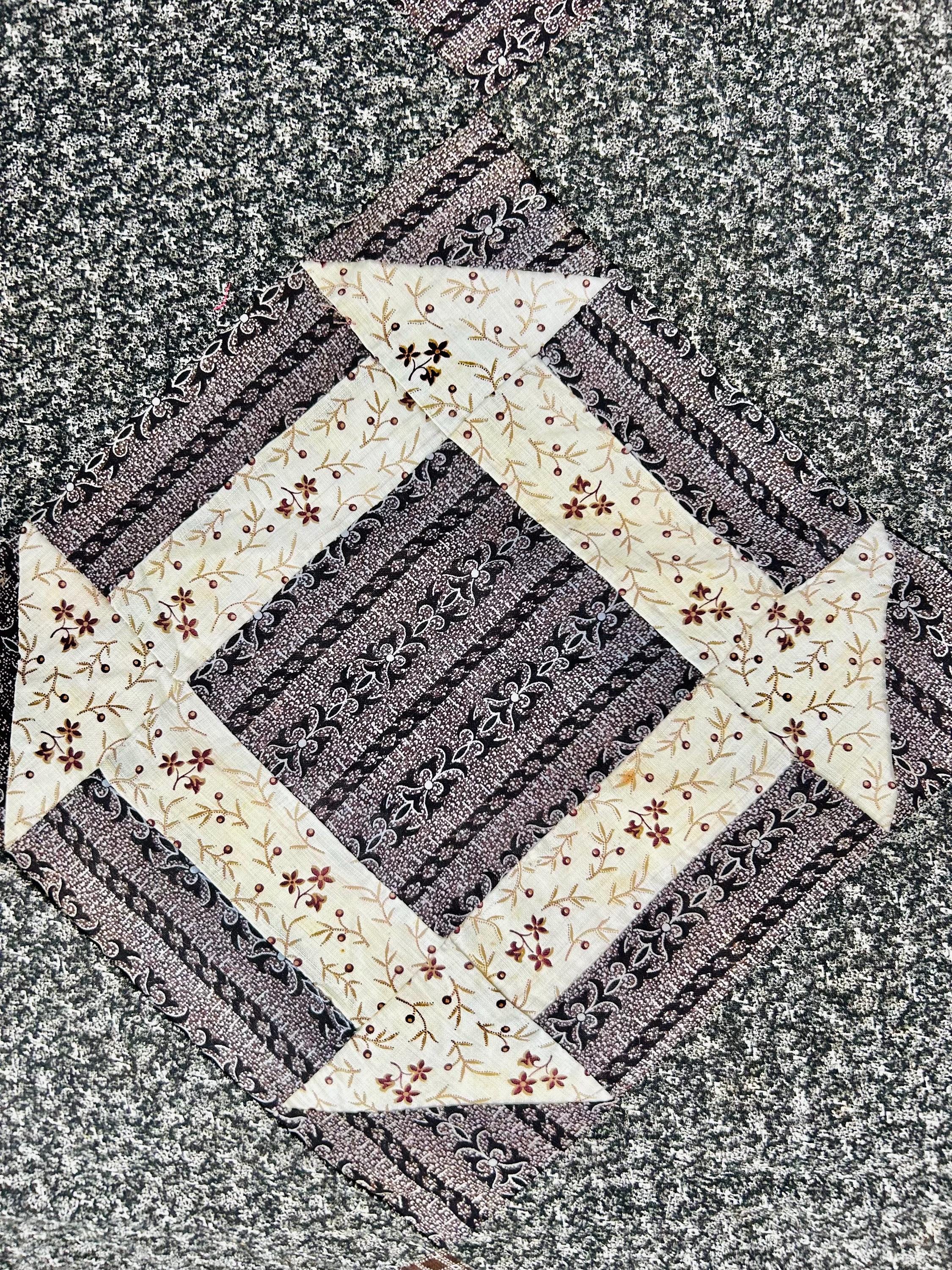 The Churn Dash pattern is also known as Monkey Wrench or Hole in the Barn Door, and each block is framed by a beautiful antique charcoal-and-white sprig print background.