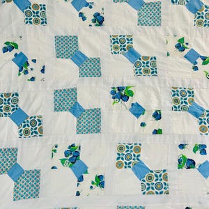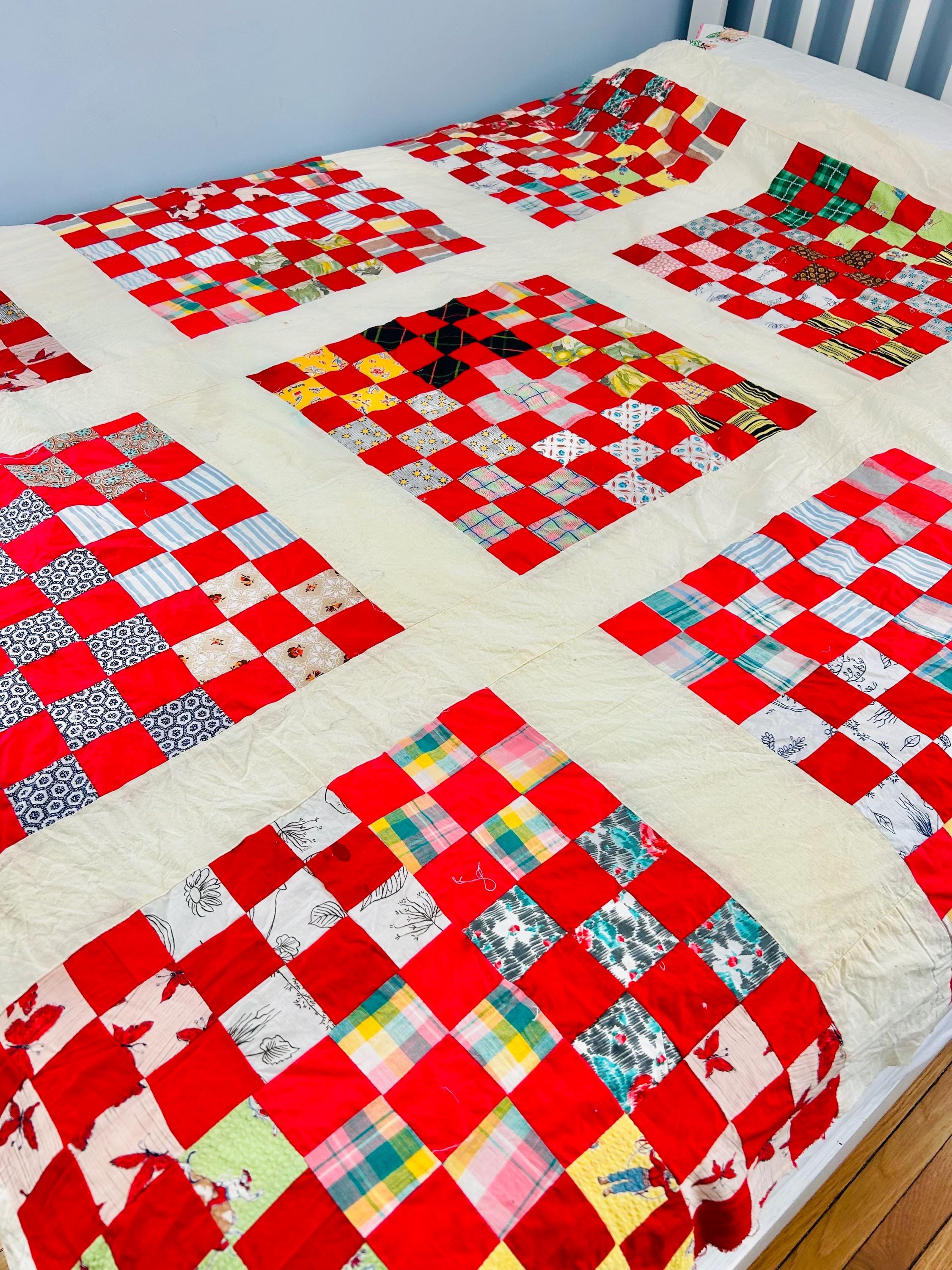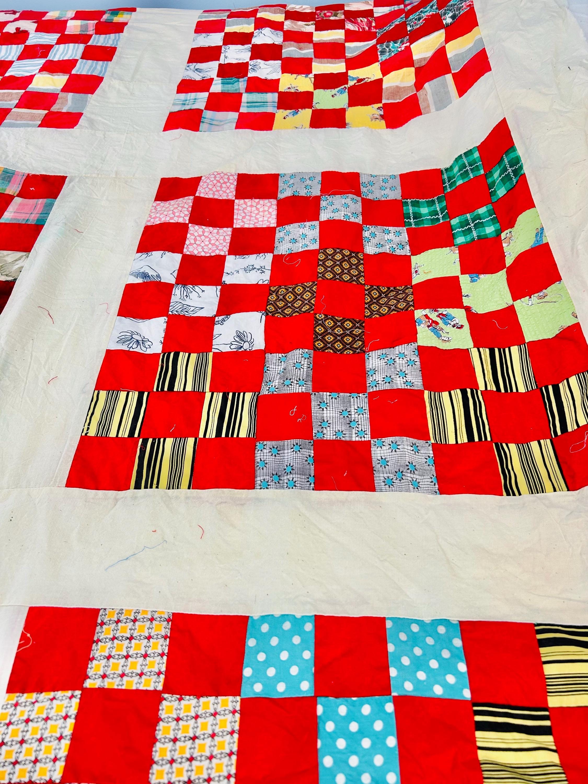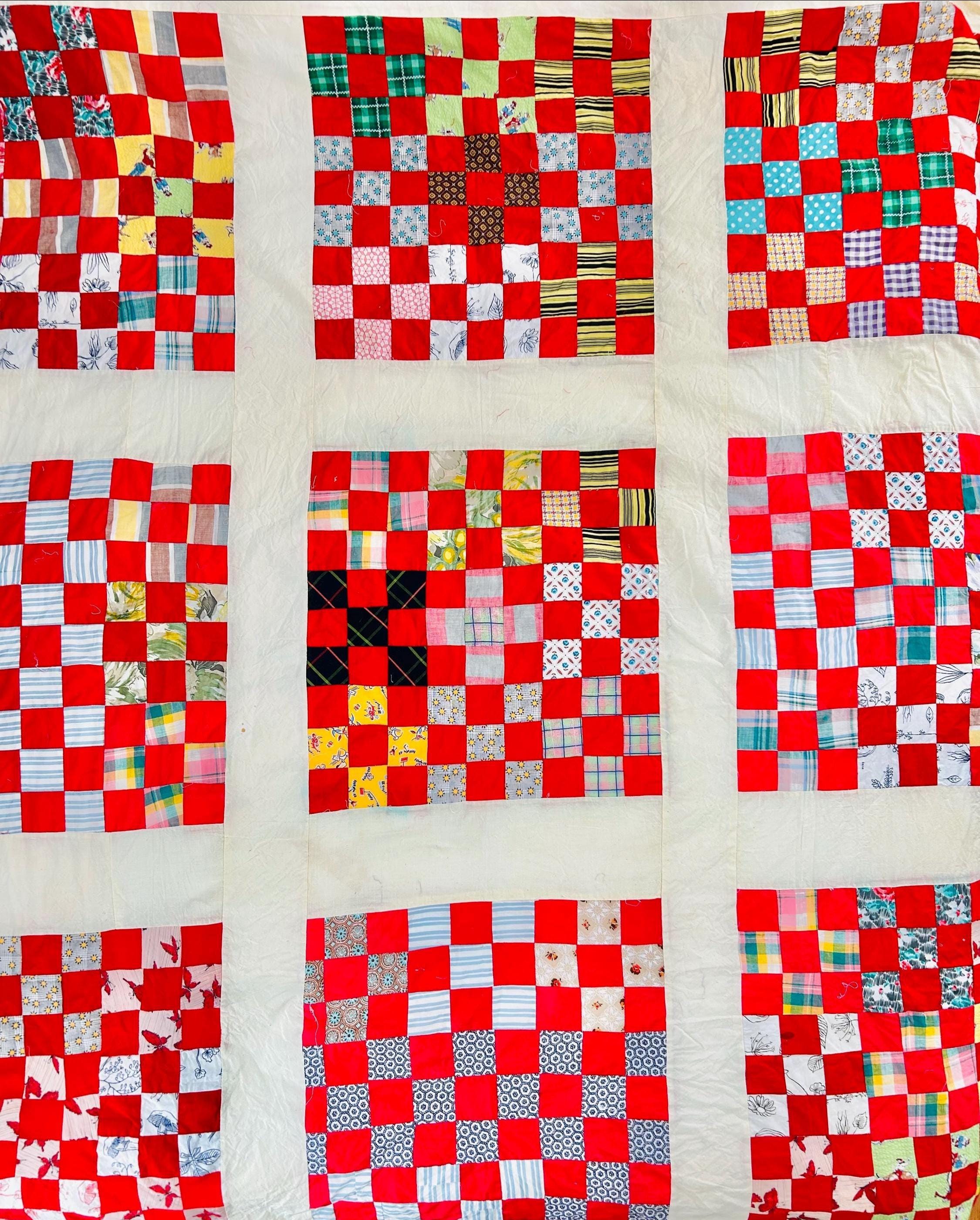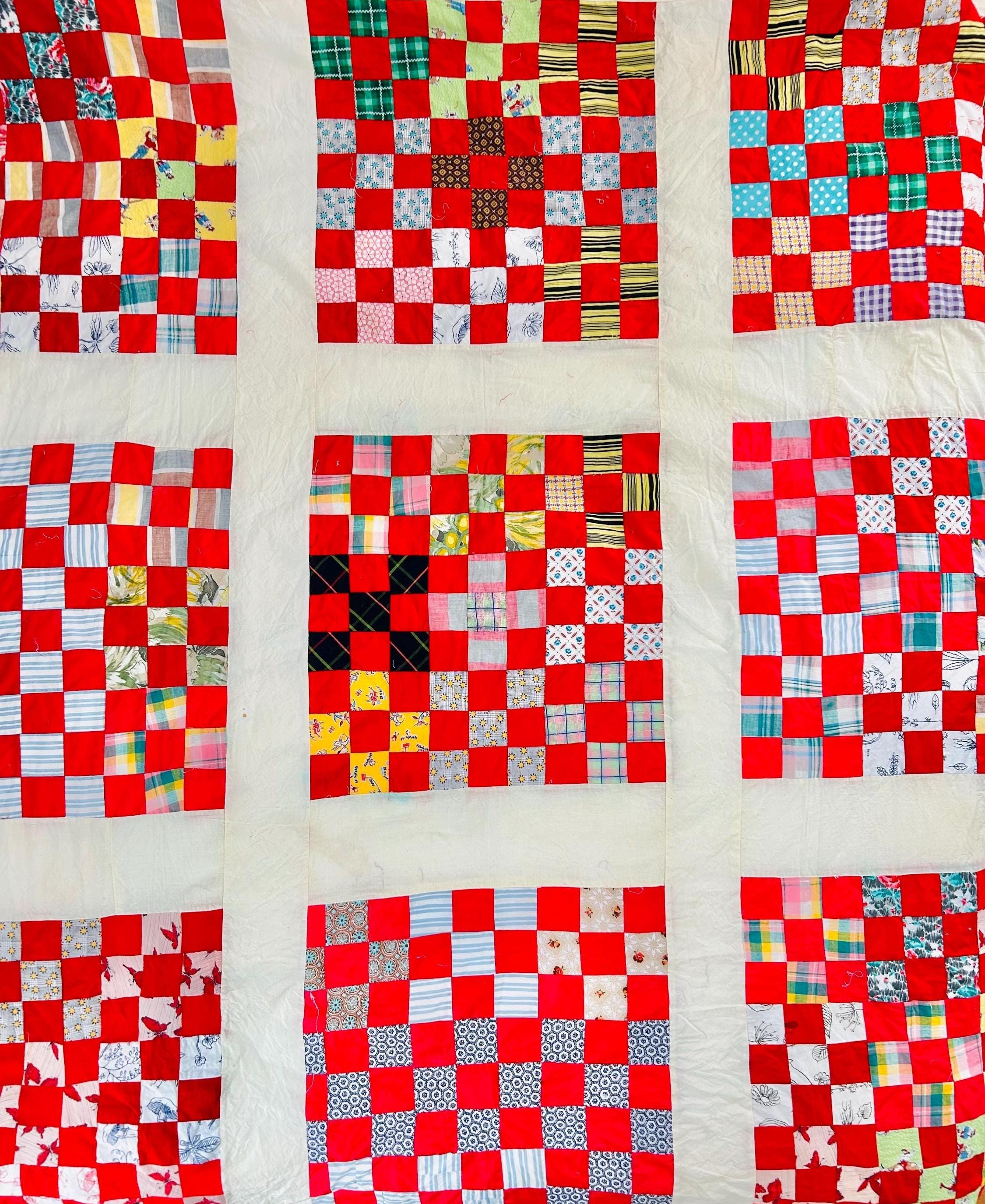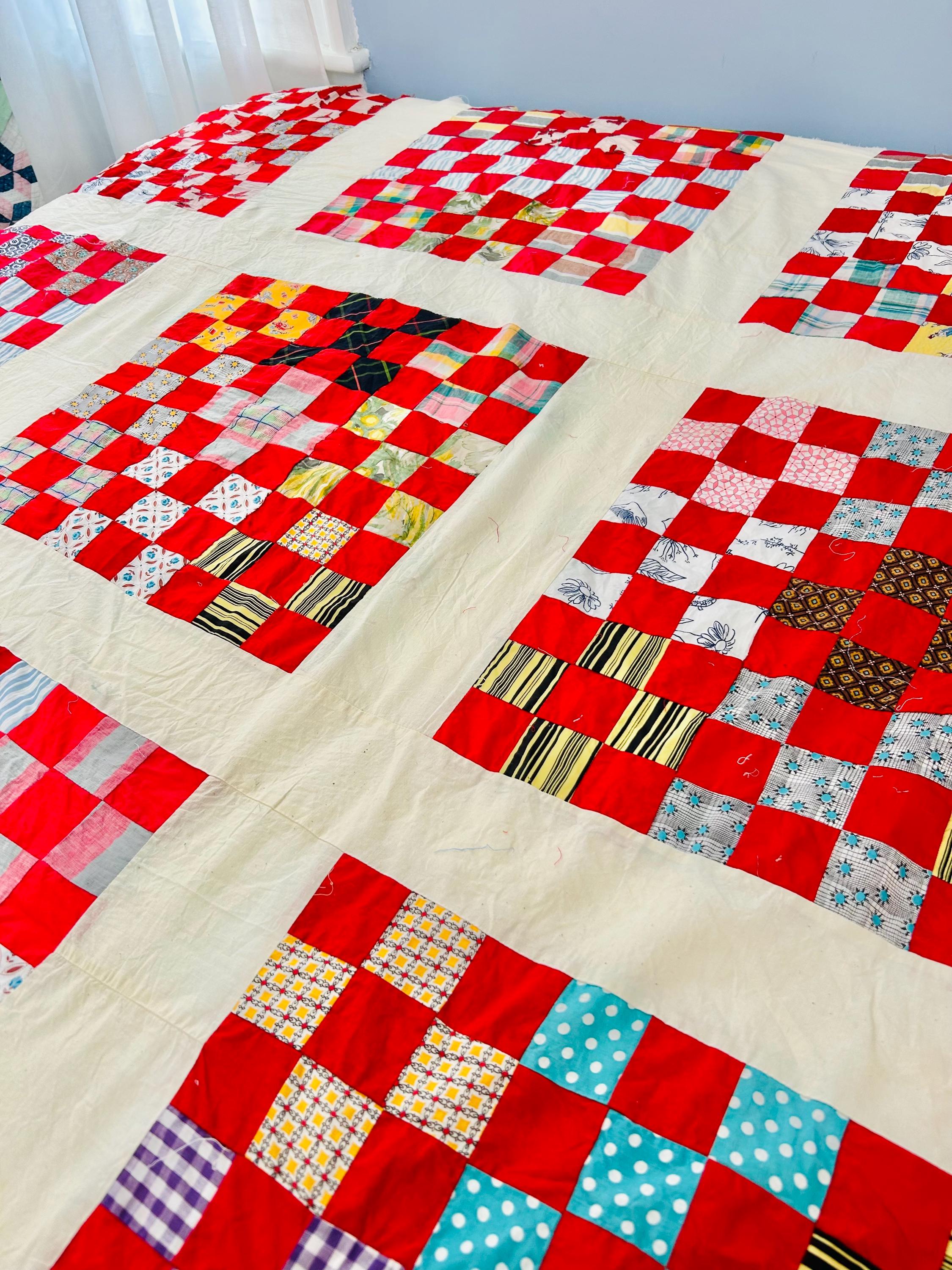 Measurements • Width: 64 inches • Length: 76 inches • Block Style: Large Nine-Patch (81-patch variation) with wide white sashing. • Era: 1950s