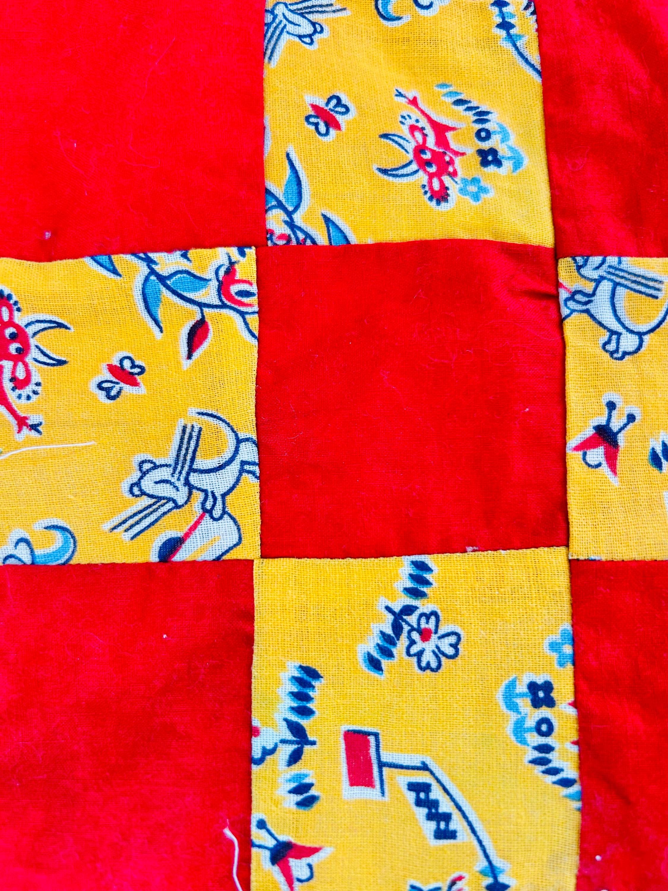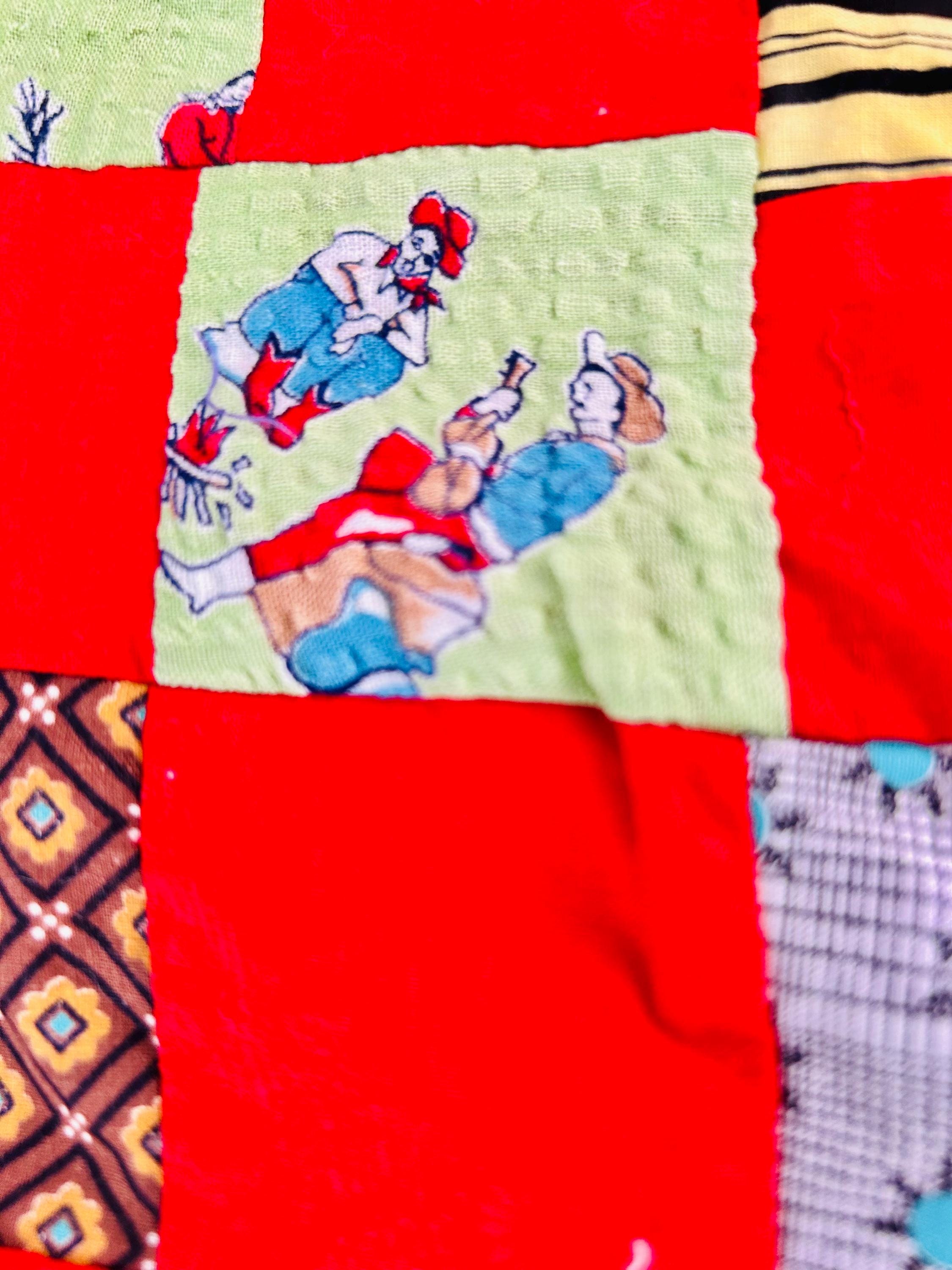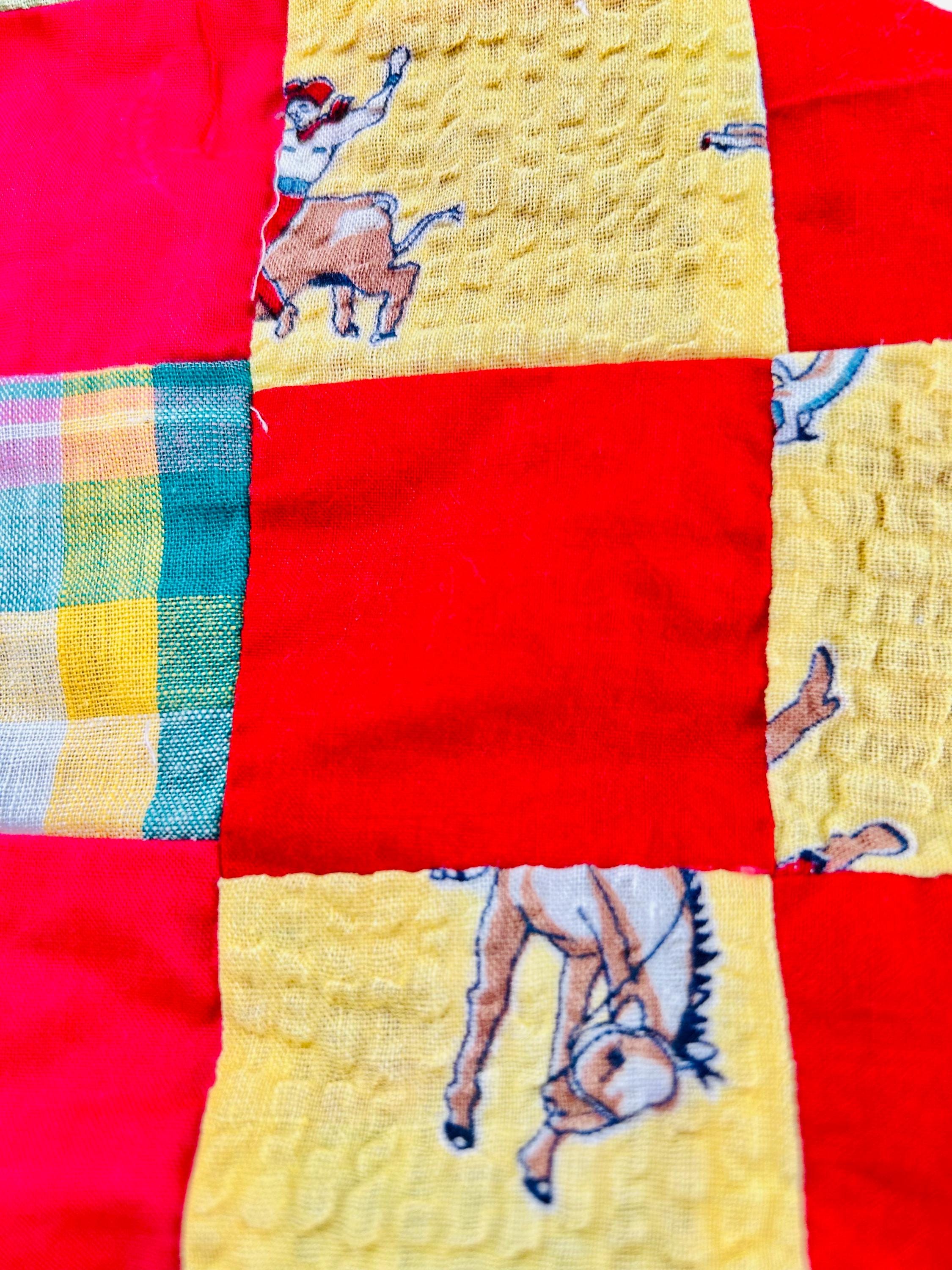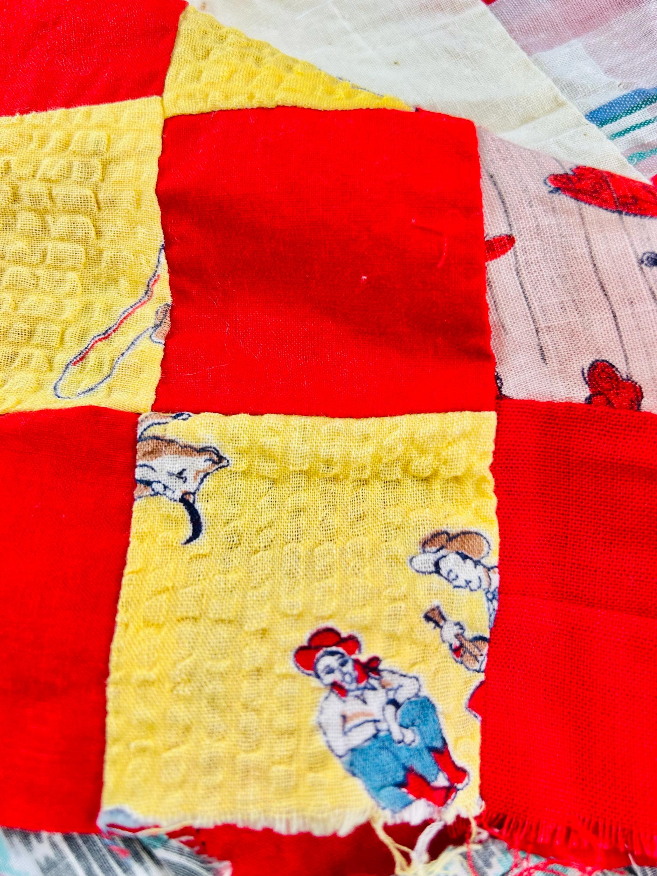 • Novelty "Western" Prints: The highlight of this piece is the wonderful Mid-Century Western motif fabric in sage green, featuring hand-drawn style cowboys around campfires and riders on bucking broncos. • Atomic-Era Whimsy: Includes a charming yellow novelty print with stylized red and blue figures, typical of the playful "atomic" kitchen and nursery prints of the 1950s. • Textured Cottons: Features patches of authentic vintage seersucker (puckered texture). • Vintage Scraps: A mix of polka dots, "shirting" stripes, floral calicos, and a bold, consistent poppy-red cotton broadcloth that ties the entire design together.