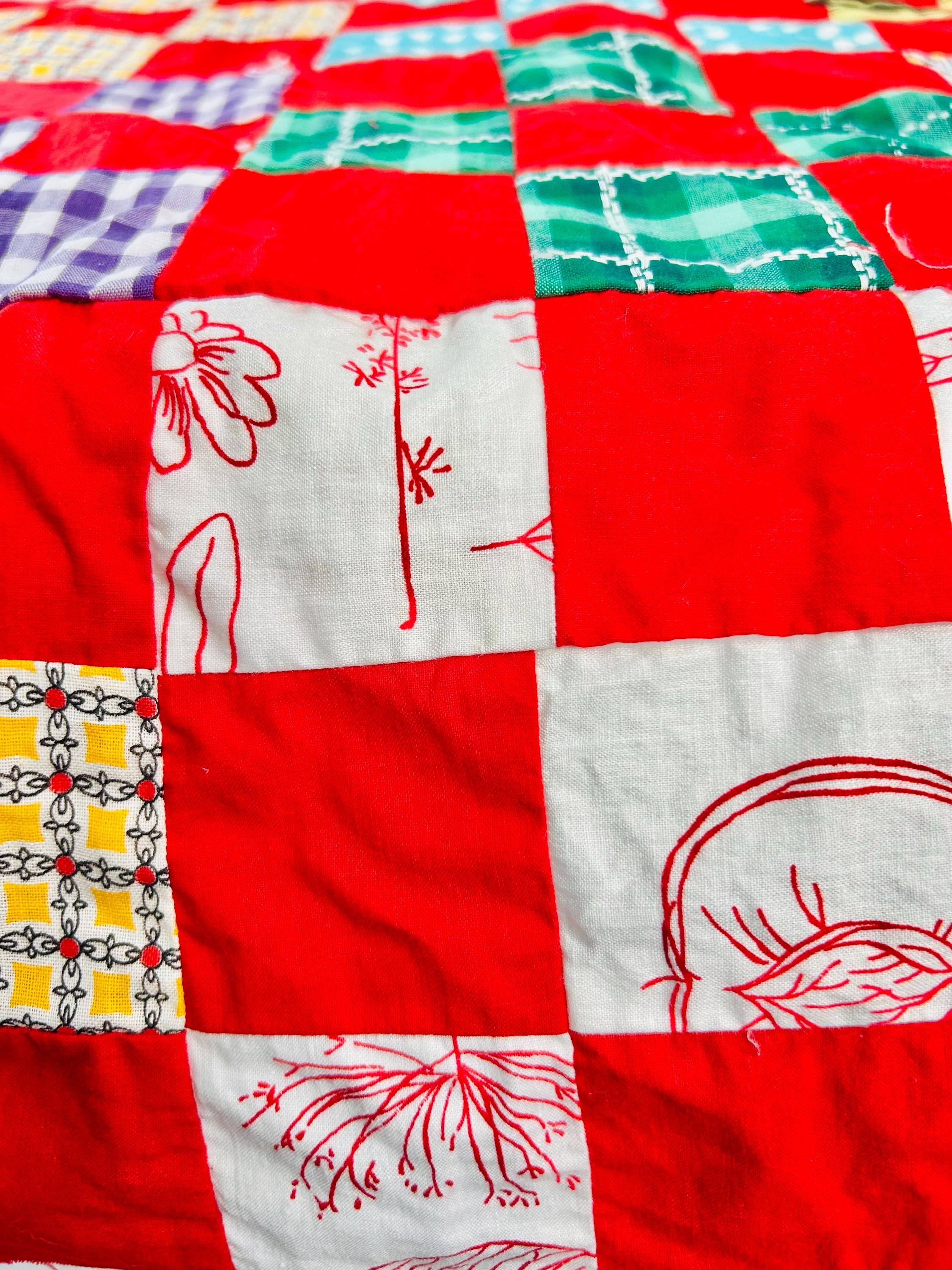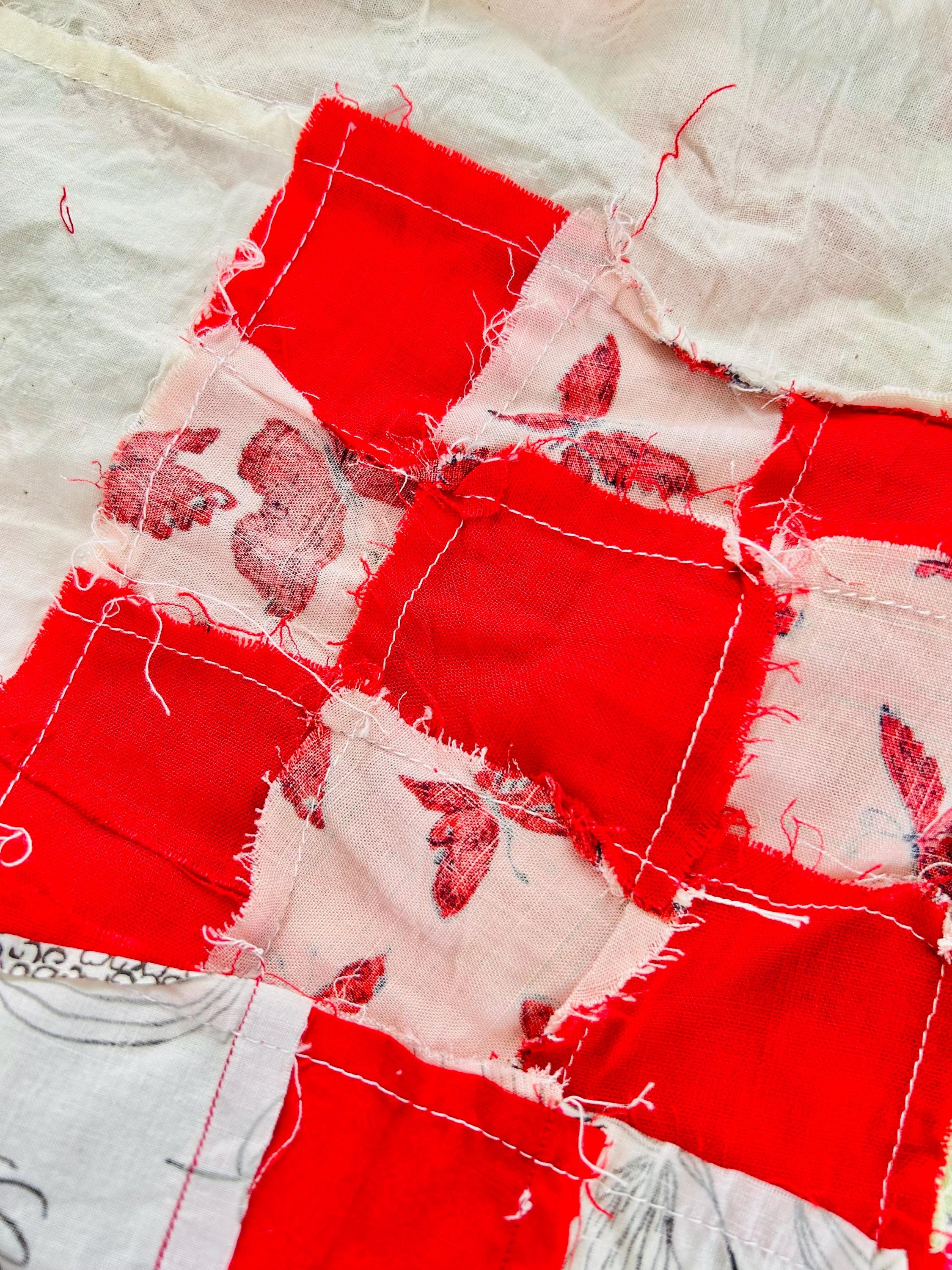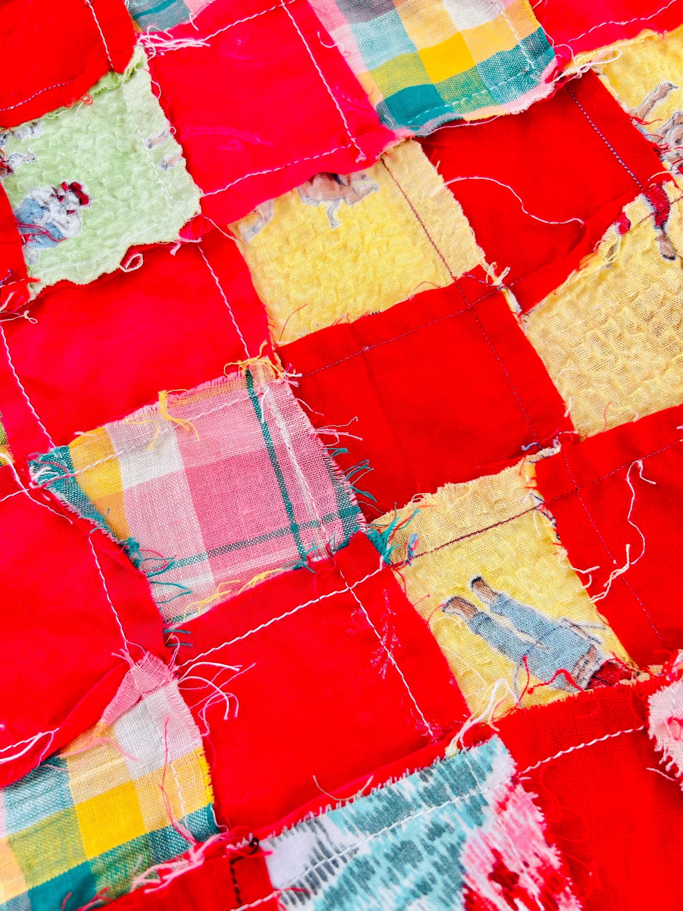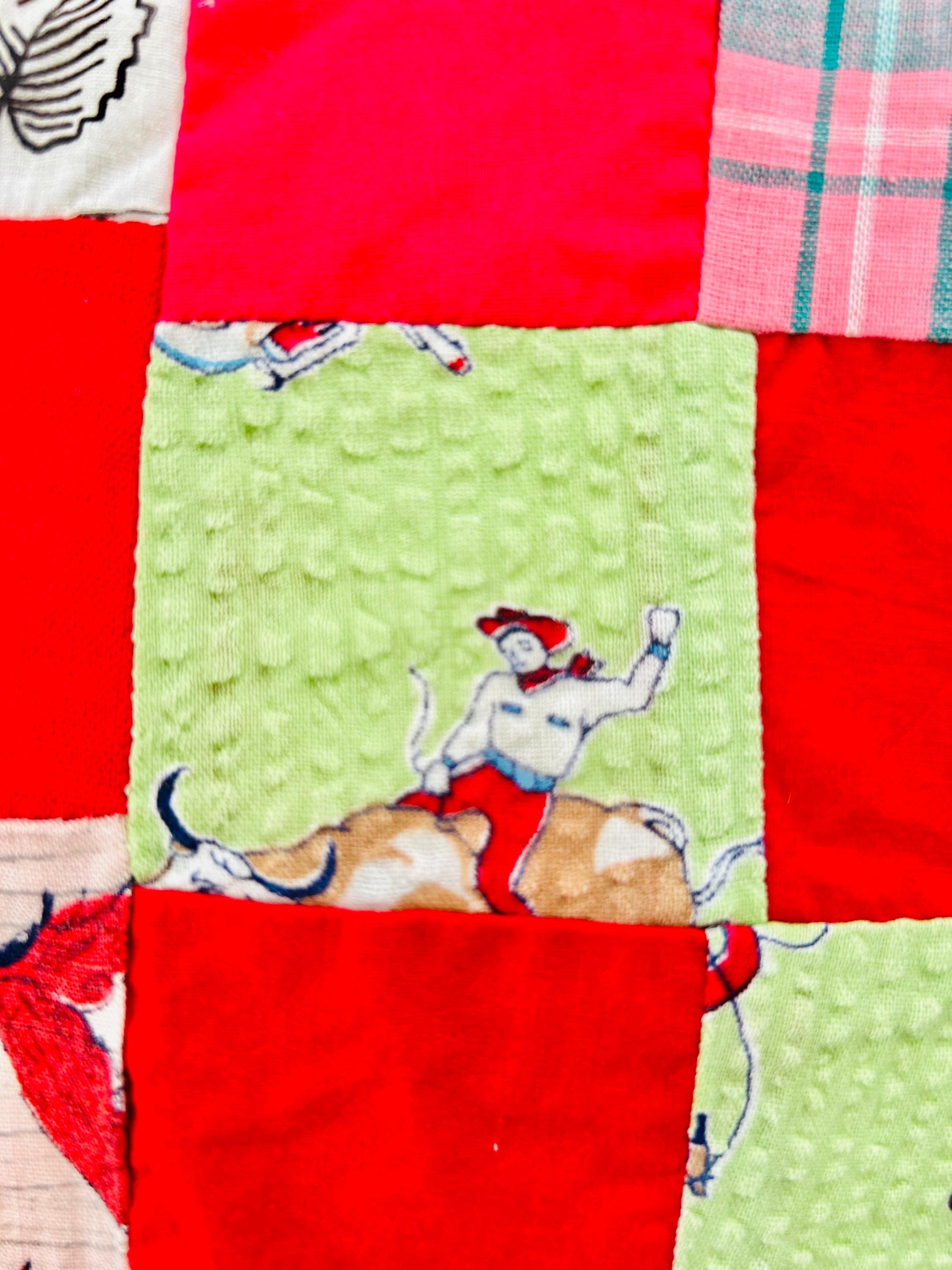 • Novelty "Western" Prints: The highlight of this piece is the wonderful Mid-Century Western motif fabric in sage green, featuring hand-drawn style cowboys around campfires and riders on bucking broncos. • Atomic-Era Whimsy: Includes a charming yellow novelty print with stylized red and blue figures, typical of the playful "atomic" kitchen and nursery prints of the 1950s. • Textured Cottons: Features patches of authentic vintage seersucker (puckered texture). • Vintage Scraps: A mix of polka dots, "shirting" stripes, floral calicos, and a bold, consistent poppy-red cotton broadcloth that ties the entire design together.