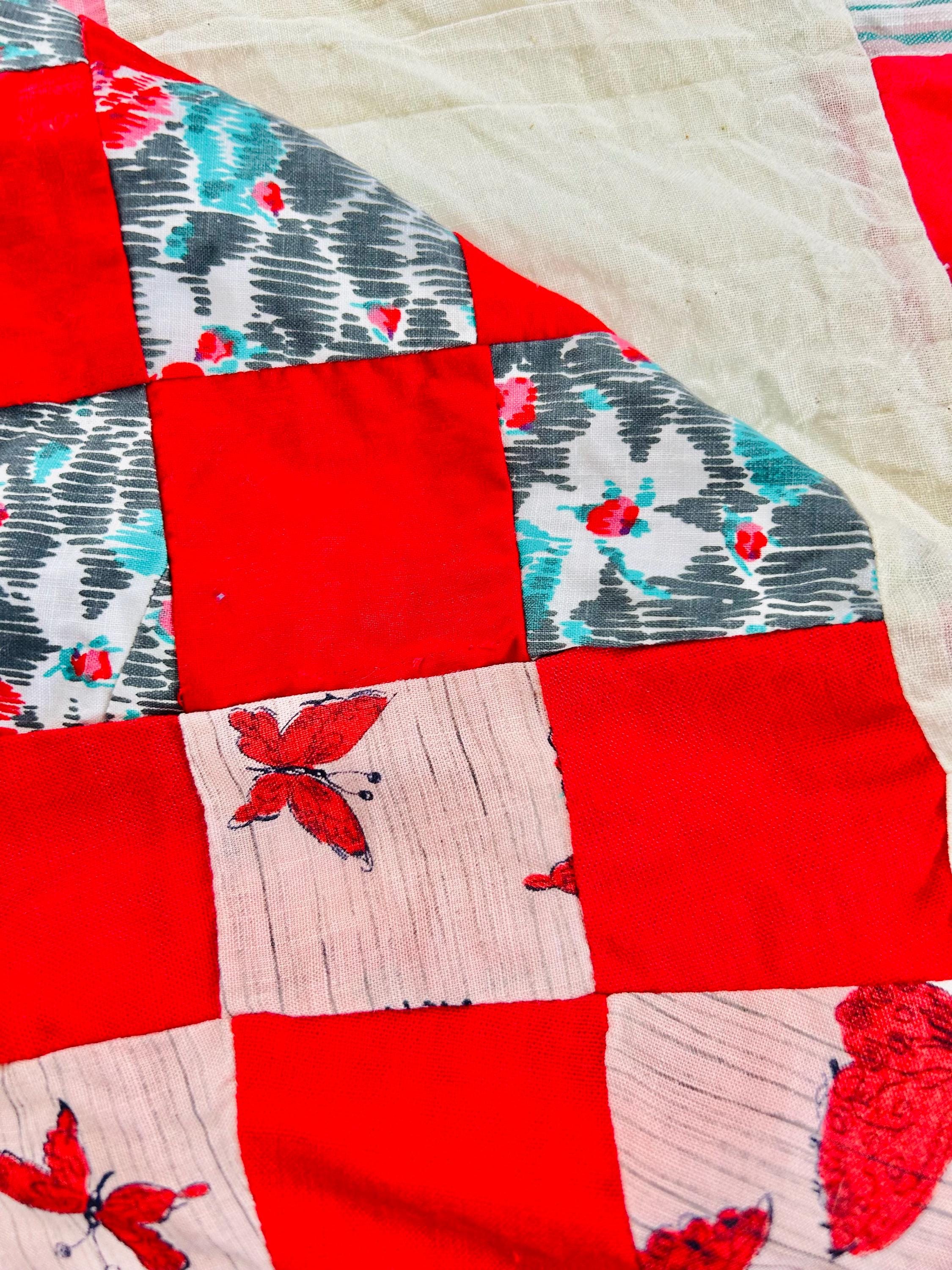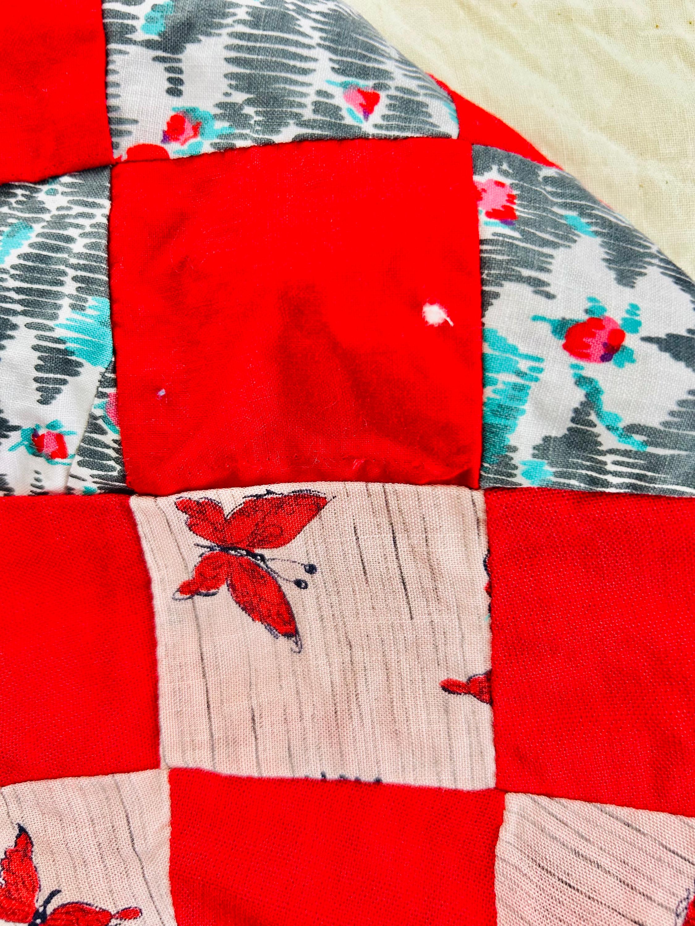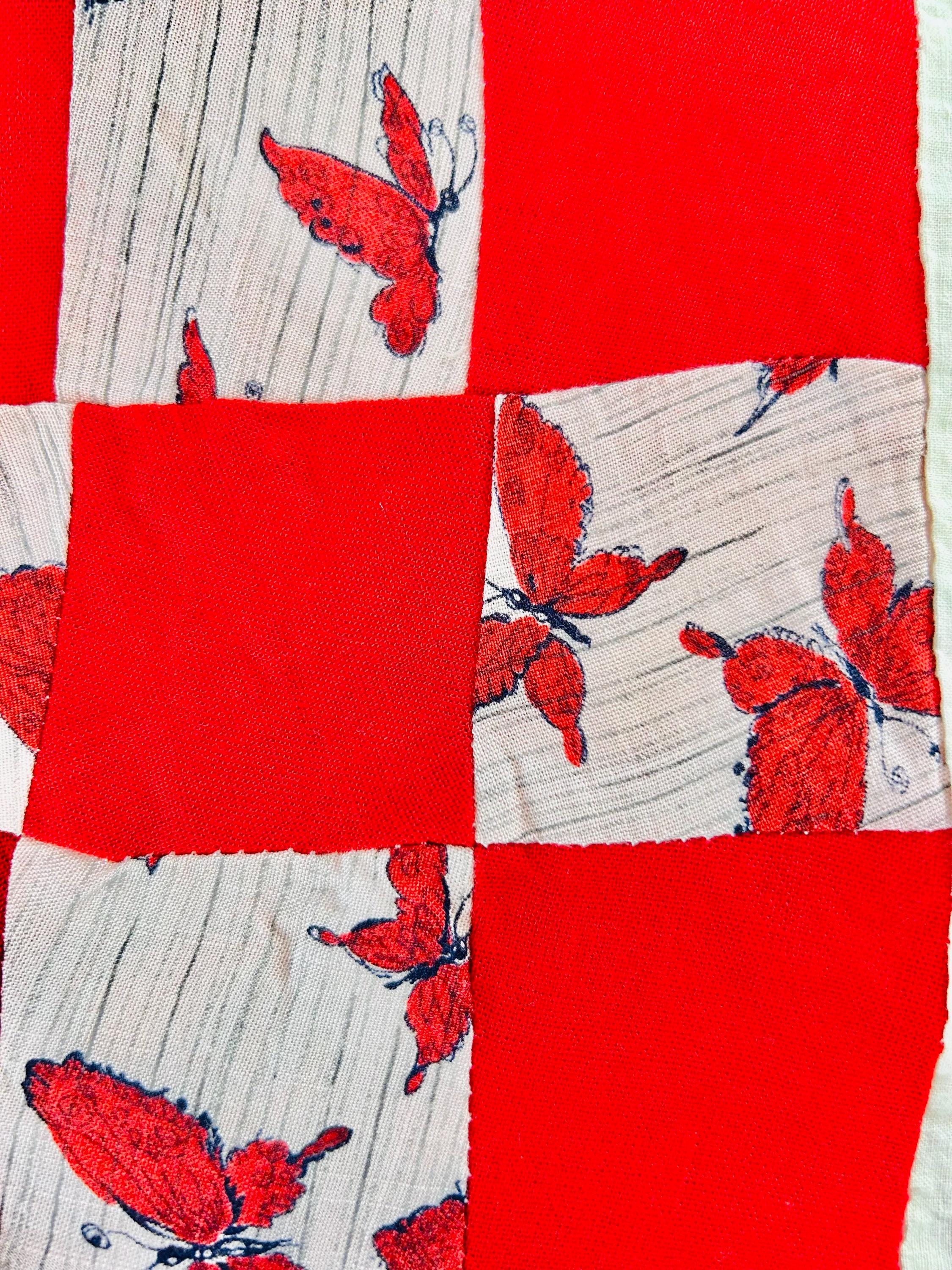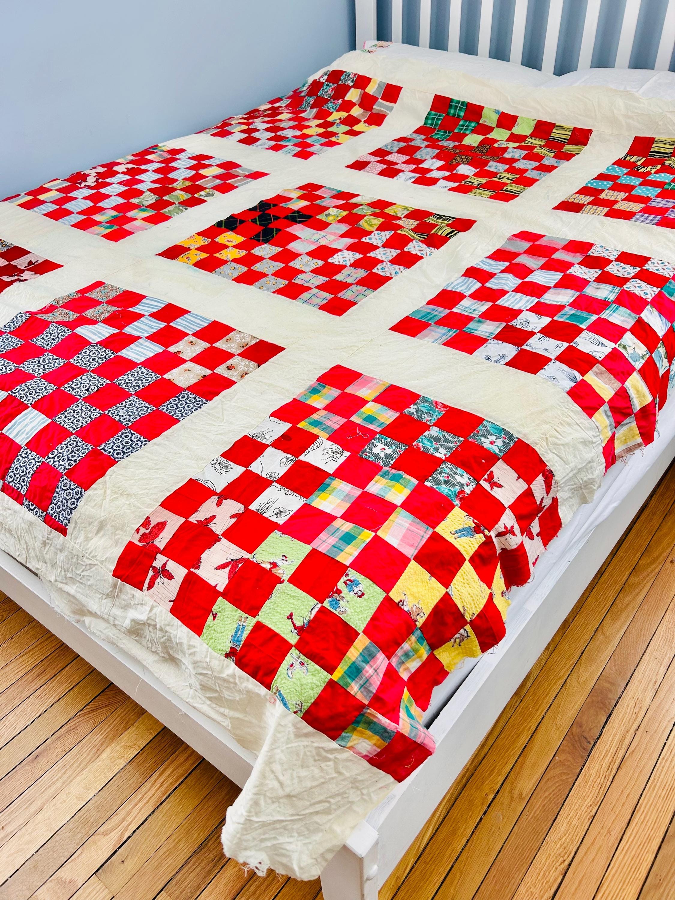 • Novelty "Western" Prints: The highlight of this piece is the wonderful Mid-Century Western motif fabric in sage green, featuring hand-drawn style cowboys around campfires and riders on bucking broncos. • Atomic-Era Whimsy: Includes a charming yellow novelty print with stylized red and blue figures, typical of the playful "atomic" kitchen and nursery prints of the 1950s. • Textured Cottons: Features patches of authentic vintage seersucker (puckered texture). • Vintage Scraps: A mix of polka dots, "shirting" stripes, floral calicos, and a bold, consistent poppy-red cotton broadcloth that ties the entire design together.