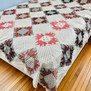 The quilt top comes from a smoke-free, pet-free home and is pictured on a queen-size bed.