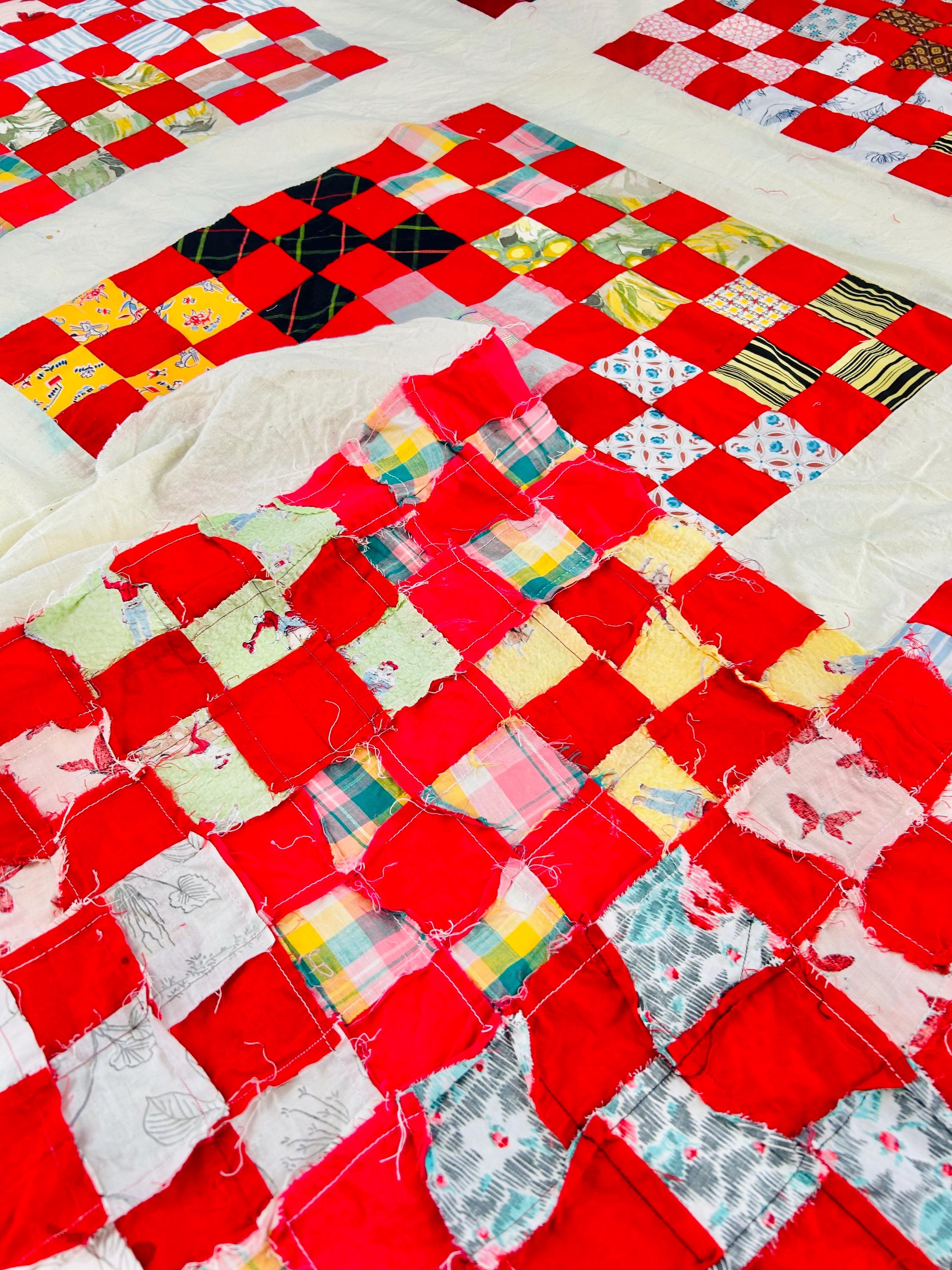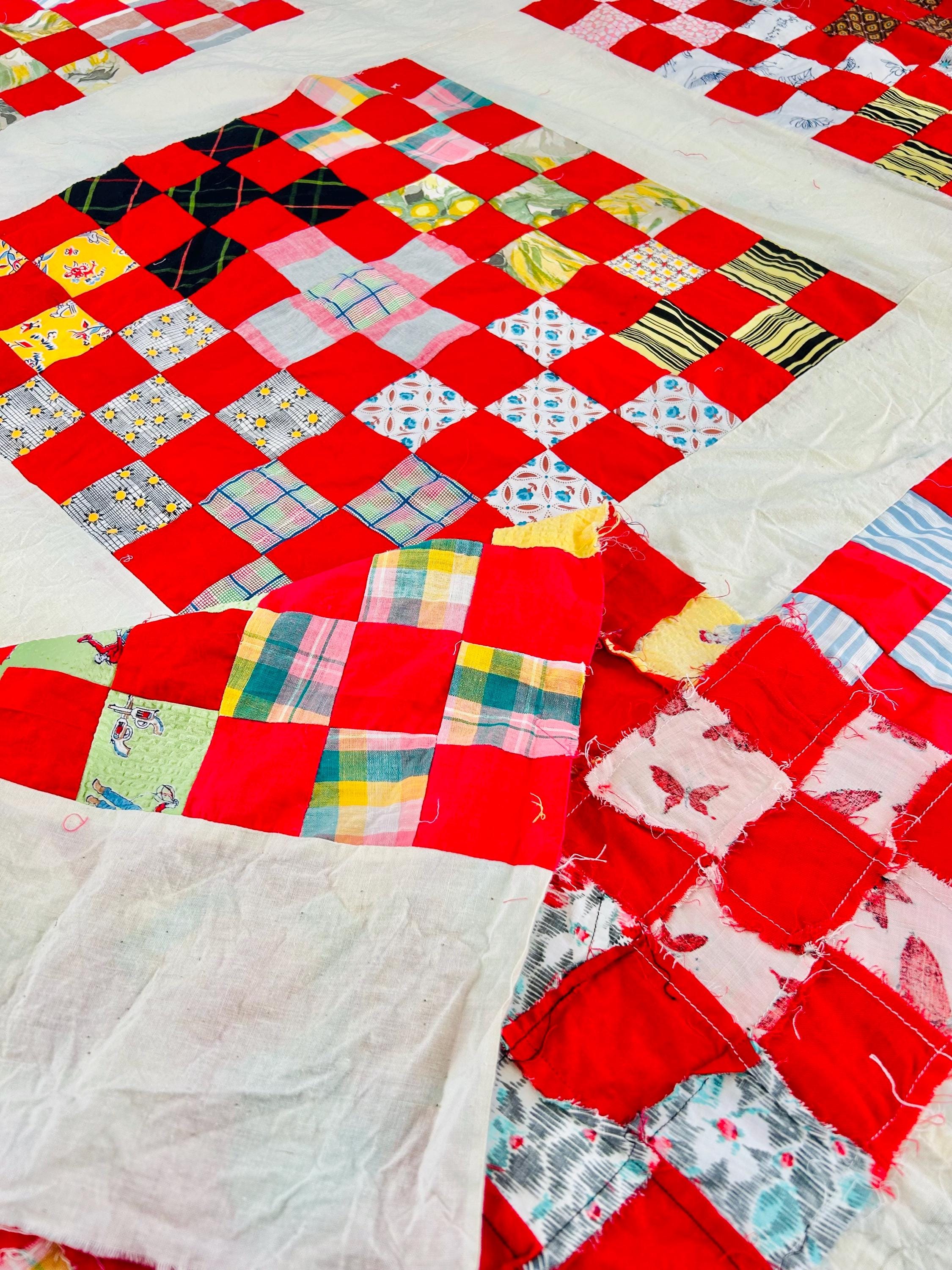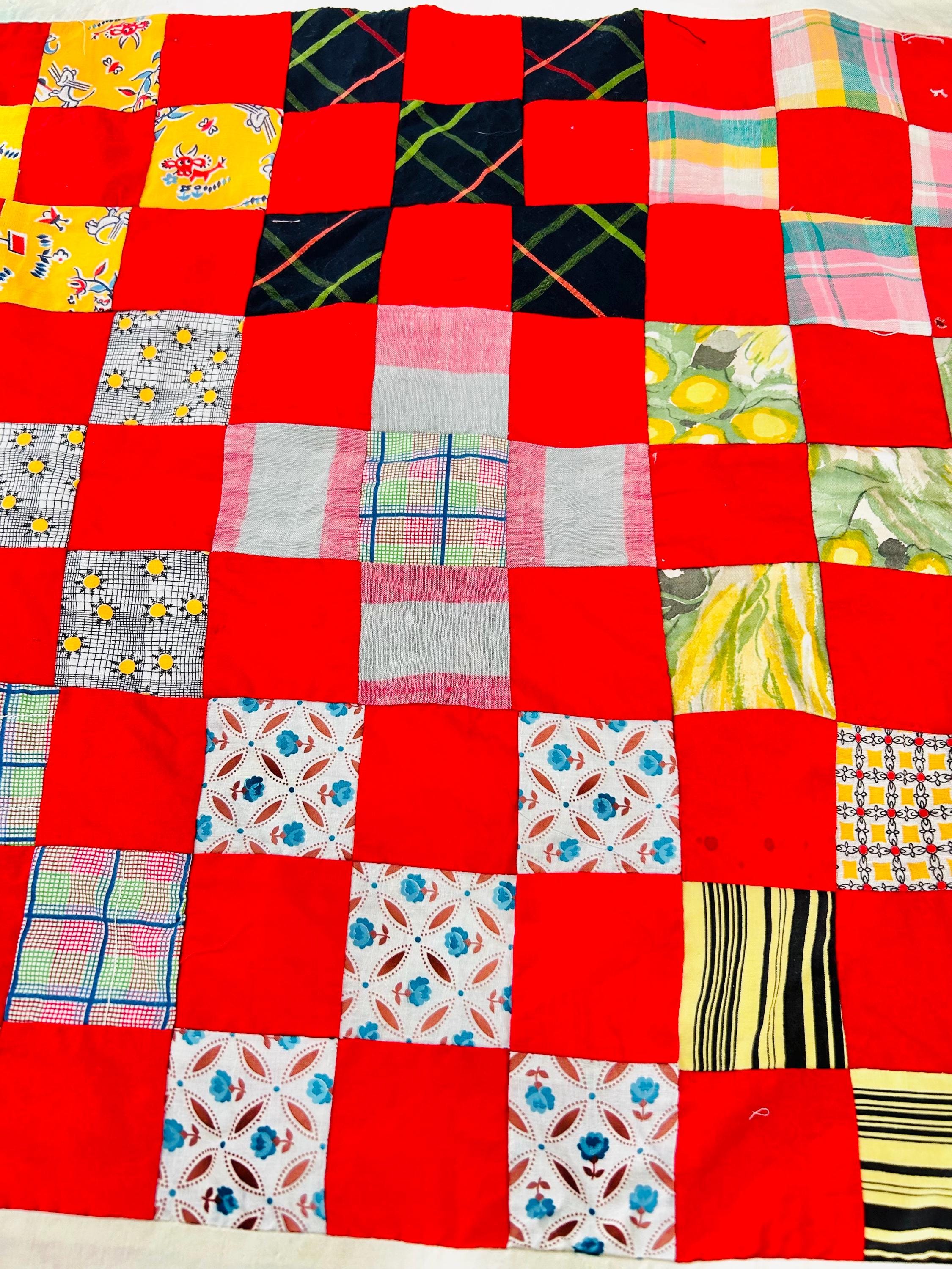Nine must have been the lucky number for the maker of this Nine-Patch Quilt Top. There are nine large squares, each made of 81 (9x9) individual squares. It features "scrappy" remnants from home dressmaking and repurposed feed sacks, including: