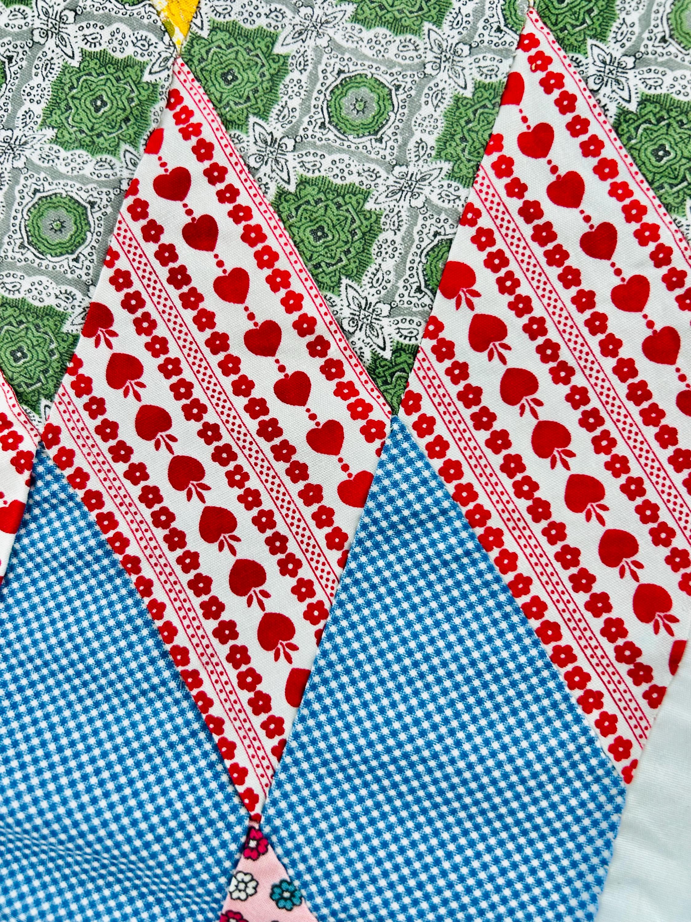 • Classic "Nile Green" and "Maize Yellow" floral chintz patterns. • Deep lavender and purple floral geometrics. • A charming red-and-white novelty "heart/apple" striped print. • Traditional blue-and-white gingham and checked calicos.