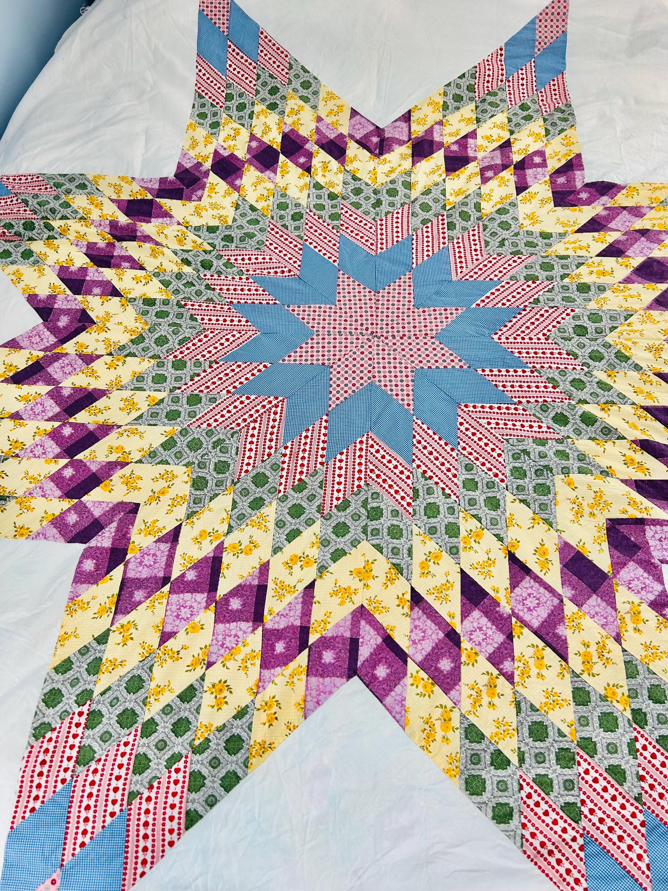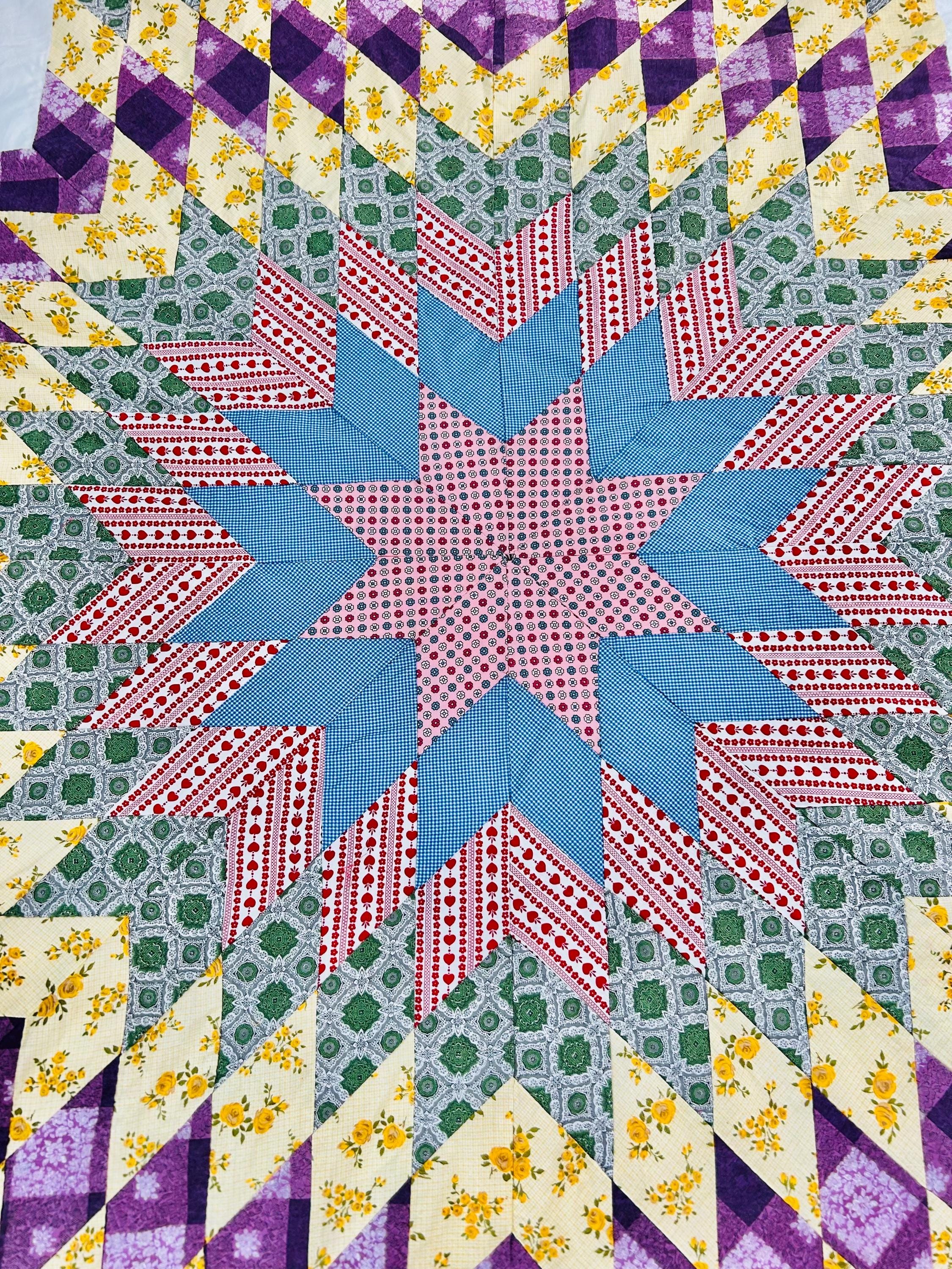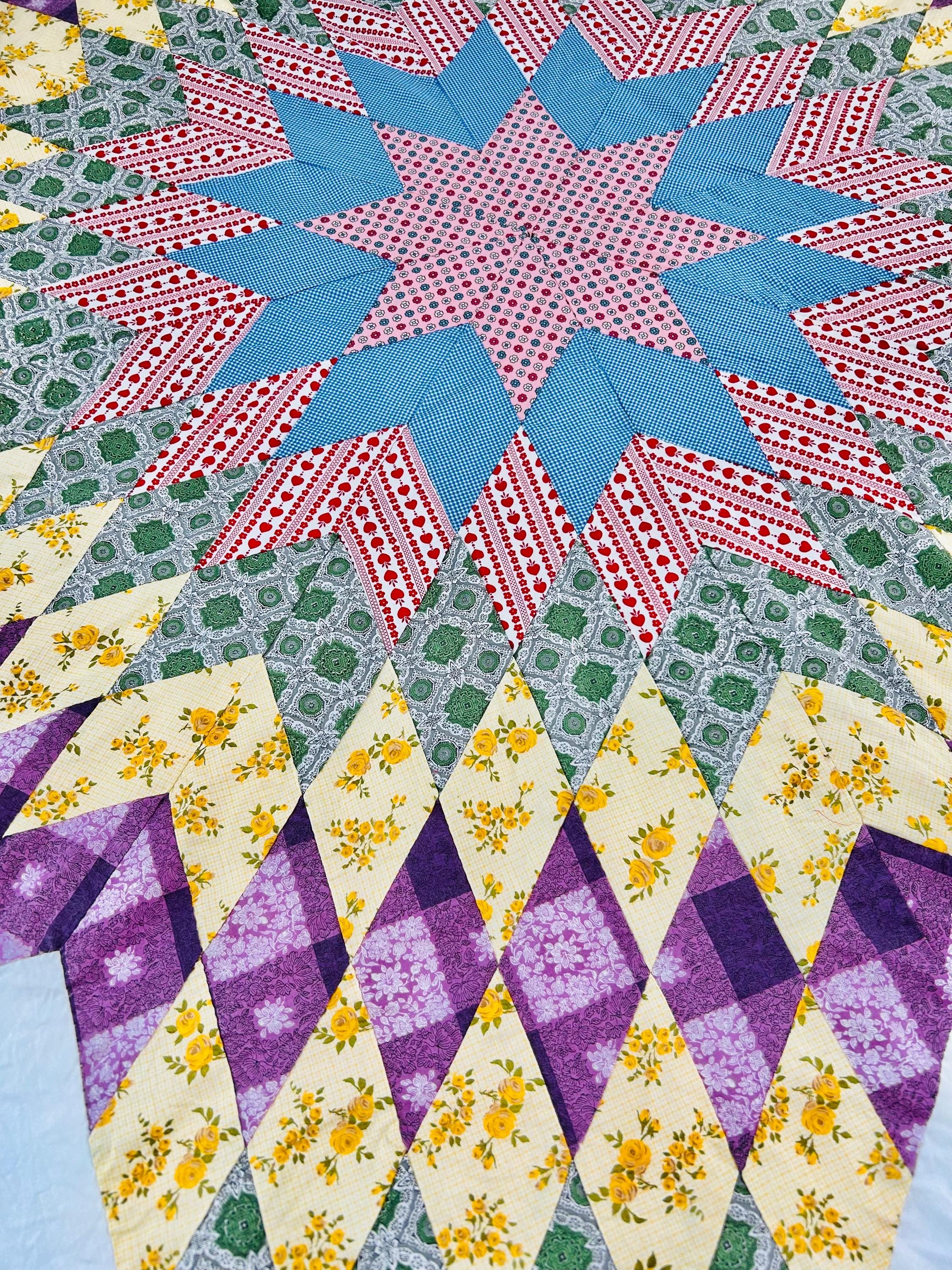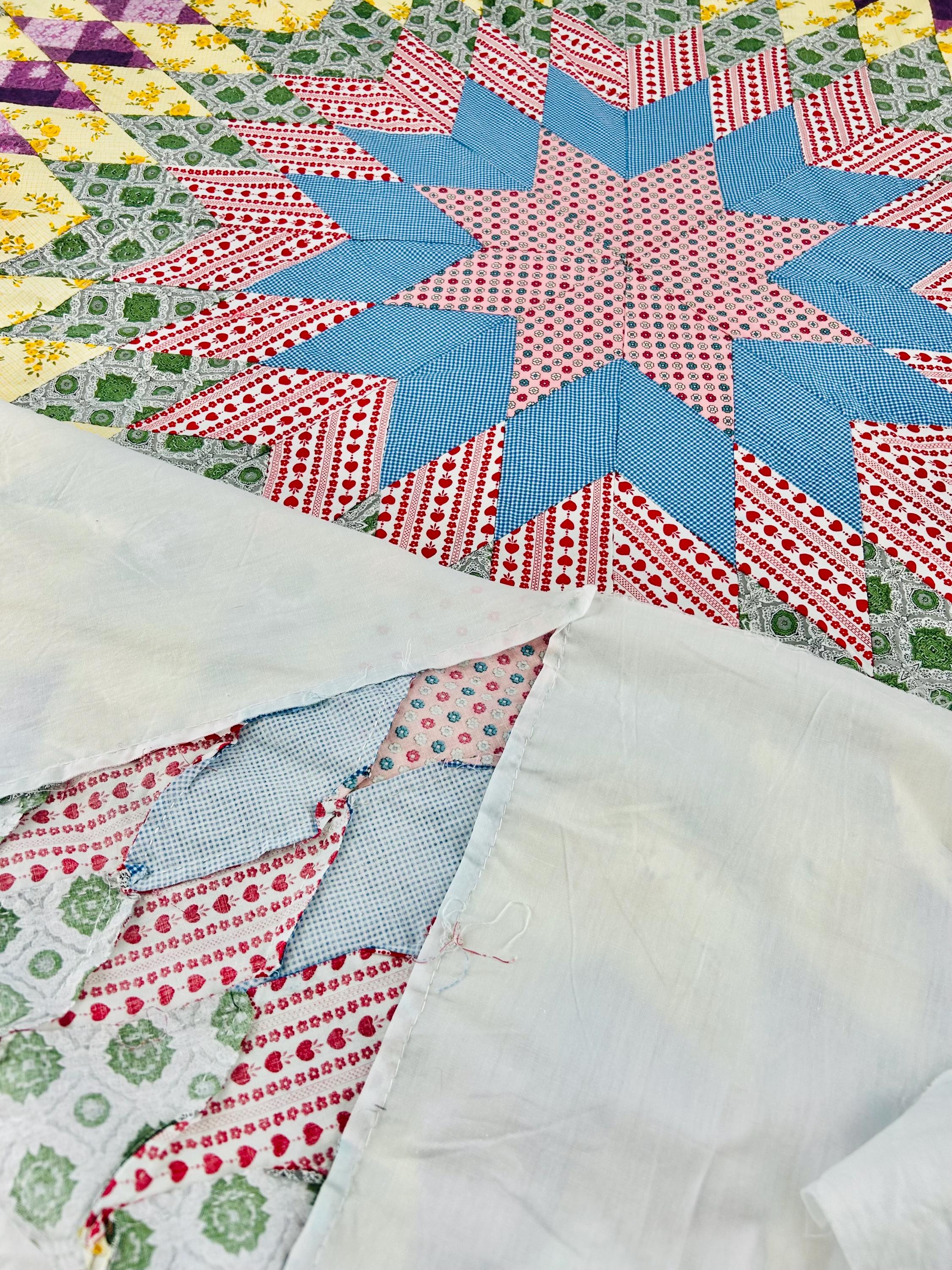 This is a beautiful Scrappy Lone Star Quilt Top, circa 1930s, composed of hundreds of hand-pieced diamonds, this top showcases iconic "scrap bag" period prints, including: