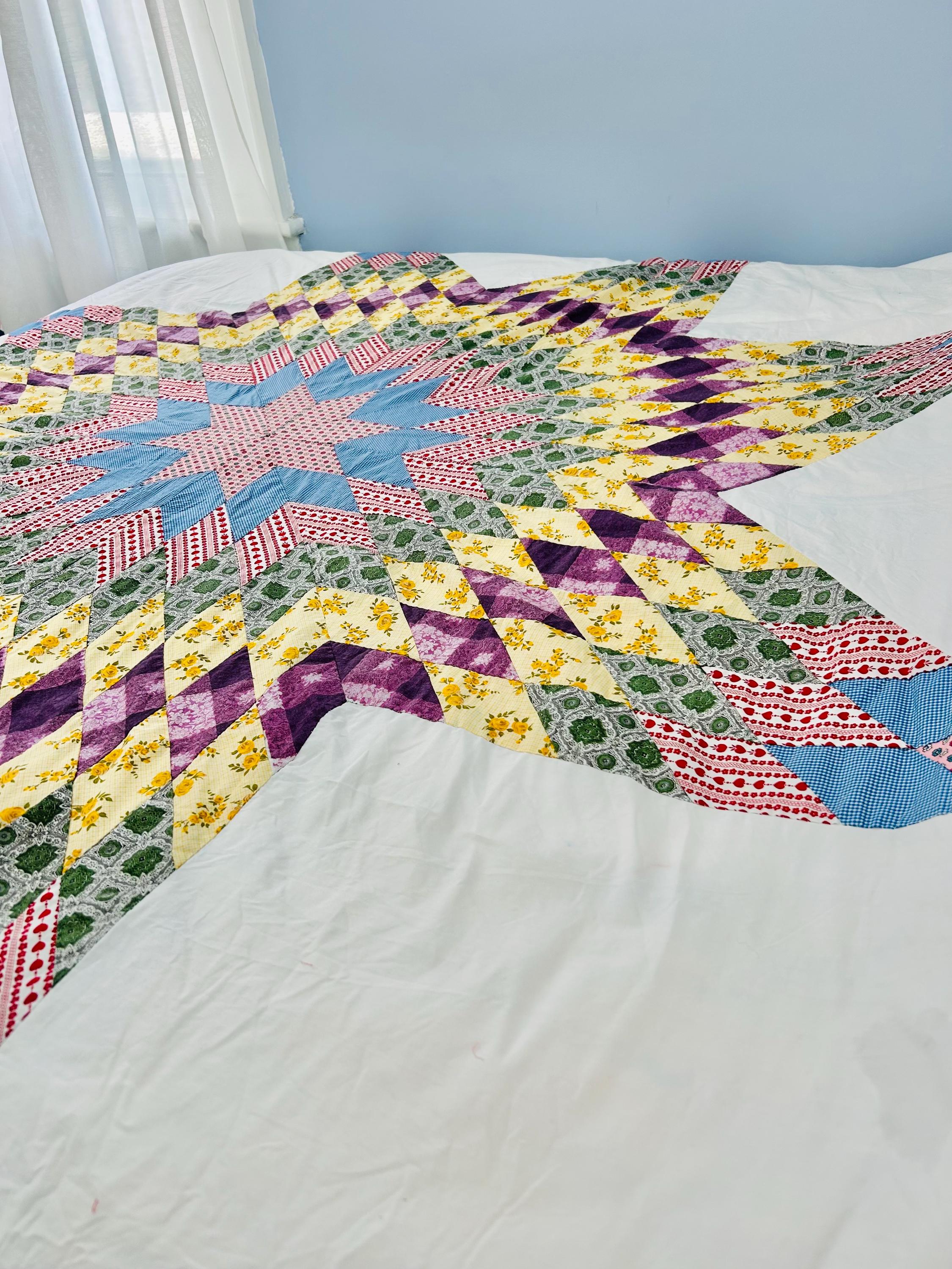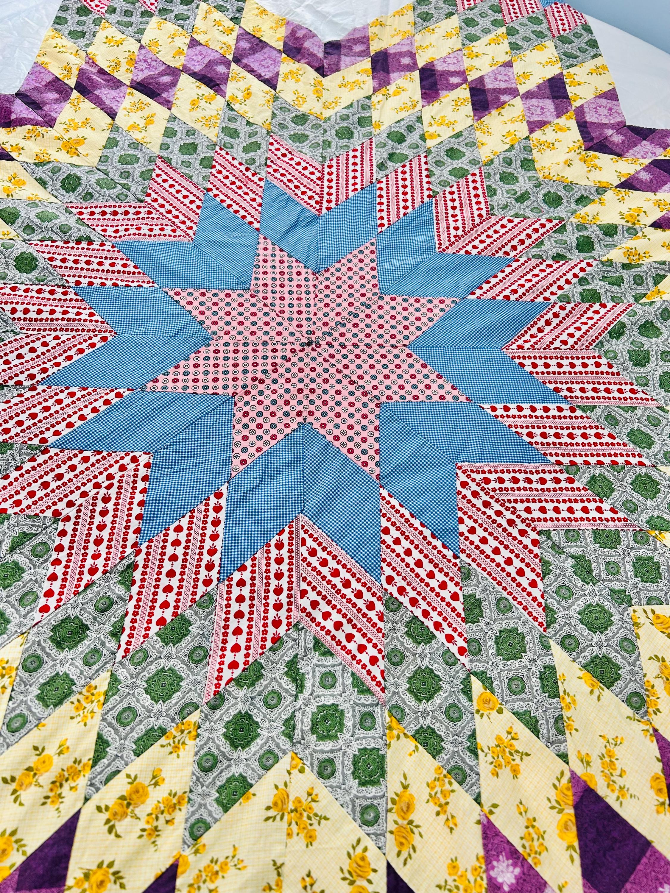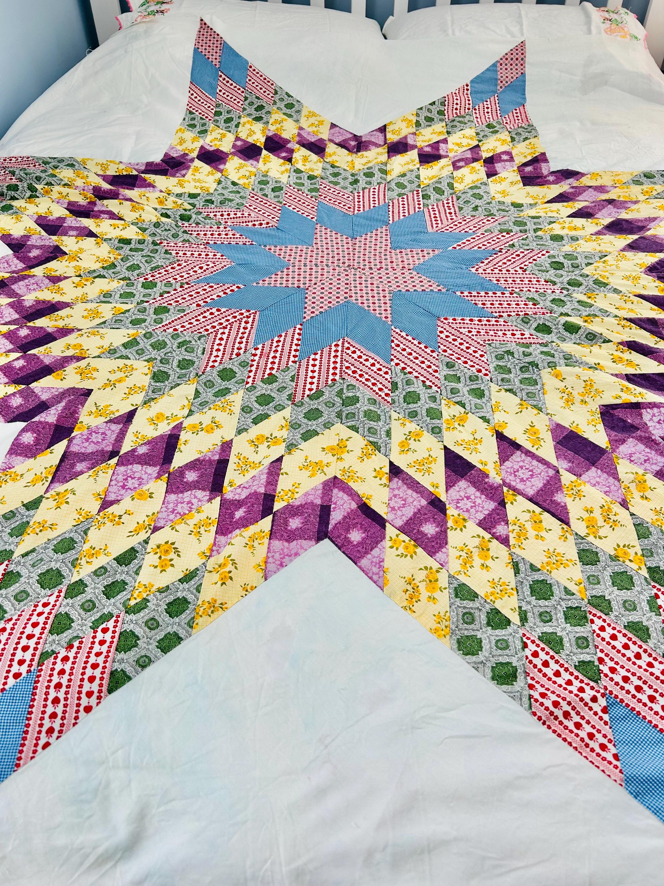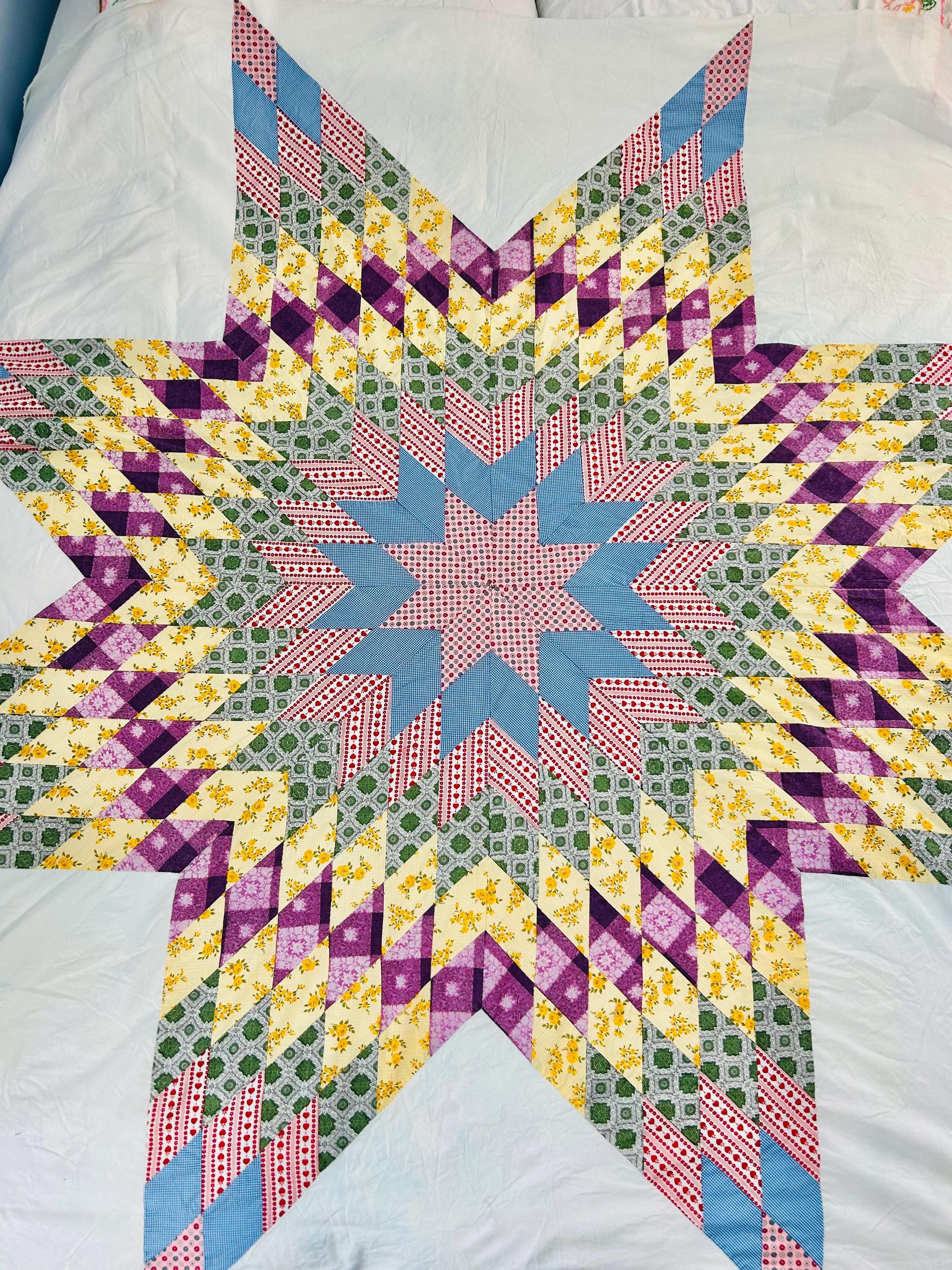 This is a beautiful Scrappy Lone Star Quilt Top, circa 1930s, composed of hundreds of hand-pieced diamonds, this top showcases iconic "scrap bag" period prints, including: