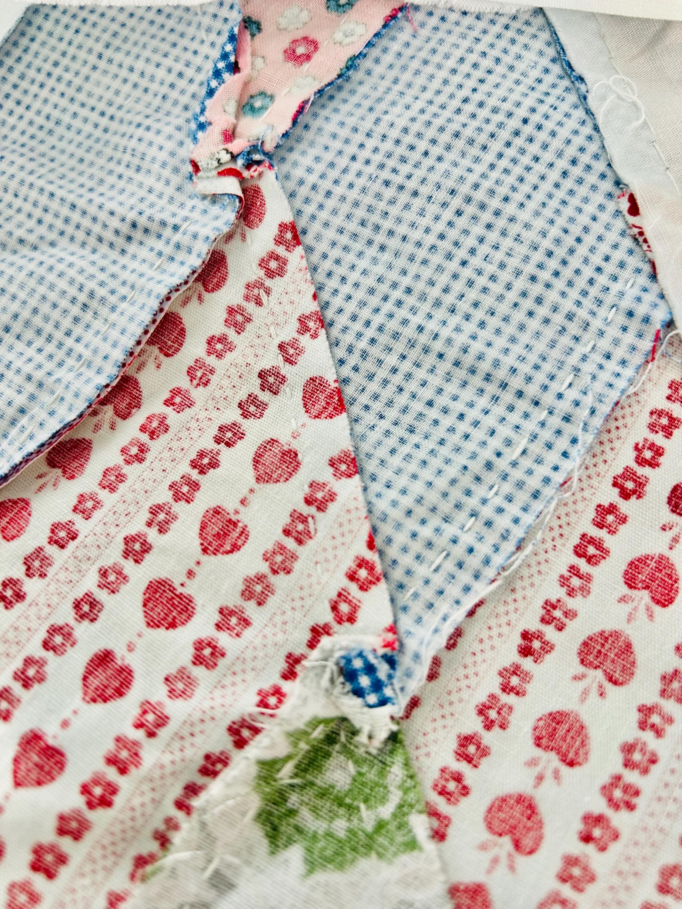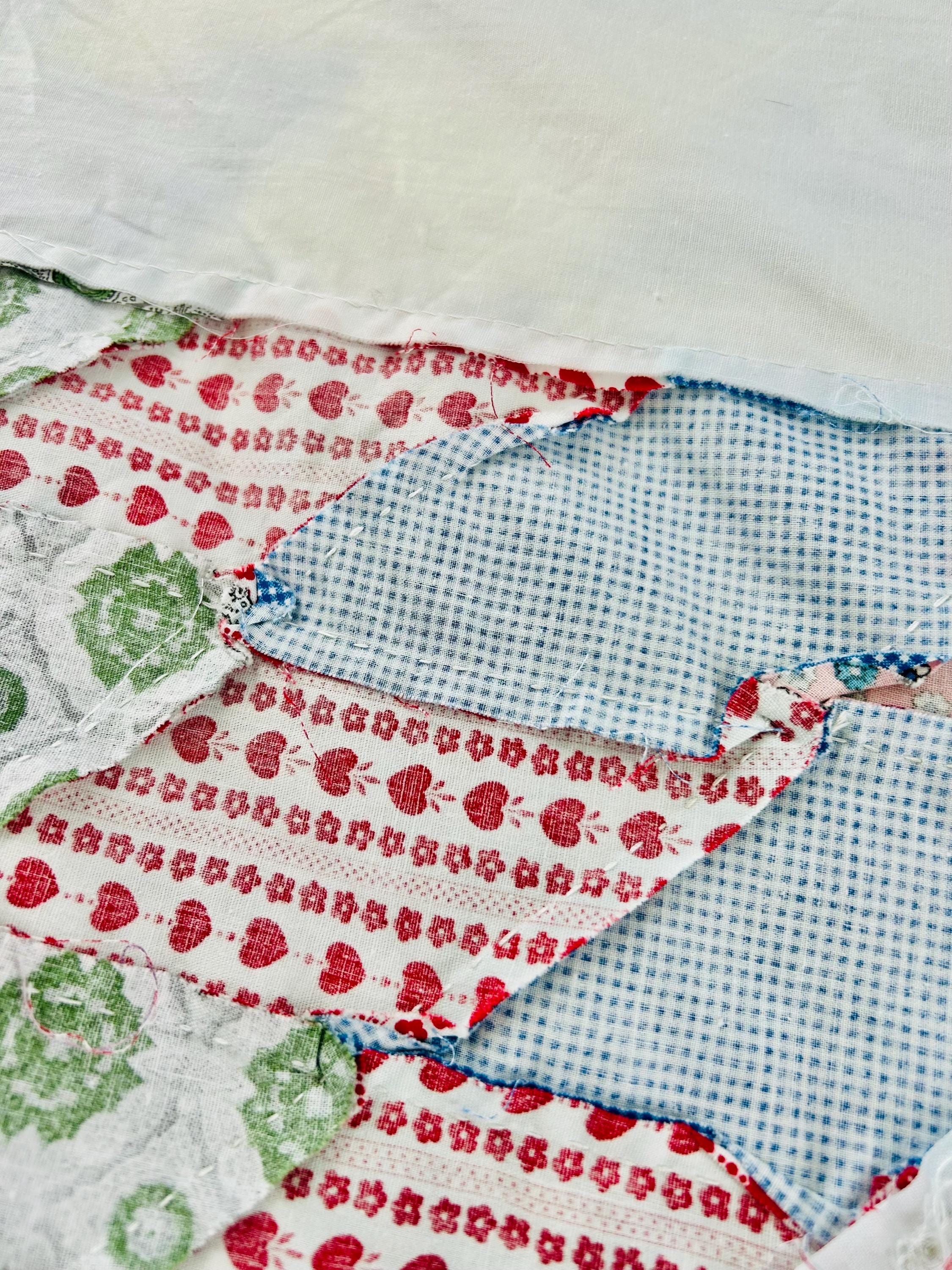 Details • Type: Quilt Top ONLY (Not a finished quilt; no batting, backing, or binding). • Dimensions: Approximately 69” x 71” • Era: Circa 1930s – Early 1940s. • Construction: Entirely hand-pieced with visible, delicate hand-stitching on the reverse. • Fabric: 100% Cotton percale and calico prints.