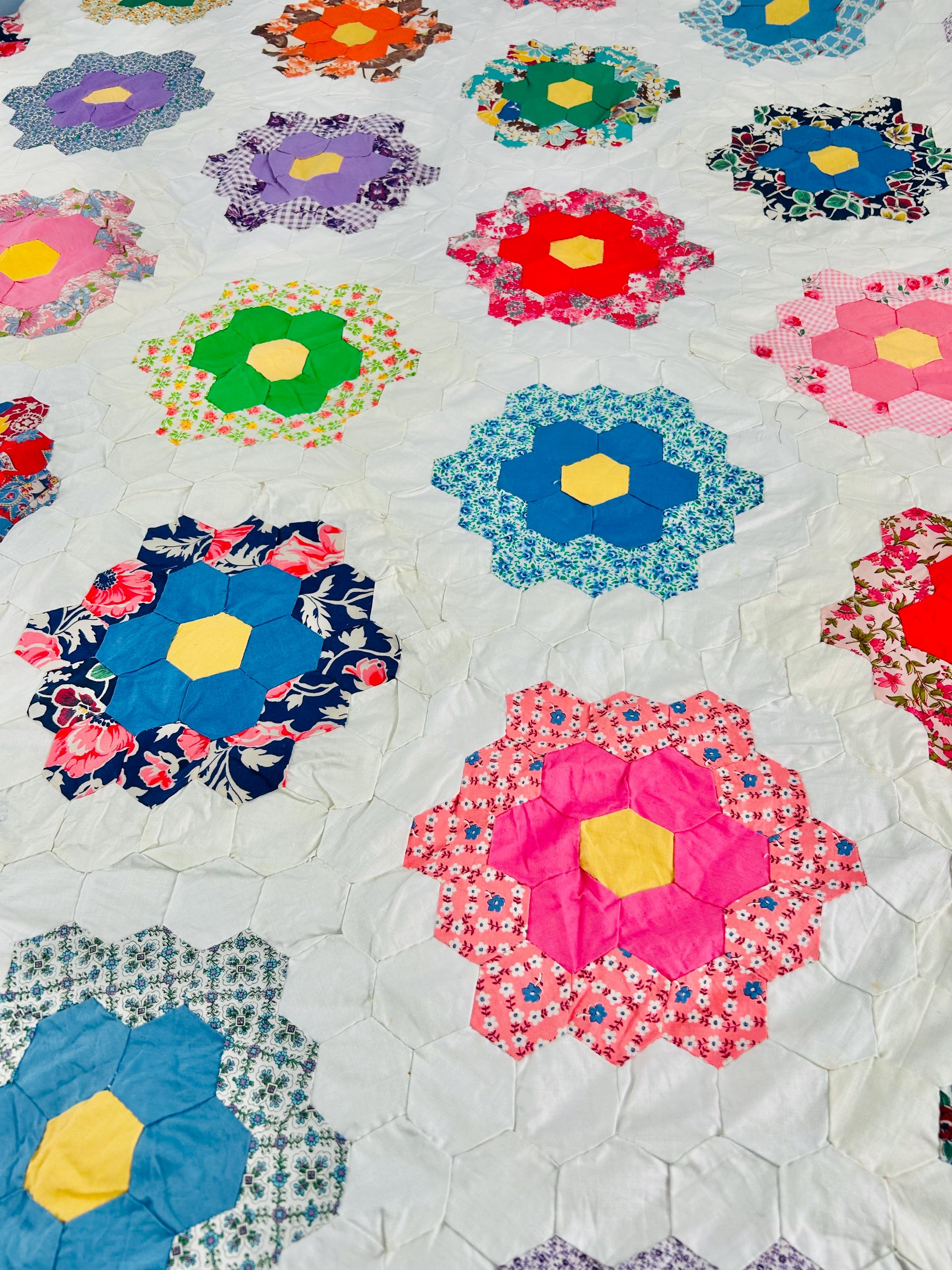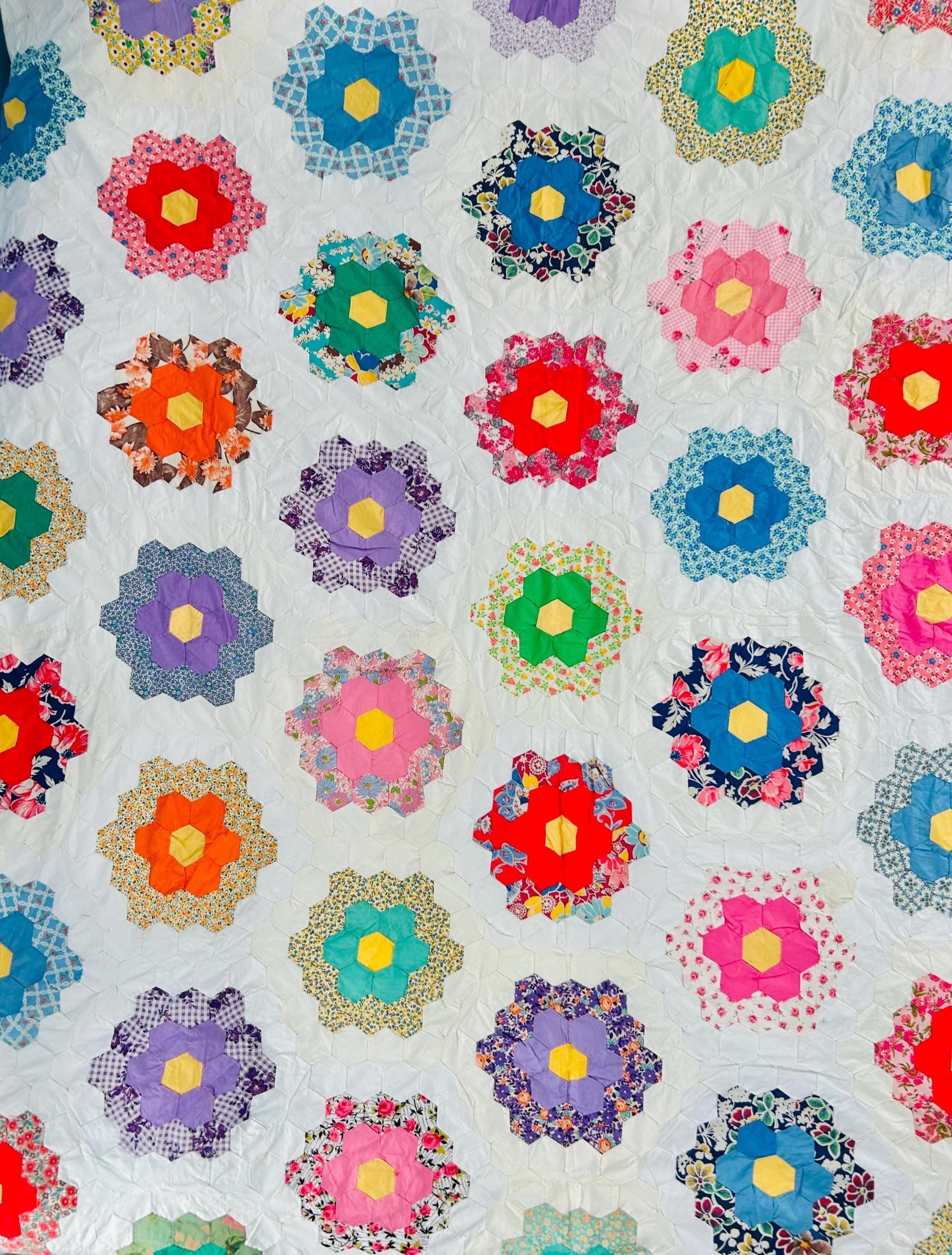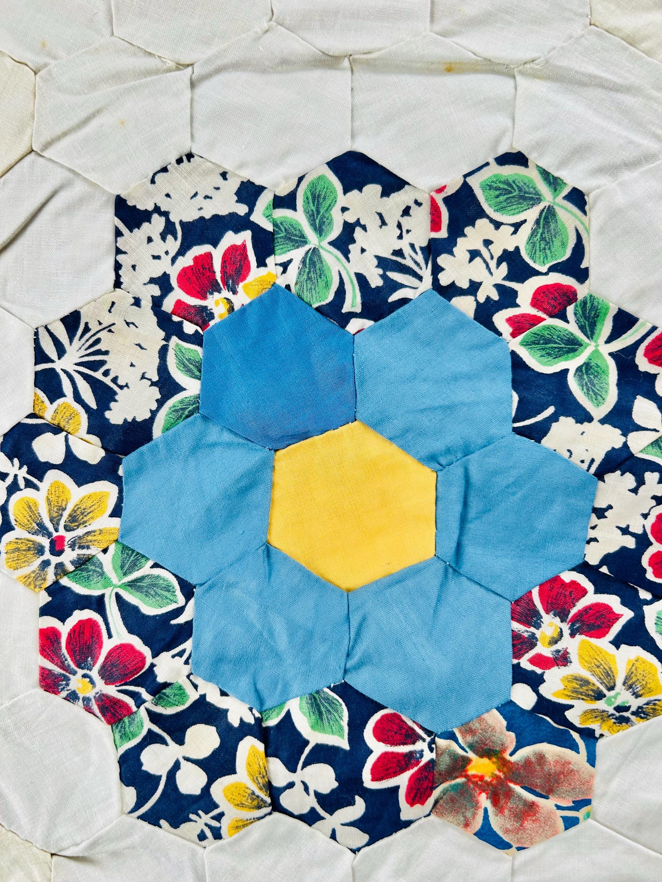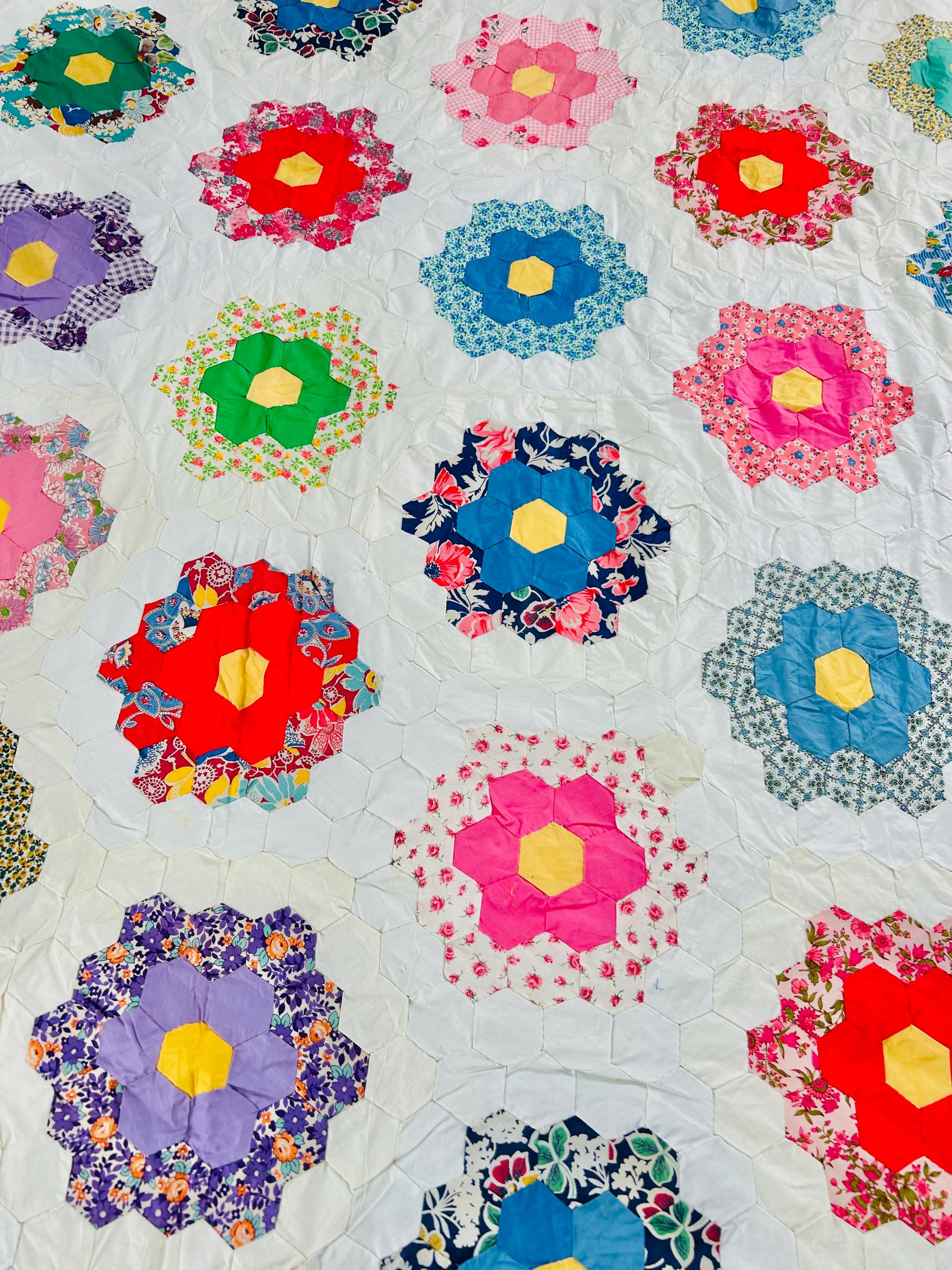 The Fabrics & Palette • Authentic 1930s Feed Sacks: Delightful small-scale florals, lavender ginghams, and "shirting" prints. • Early 1940s Brights: Bolder pops of turquoise, "shocking pink," and saturated oranges that transitioned into the mid-century aesthetic. • The "Path" & Centers: All "flowers" are anchored by uniform butter-yellow centers and set against a crisp, white hexagonal "path" that makes the colors truly sing.