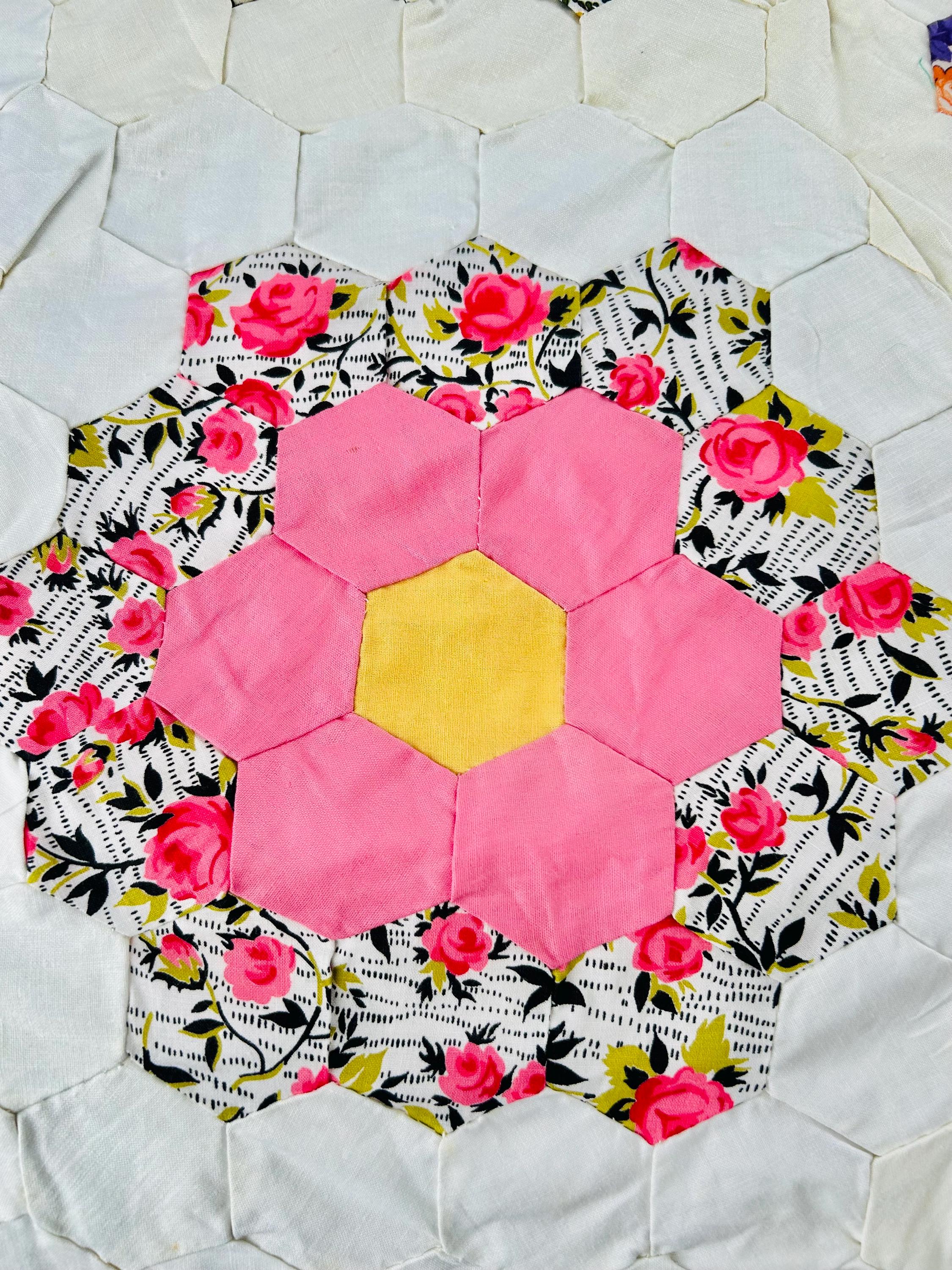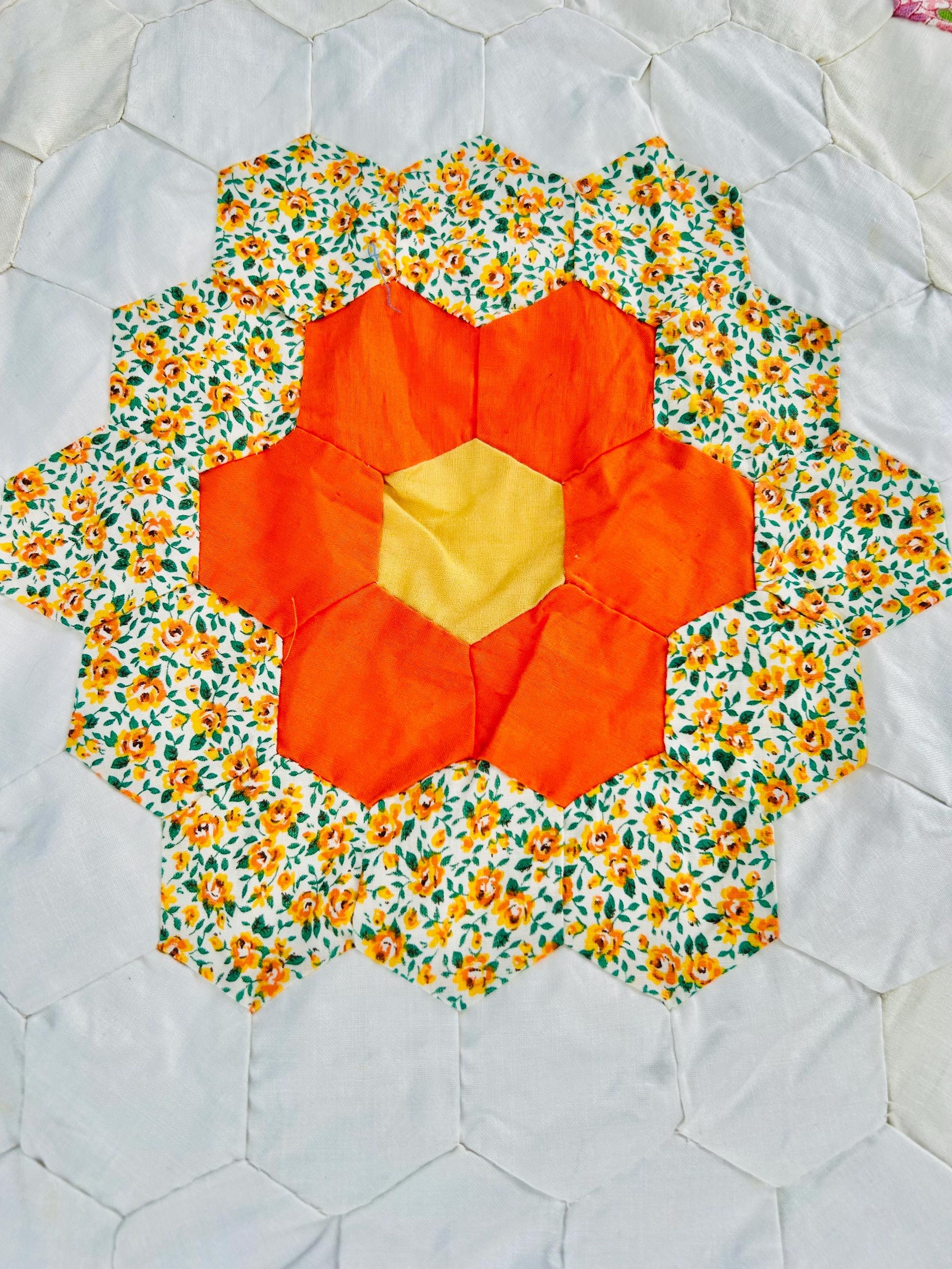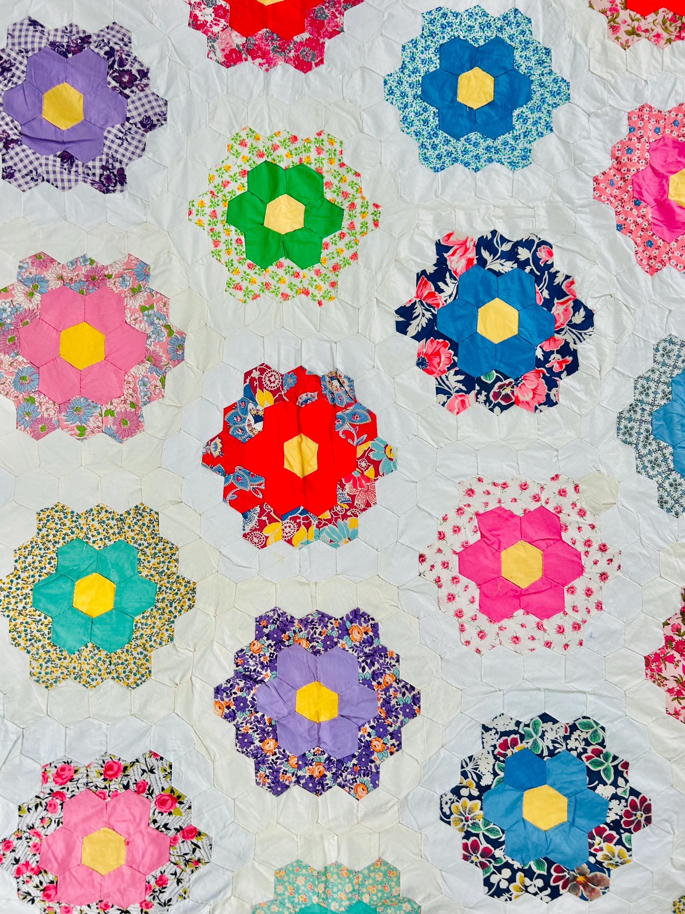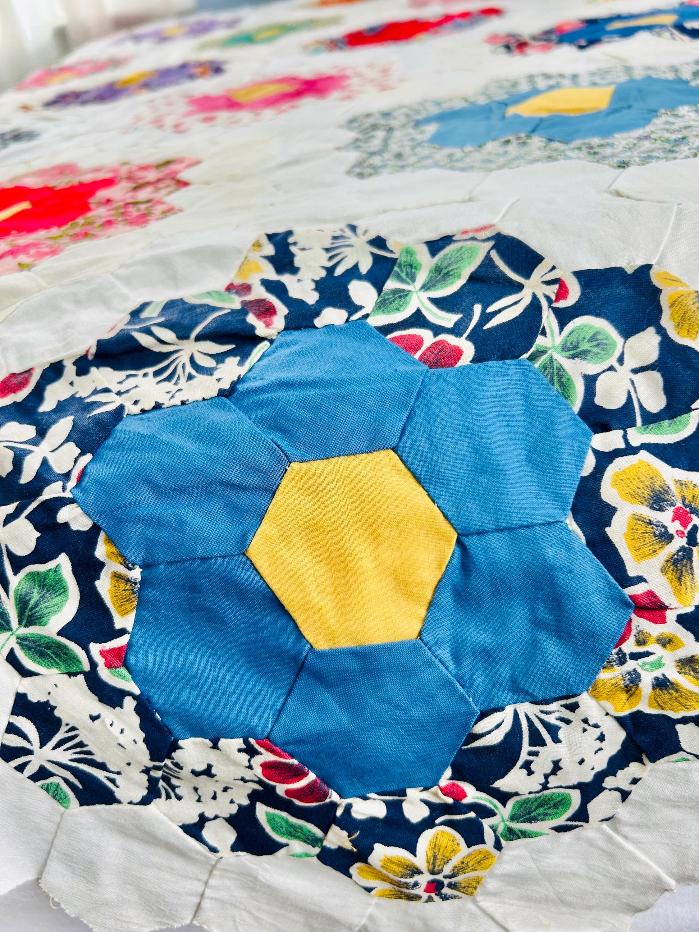 The Fabrics & Palette • Authentic 1930s Feed Sacks: Delightful small-scale florals, lavender ginghams, and "shirting" prints. • Early 1940s Brights: Bolder pops of turquoise, "shocking pink," and saturated oranges that transitioned into the mid-century aesthetic. • The "Path" & Centers: All "flowers" are anchored by uniform butter-yellow centers and set against a crisp, white hexagonal "path" that makes the colors truly sing.