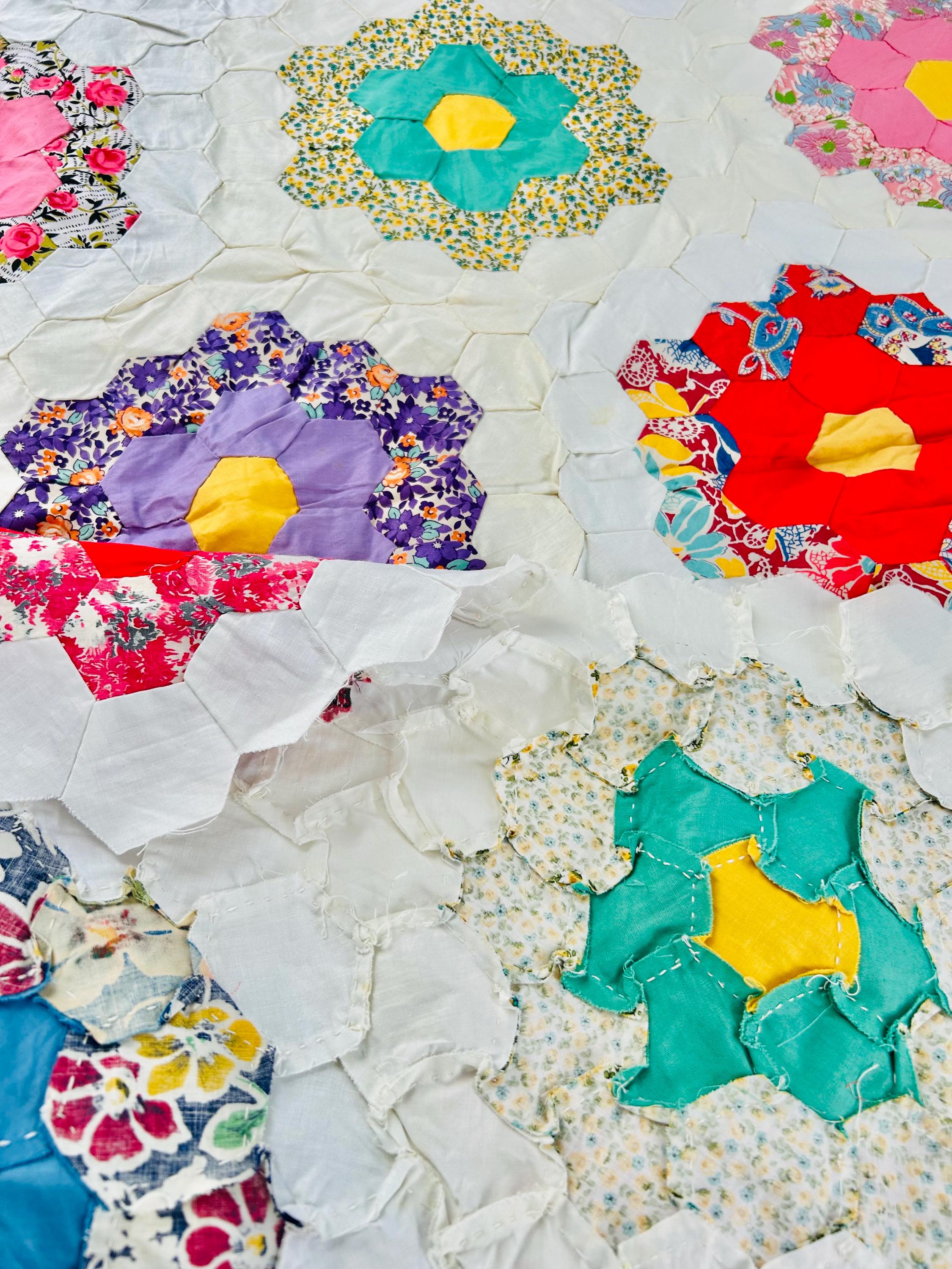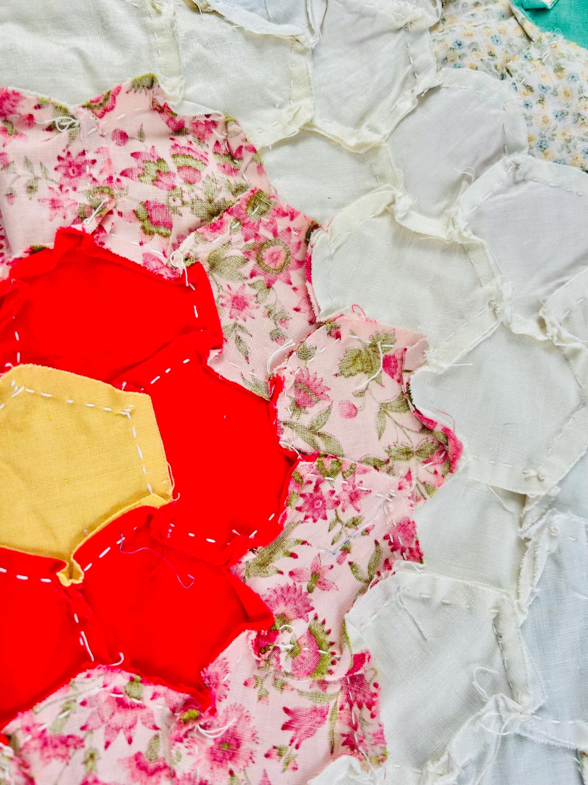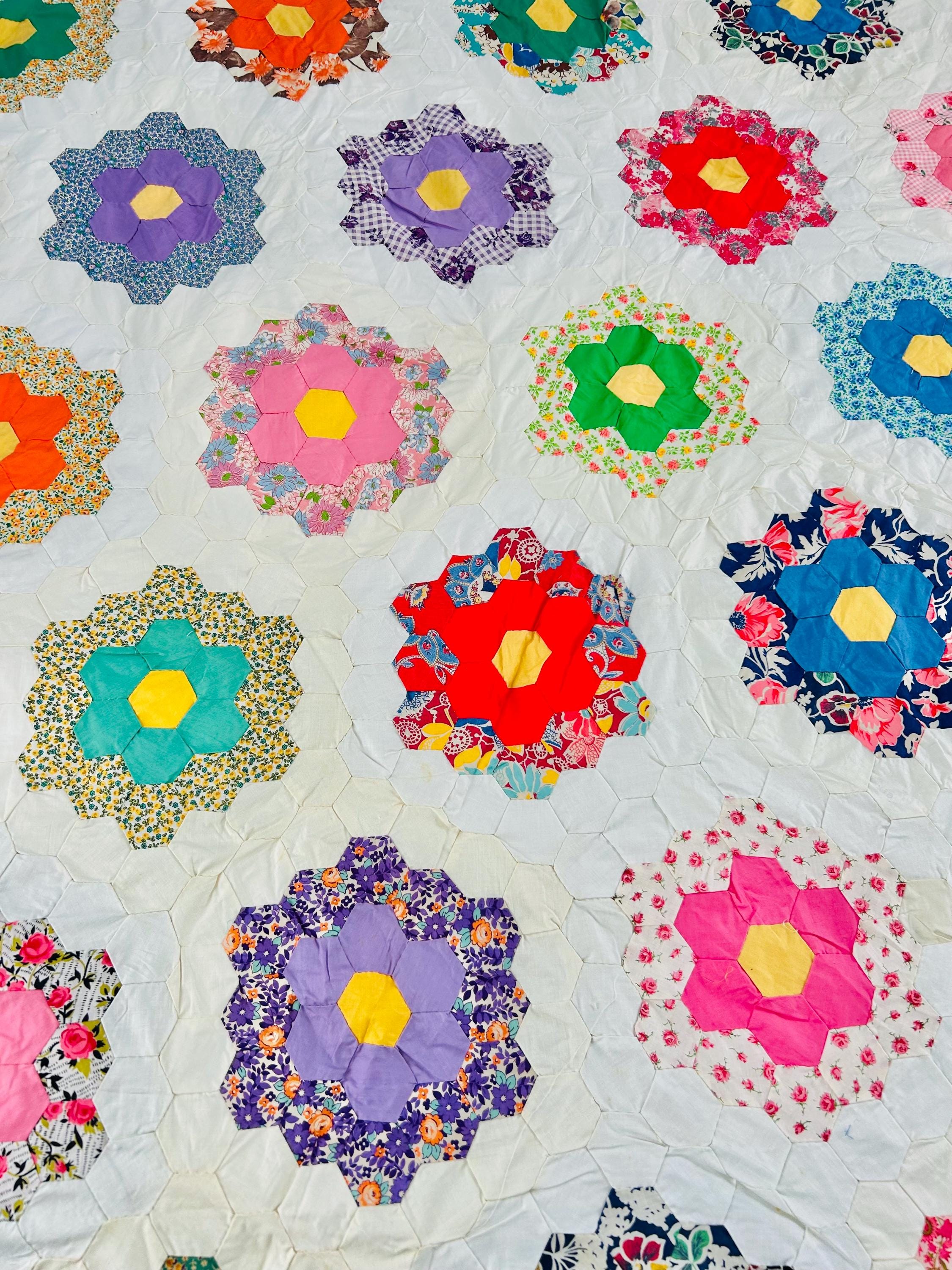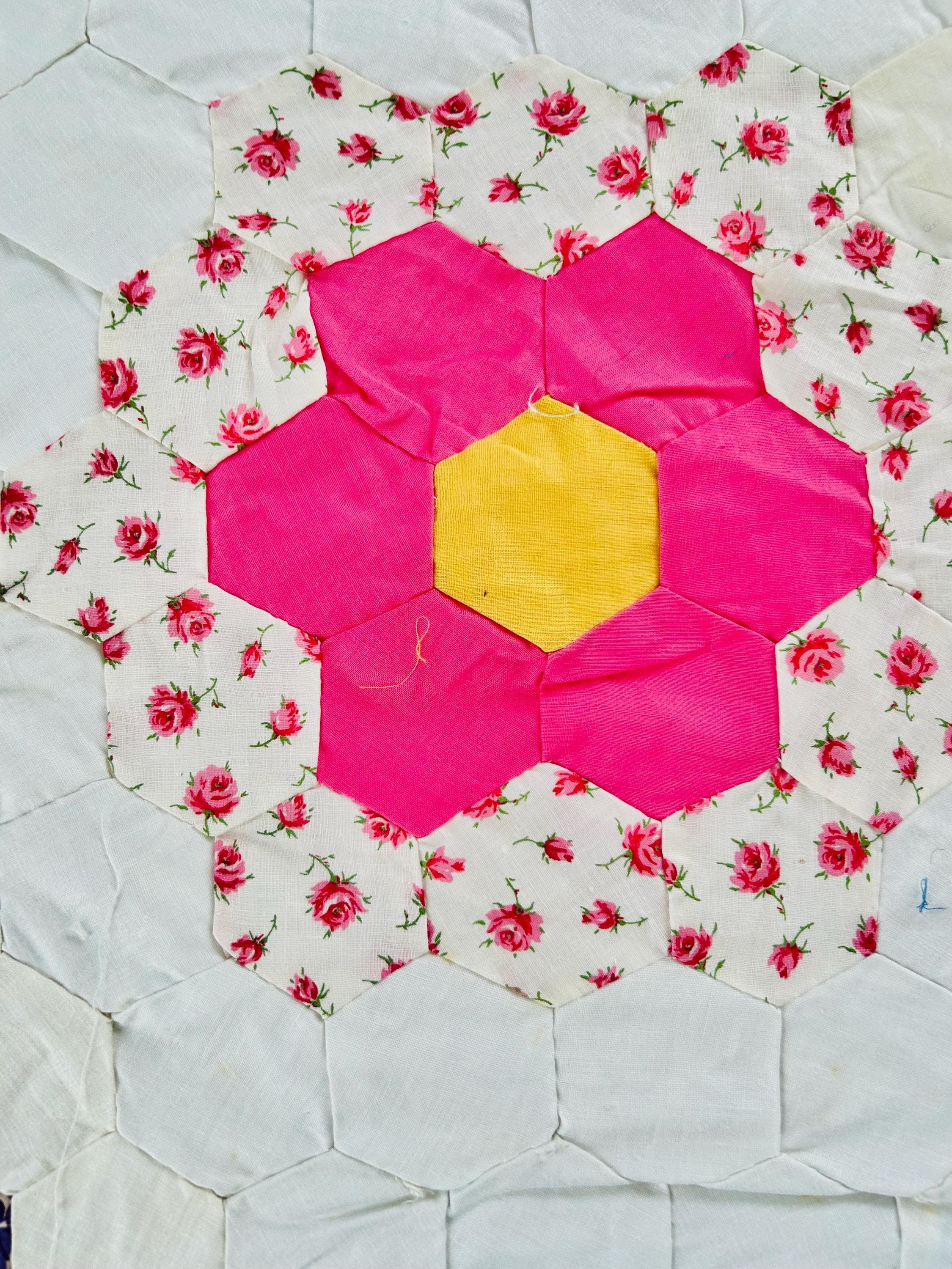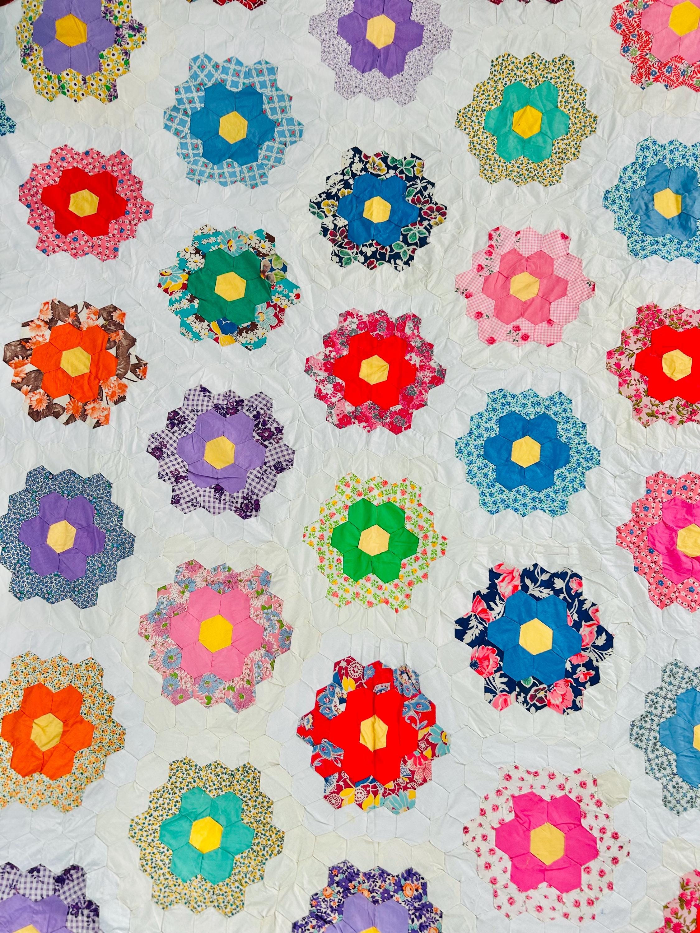 The Fabrics & Palette • Authentic 1930s Feed Sacks: Delightful small-scale florals, lavender ginghams, and "shirting" prints. • Early 1940s Brights: Bolder pops of turquoise, "shocking pink," and saturated oranges that transitioned into the mid-century aesthetic. • The "Path" & Centers: All "flowers" are anchored by uniform butter-yellow centers and set against a crisp, white hexagonal "path" that makes the colors truly sing.