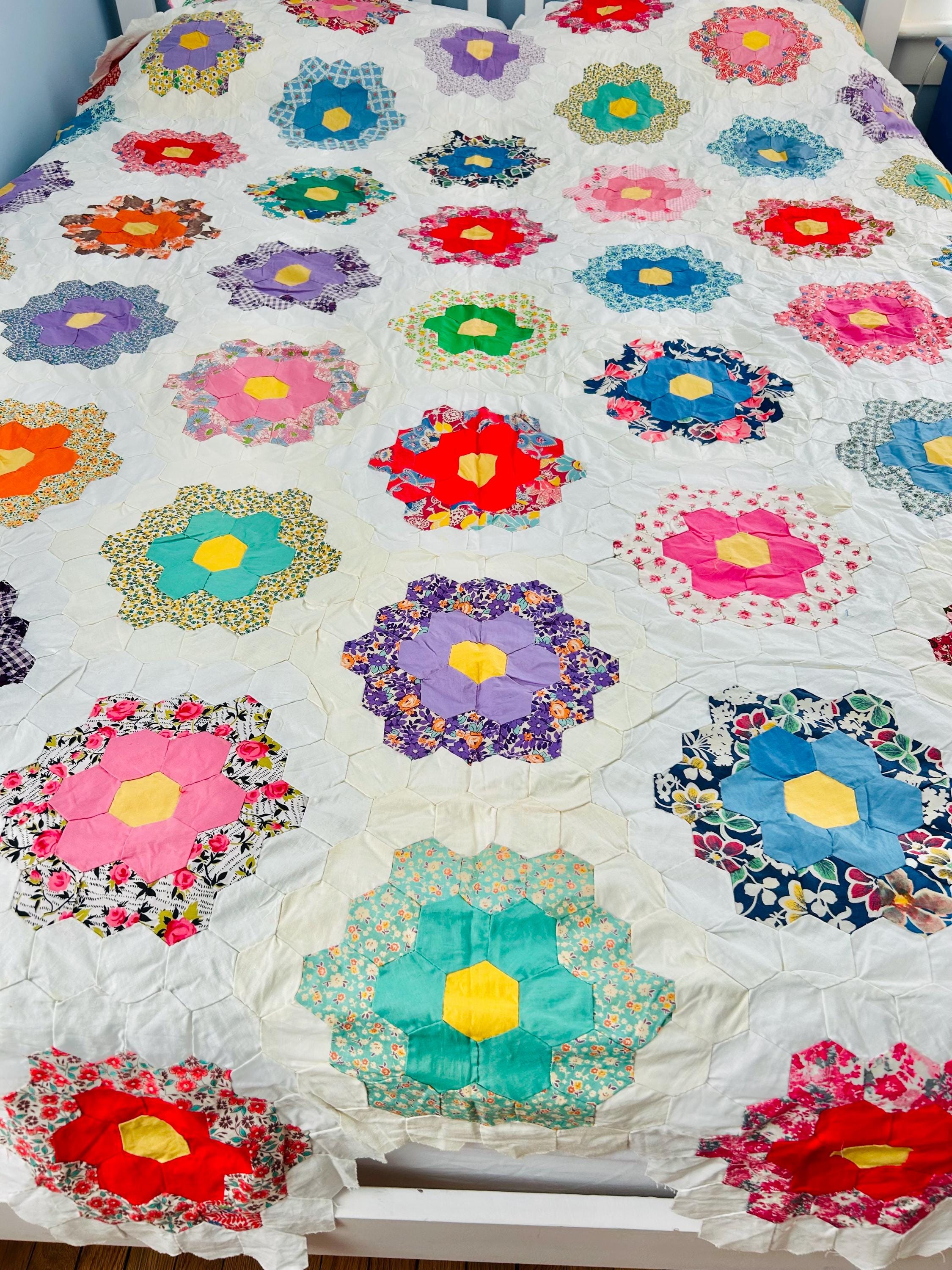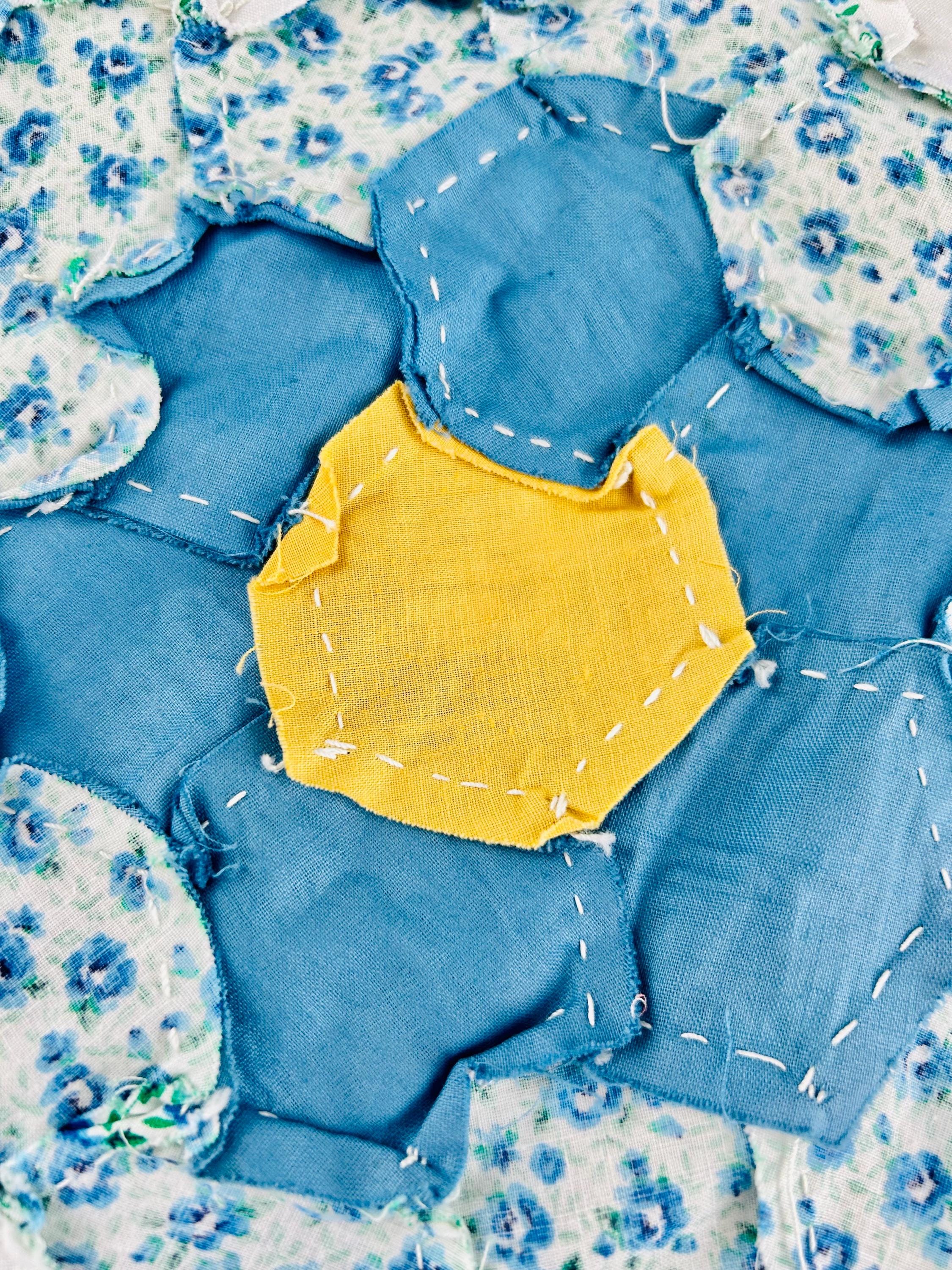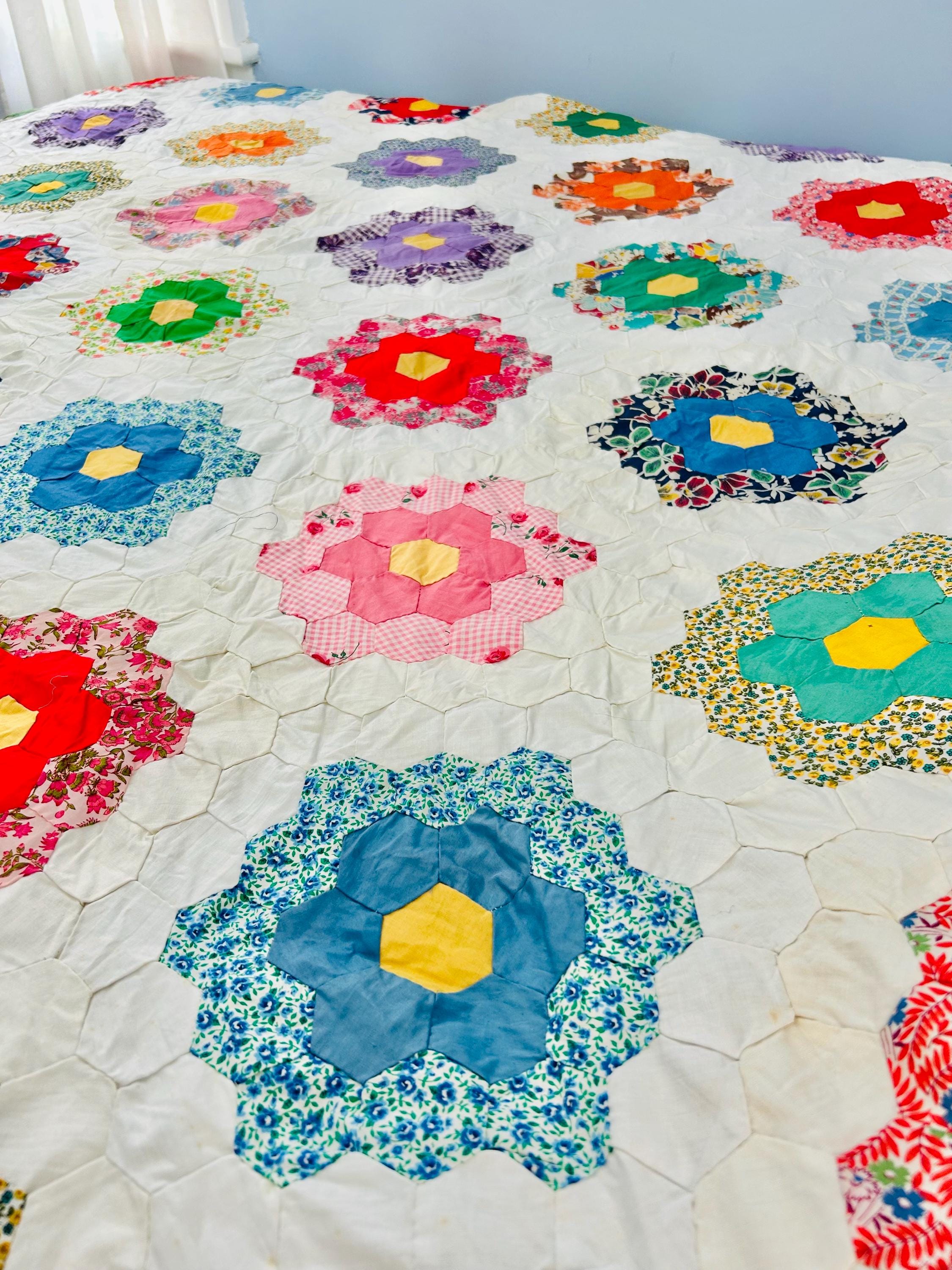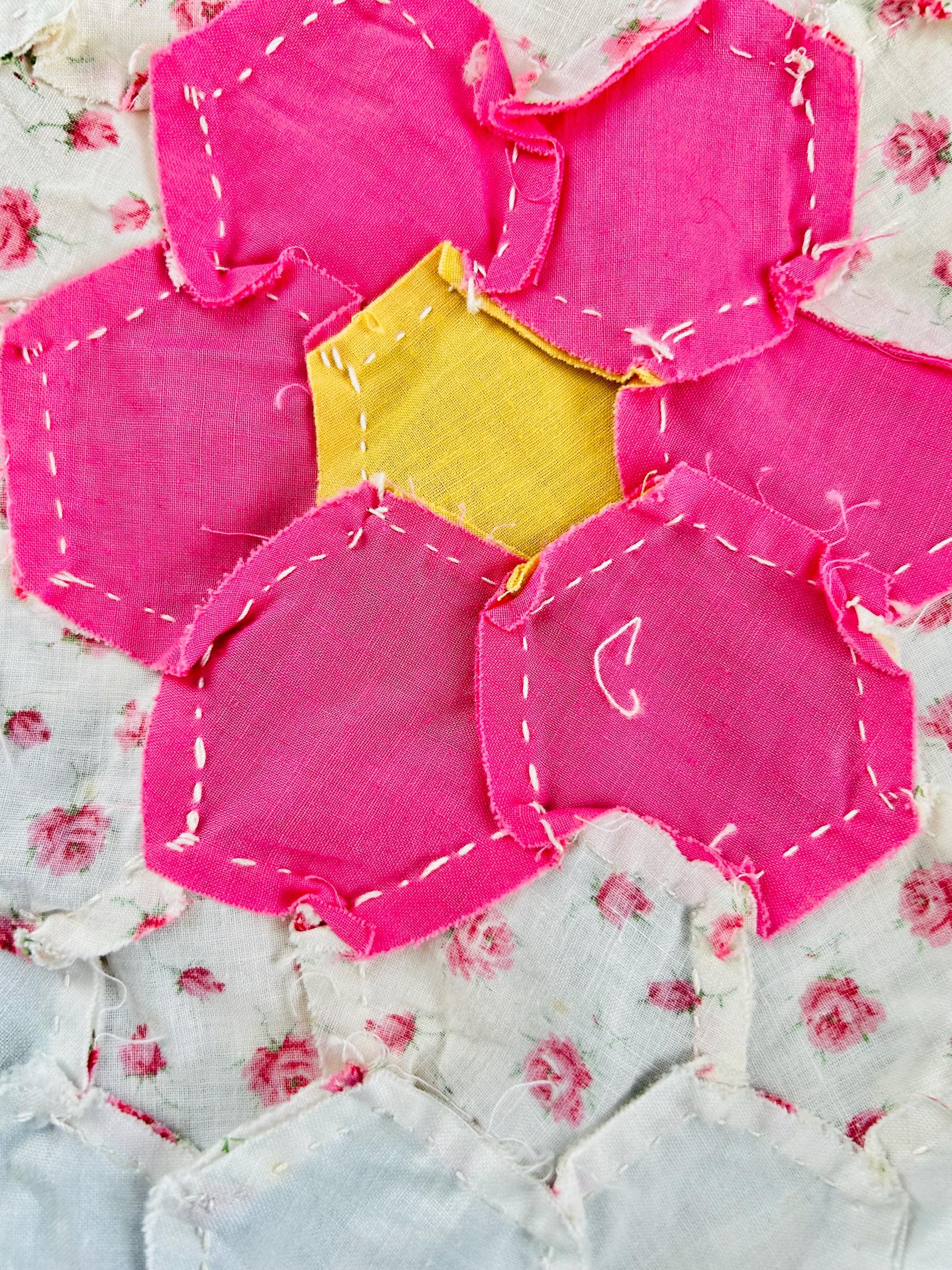 The Fabrics & Palette • Authentic 1930s Feed Sacks: Delightful small-scale florals, lavender ginghams, and "shirting" prints. • Early 1940s Brights: Bolder pops of turquoise, "shocking pink," and saturated oranges that transitioned into the mid-century aesthetic. • The "Path" & Centers: All "flowers" are anchored by uniform butter-yellow centers and set against a crisp, white hexagonal "path" that makes the colors truly sing.